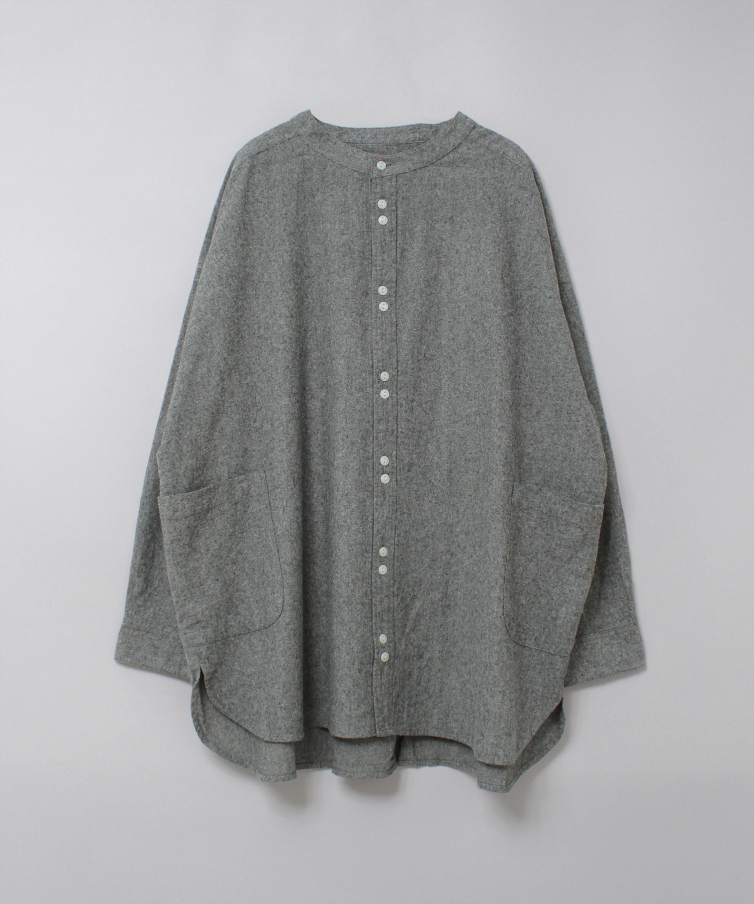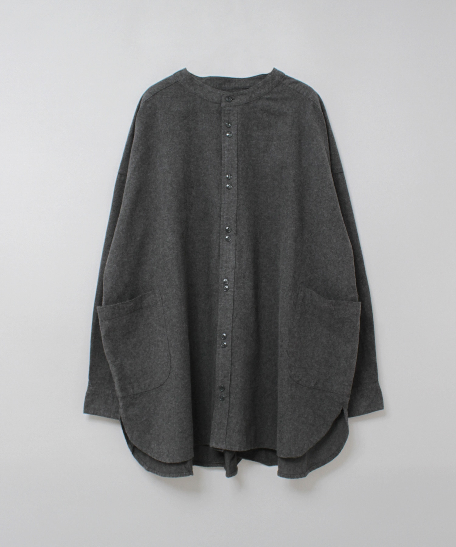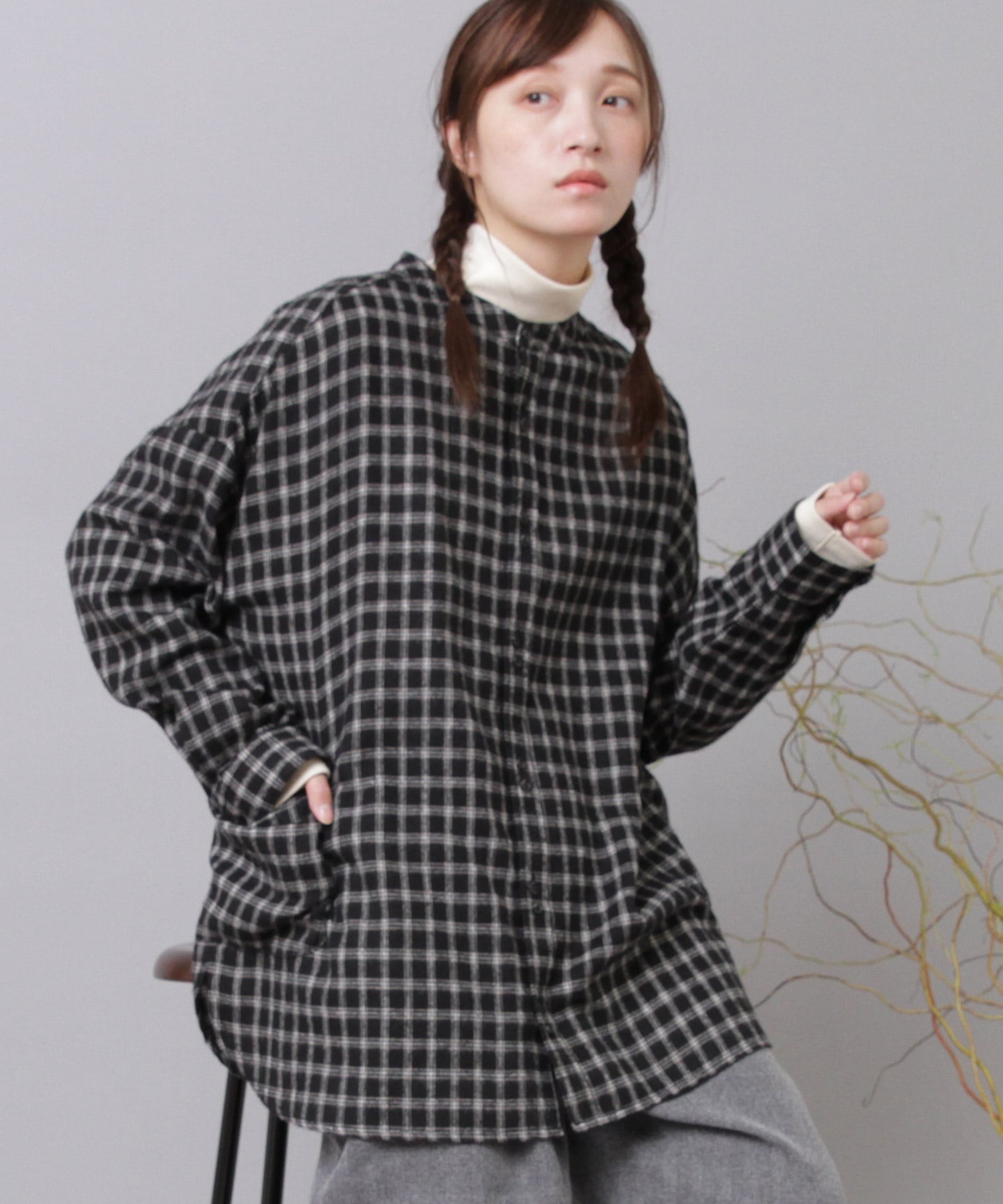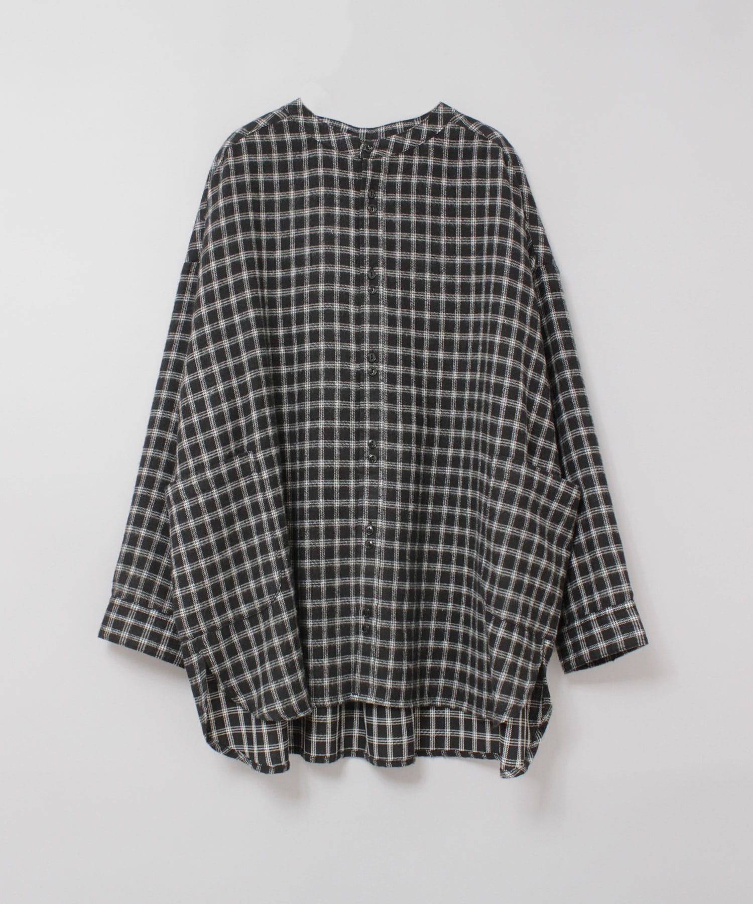 すっきりとした印象のバンドカラーと長めのチュニック丈がポイントで、羽織としてもワンピース風の着こなしにも使える、着回し力の高い一枚です。