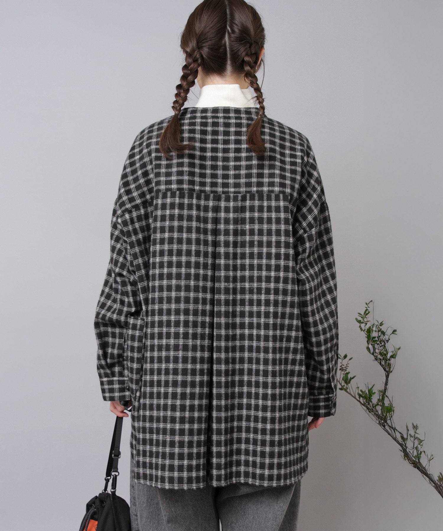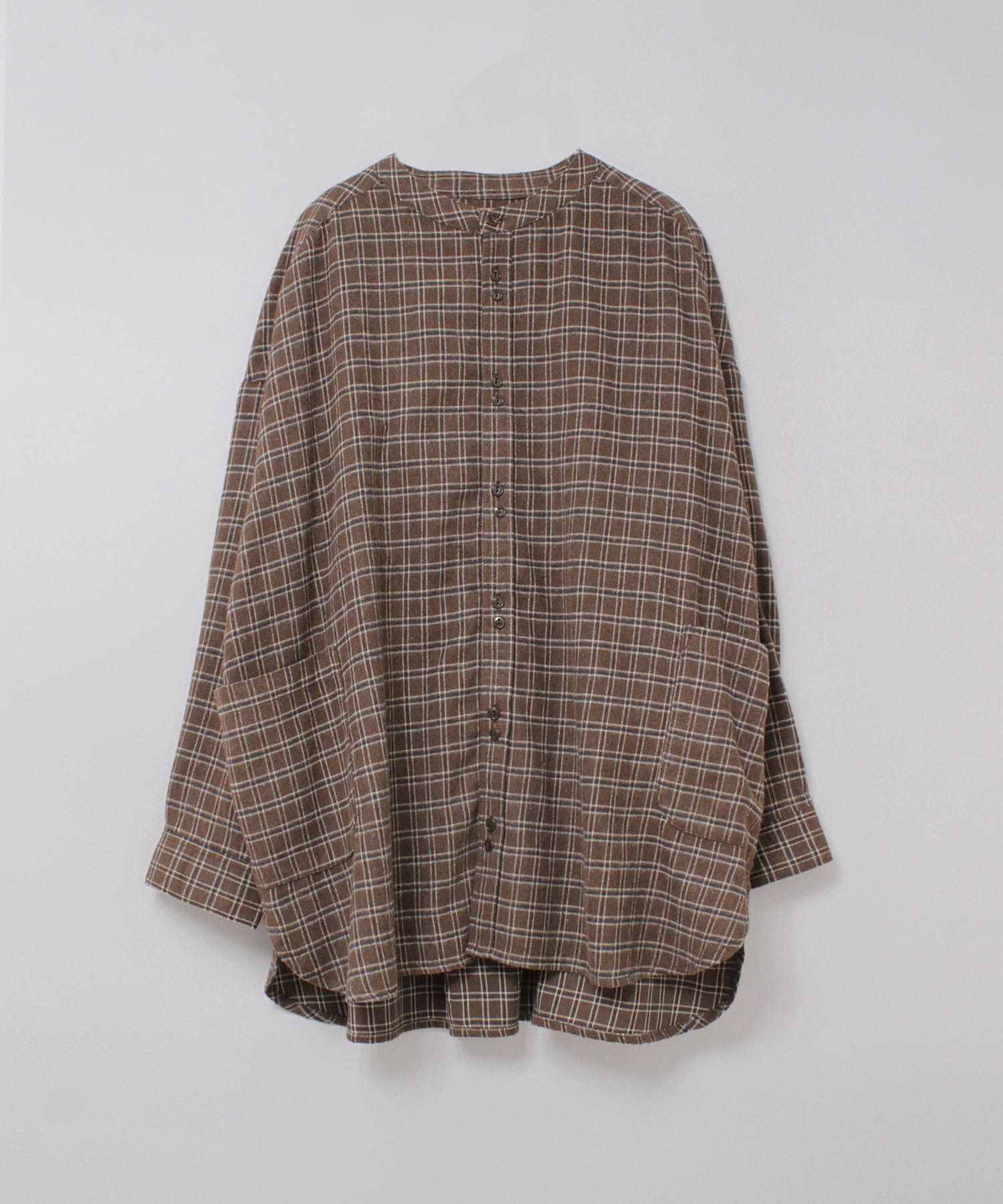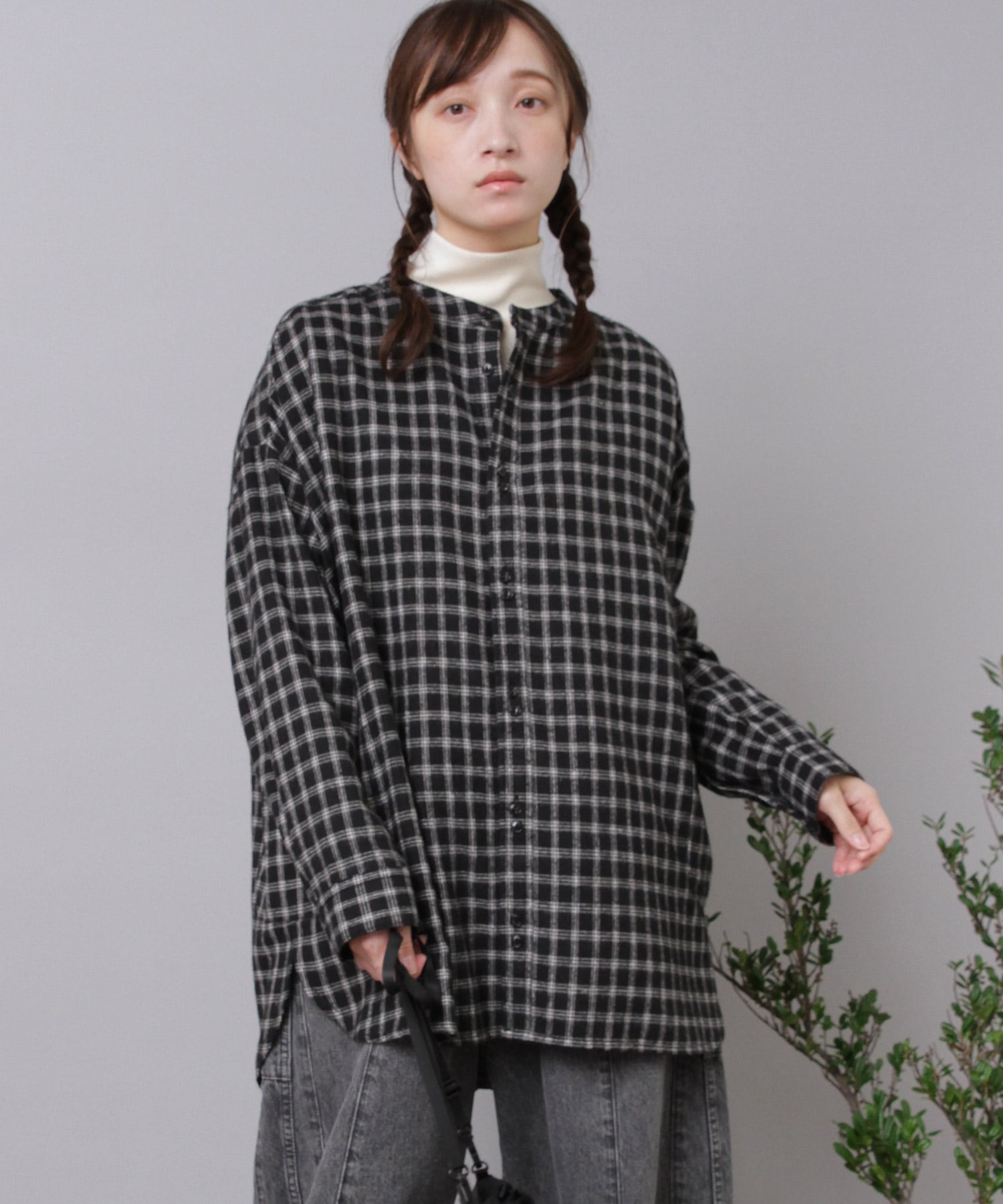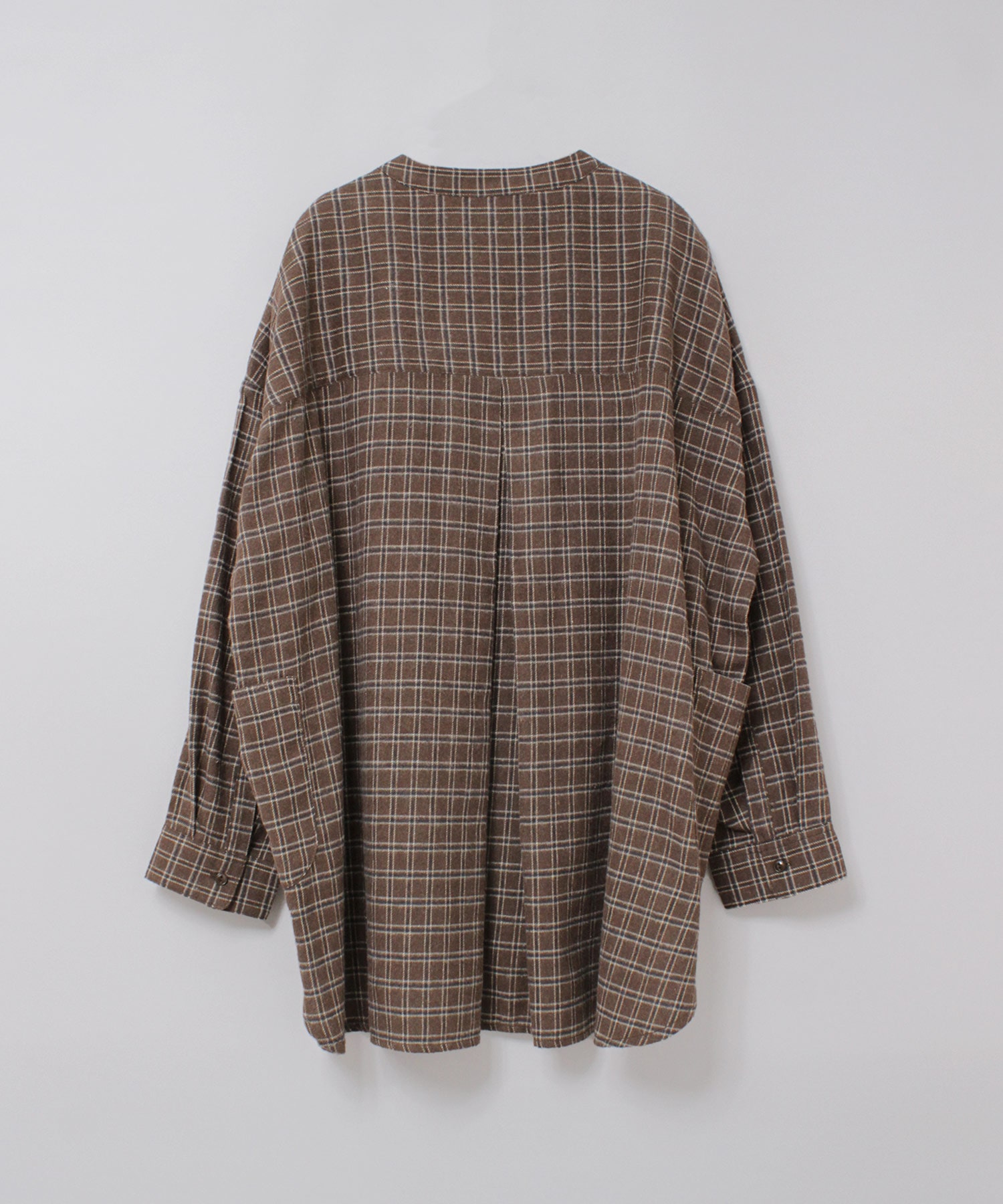 すっきりとした印象のバンドカラーと長めのチュニック丈がポイントで、羽織としてもワンピース風の着こなしにも使える、着回し力の高い一枚です。