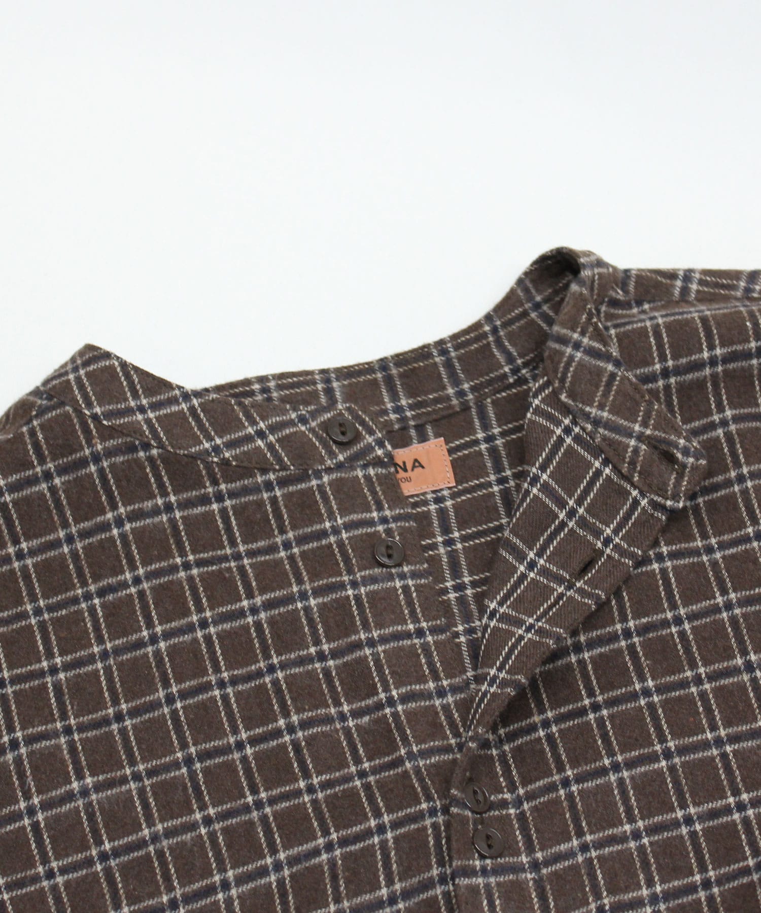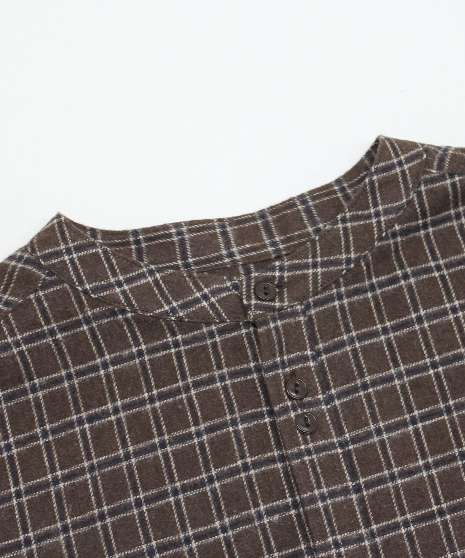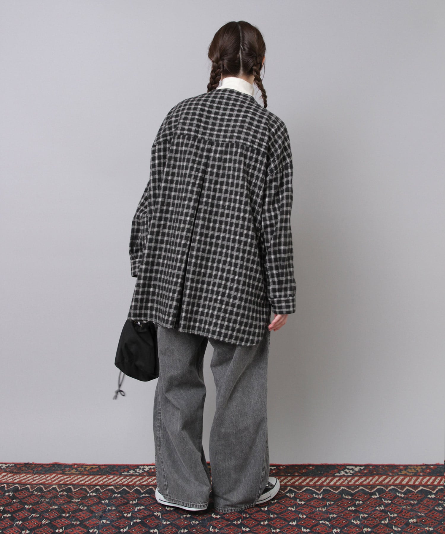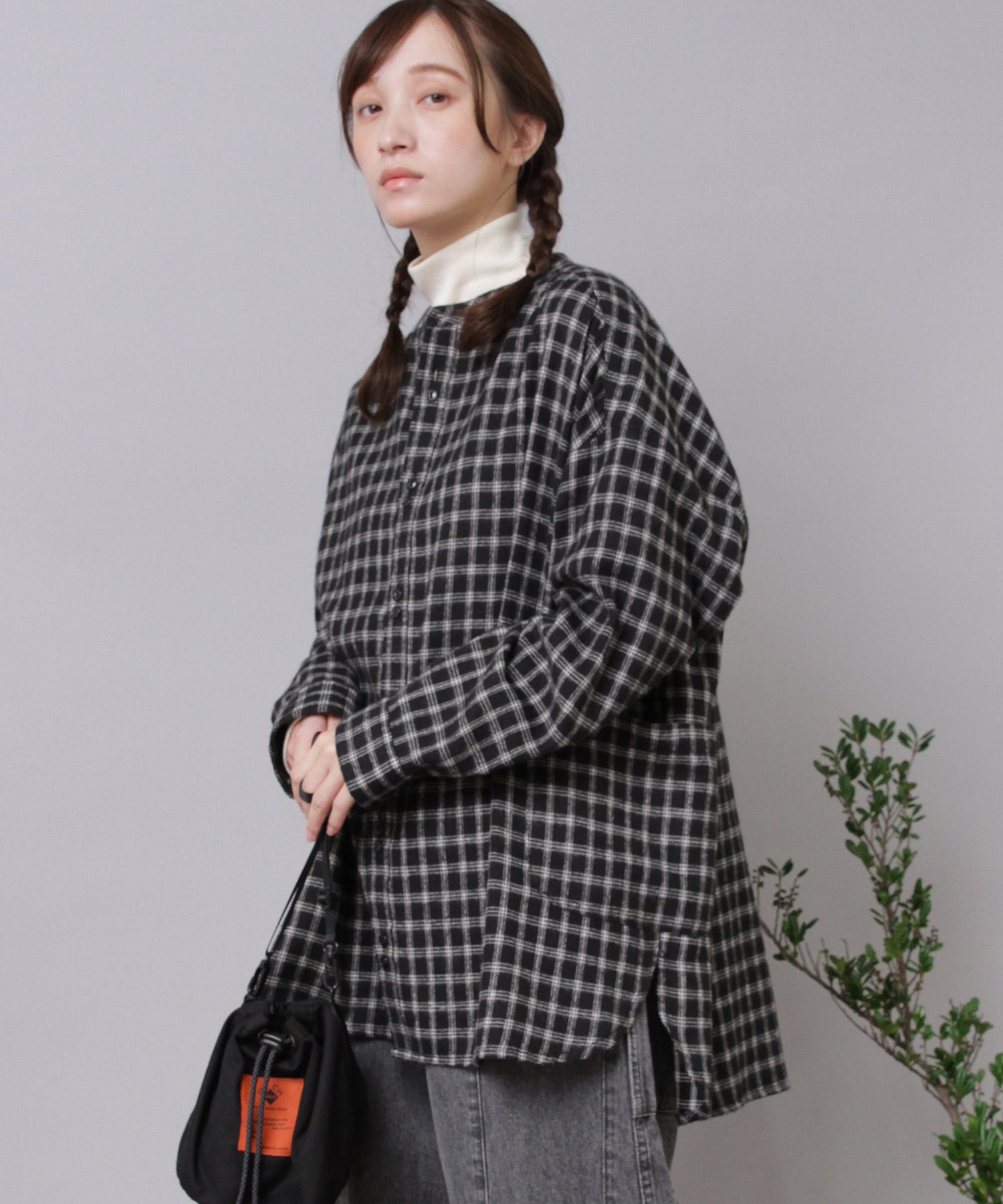 すっきりとした印象のバンドカラーと長めのチュニック丈がポイントで、羽織としてもワンピース風の着こなしにも使える、着回し力の高い一枚です。