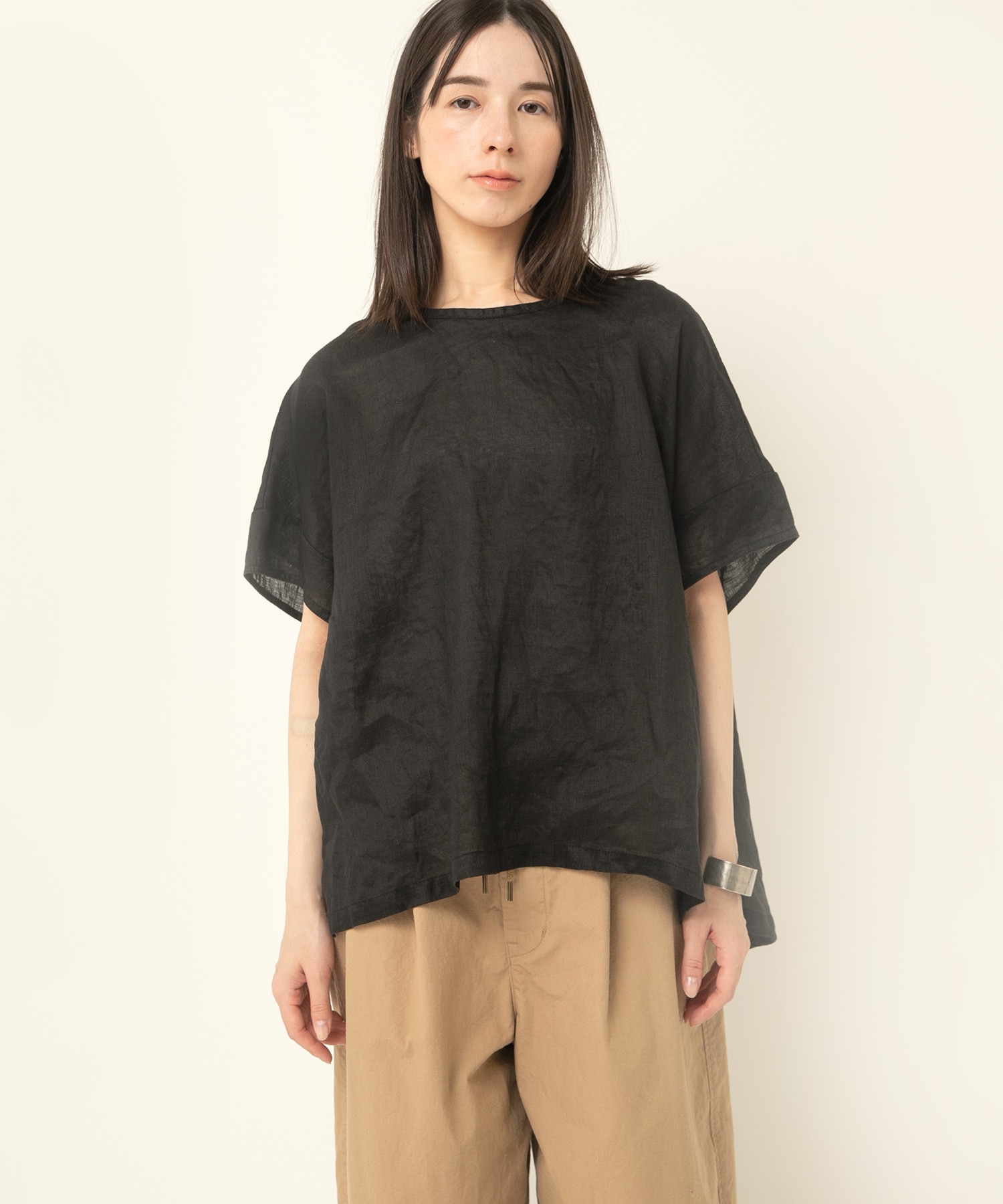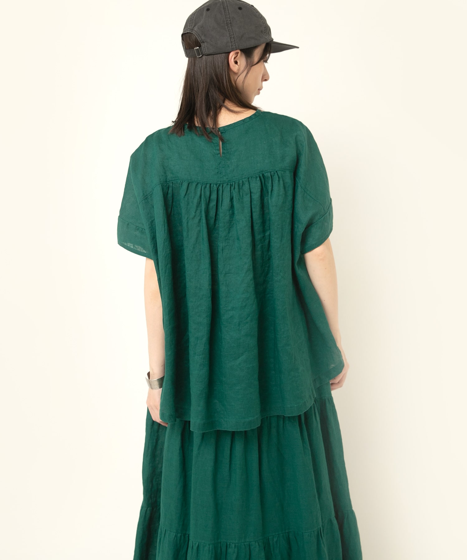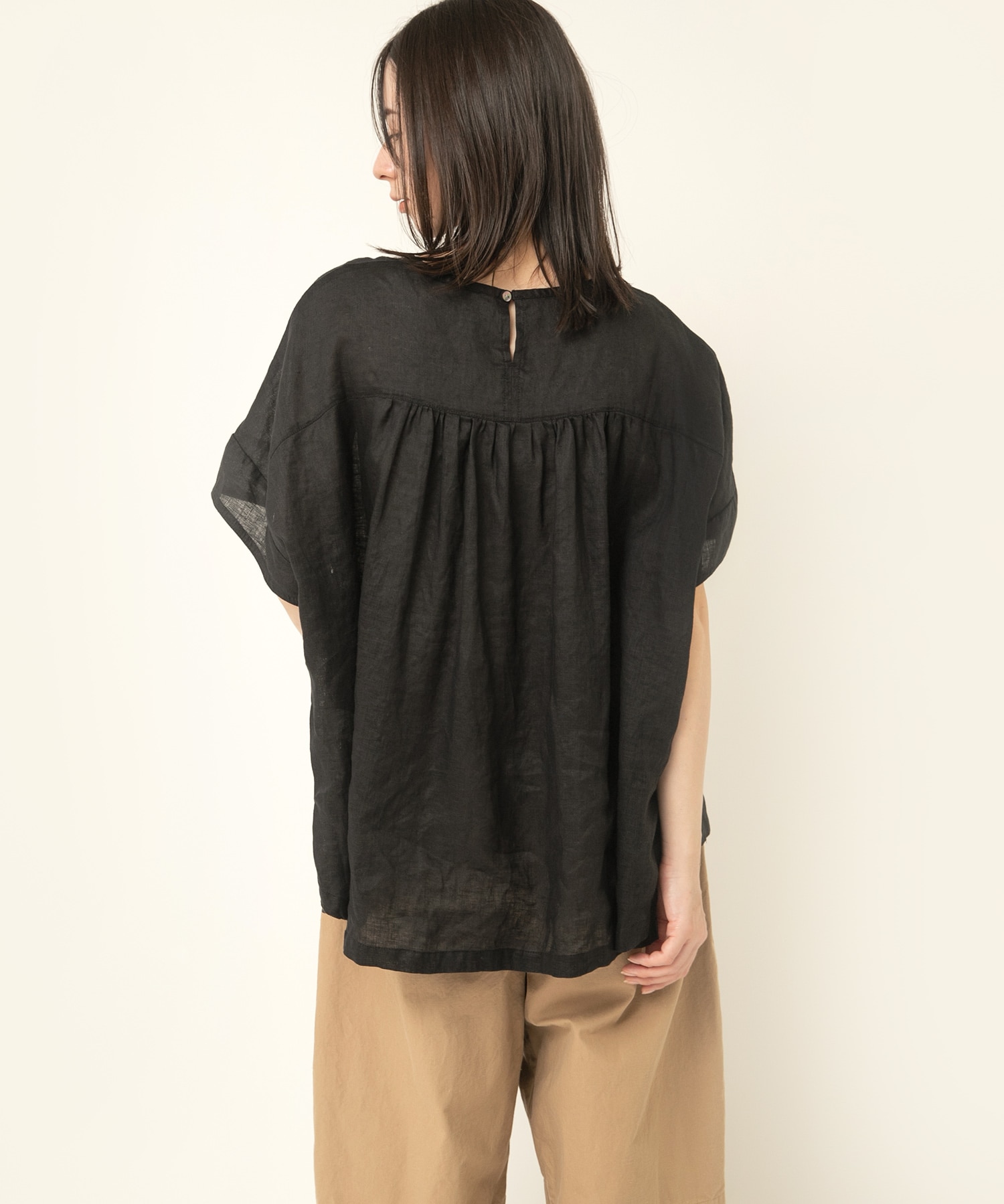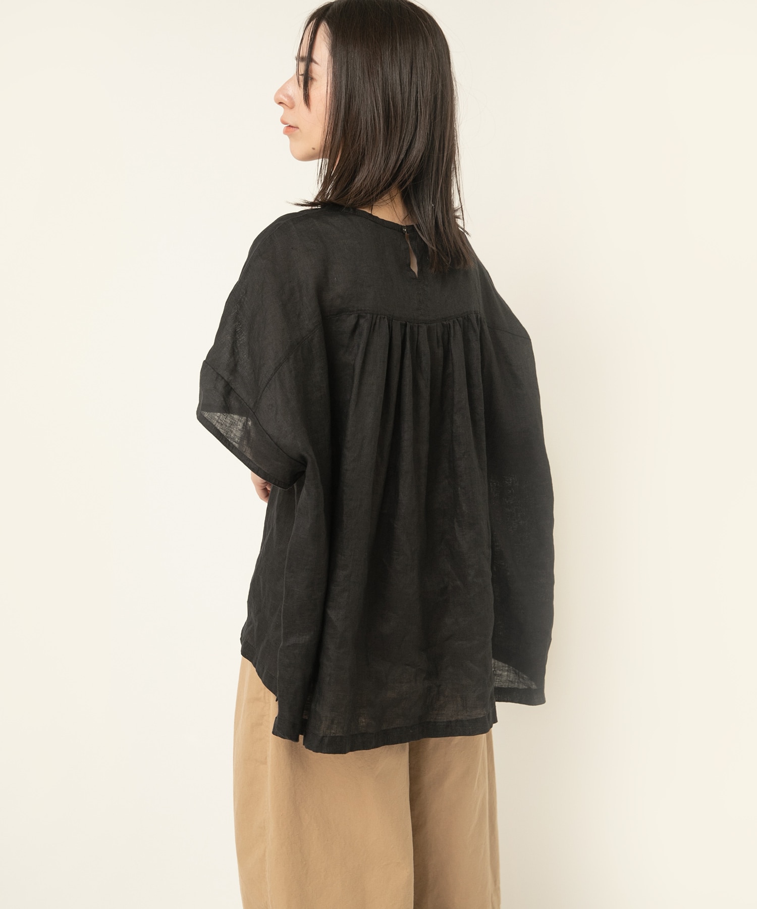 肩線を大きく落としたブラウスは肌離れがよく、これからの暑い時期にさらりと着れるアイテムです。