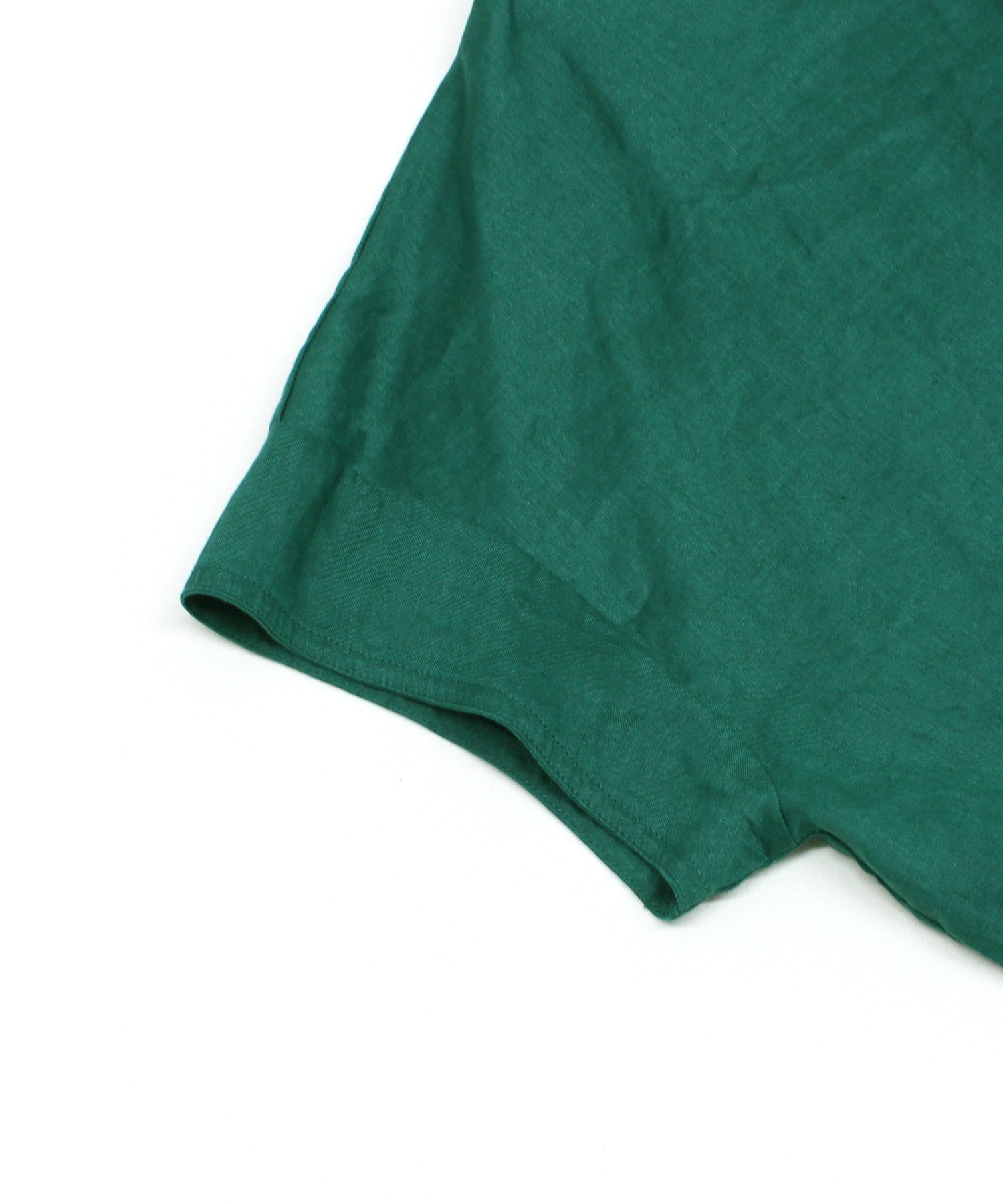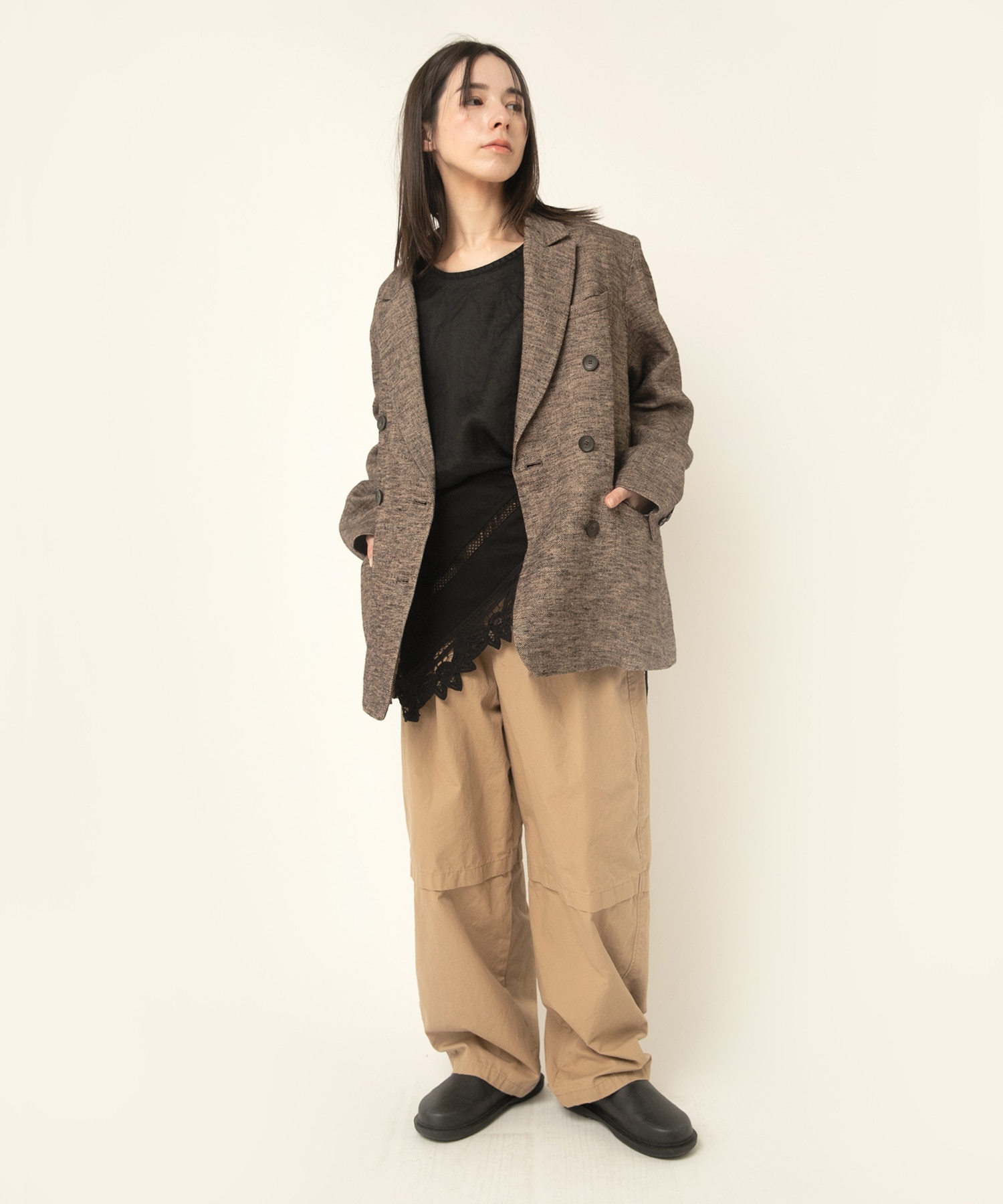 シルエットはゆったりしていて、袖は短いですが肩幅が大きいので、腕が見えすぎないのがポイント。