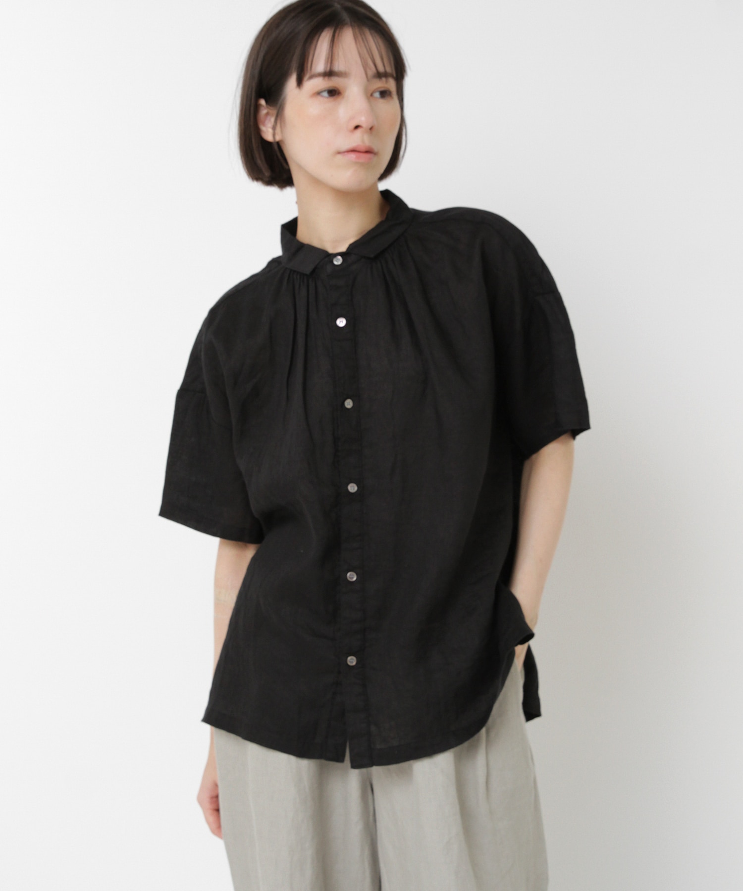 襟元のシャーリングギャザーが、ふんわりとした立体感を出しています。袖は短すぎないので、着用しやすい一枚。