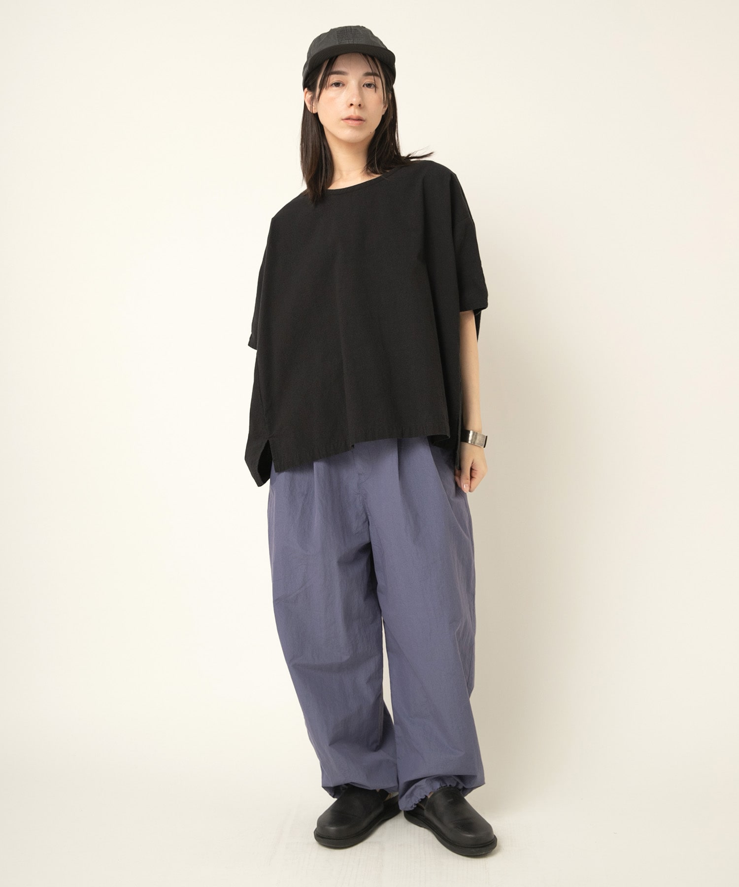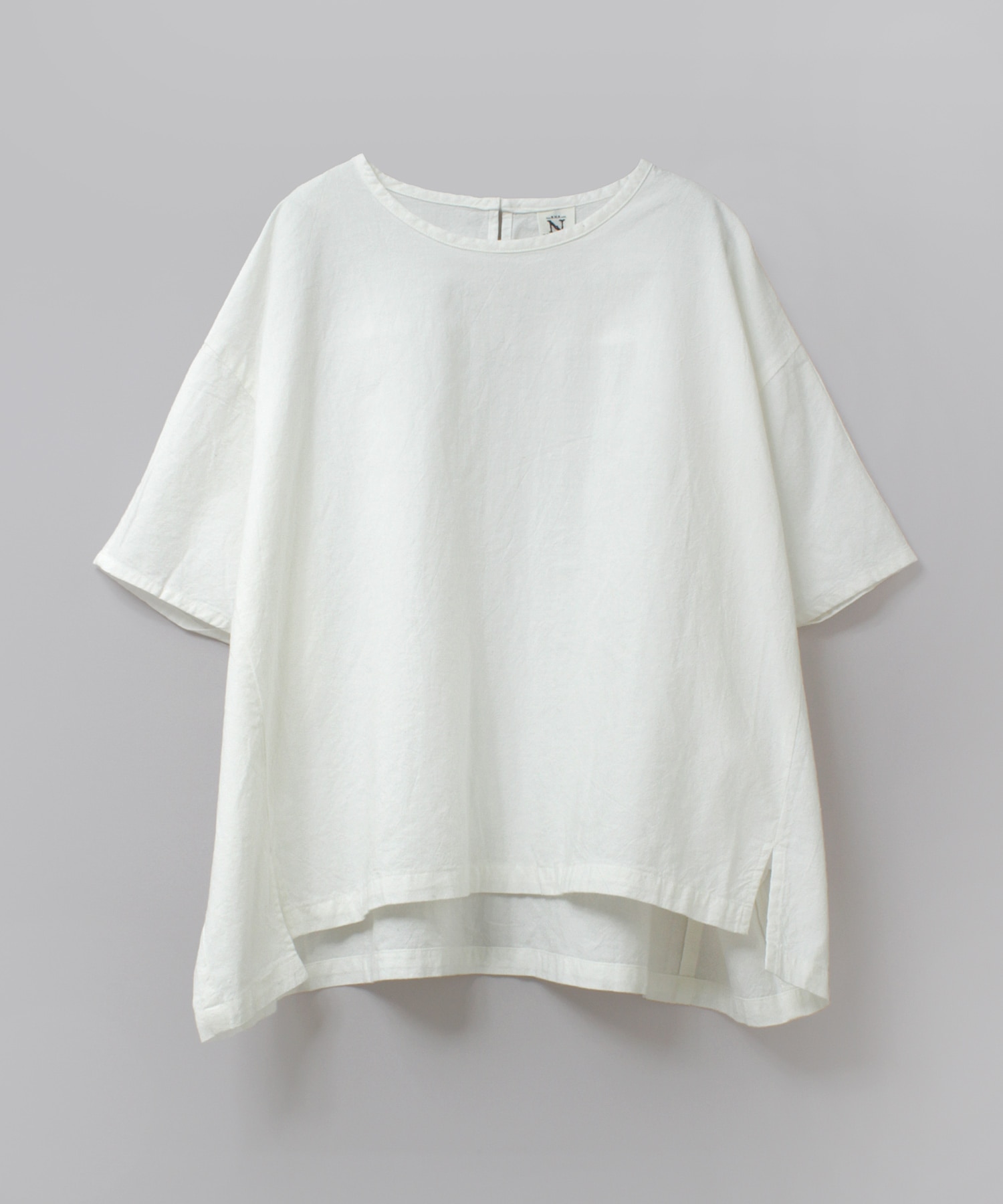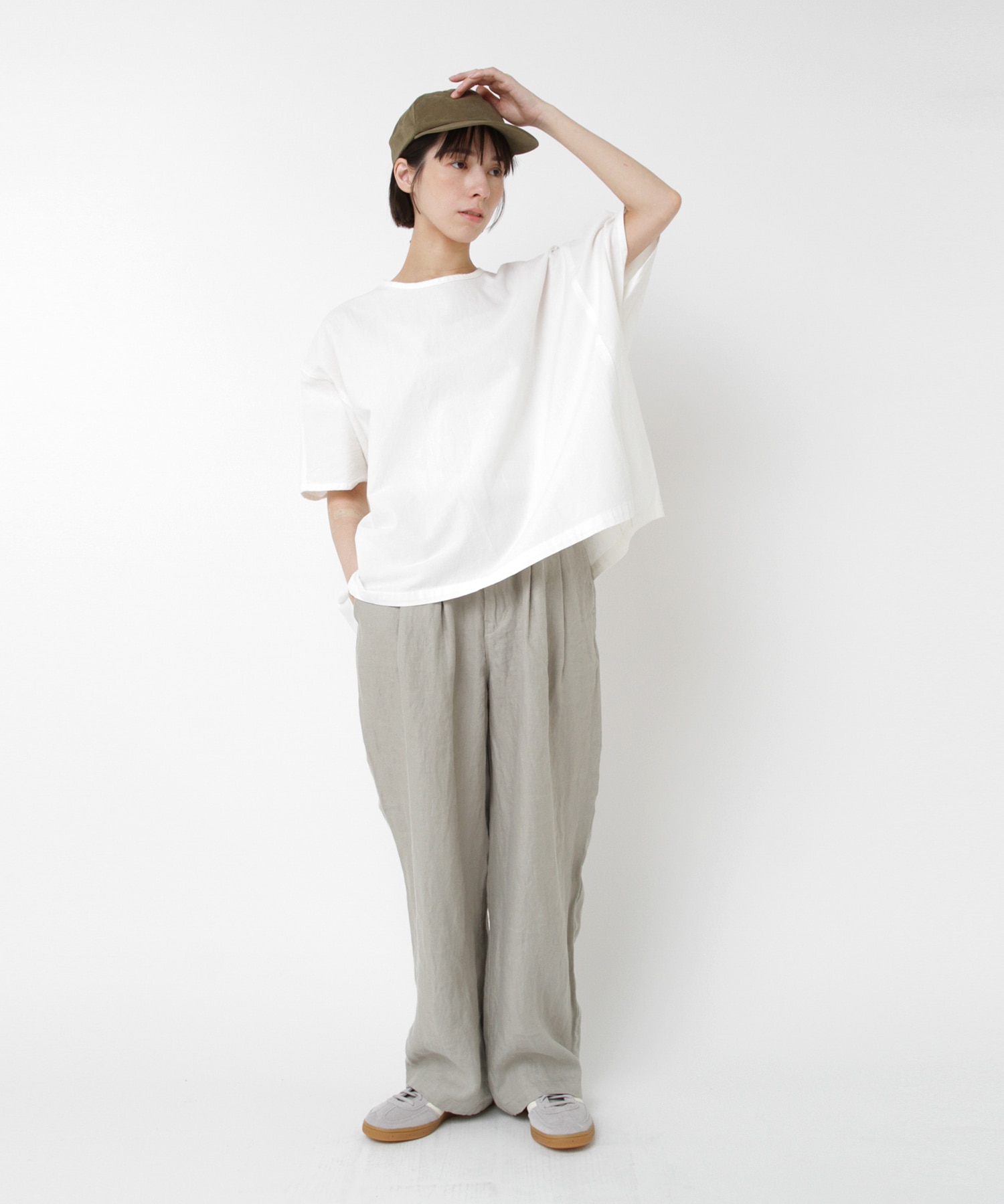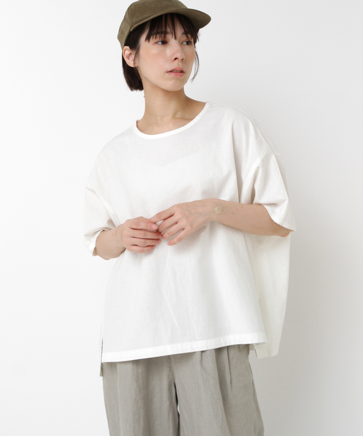 すっぽりかぶれて着脱もイージーなブラウスは、麻混で涼し気です。