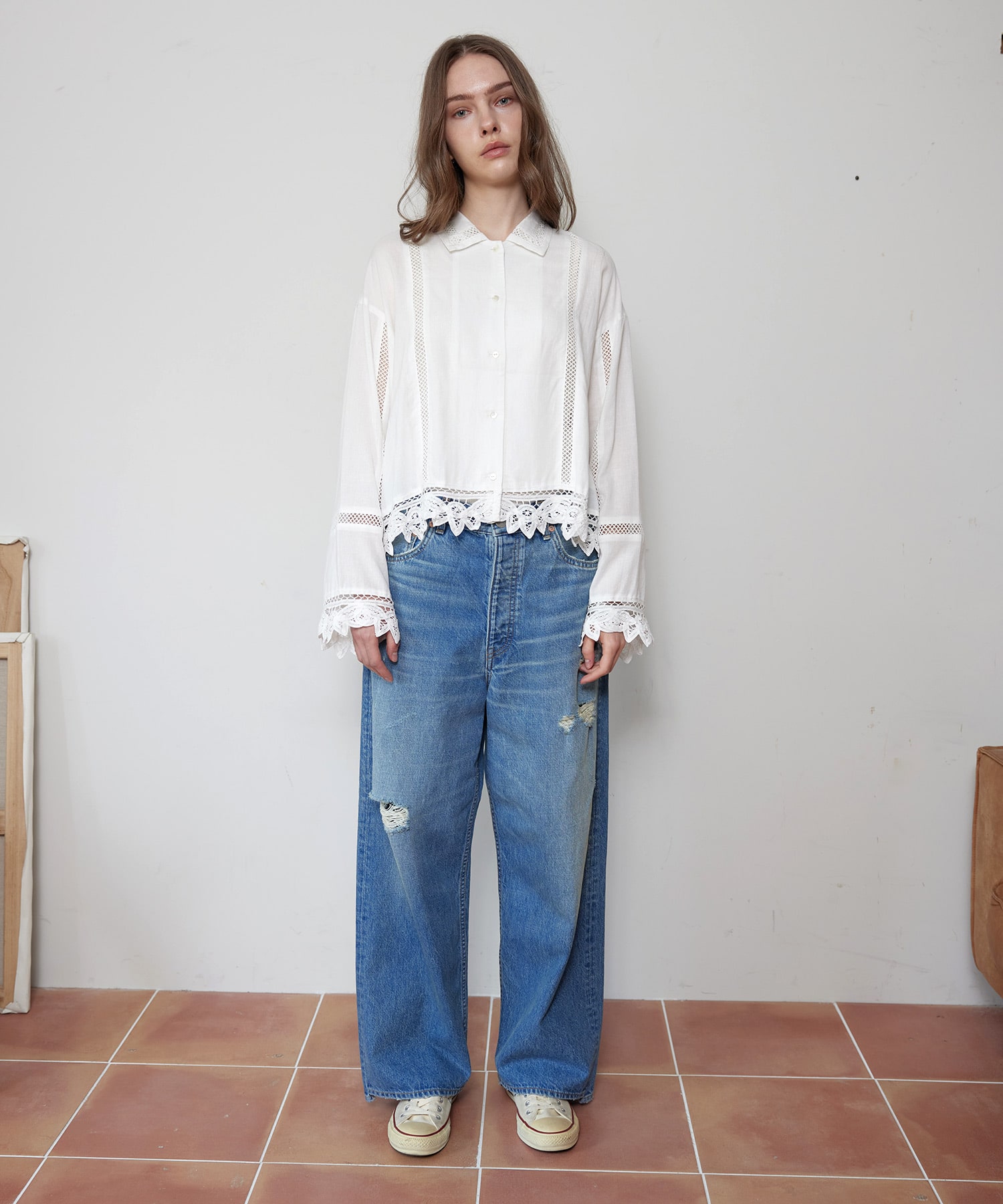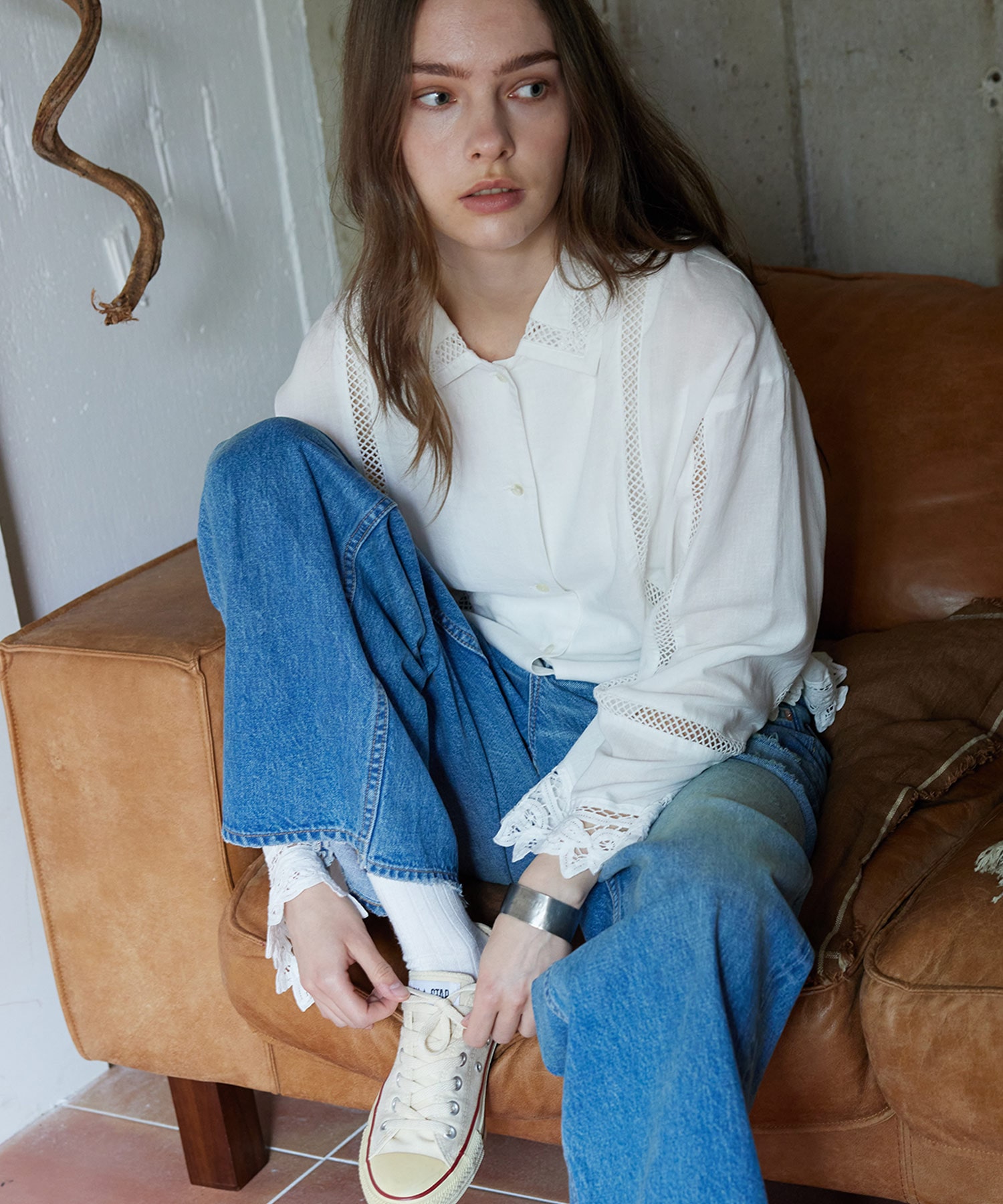 裾と袖口にバテンレースをふんだんに使用し、はしごレースの透け感が大人っぽく、ヴィンテージショップにあるレースシャツのような雰囲気あるアイテムです。