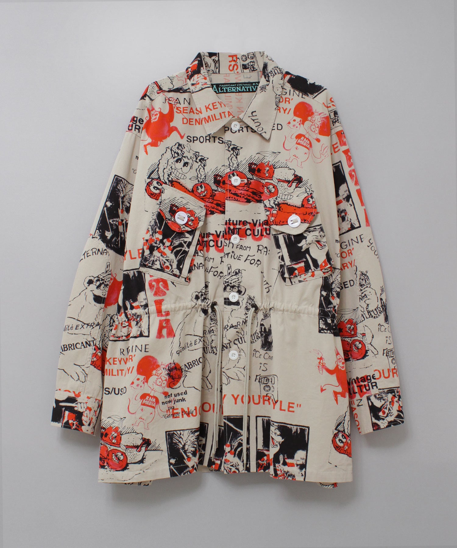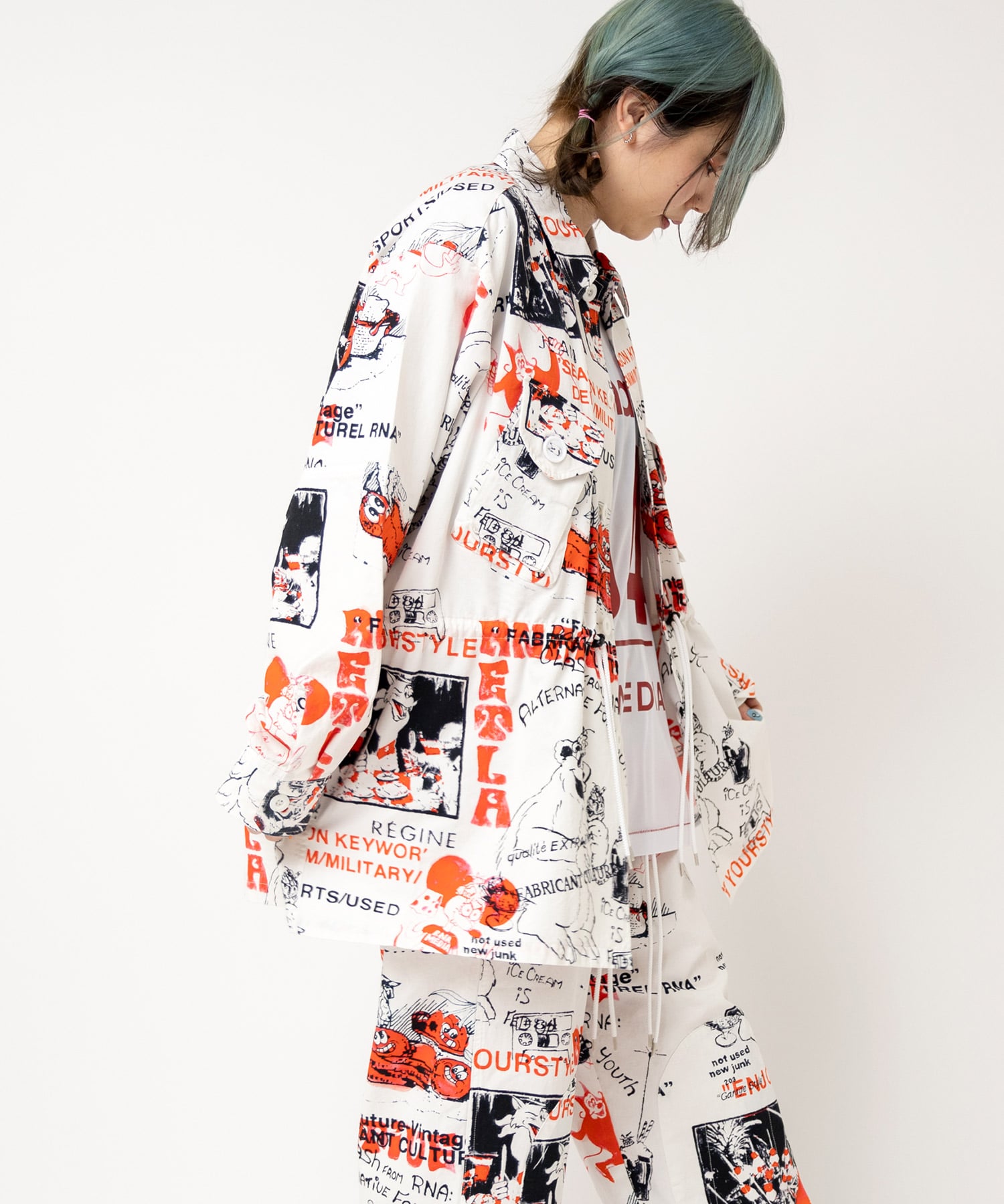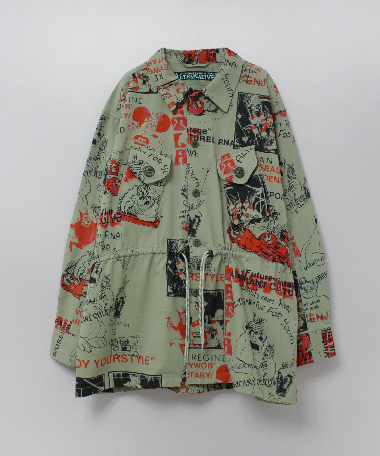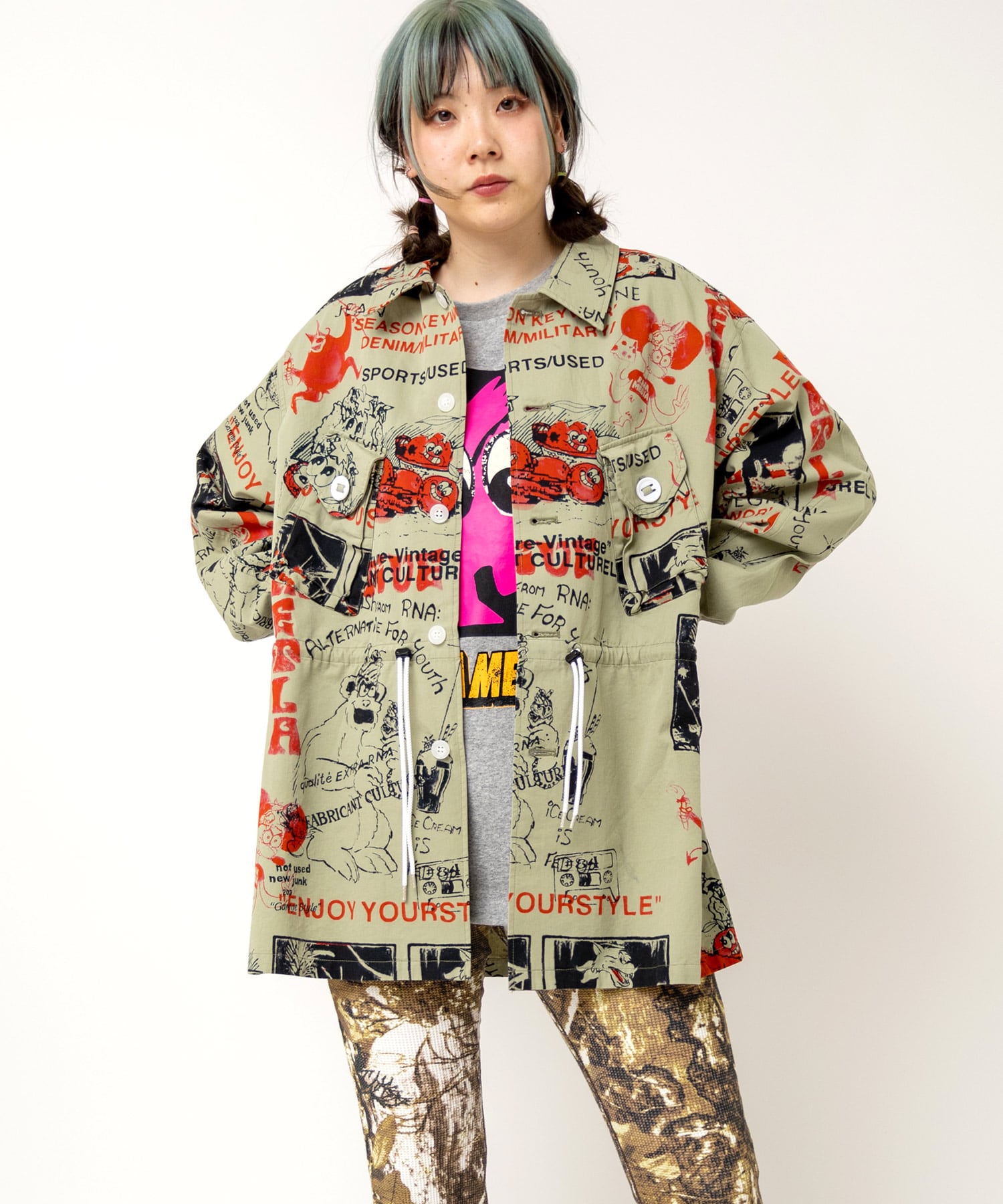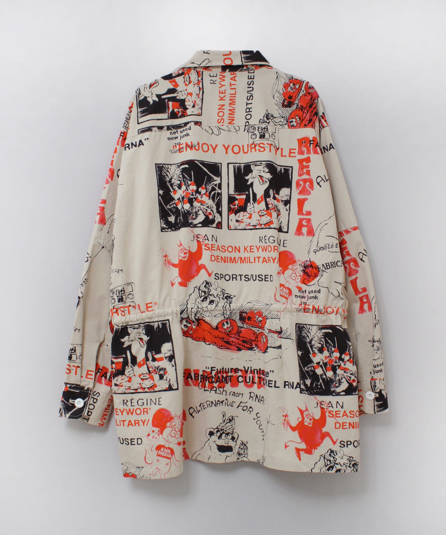 丁寧にハンドドローイングされた落書き柄になります。立体ポケット、肘当ての無骨なミリタリーディテールのアイテム。