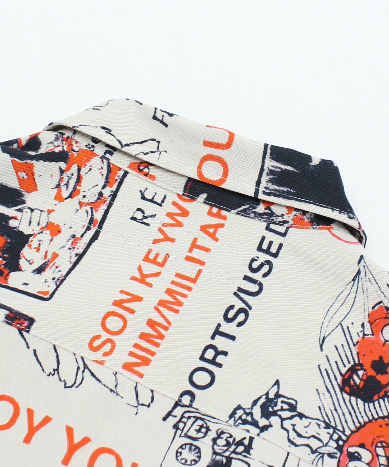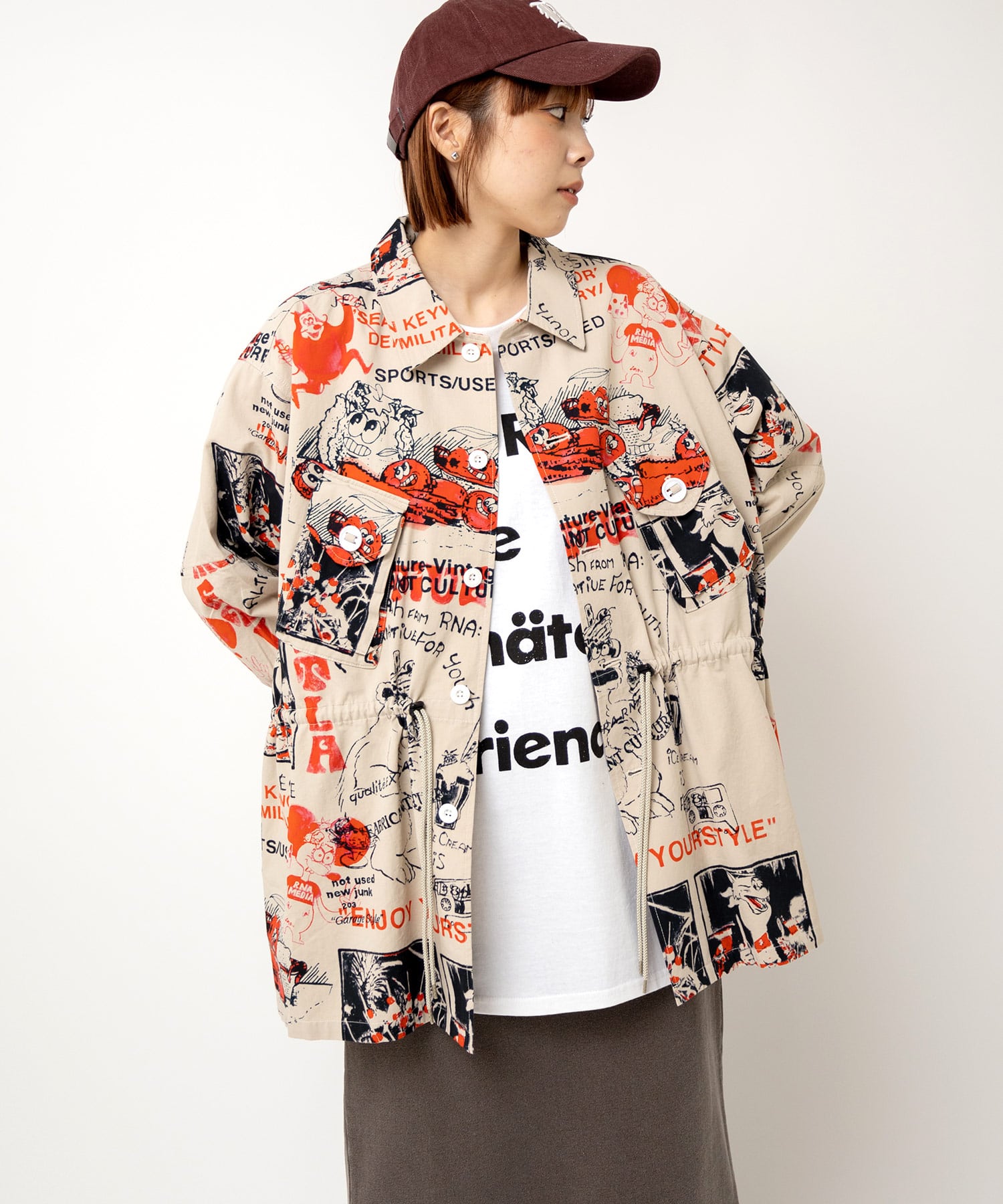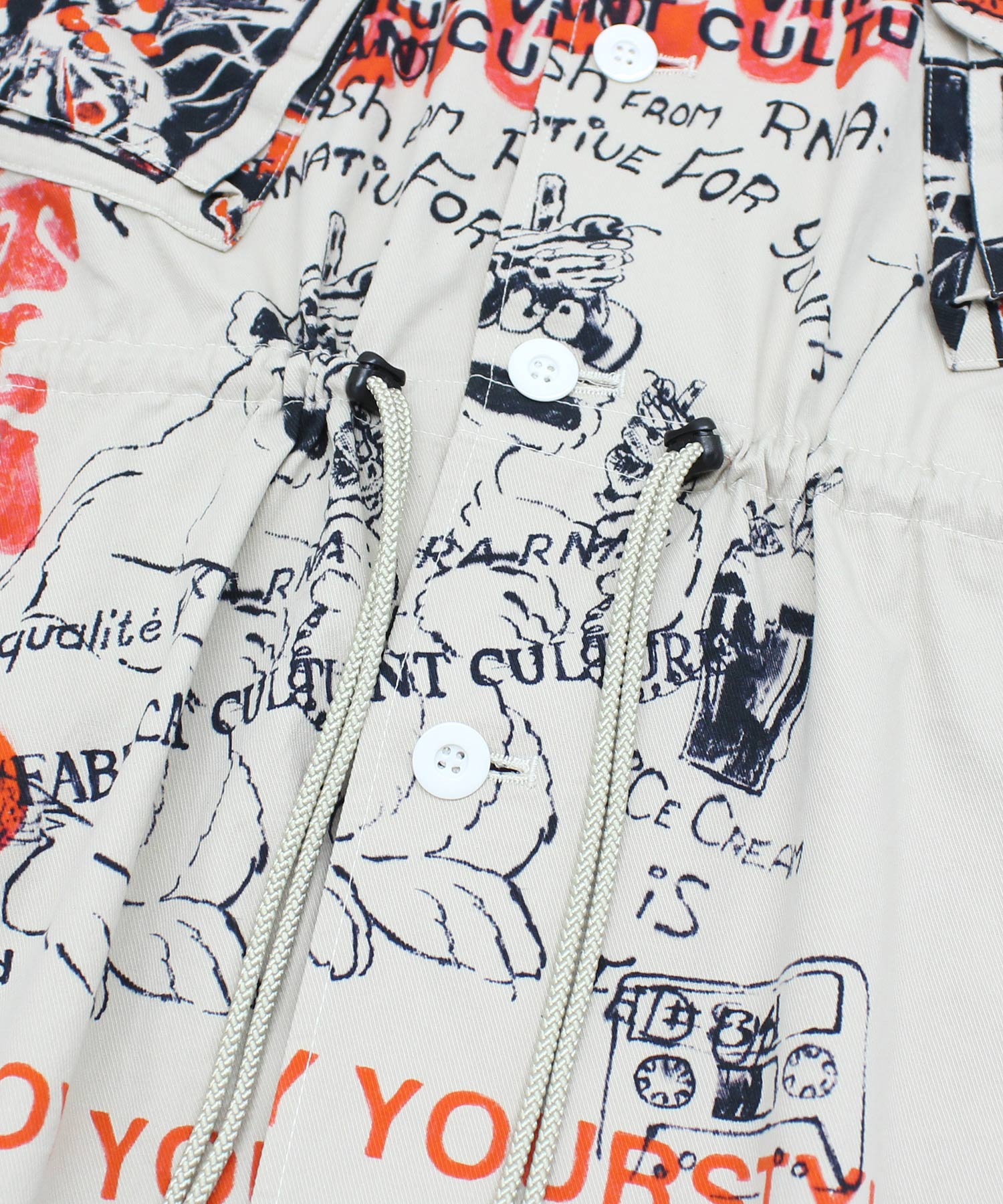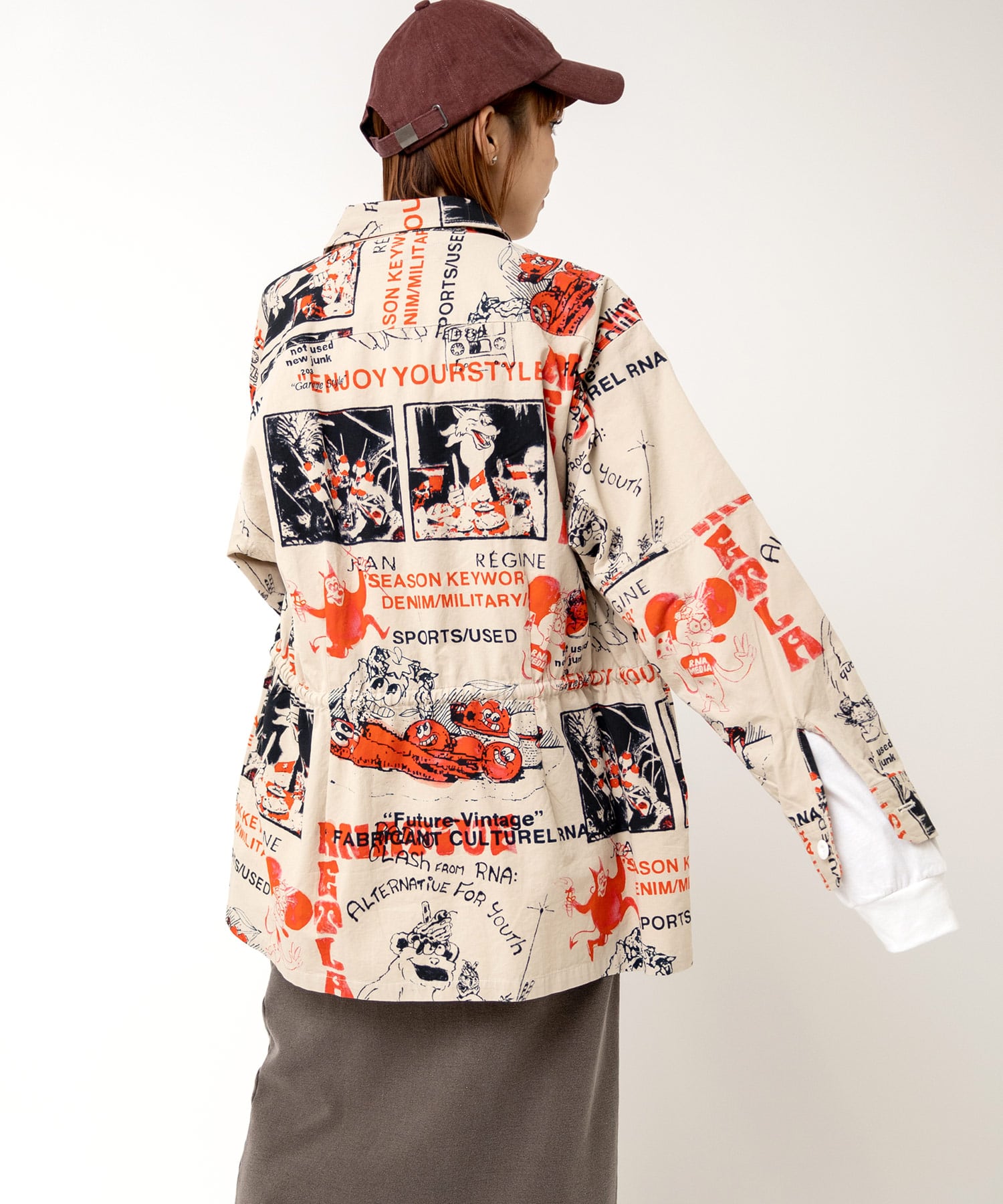 丁寧にハンドドローイングされた落書き柄になります。立体ポケット、肘当ての無骨なミリタリーディテールのアイテム。