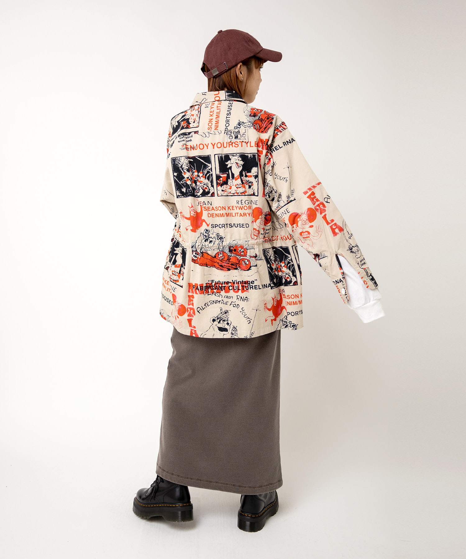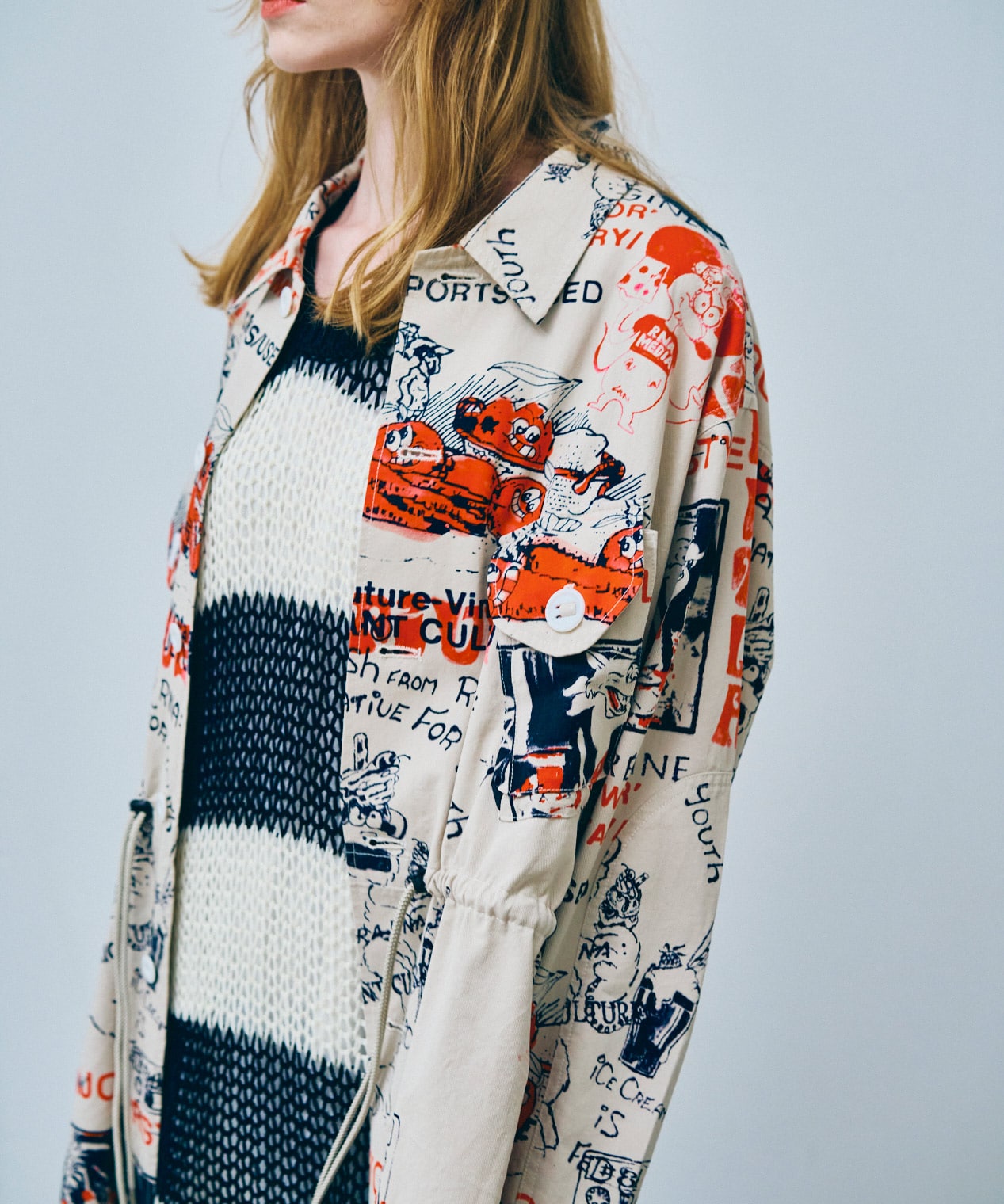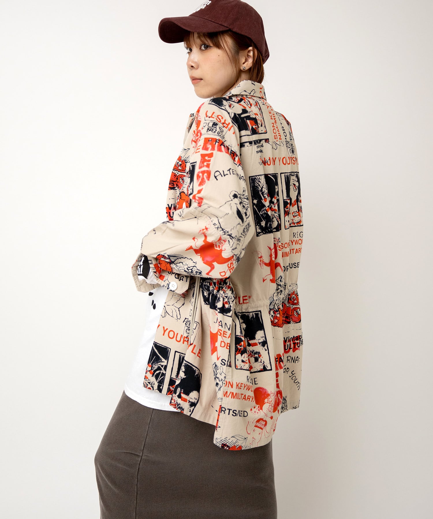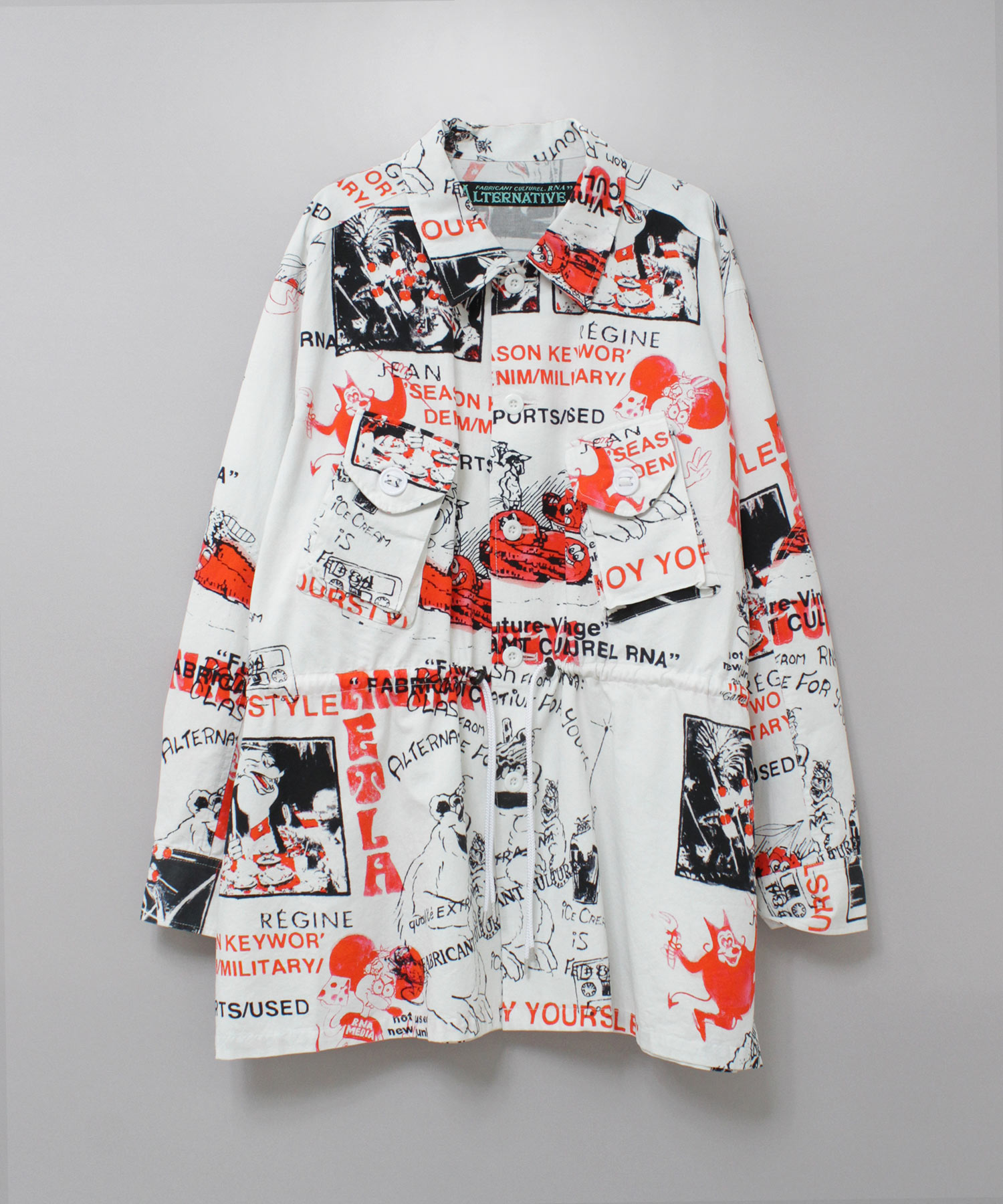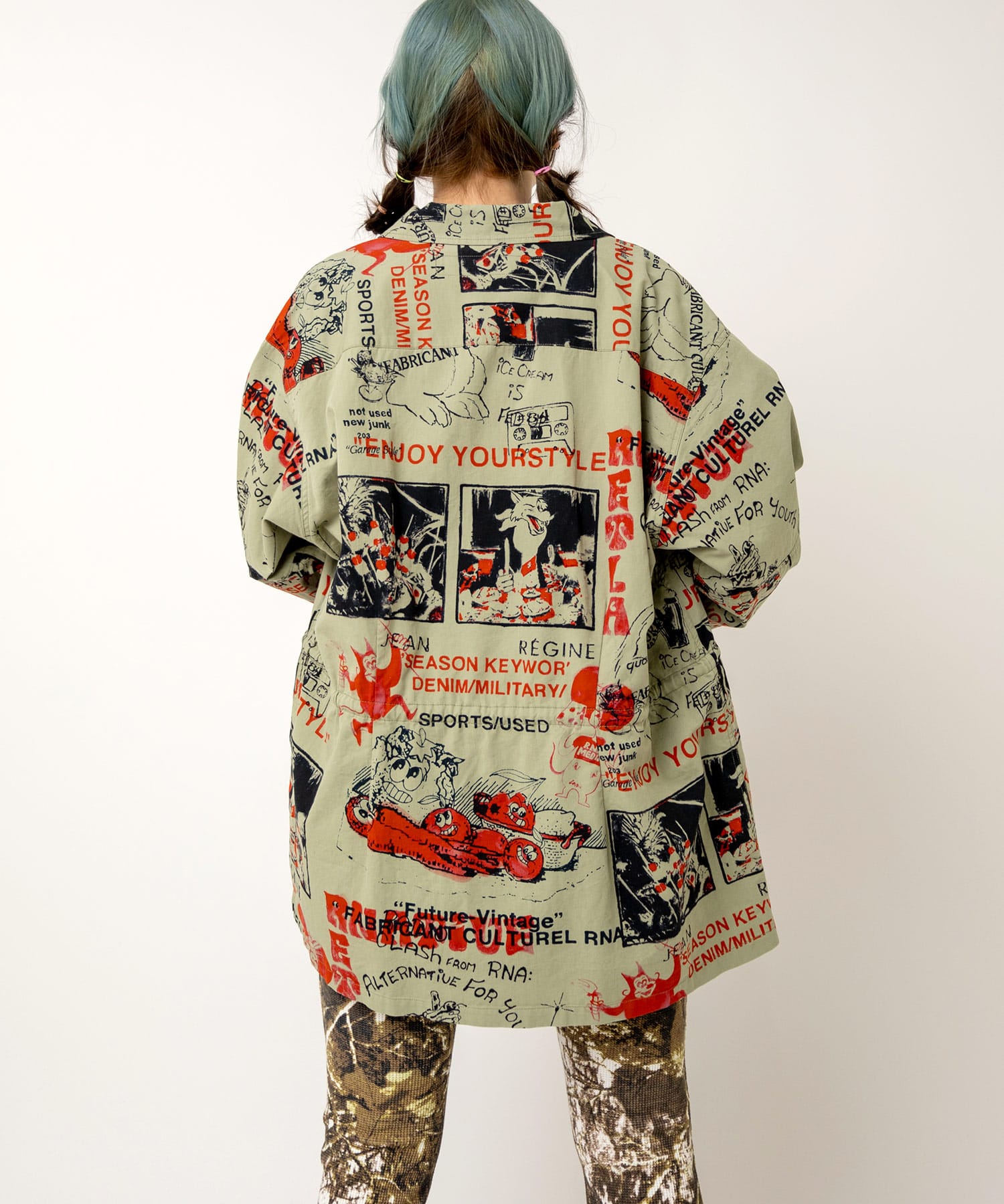 丁寧にハンドドローイングされた落書き柄になります。立体ポケット、肘当ての無骨なミリタリーディテールのアイテム。