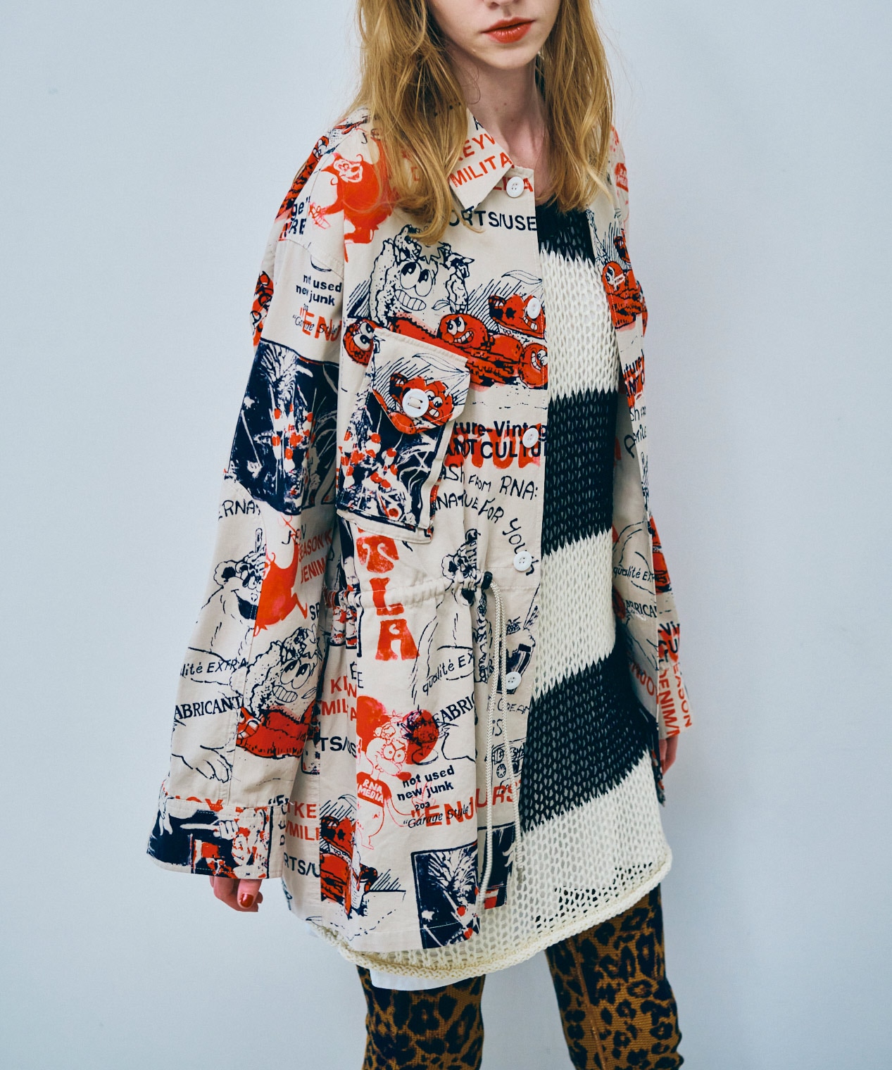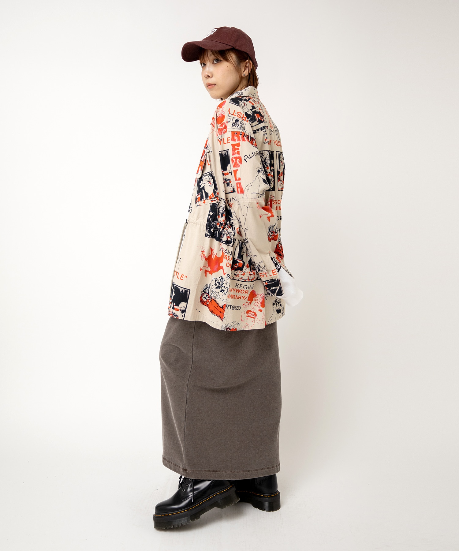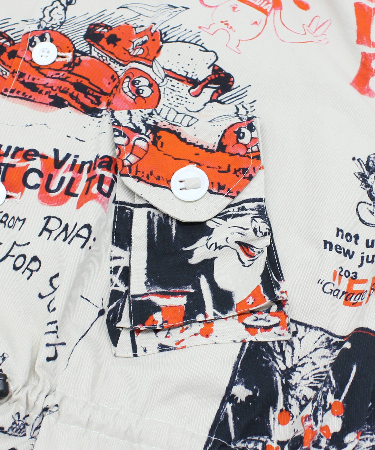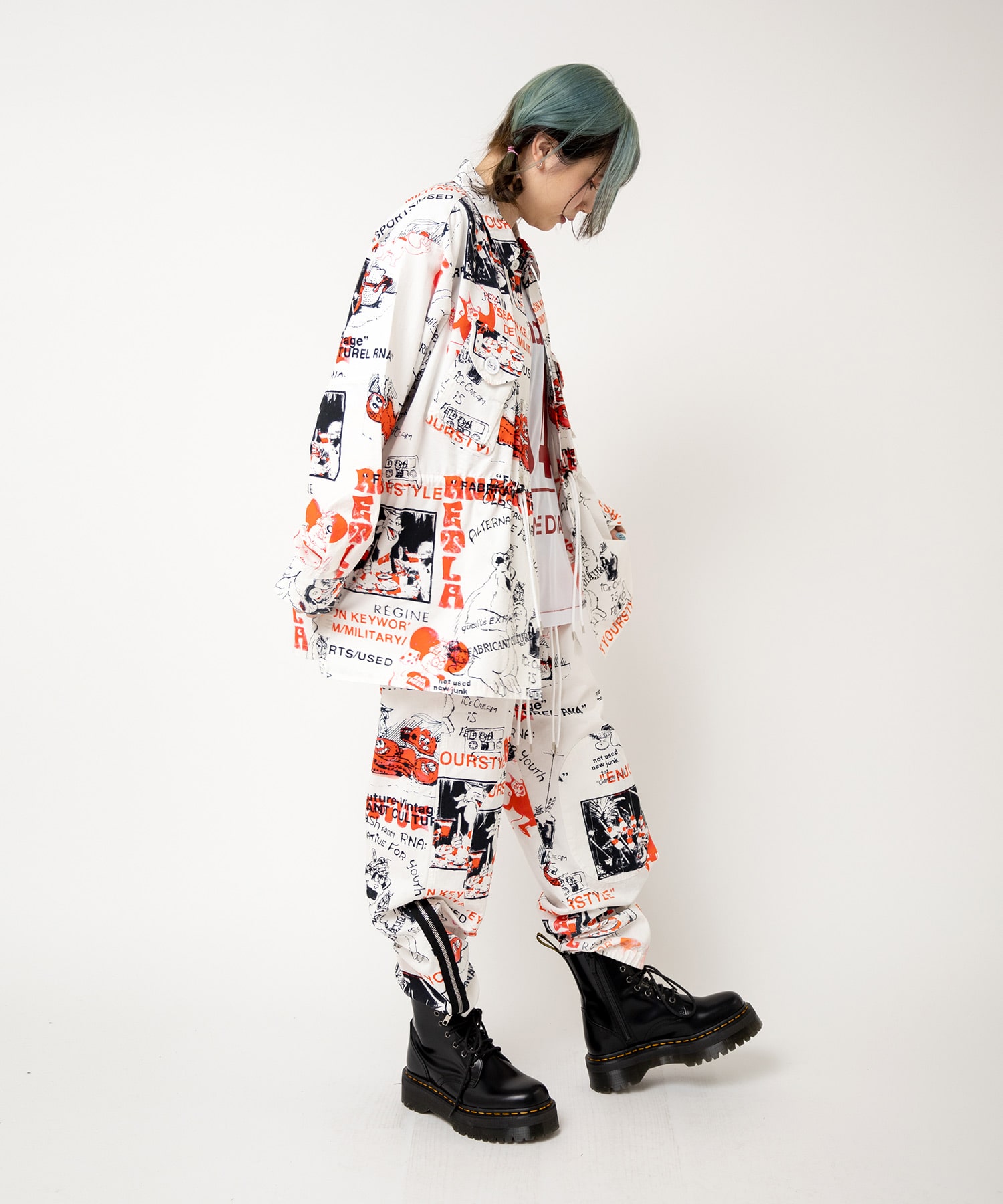 丁寧にハンドドローイングされた落書き柄になります。立体ポケット、肘当ての無骨なミリタリーディテールのアイテム。