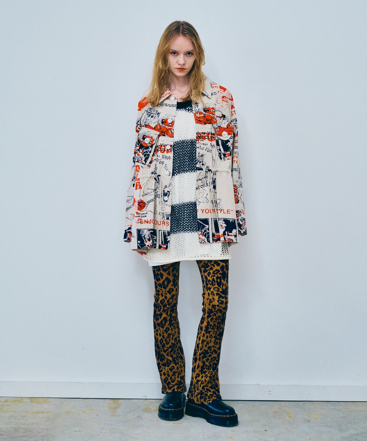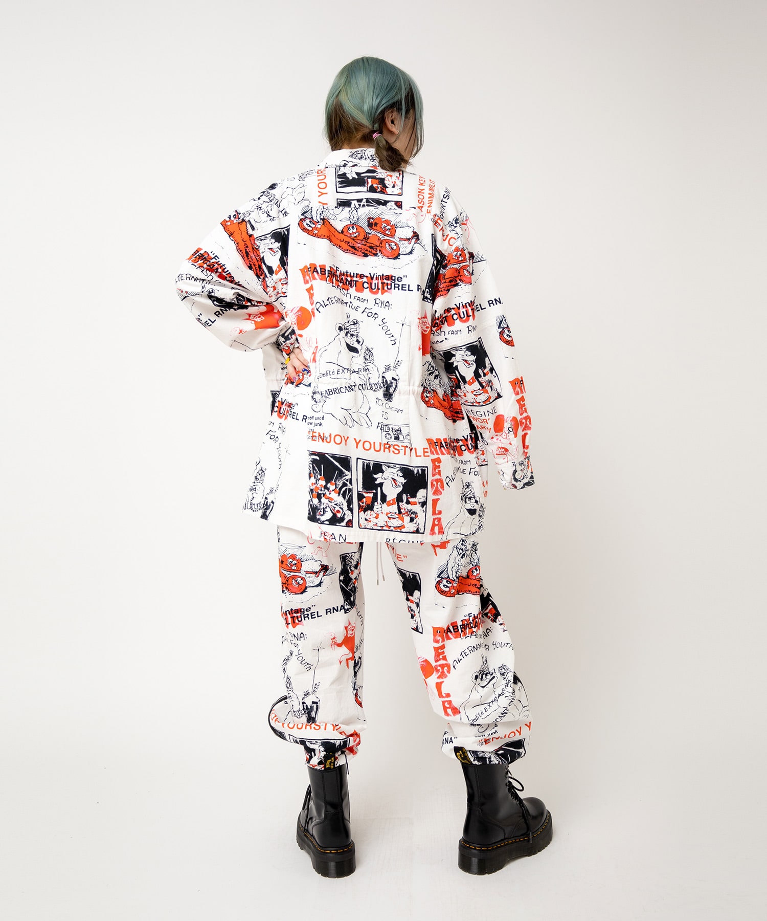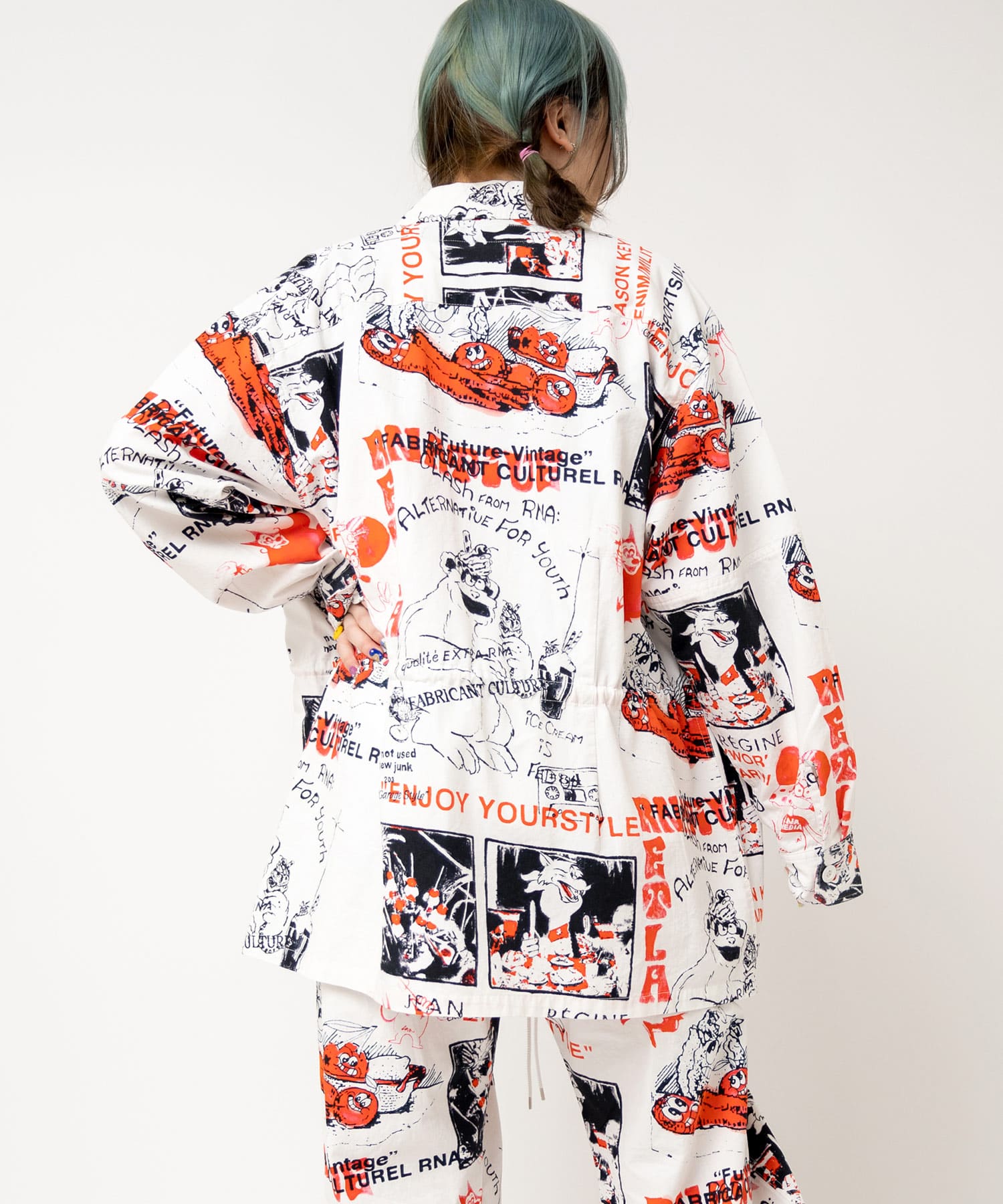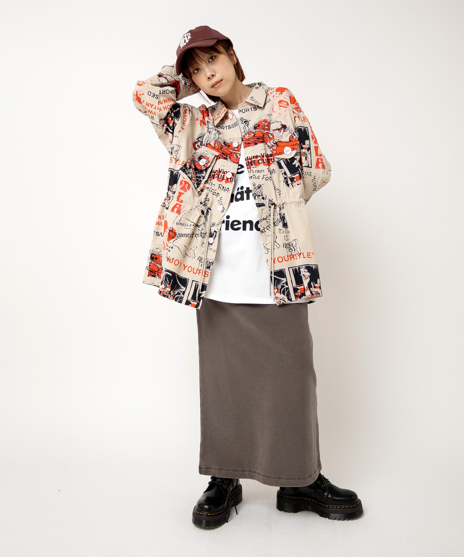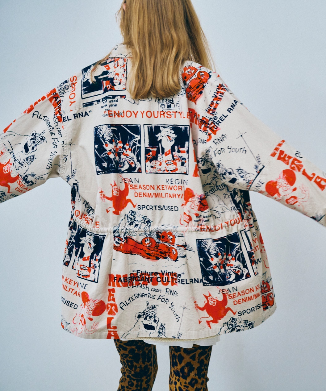 丁寧にハンドドローイングされた落書き柄になります。立体ポケット、肘当ての無骨なミリタリーディテールのアイテム。