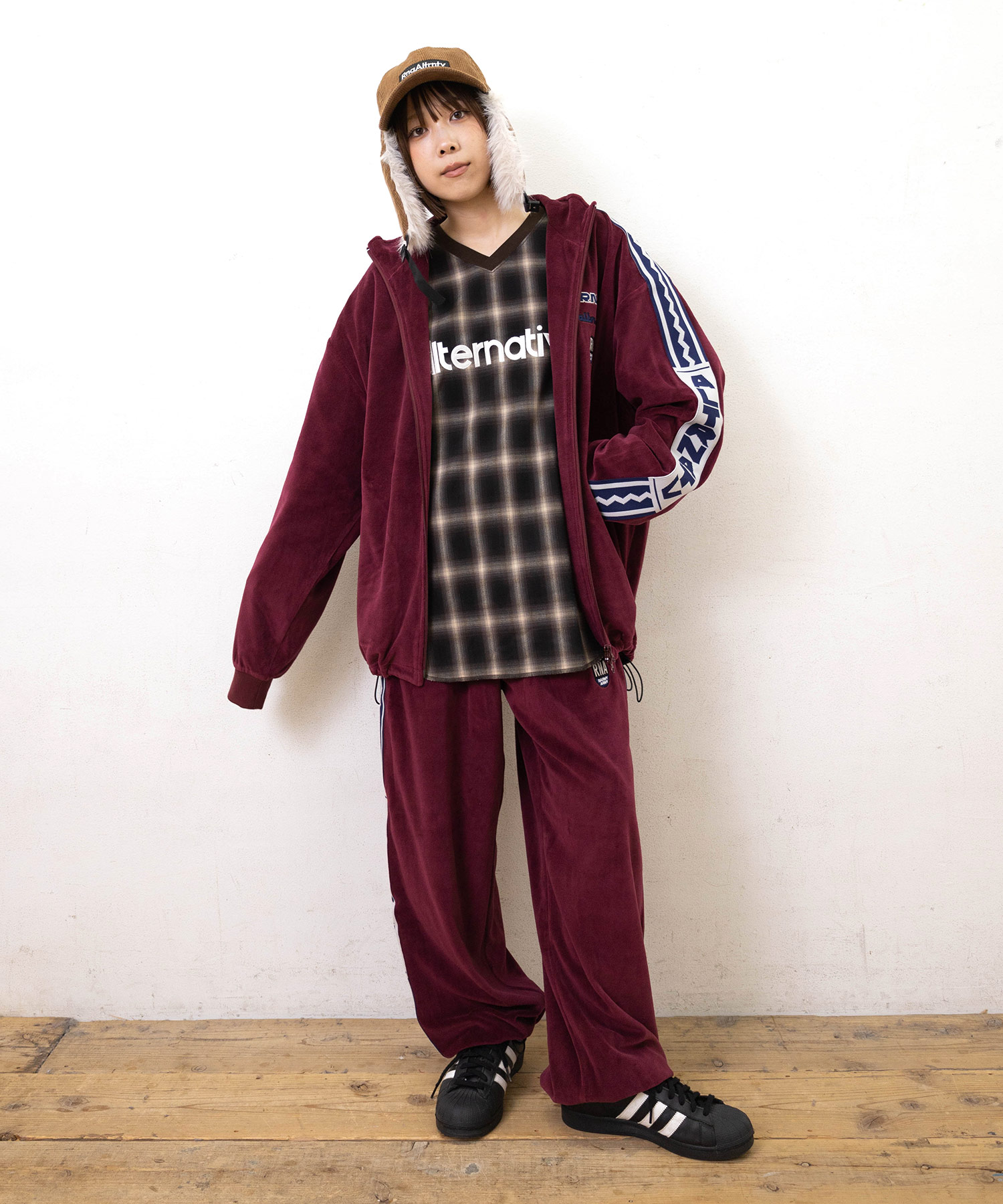 サッカーシャツのような襟元とフロントのロゴ刺繍がスポーツライクなイメージ。ラインパンツや