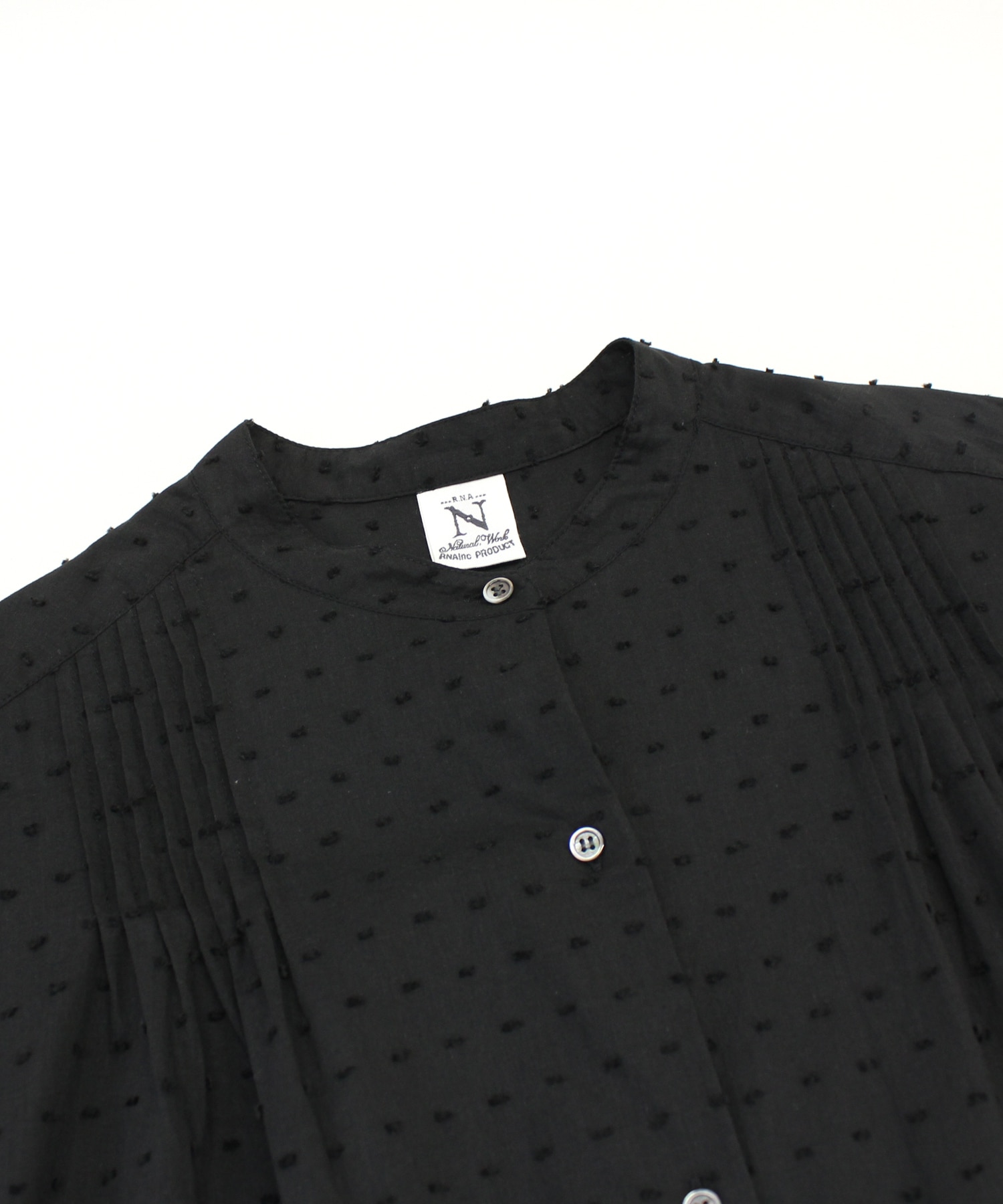 スタンドカラーのピンタックが入ったシャツワンピース。