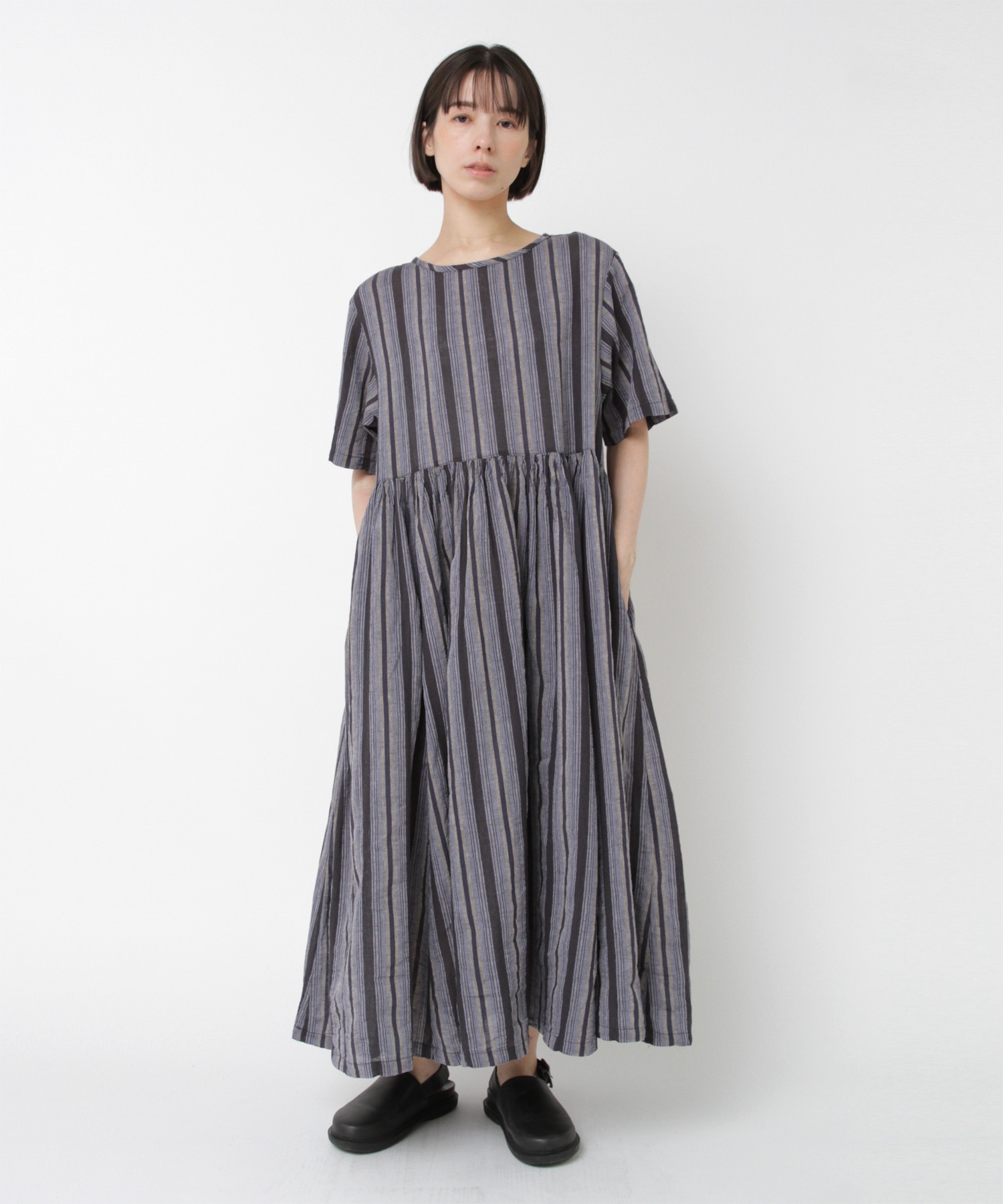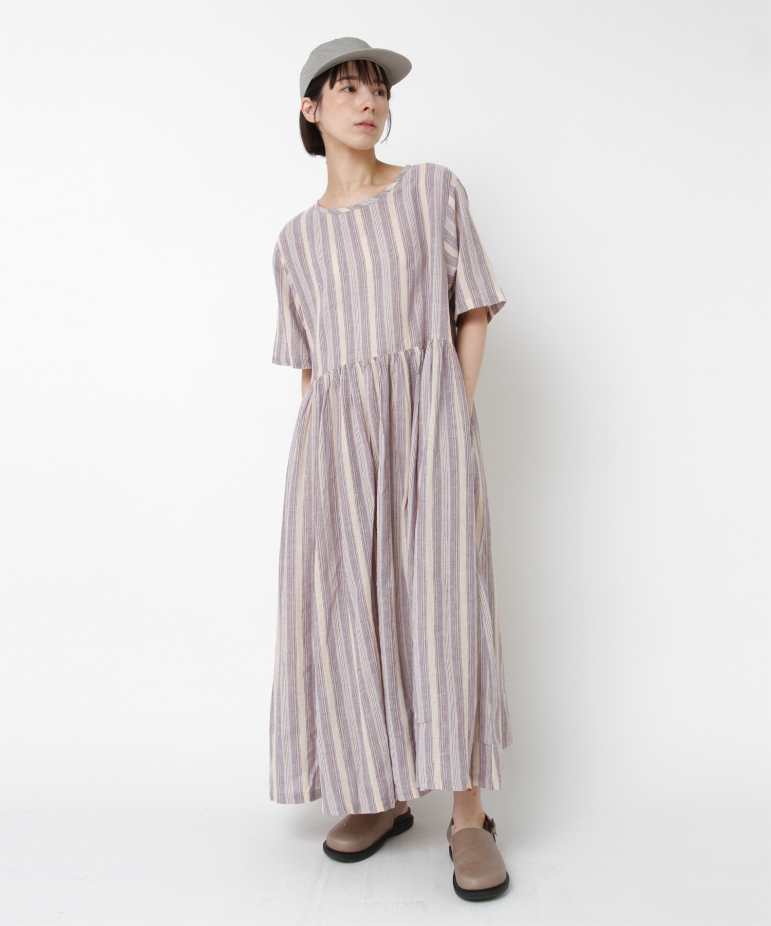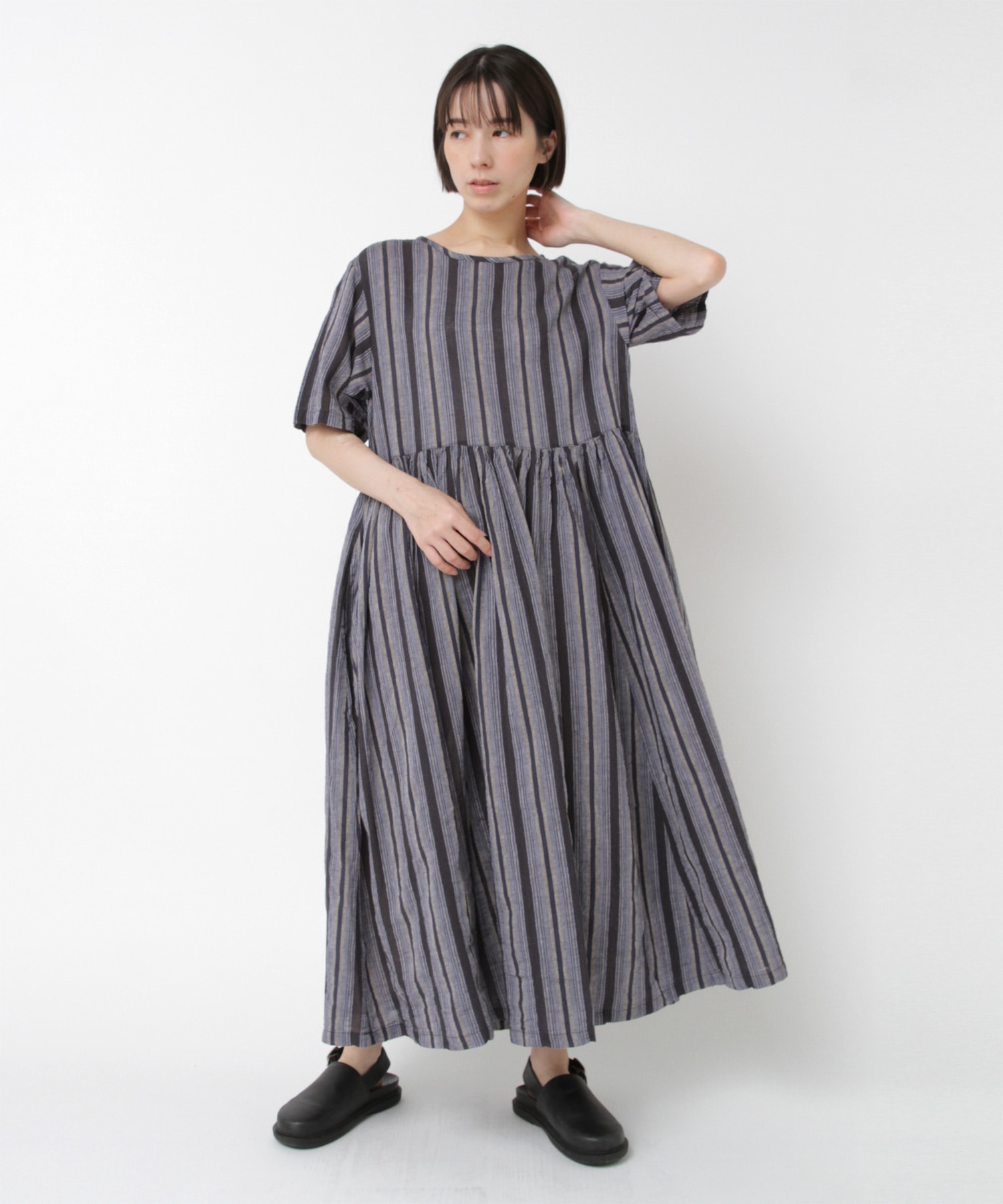 D1678 マルチストライプギャザーワンピ