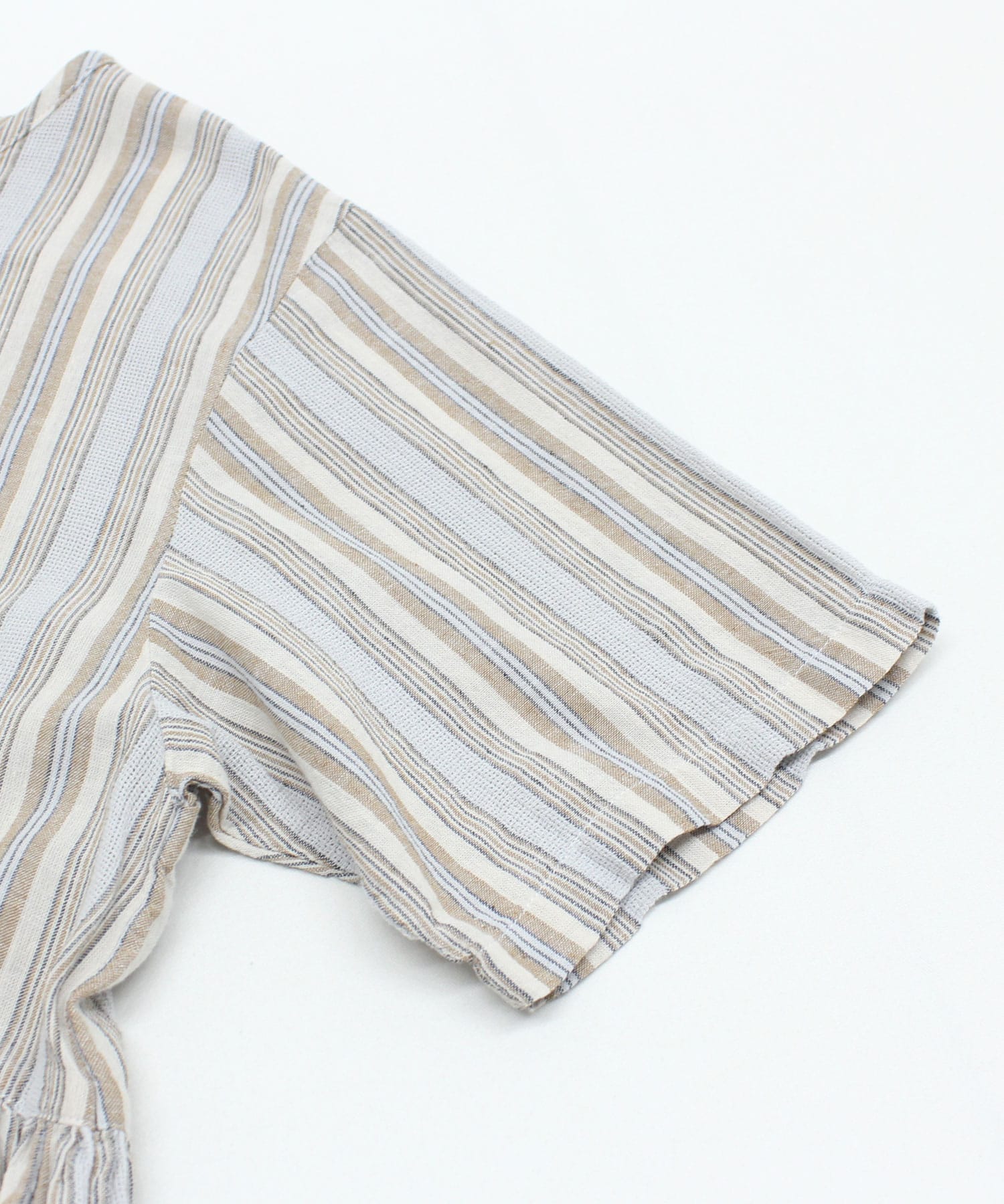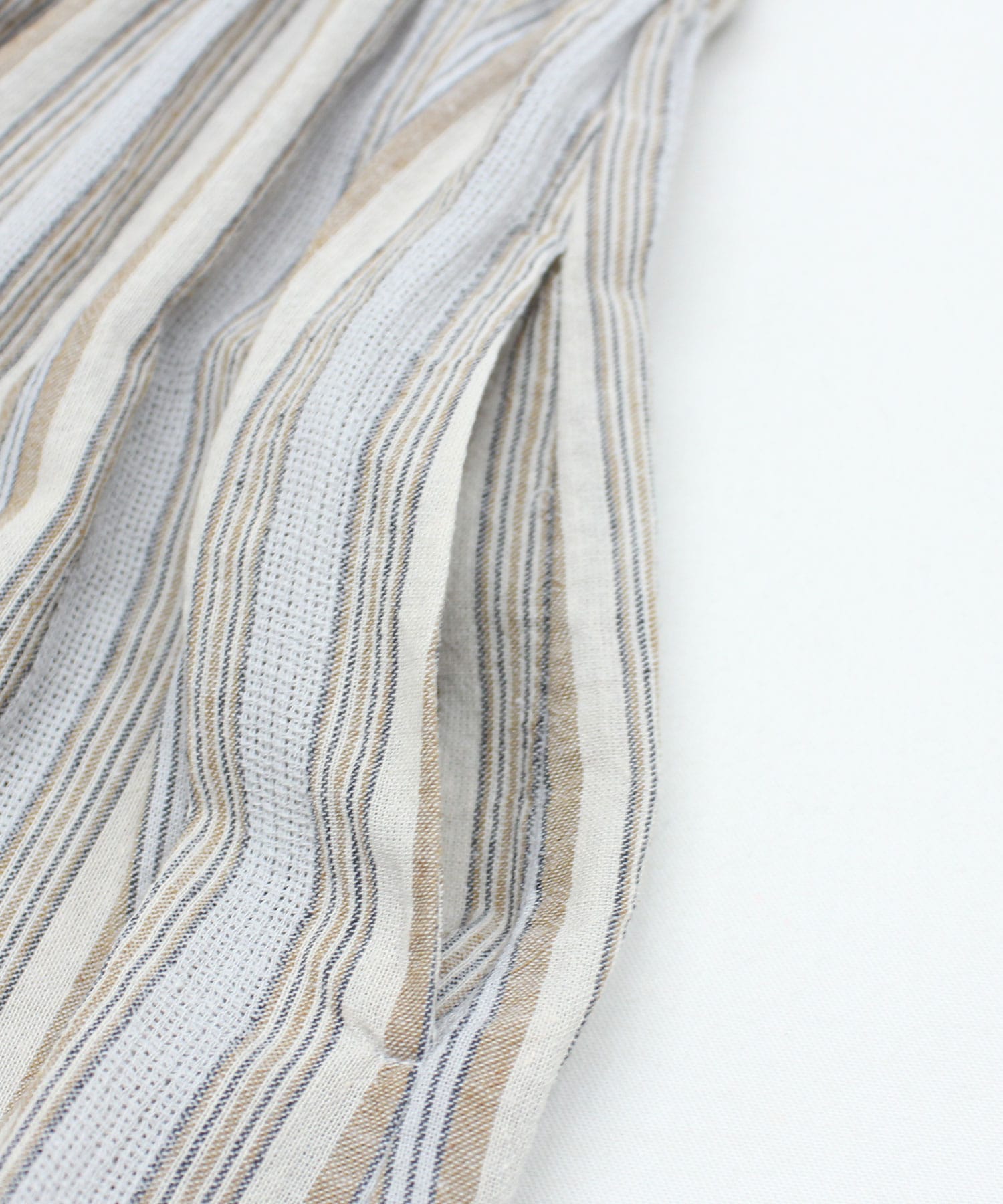 生地には薄手のコットンリネンを使用しており、通気性がよく、肌離れのいいさらりとした質感は、暑い季節にもぴったりの清涼感です。ナチュラルな風合いの中に、さりげない存在感が光ります。