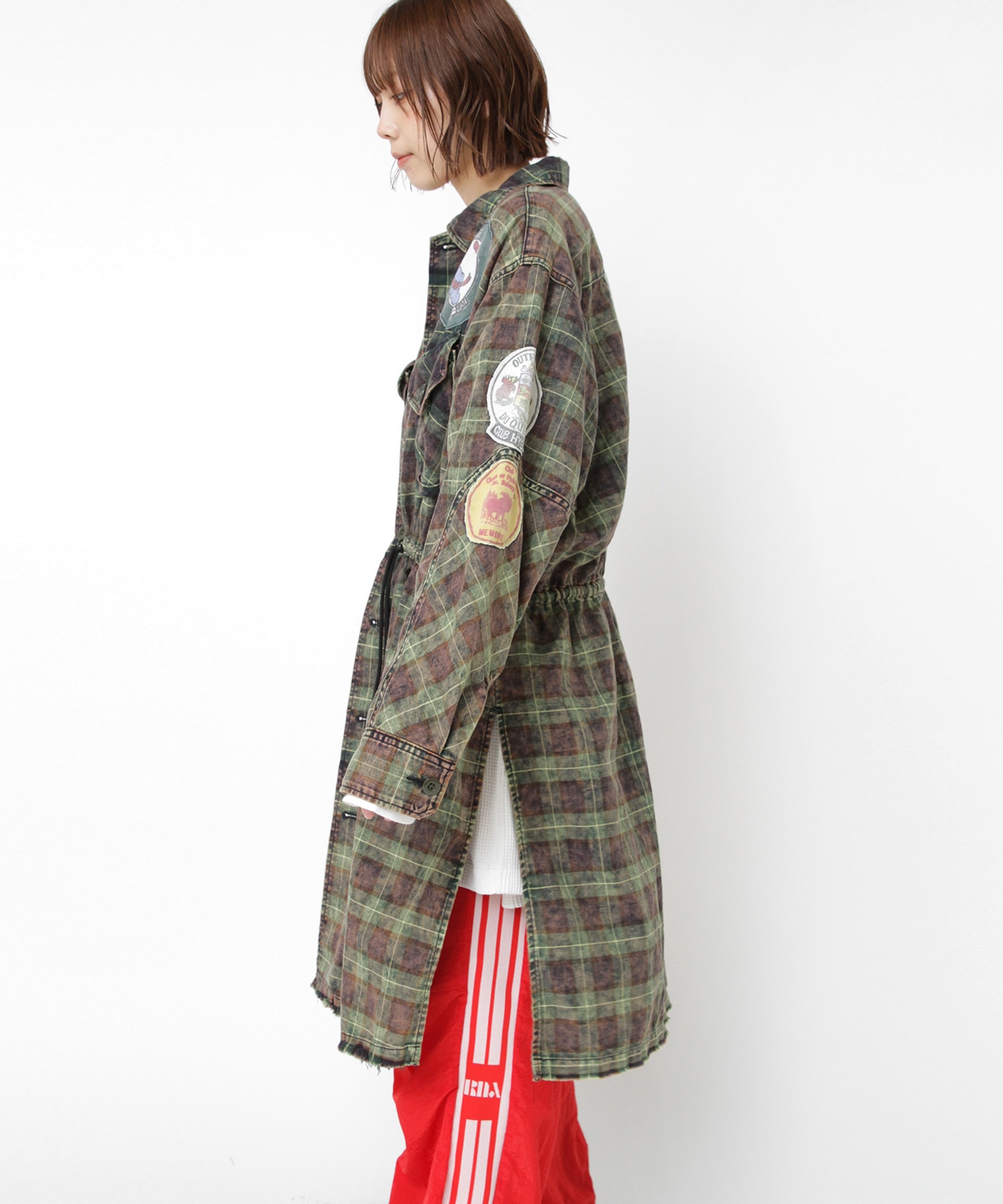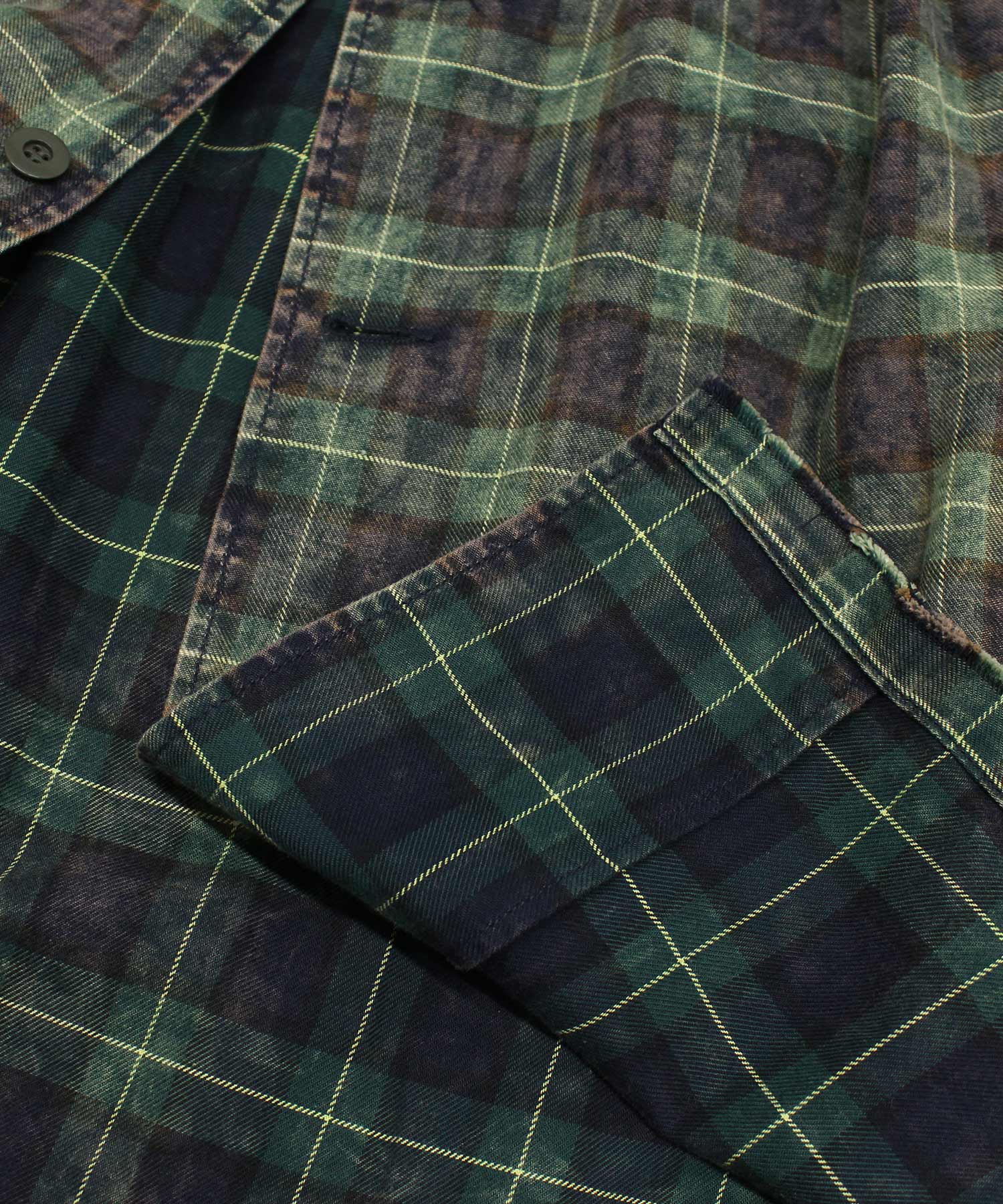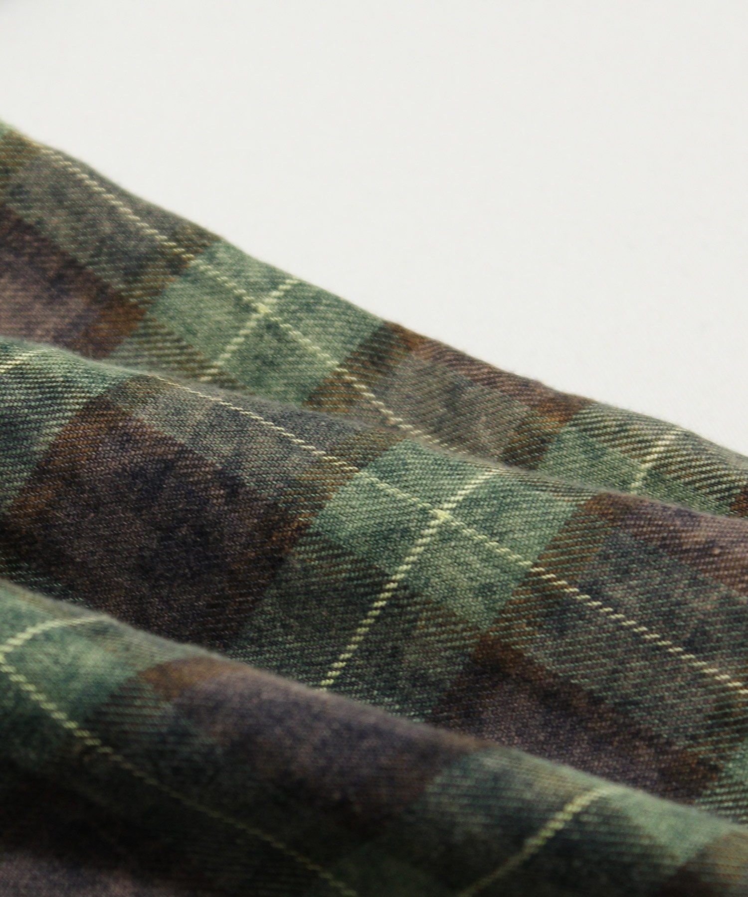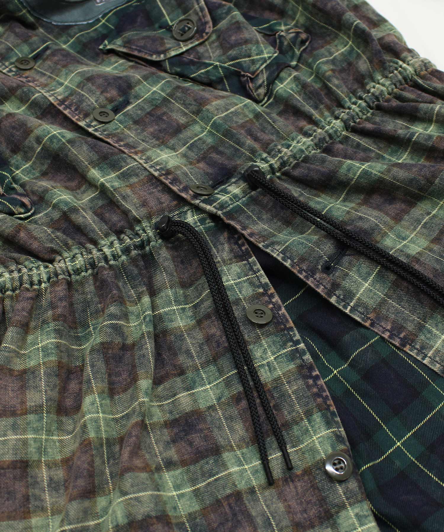深く入ったサイドスリットが軽快に着用していただけます。ウエストコードでブラウジングする事でスタイルに変化を付ける事ができ、軽い羽織としてもお使い頂けます。伝統的な英国調のタータンチェックを手作業による激しい加工をする事で商品の個性を高めました。