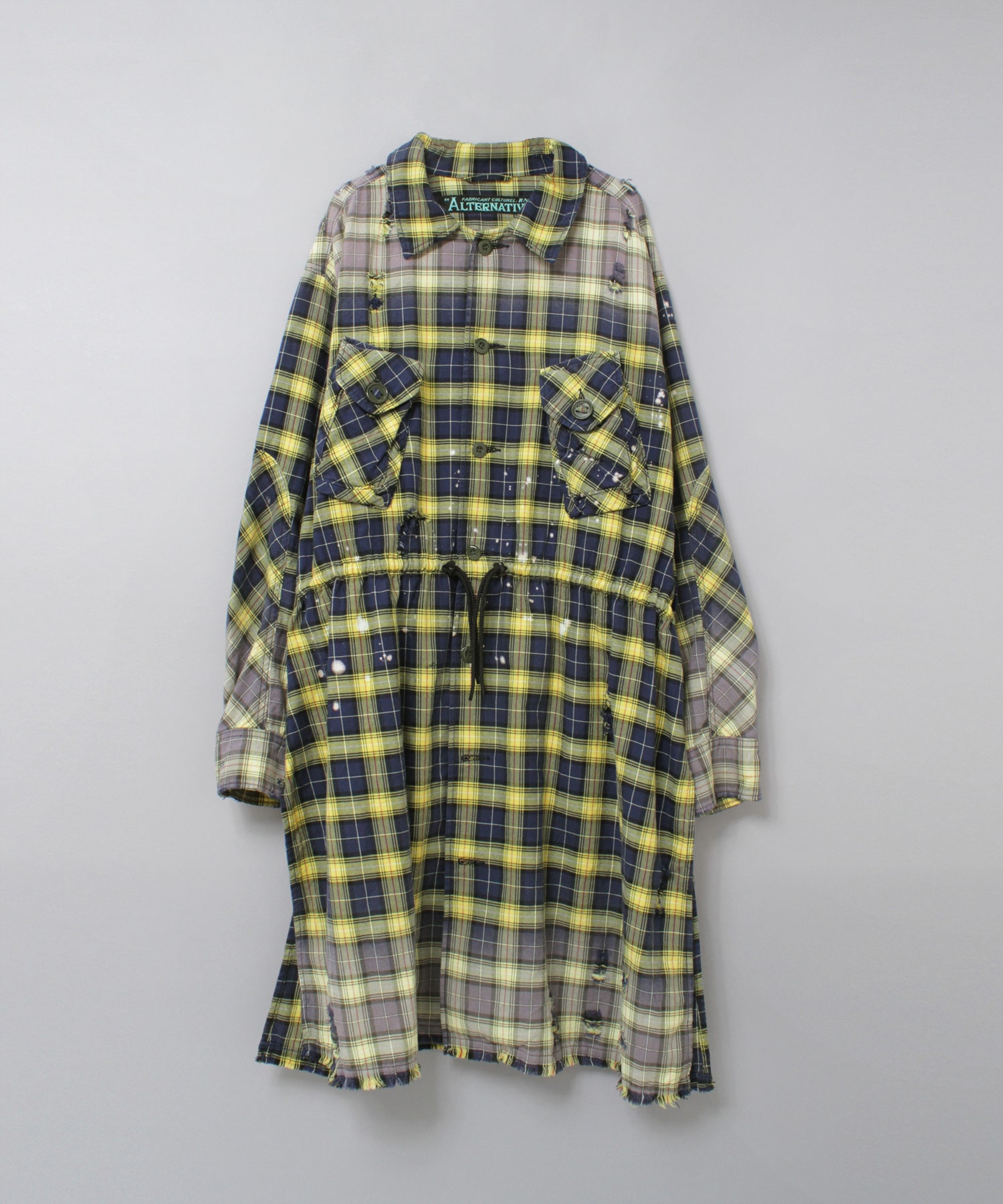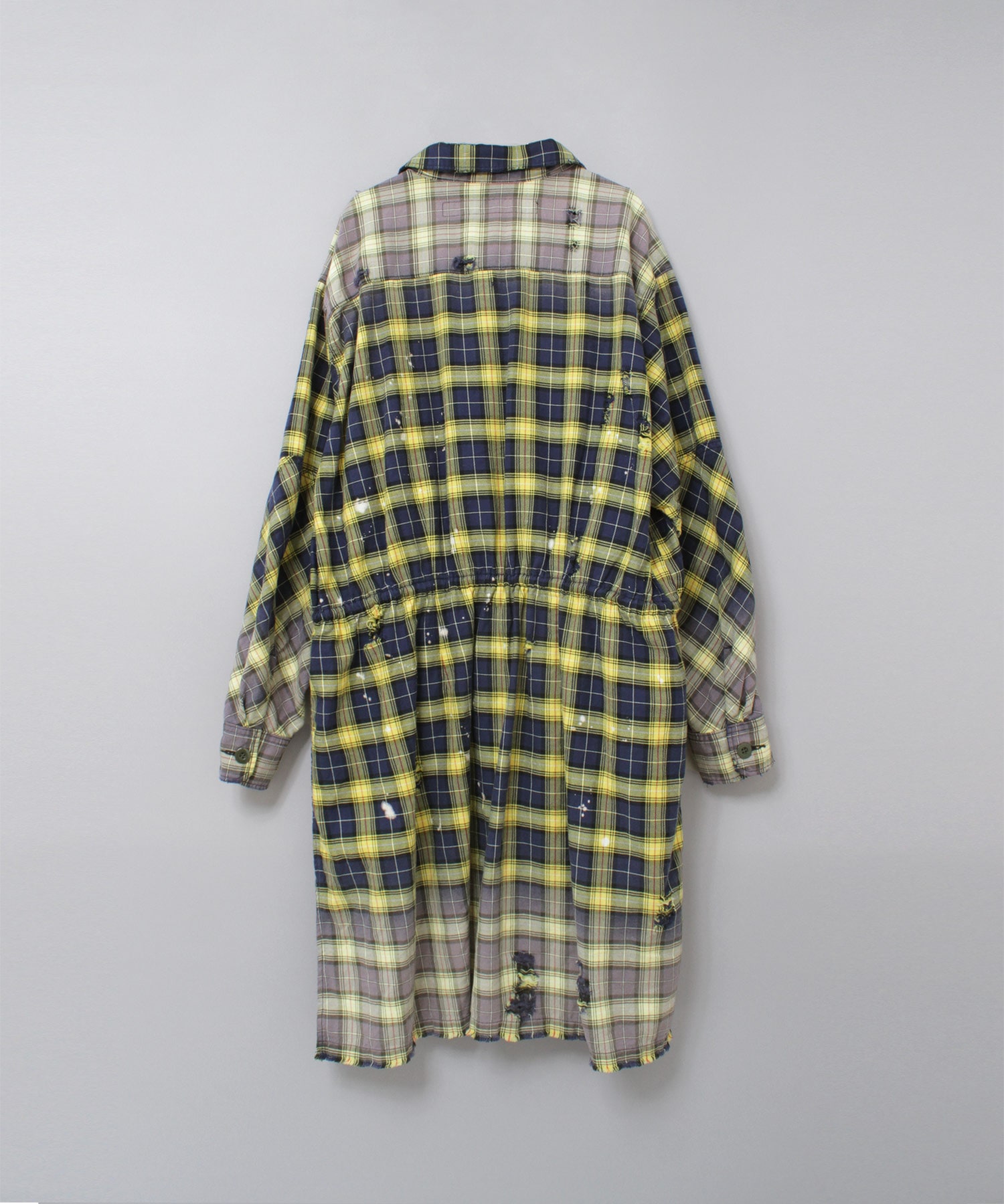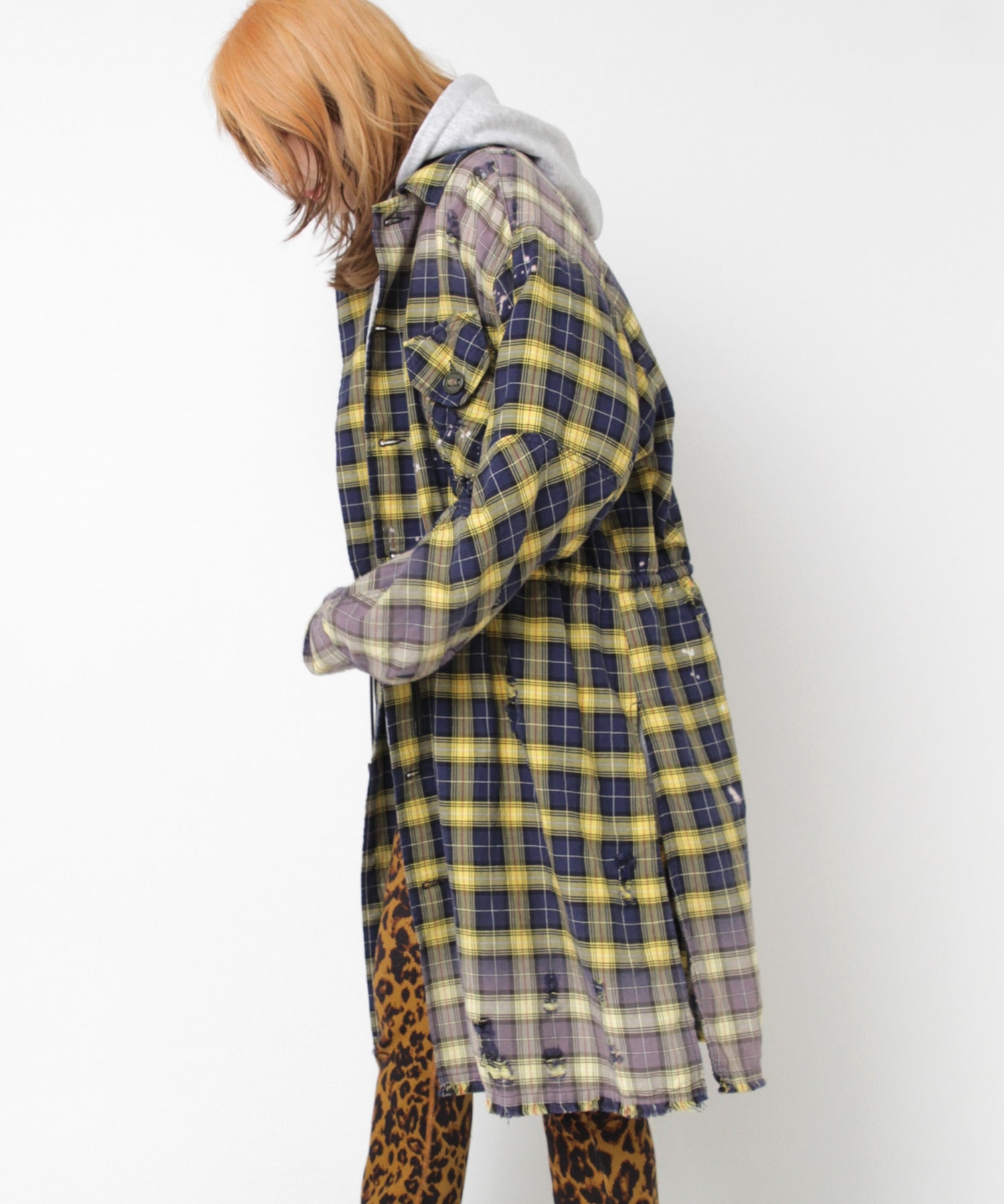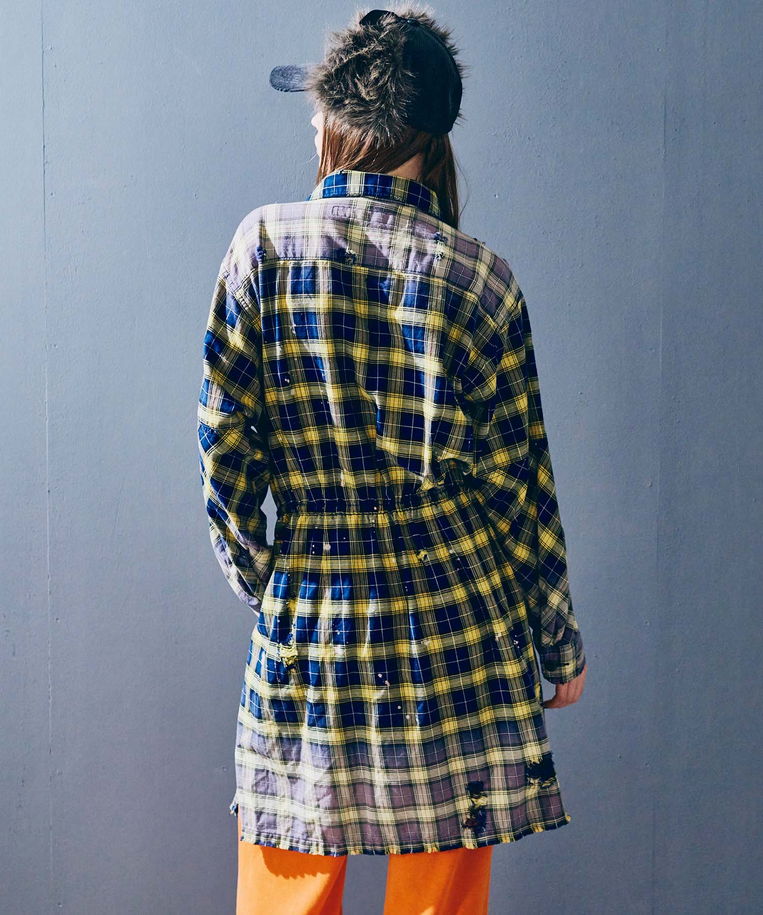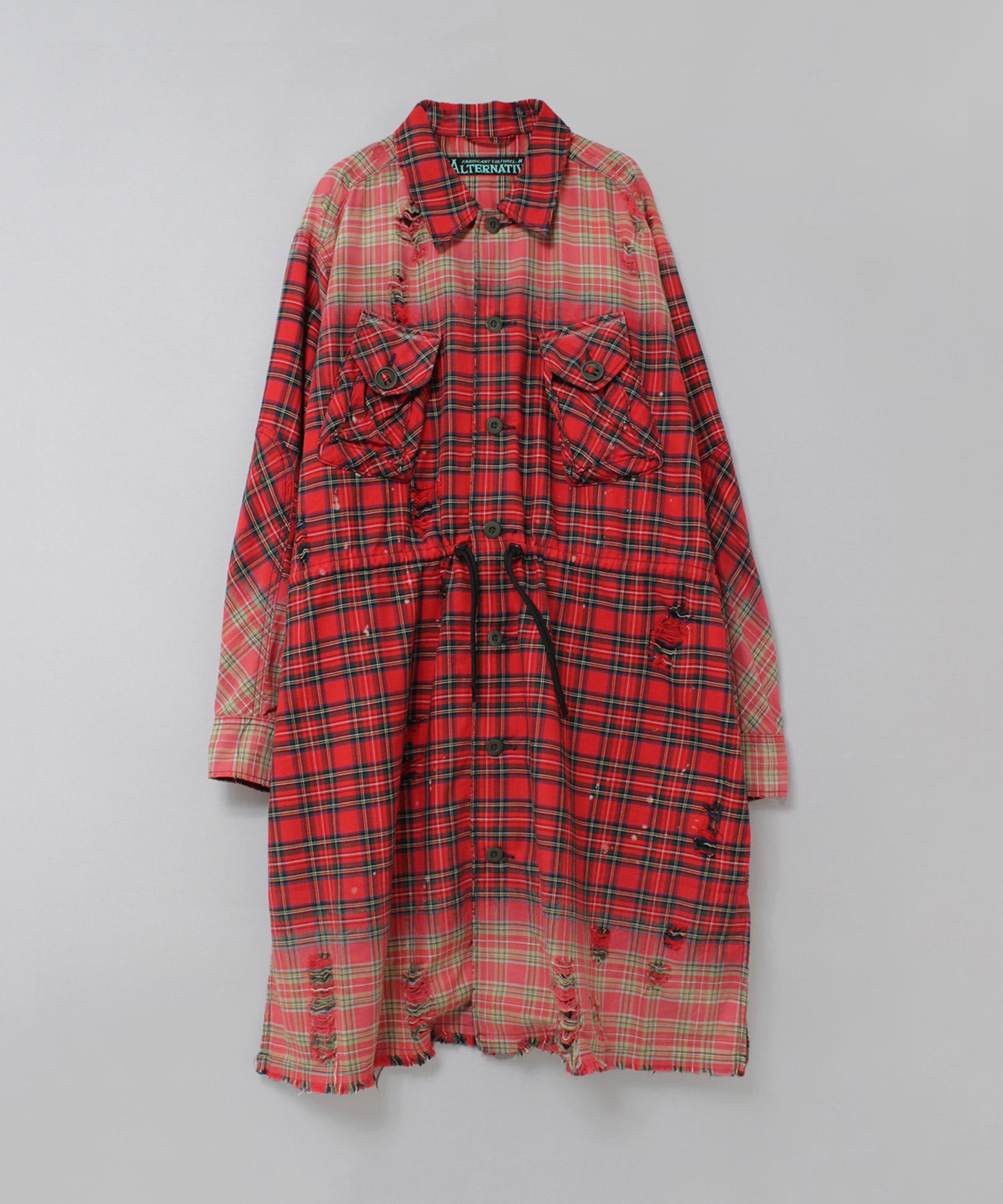 深く入ったサイドスリットが軽快に着用していただけます。ウエストコードでブラウジングする事でスタイルに変化を付ける事ができ、軽い羽織としてもお使い頂けます。伝統的な英国調のタータンチェックを手作業による激しい加工をする事で商品の個性を高めました。