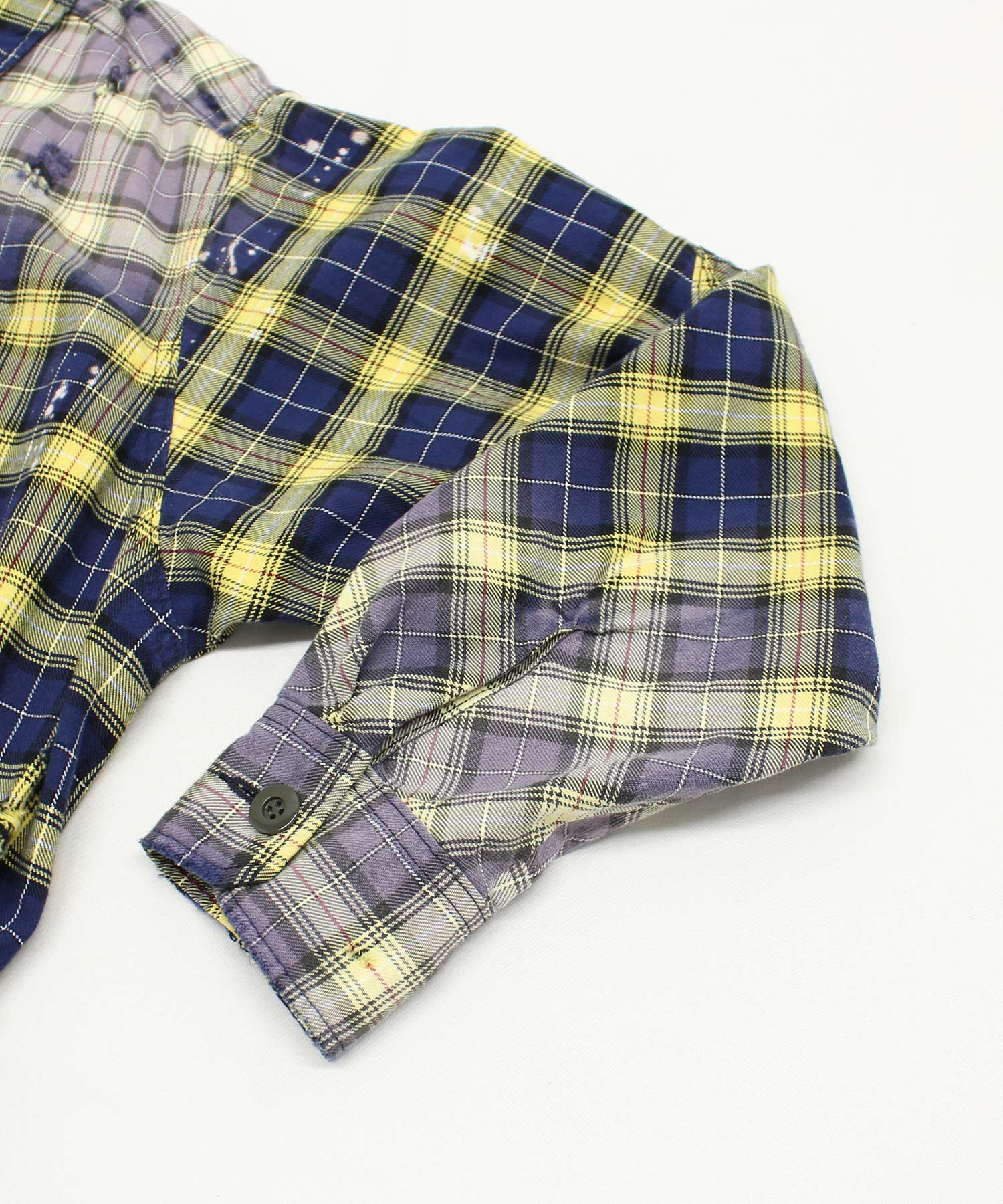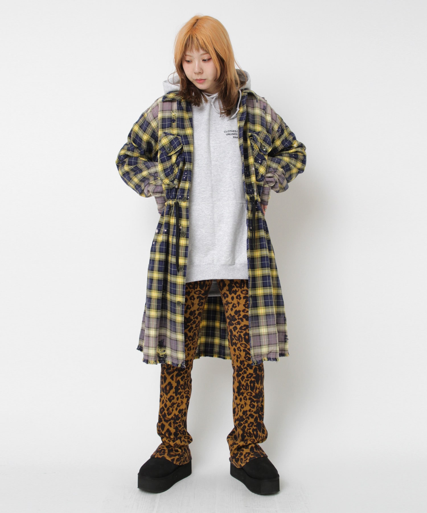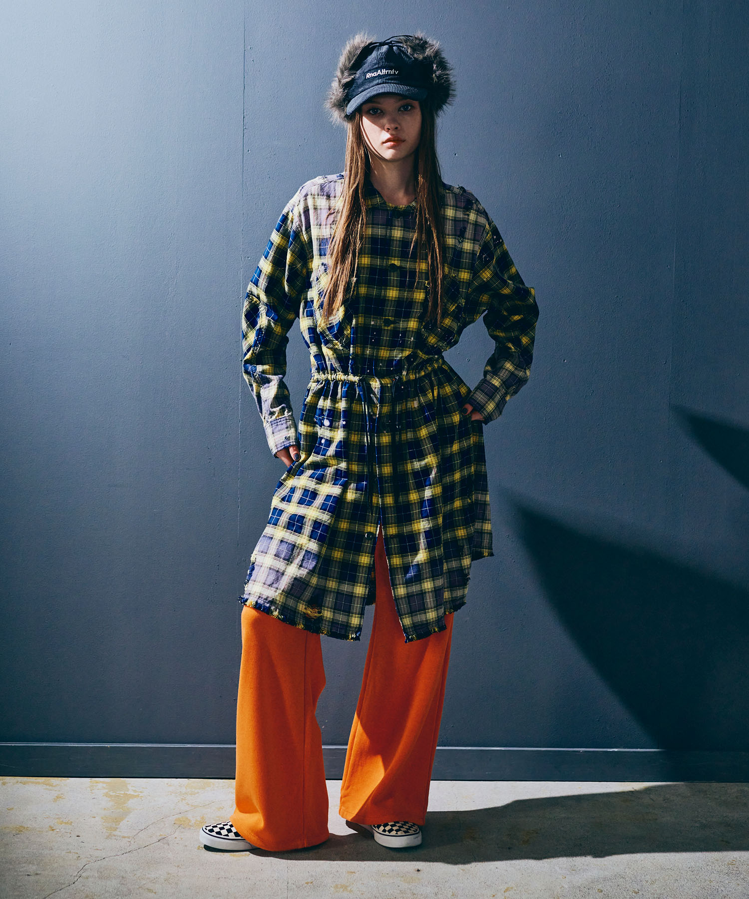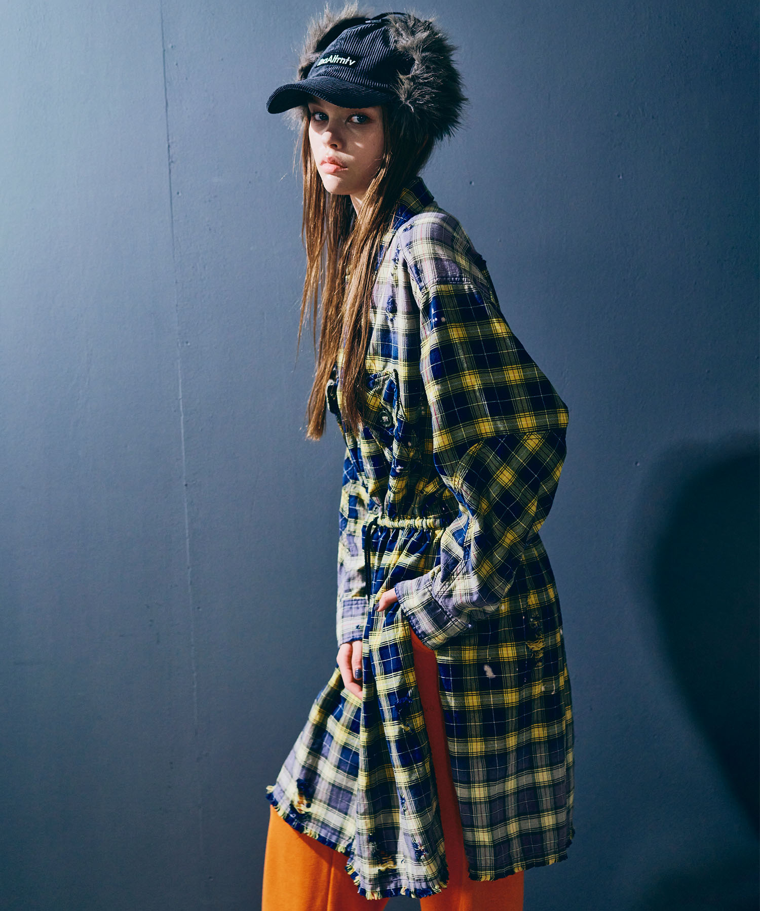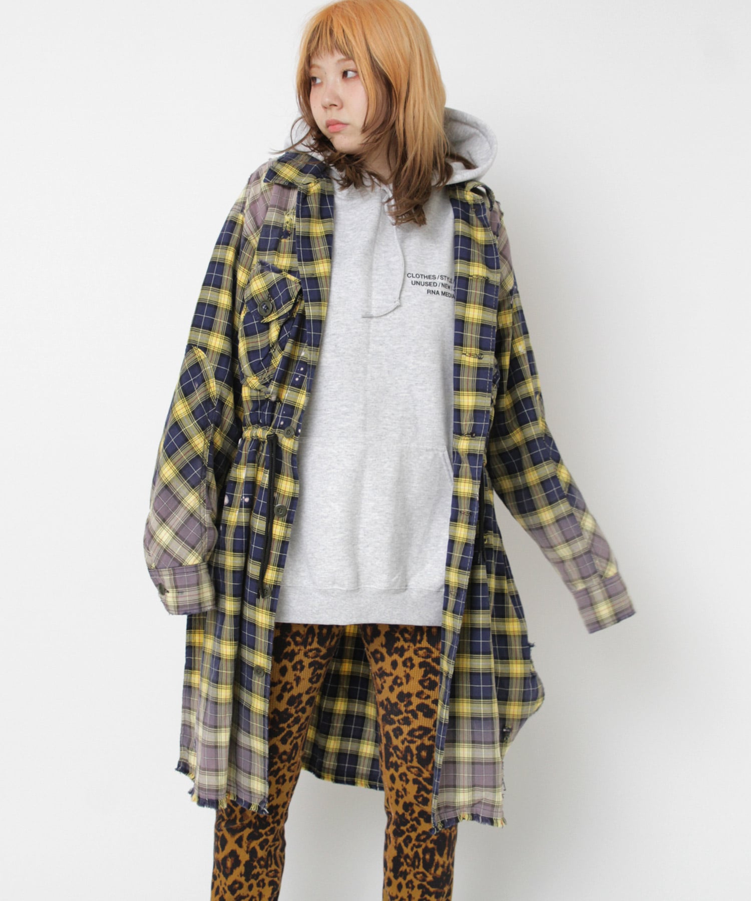 深く入ったサイドスリットが軽快に着用していただけます。ウエストコードでブラウジングする事でスタイルに変化を付ける事ができ、軽い羽織としてもお使い頂けます。伝統的な英国調のタータンチェックを手作業による激しい加工をする事で商品の個性を高めました。