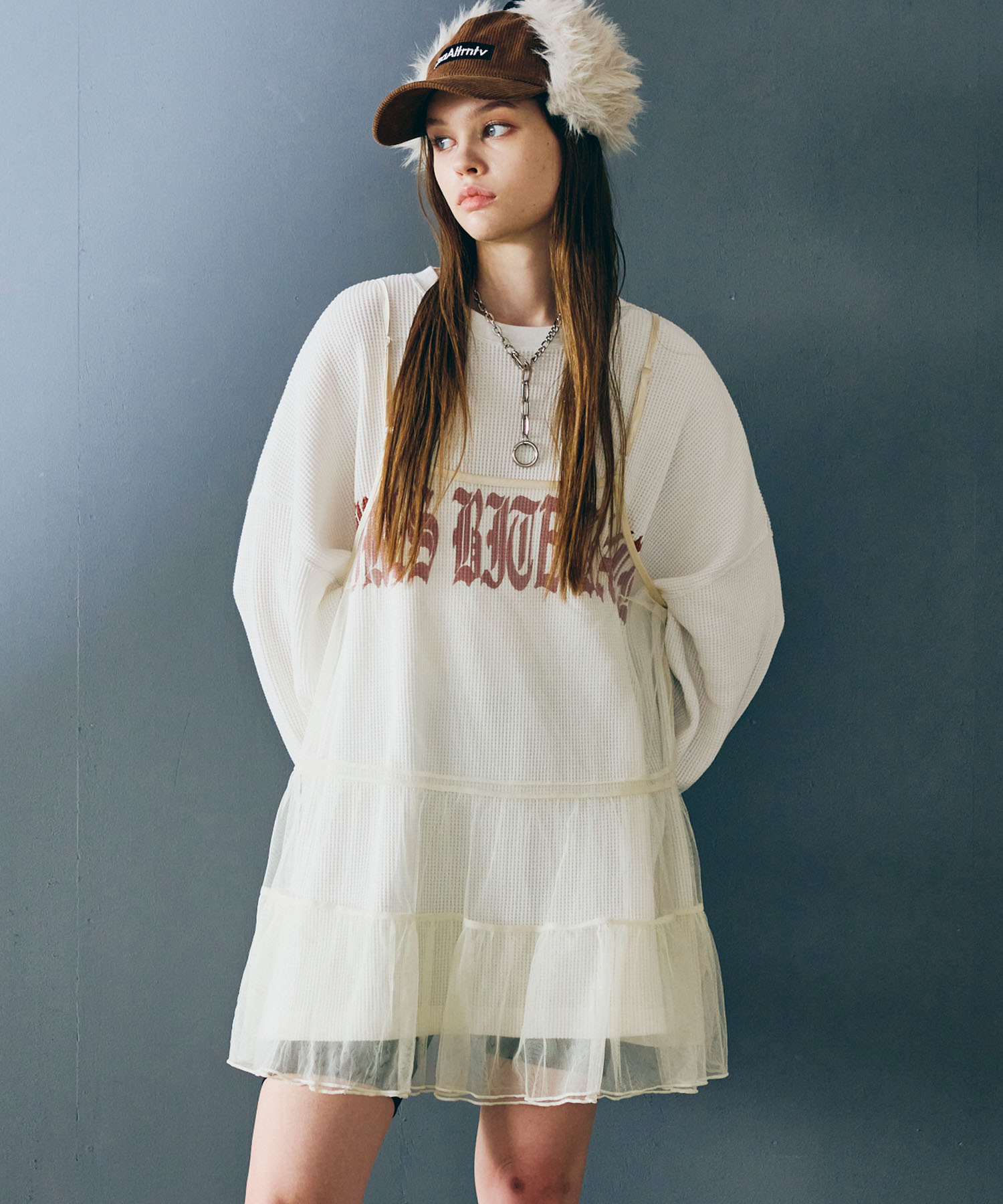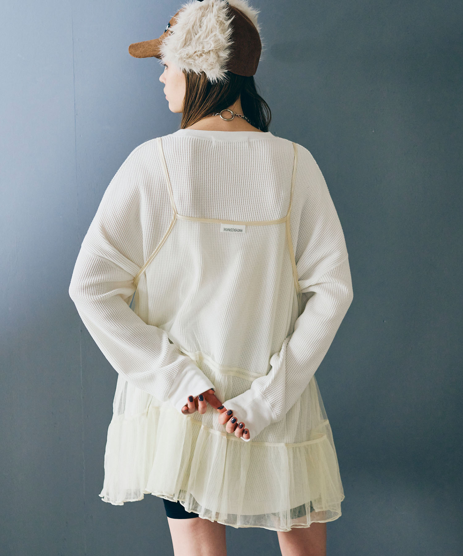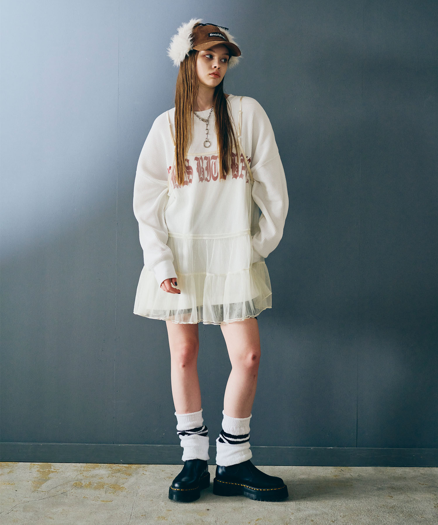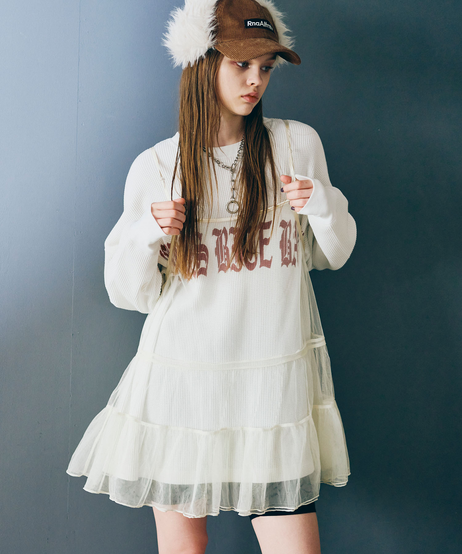 くたくたの着古したようなアイテムとチュールの繊細な感じが甘すぎず、RNAらしく他にはないコーディネートに仕上げてくれます。