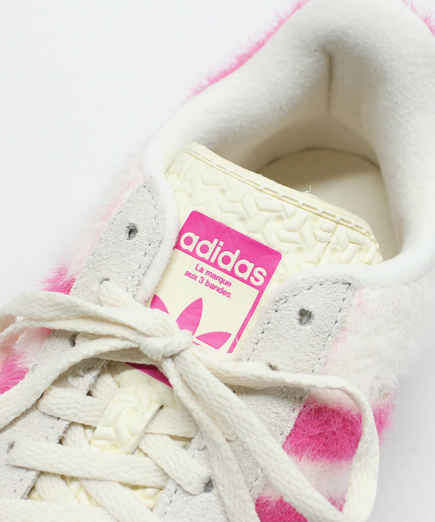 シュータンにブランドロゴが、飾り部分にトリプルガゼルのブランドがあしらわれ、アディダス オリジナルスの伝統を一歩ずつ踏みしめる。