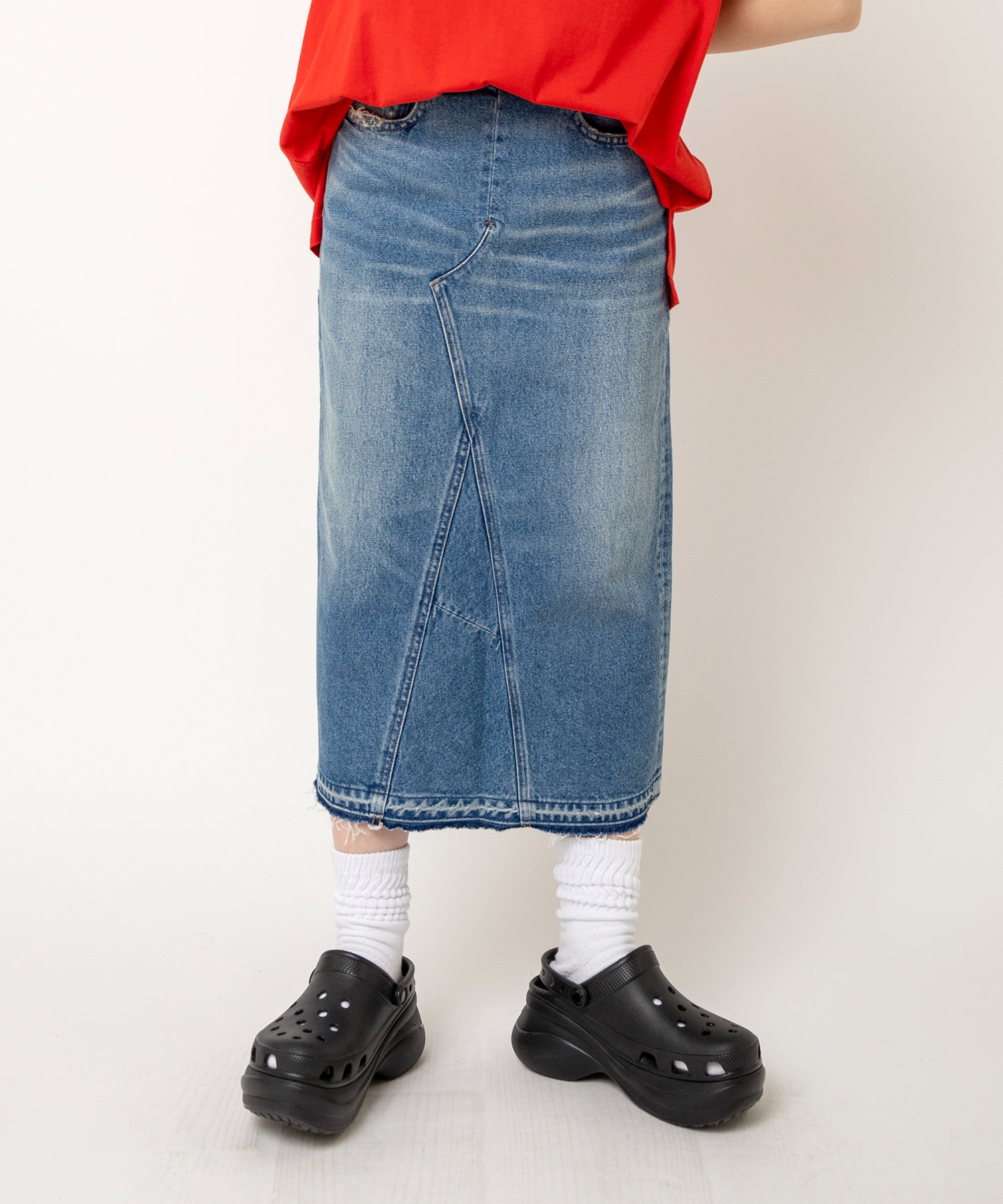 パンツをリメイクした雰囲気でデザインしたデニムロングスカート。