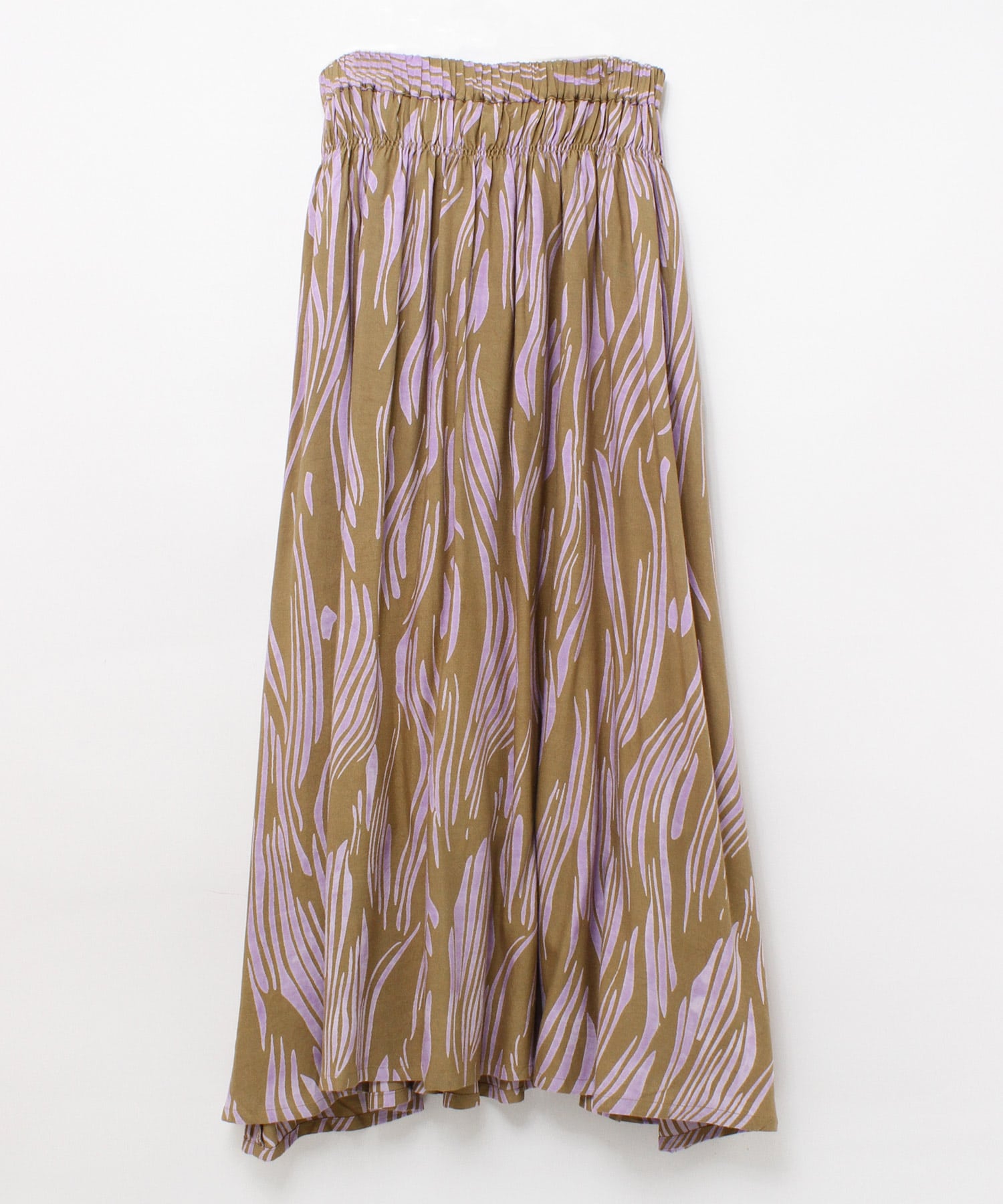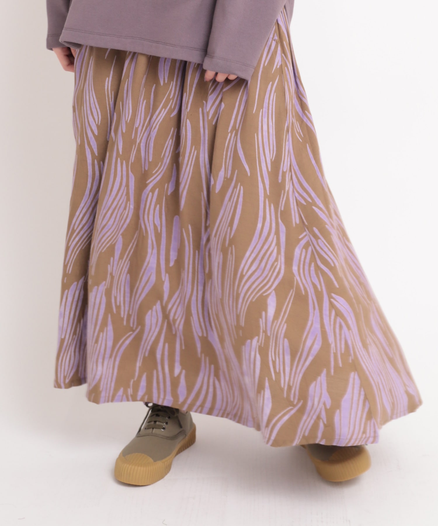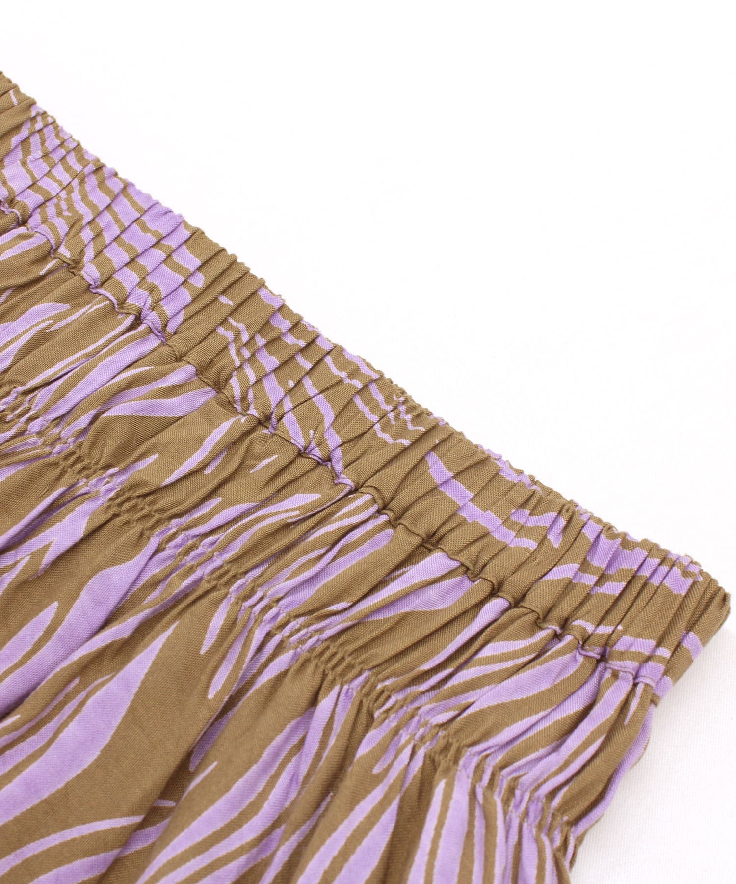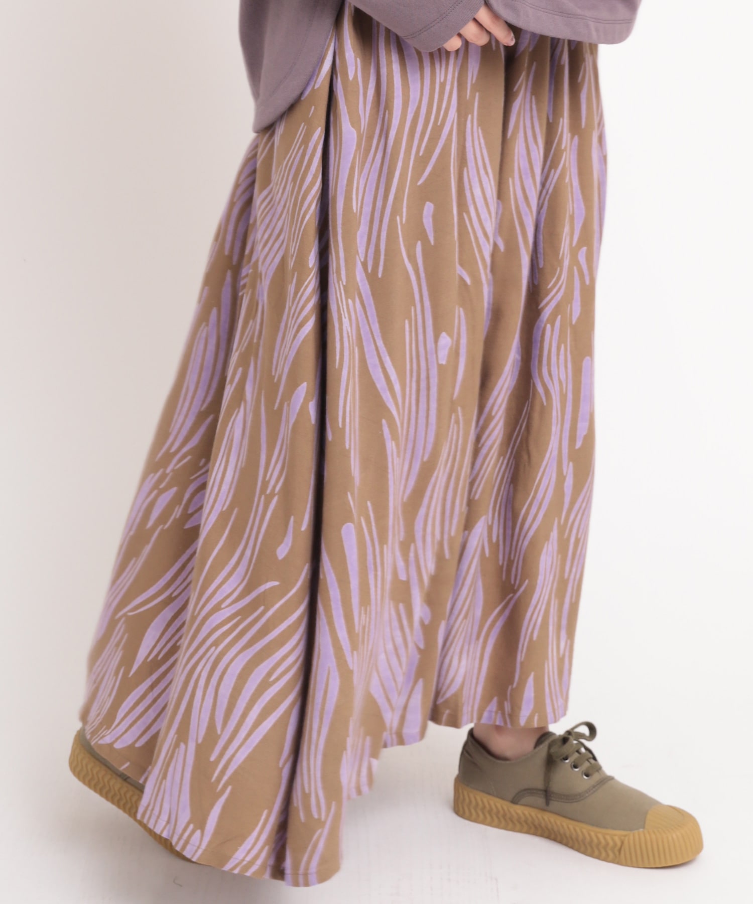 ギャザーたっぷりの裾はレーヨンの落ち感で、収まりよく、でもボリューミーに履いてもらえます。