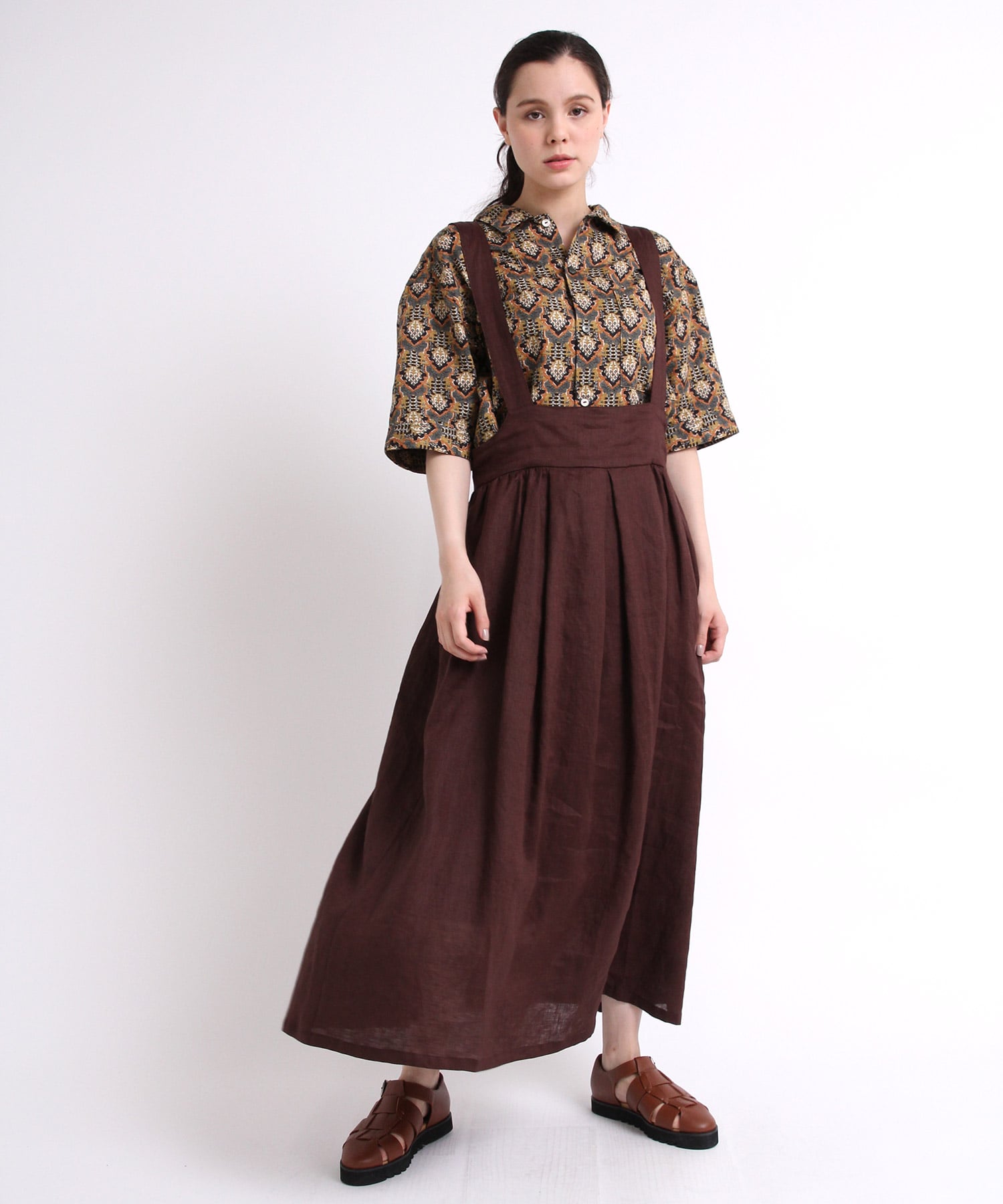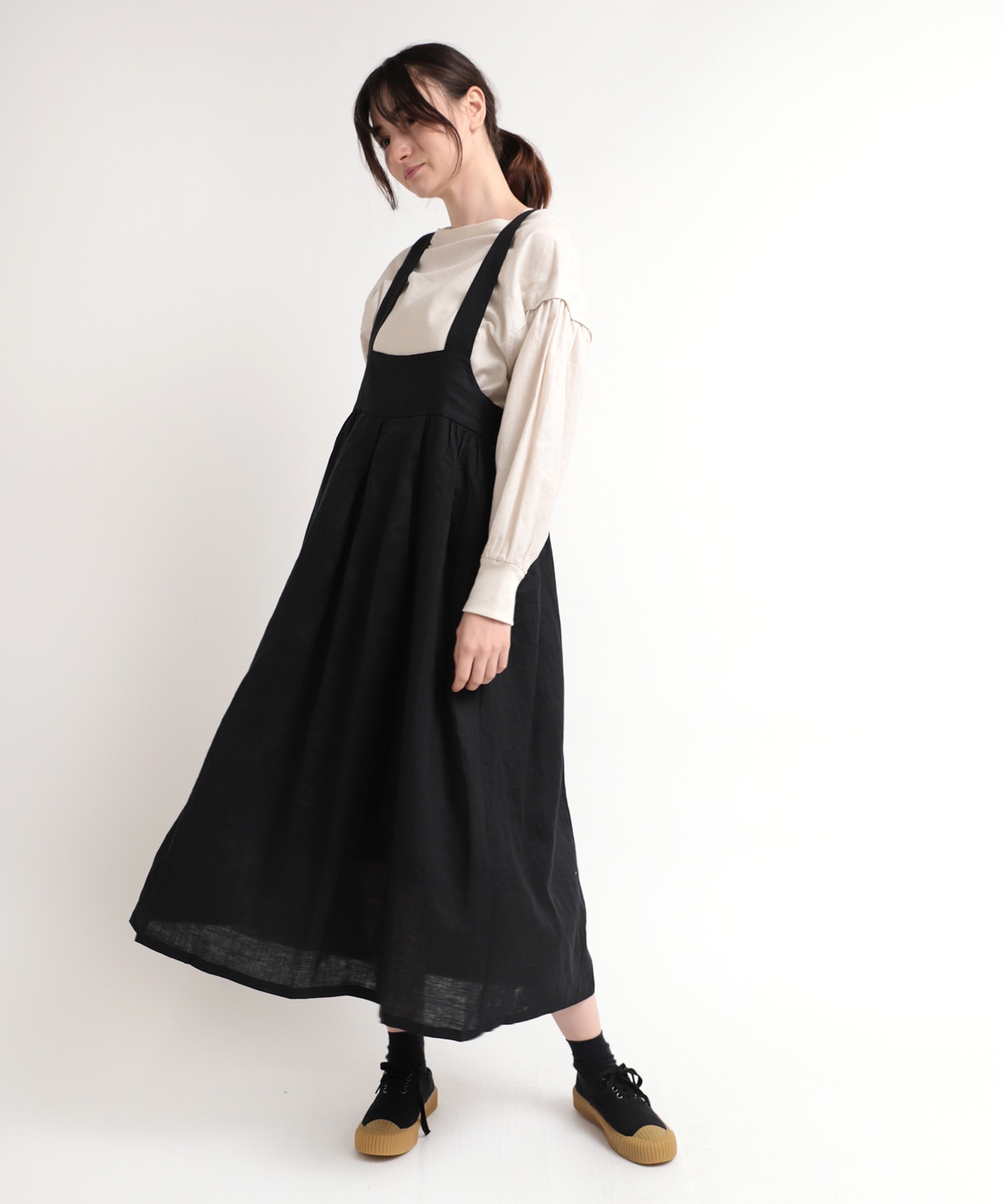 ナチュラルで少し光沢感があるリネンサスペンダータックギャザースカート