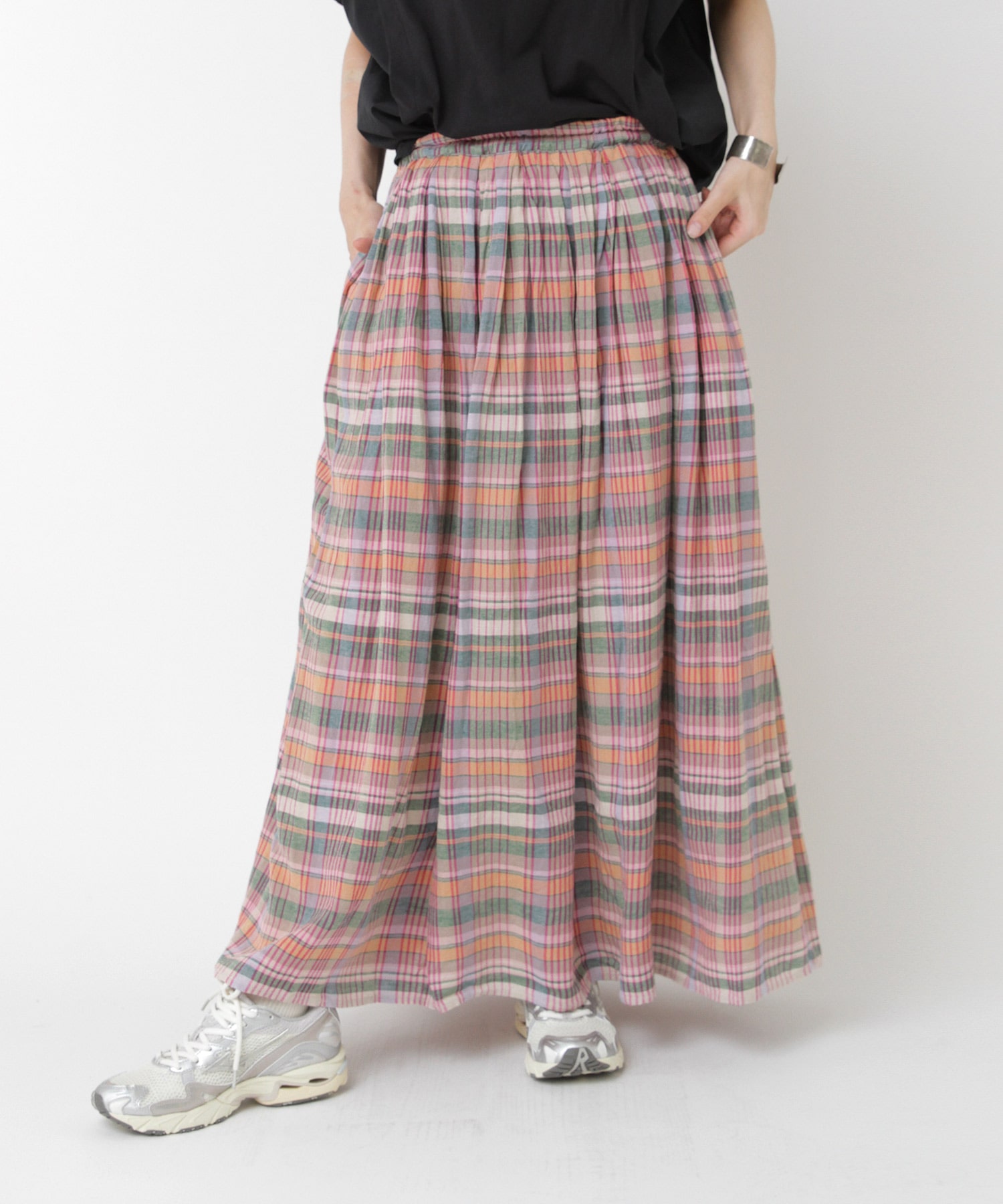 • > G1092 マドラスチェックタックギャザースカート