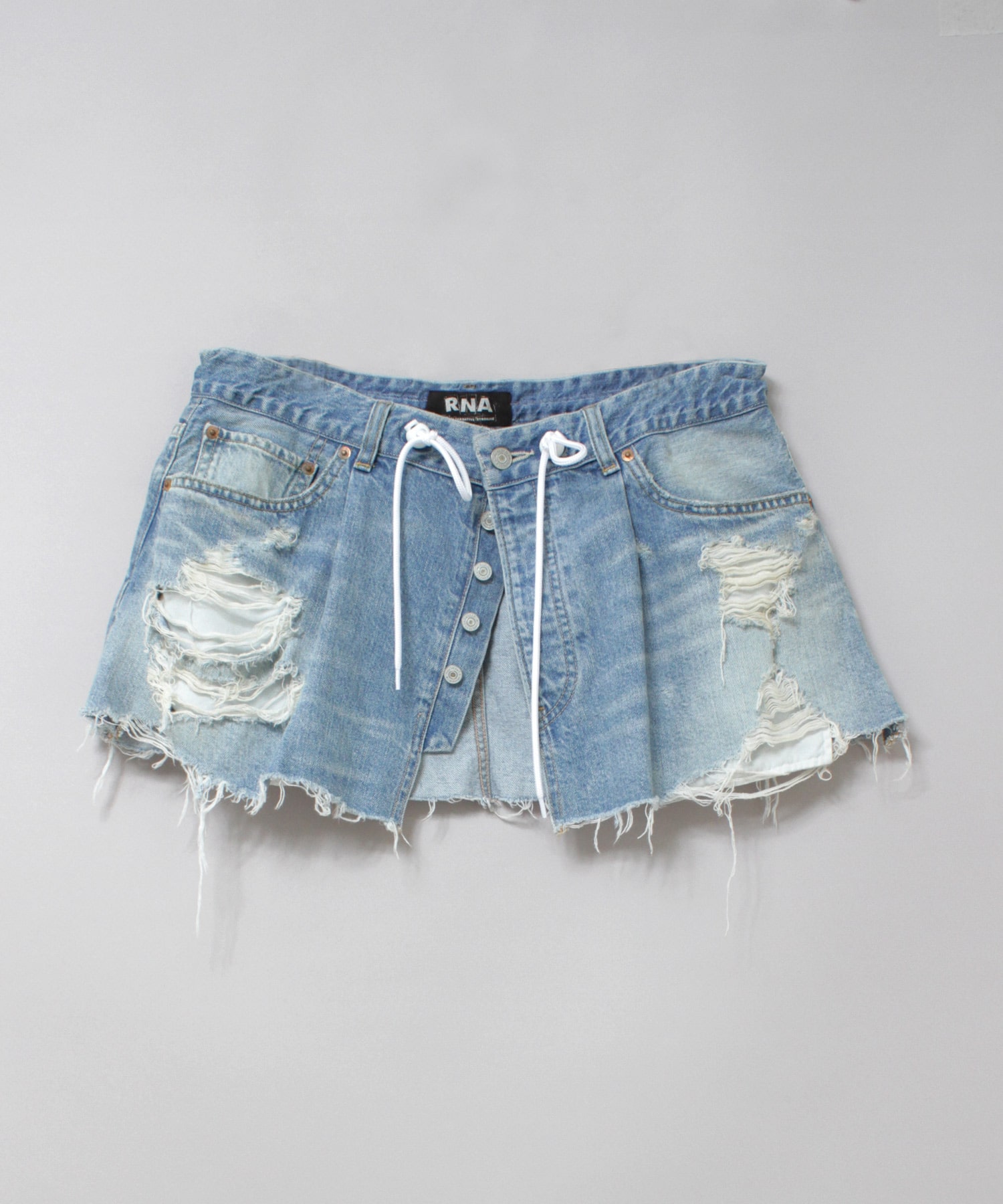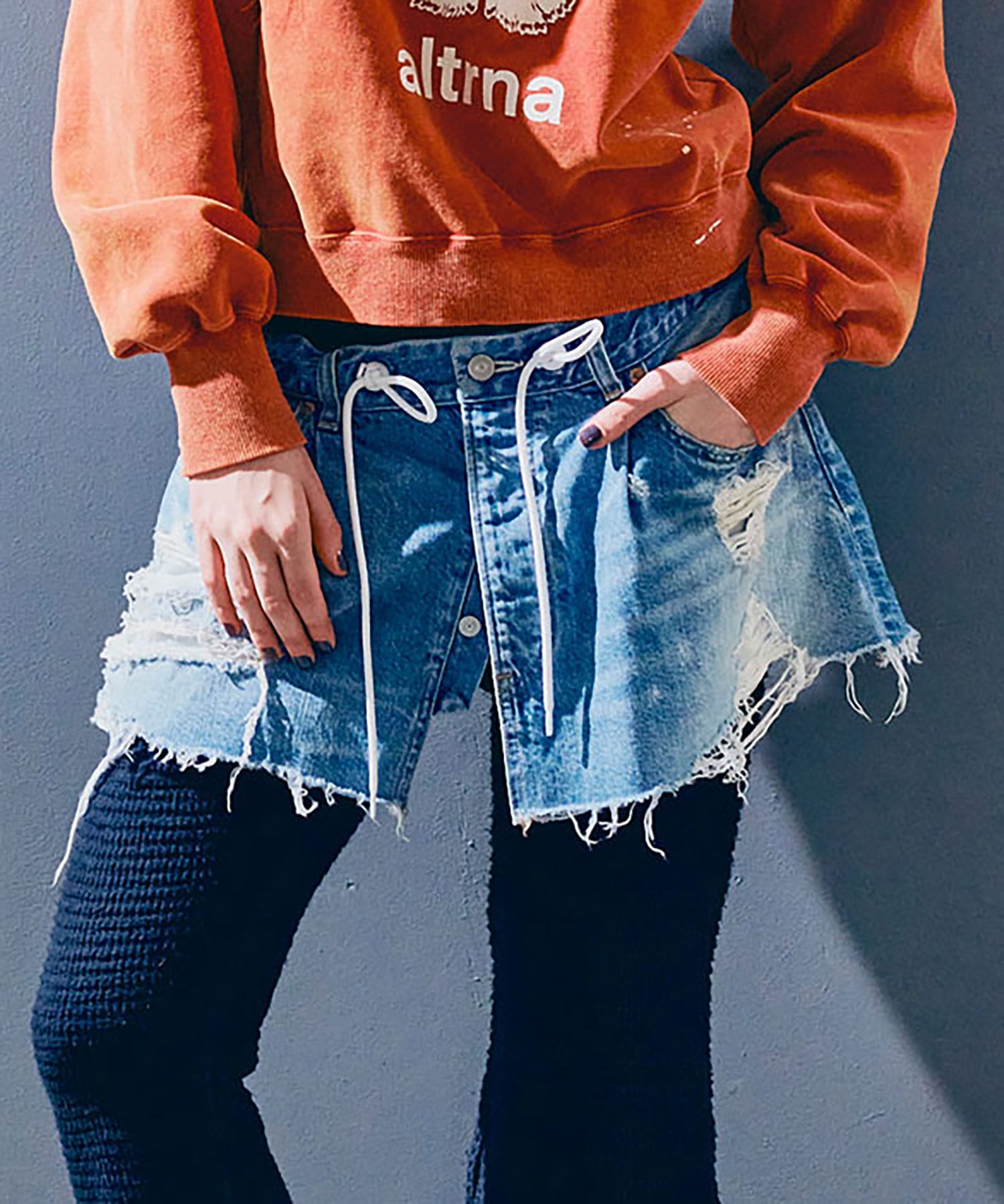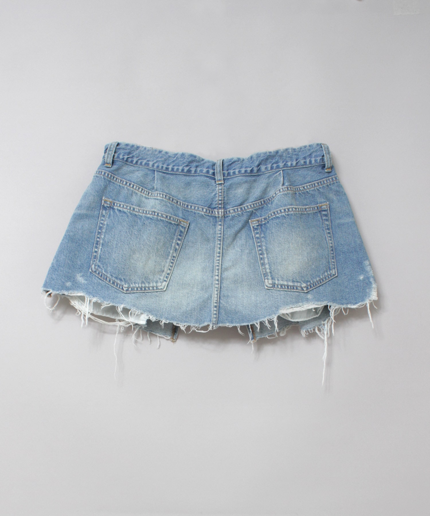 オーバーサイズのデニムパンツをカットオフしてリメイクしたような、遊び心あふれるマイクロミニ丈のラップスカート。