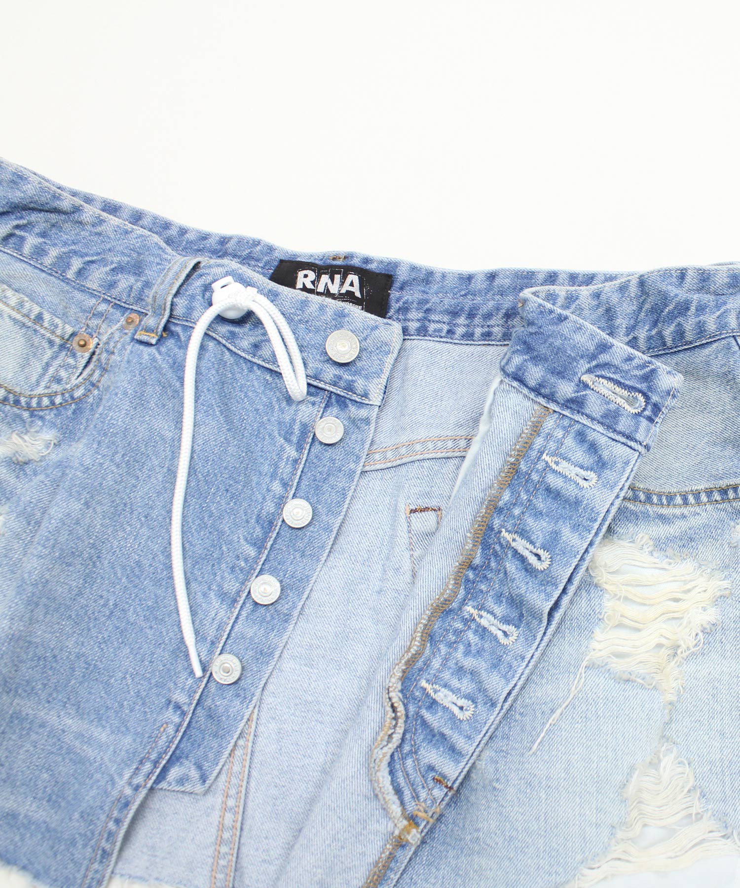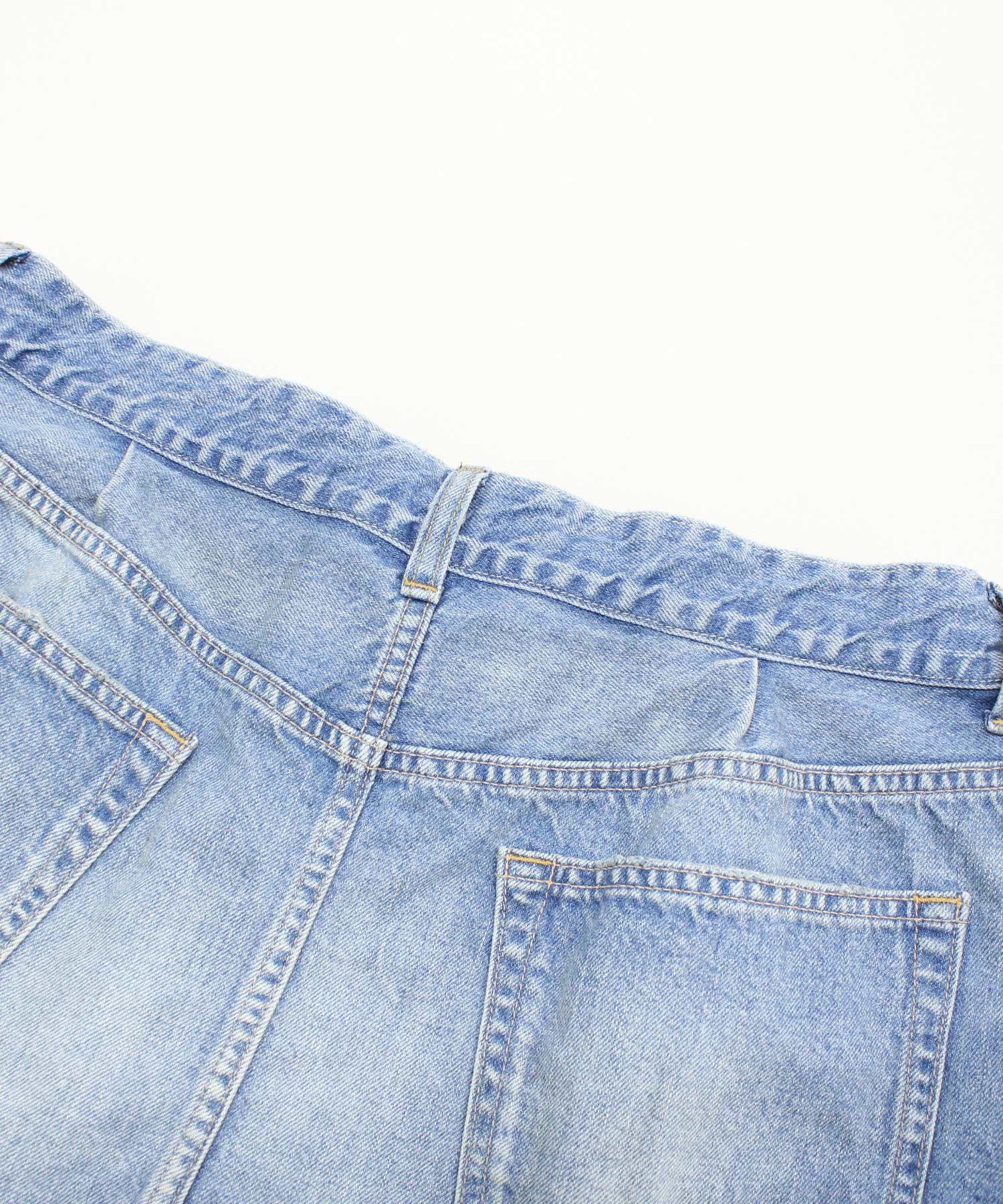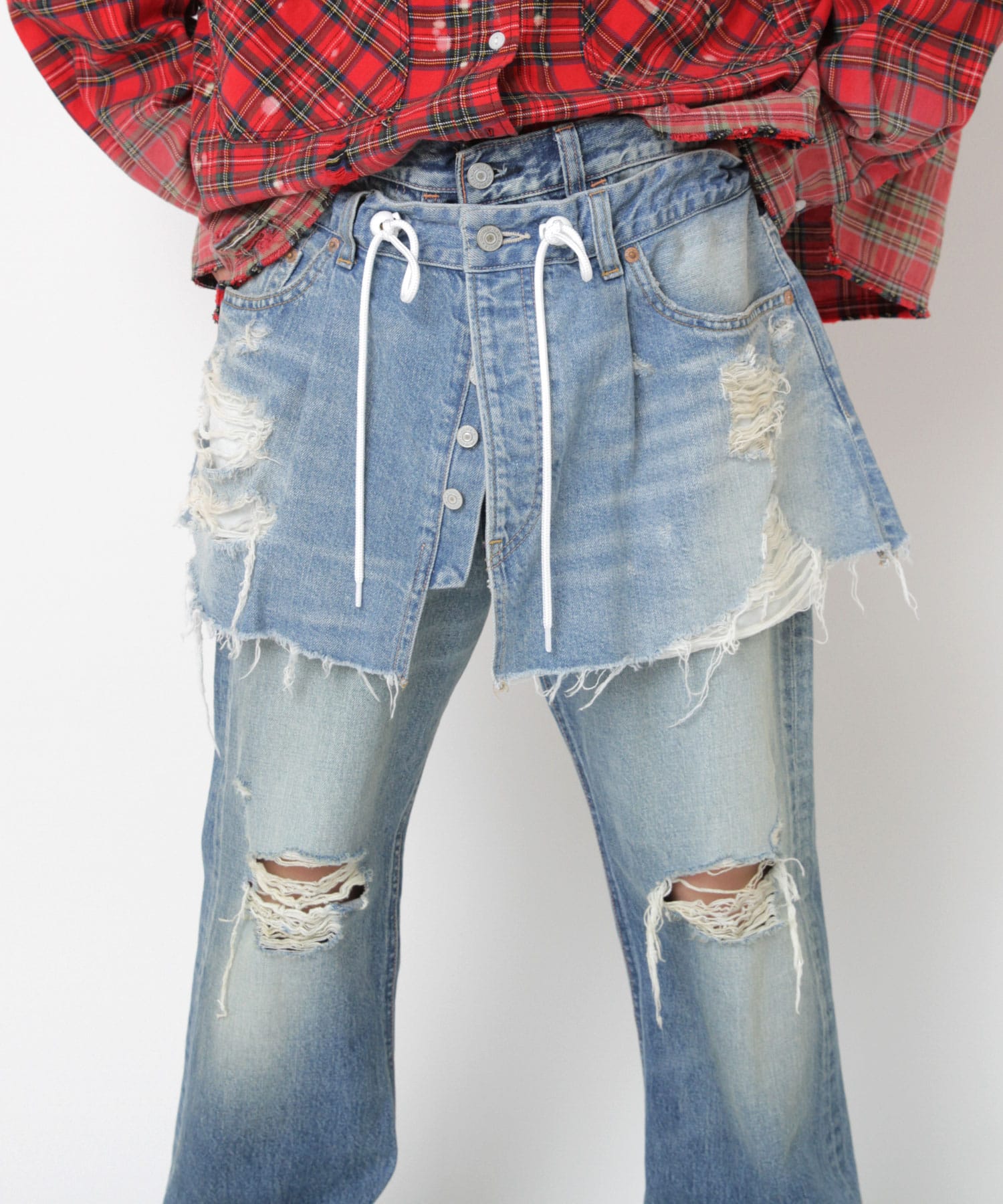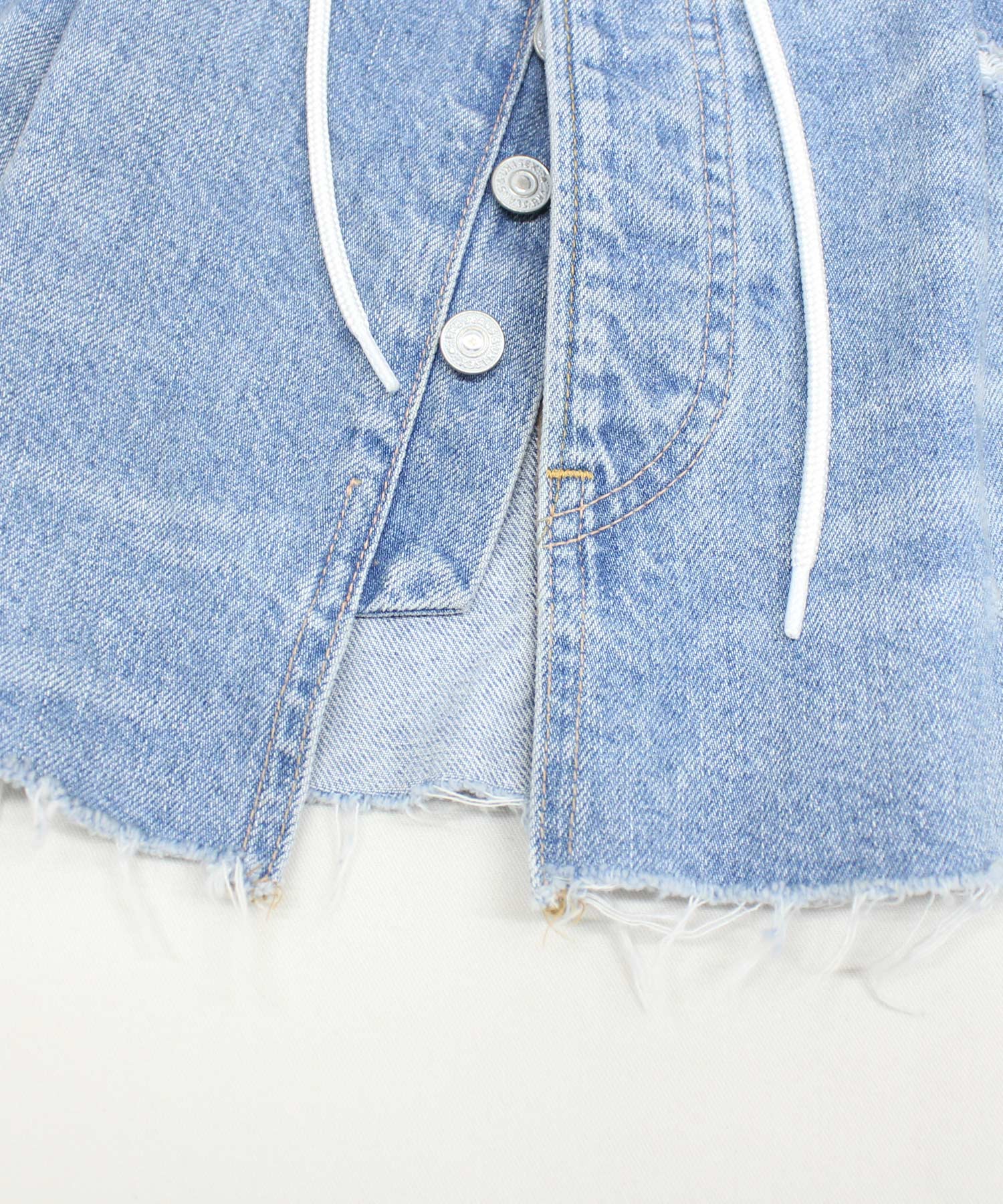 オーバーサイズのデニムパンツをカットオフしてリメイクしたような、遊び心あふれるマイクロミニ丈のラップスカート。