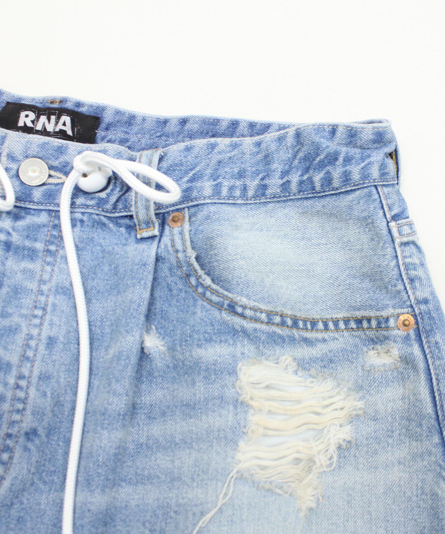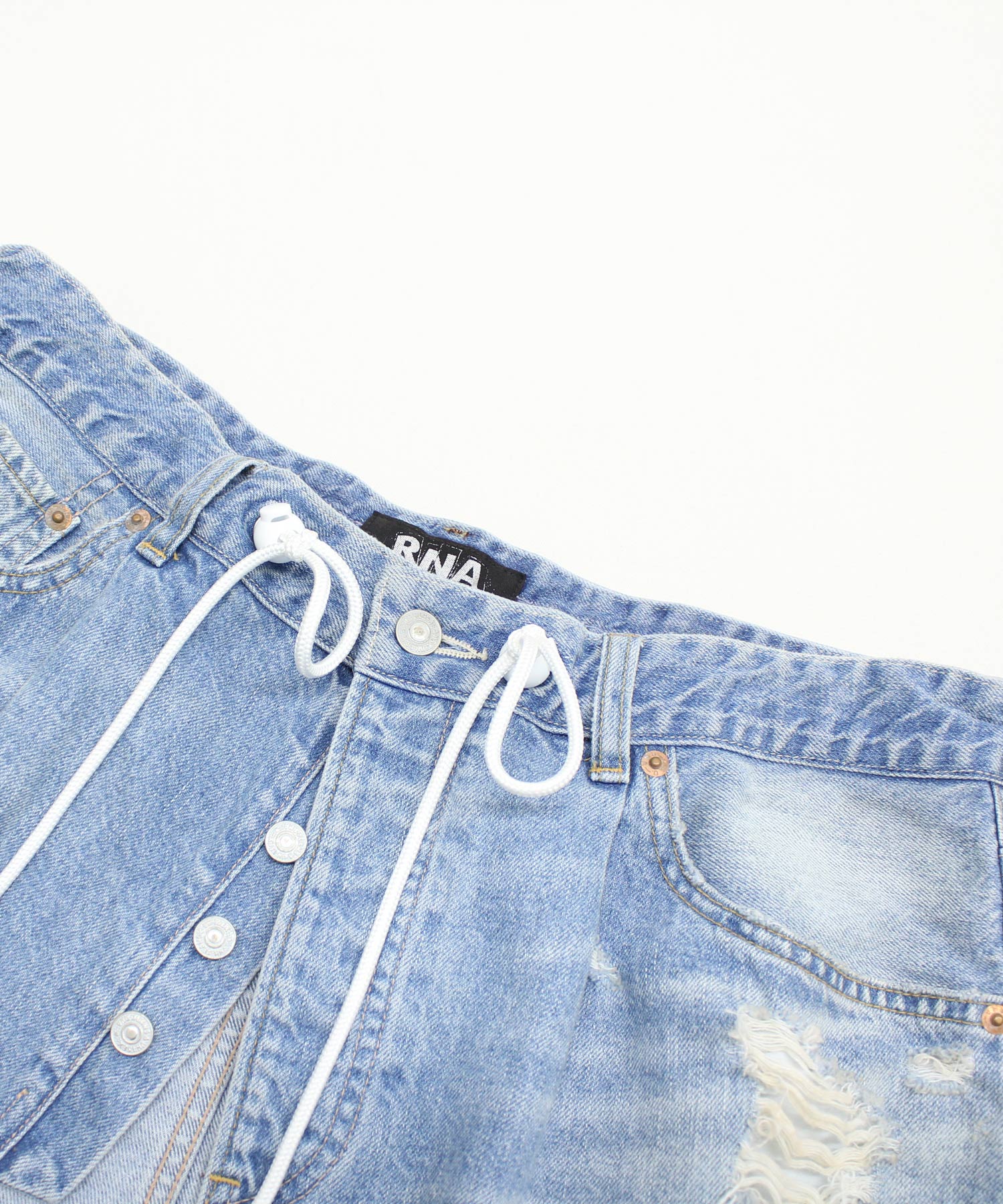 メンズサイズを思わせる大きめウエストに、ホワイトコードと丸いストッパーをアクセントとしてプラスしました。
