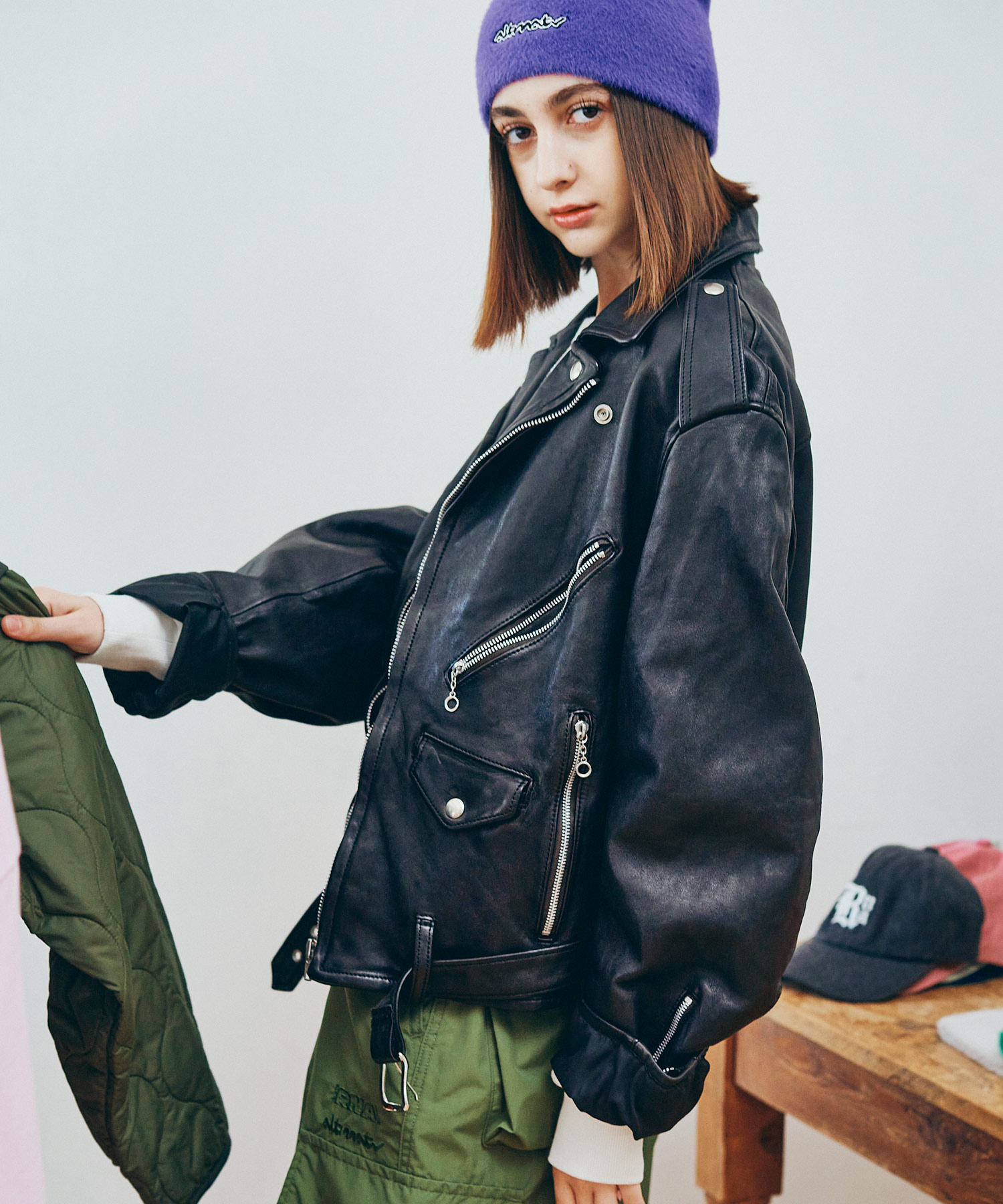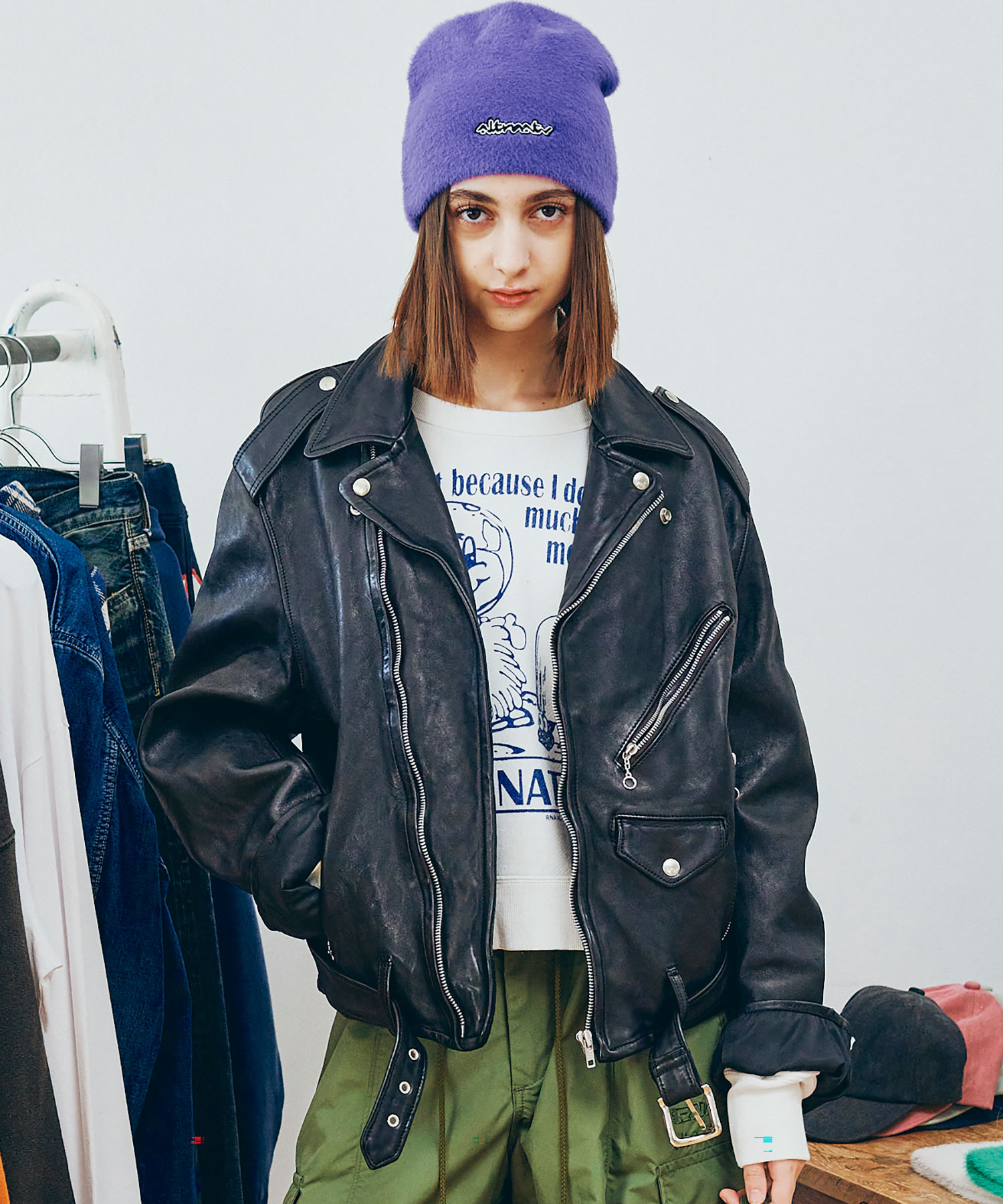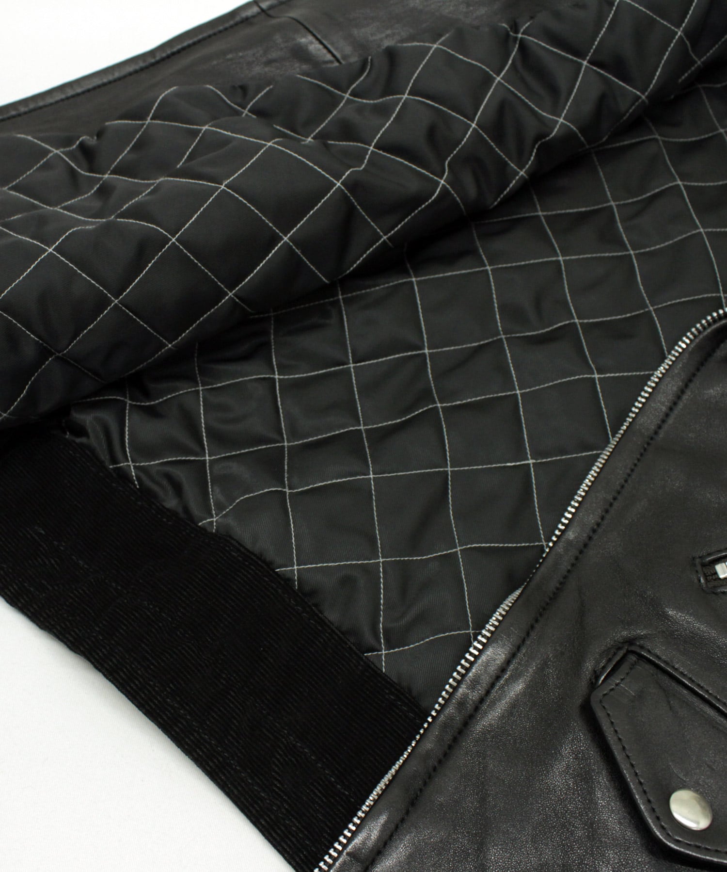 表素材はライダースらしいシルエットが出る様にやや厚みのある羊革を使用しています。