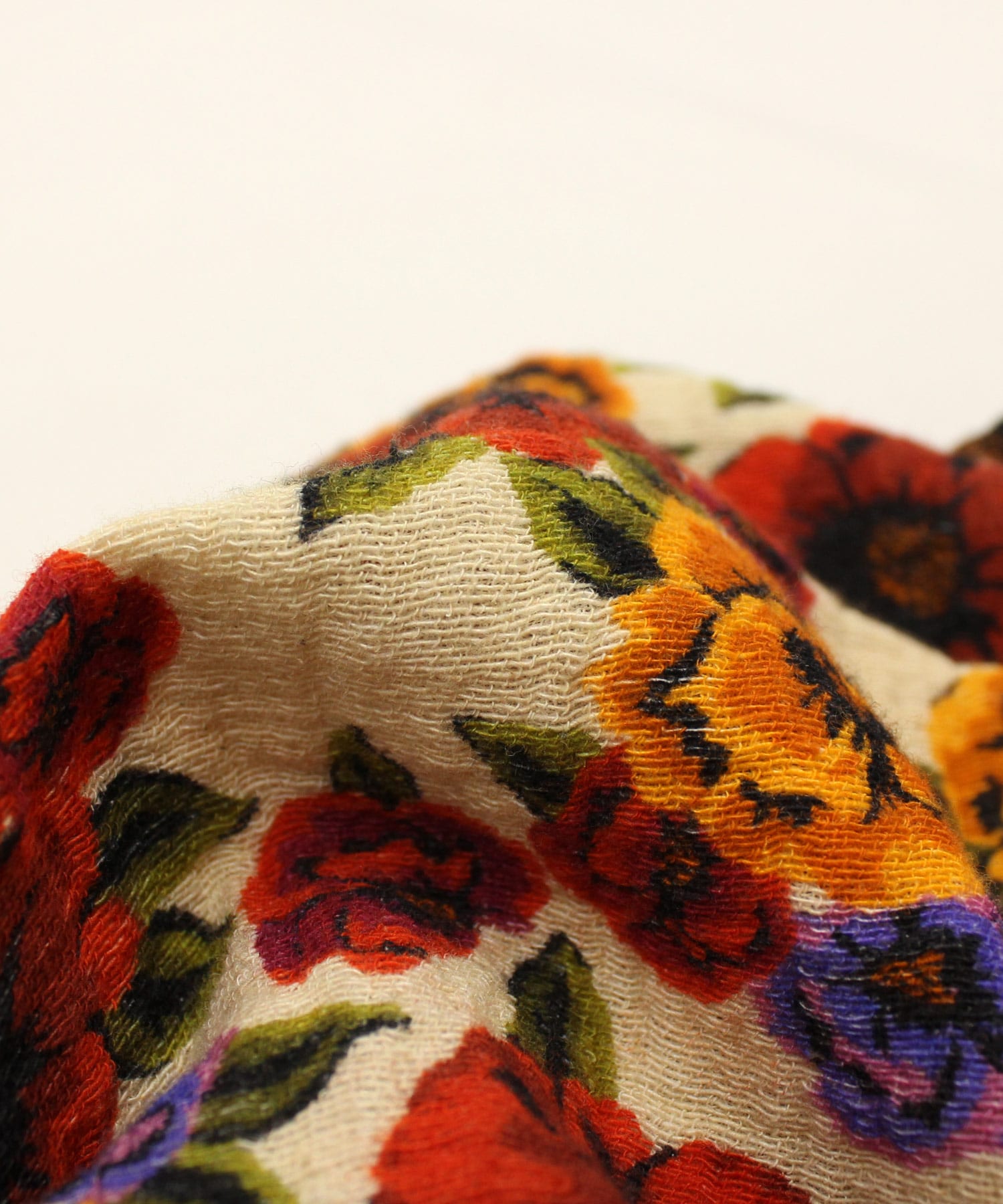 ゴブラン織り(横糸だけで絵柄を表現する技法)のような少し重厚感のある柄を軽いガーゼ素材にプリントすることで、もやっとした色が生地にしみ込んだように仕上がりました。