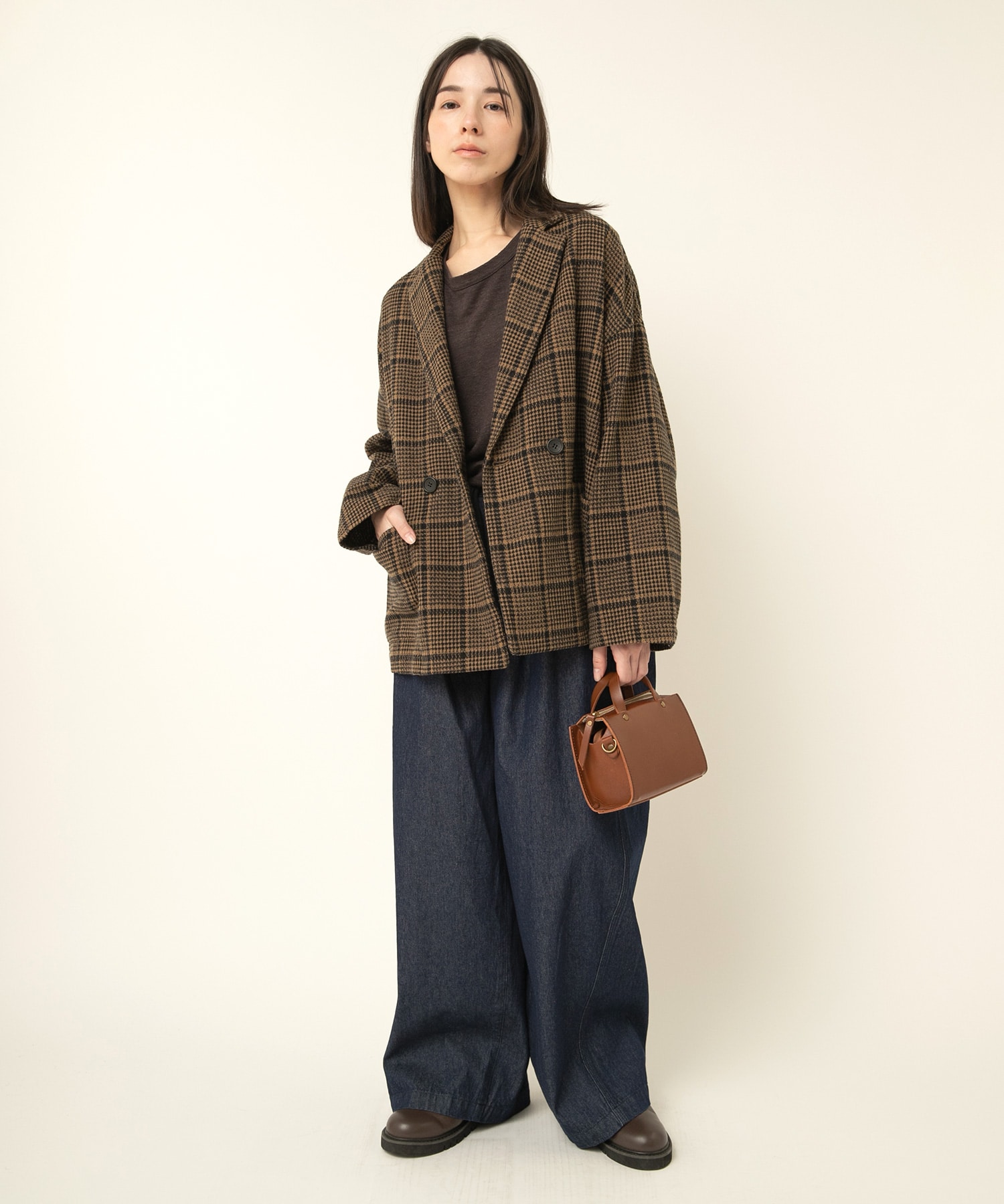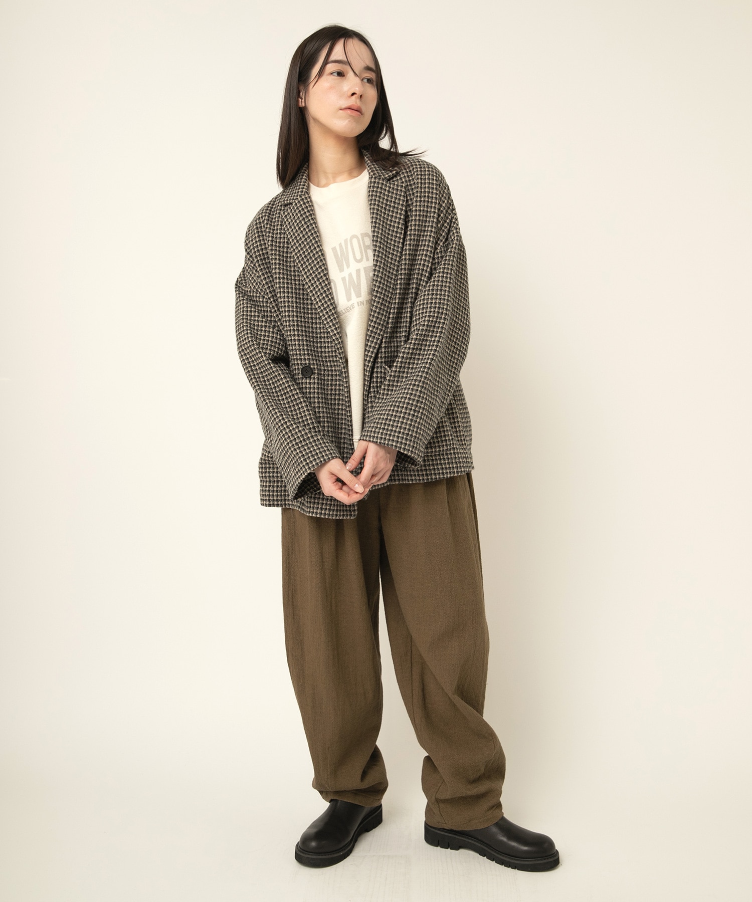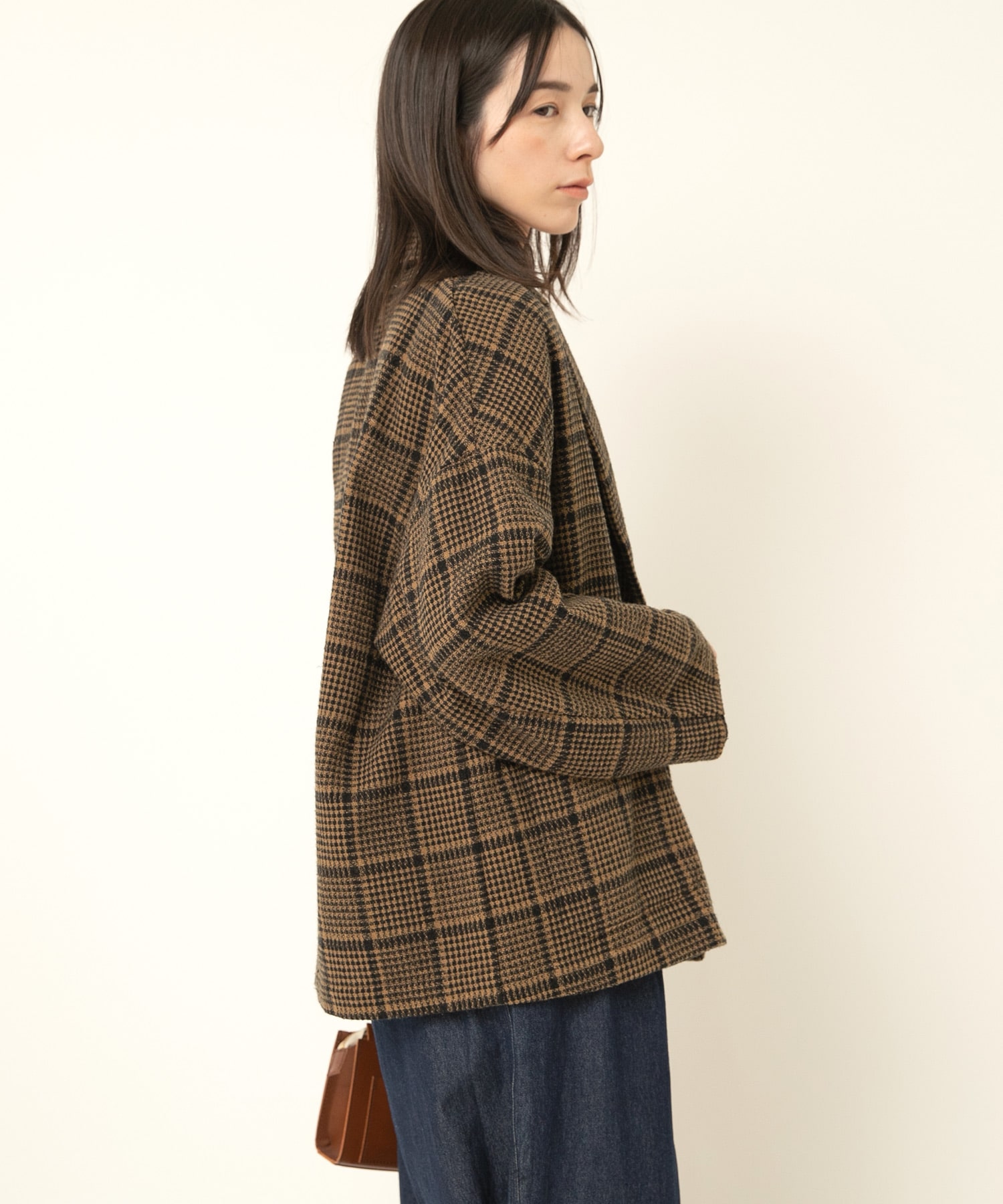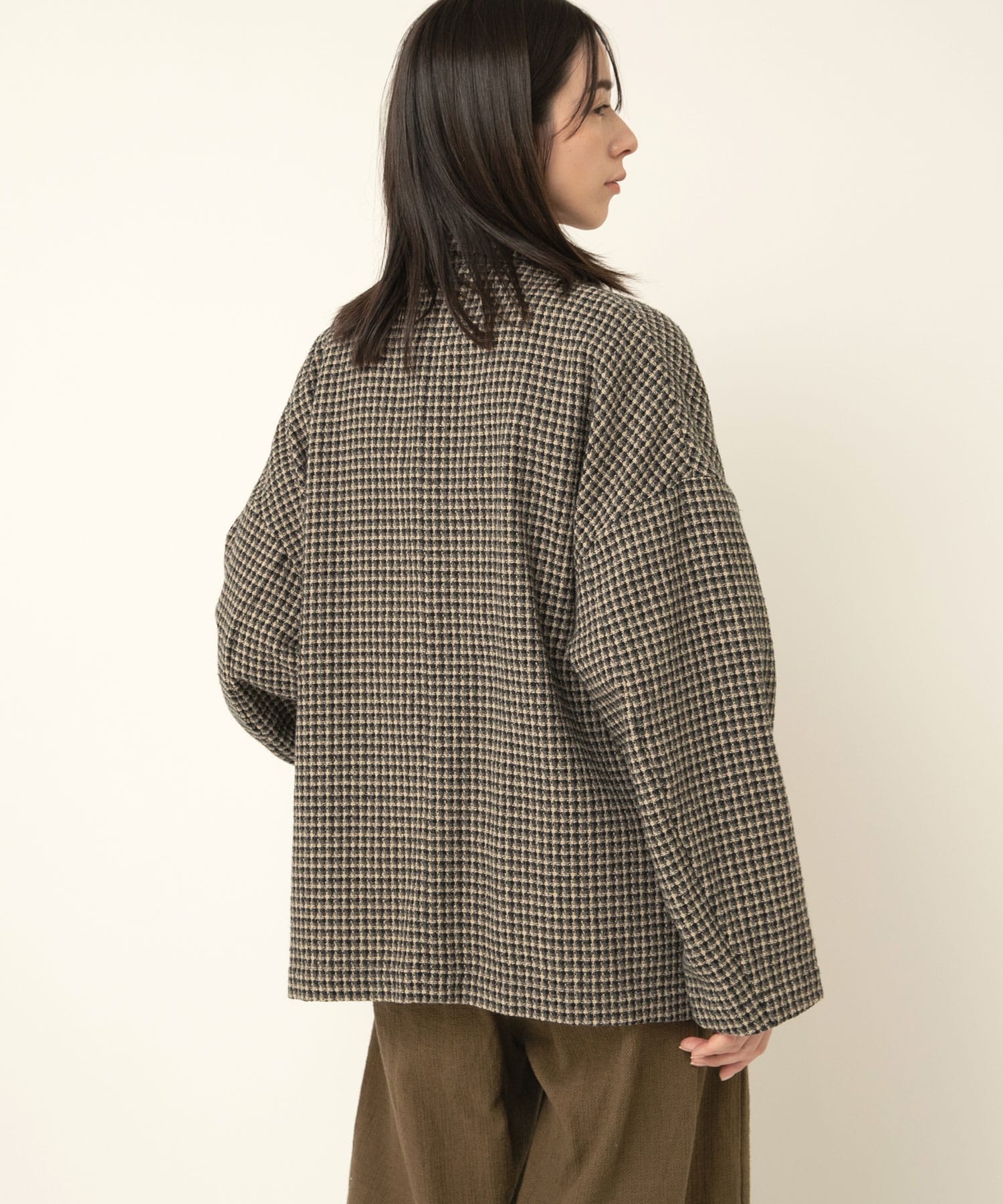 伝統的なチェック柄は上品な雰囲気があり、同素材のツイードチェックトラウザー(R4370)とセットアップで着ていただくのもおすすめ。