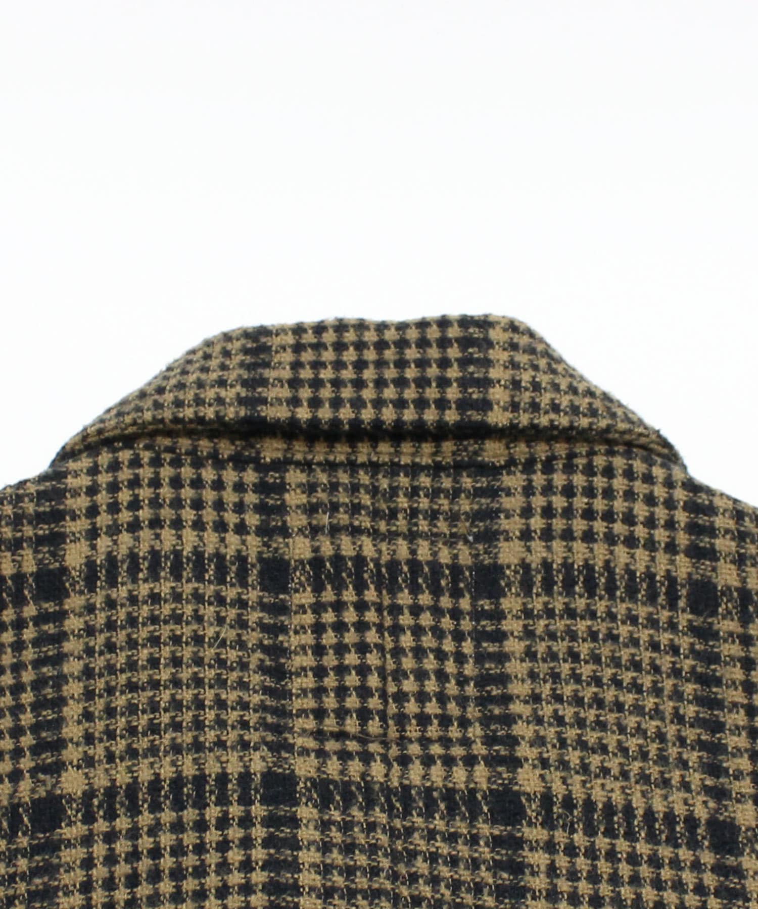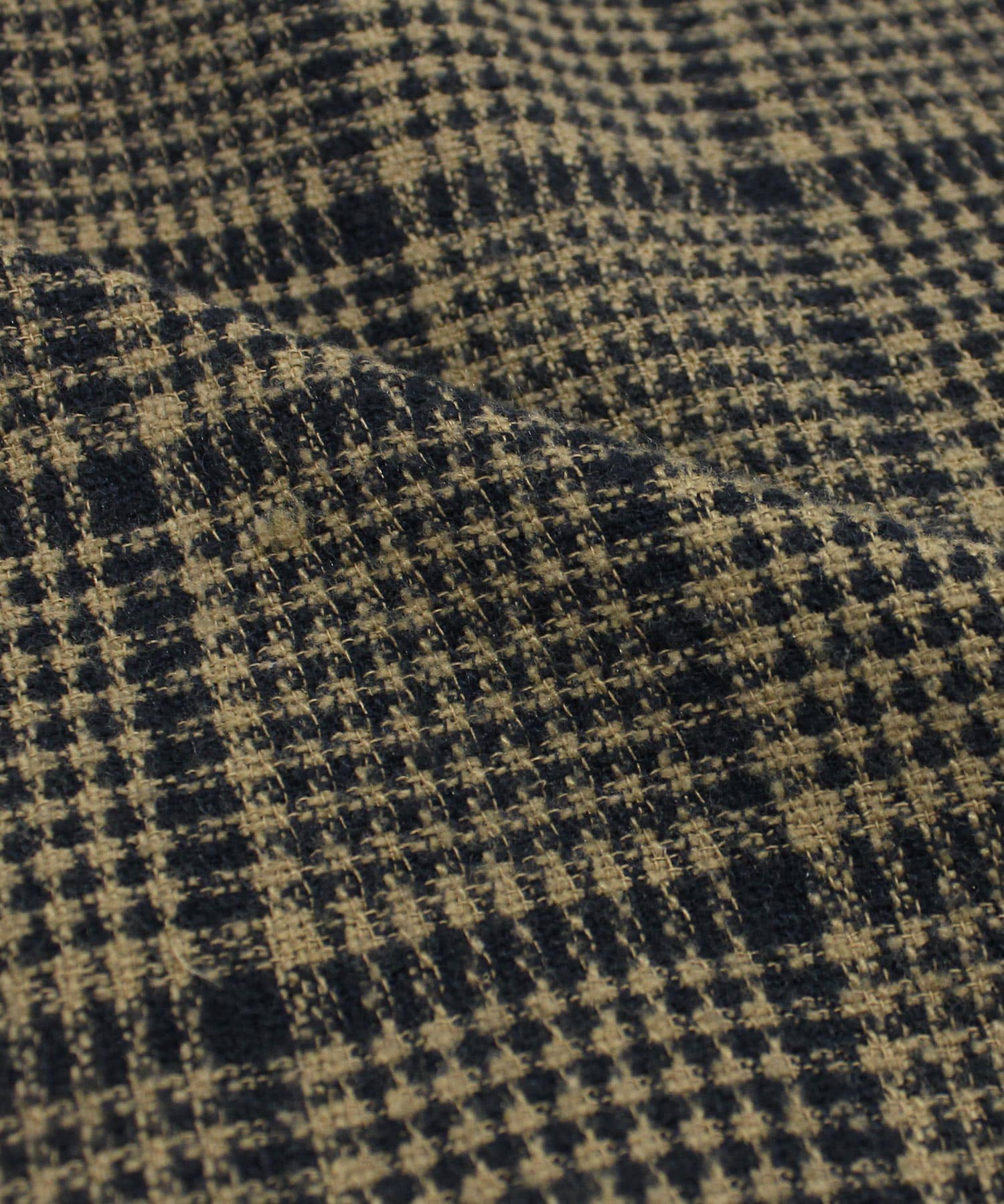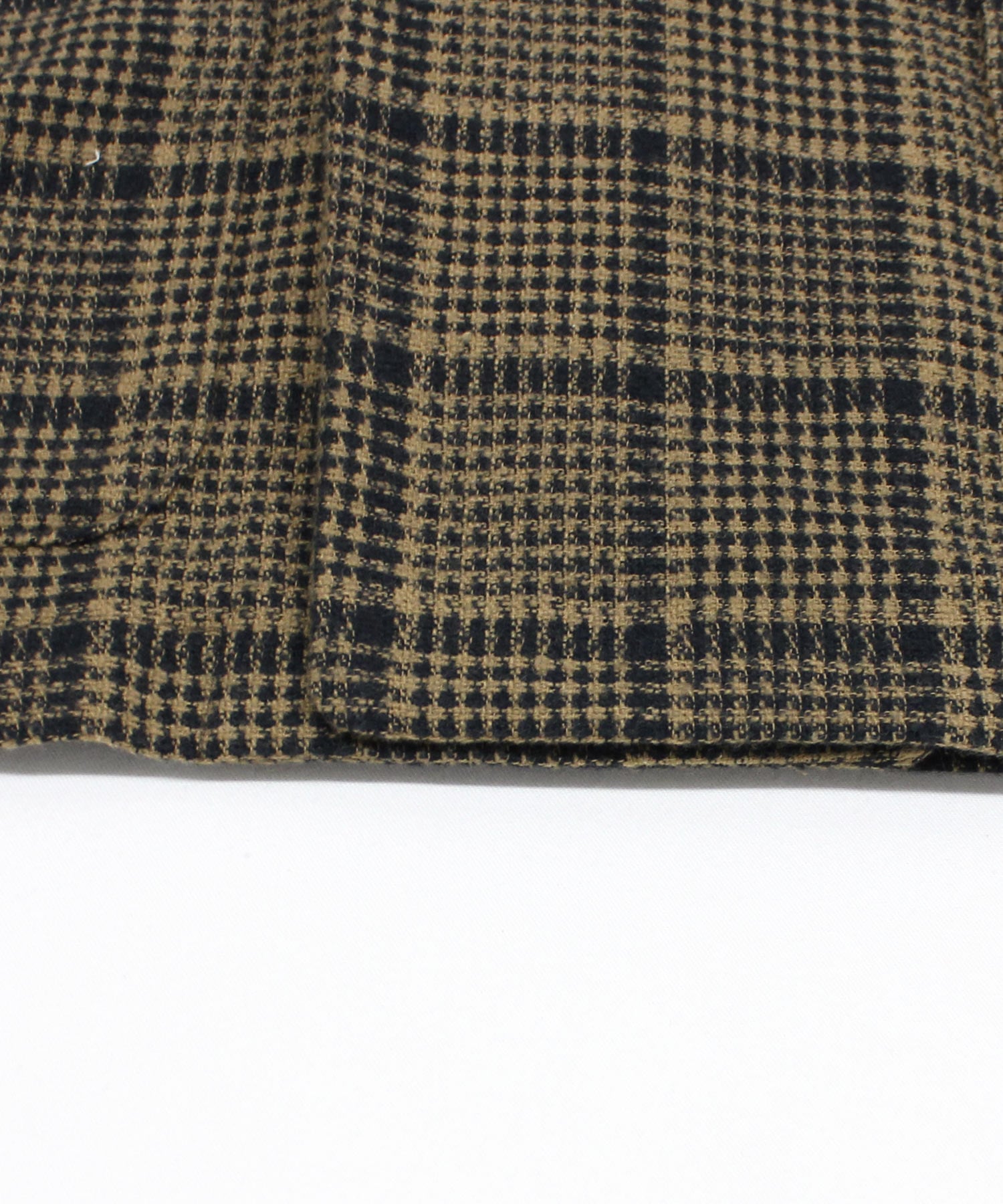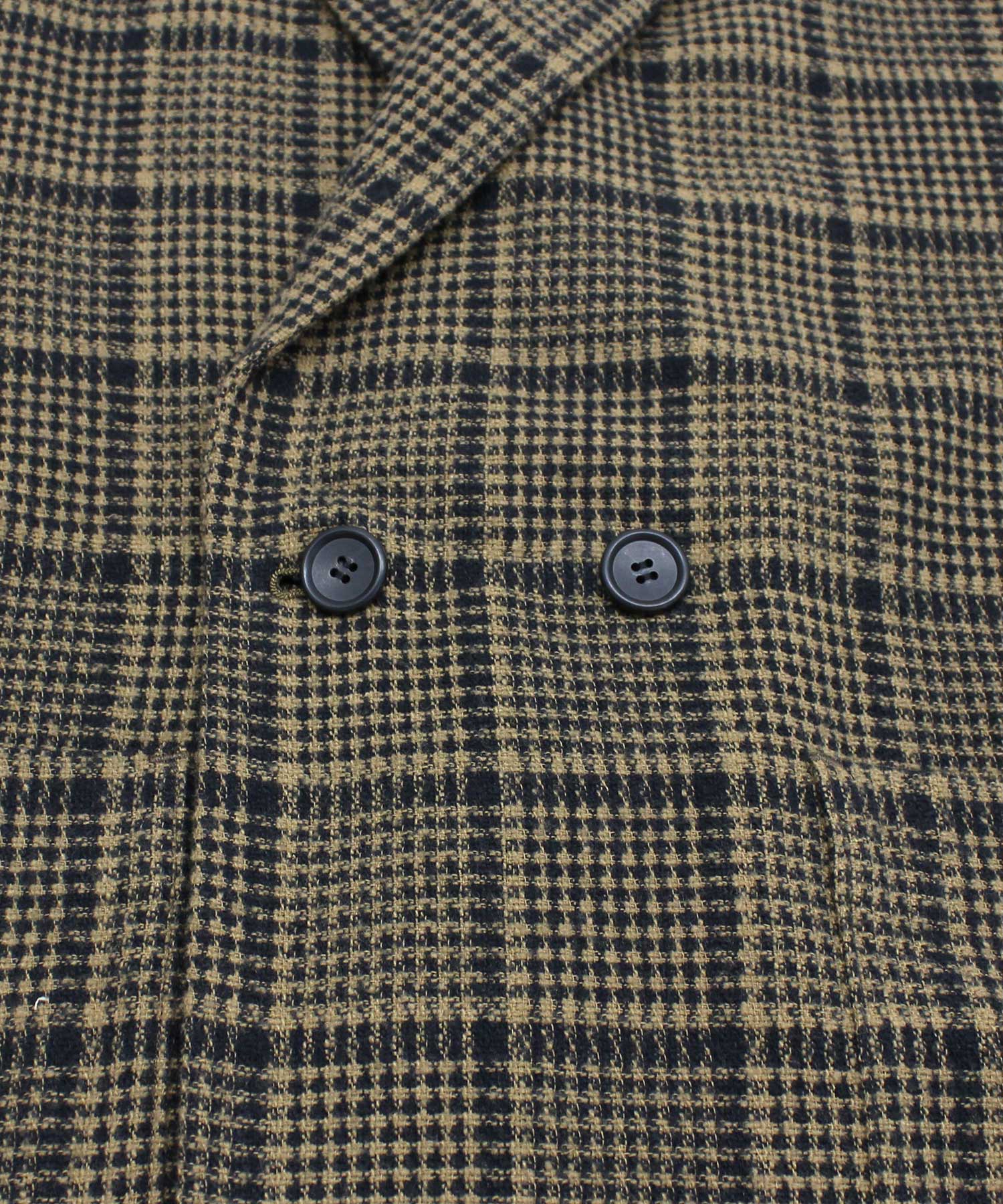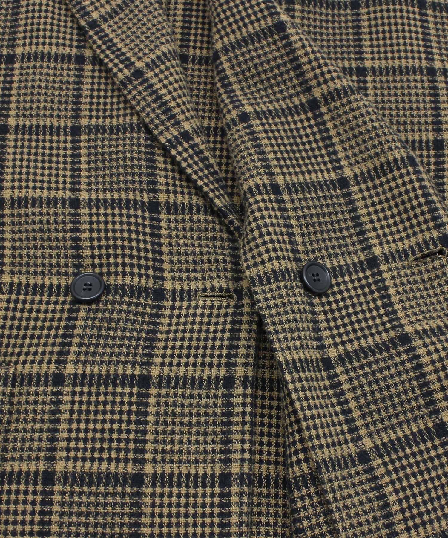 綿100%の糸と表情のある綿ポリエステルの特殊紡績糸の混紡糸を使うことにより、ツイード調の素材感を出したチェック生地のジャケットです。