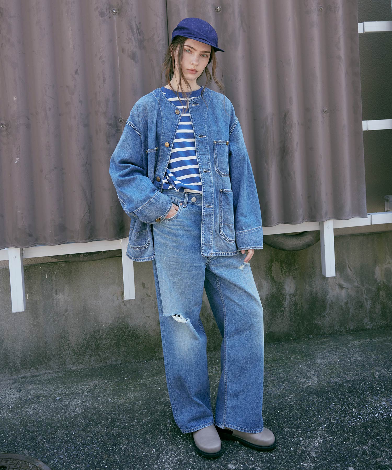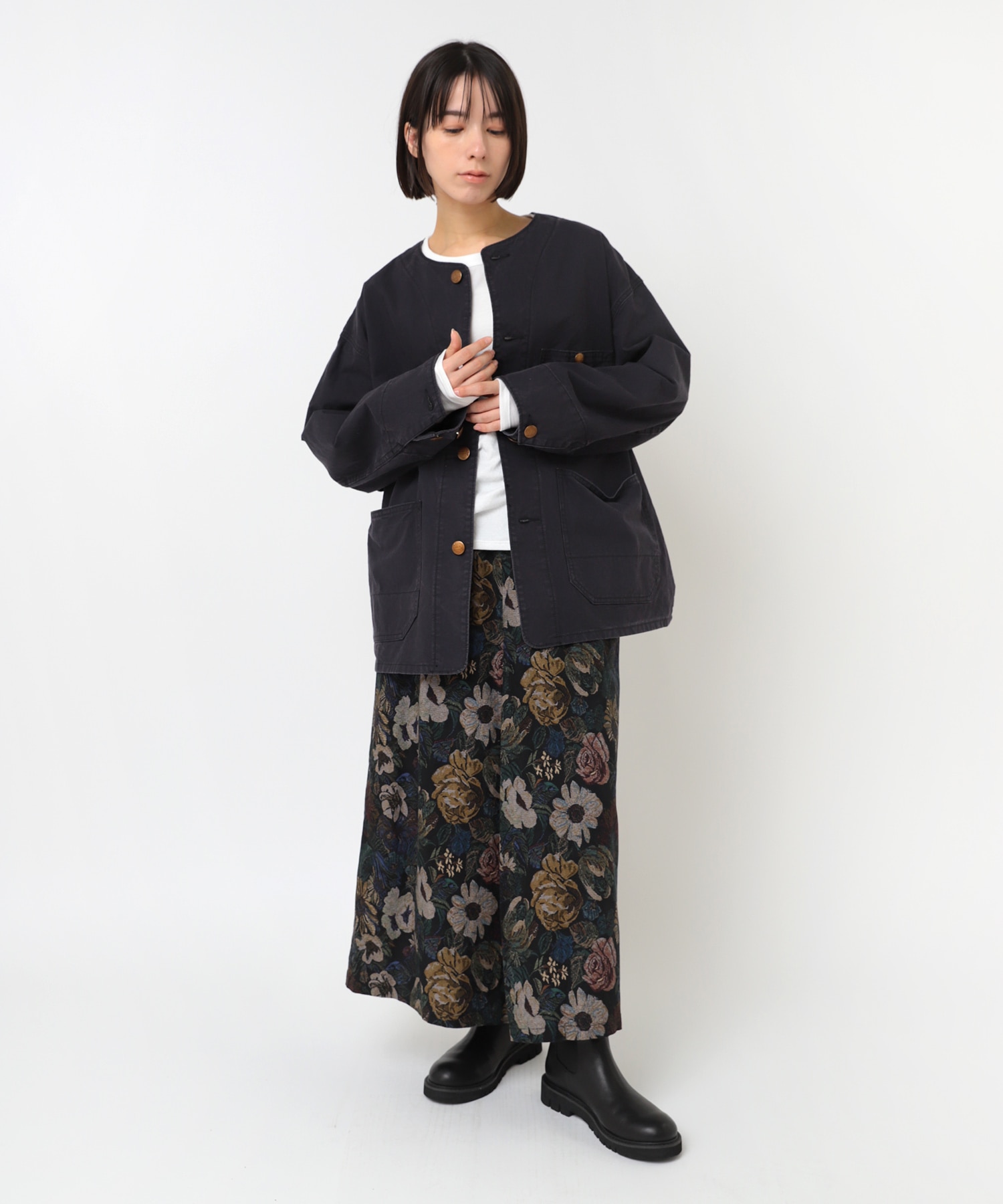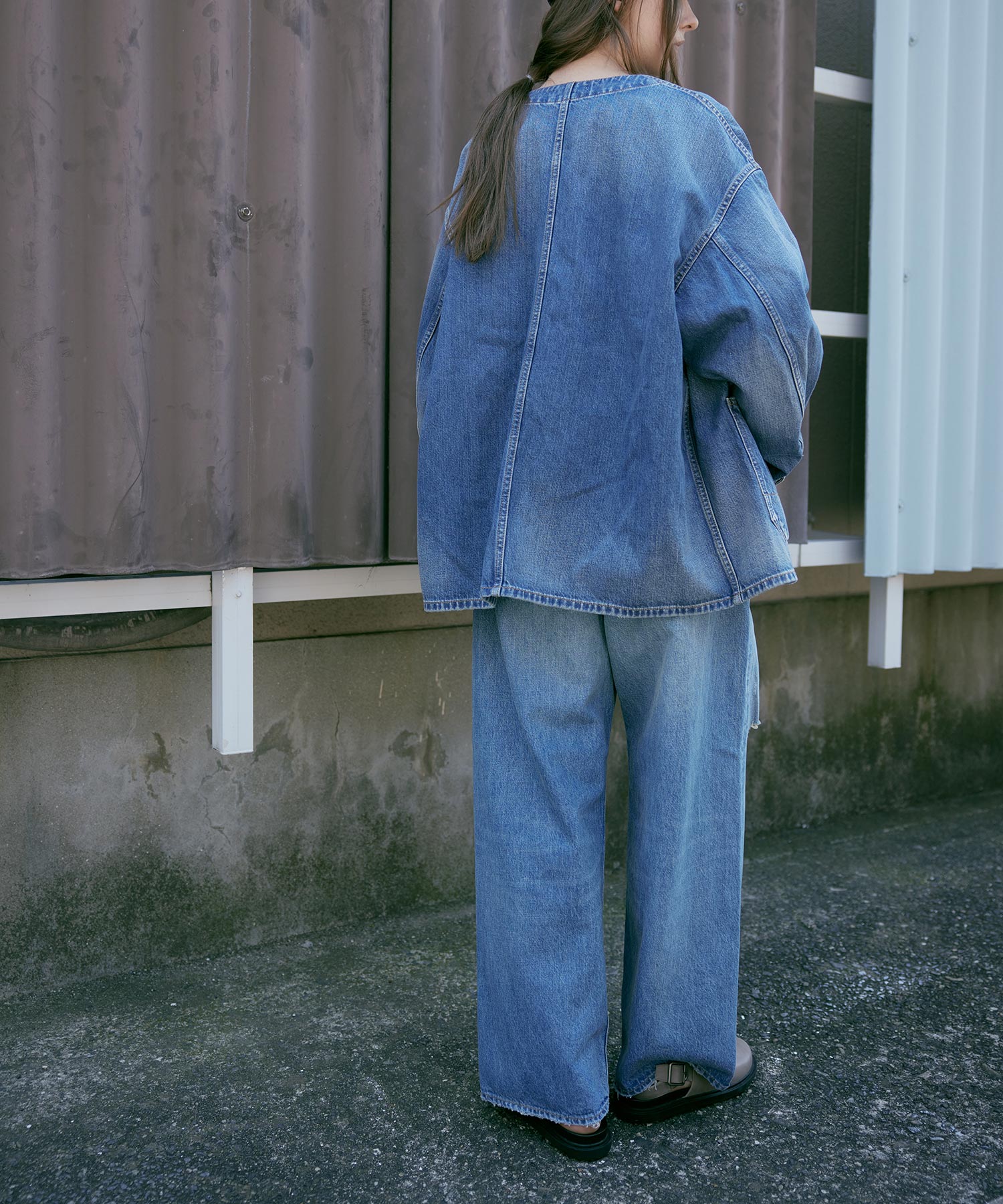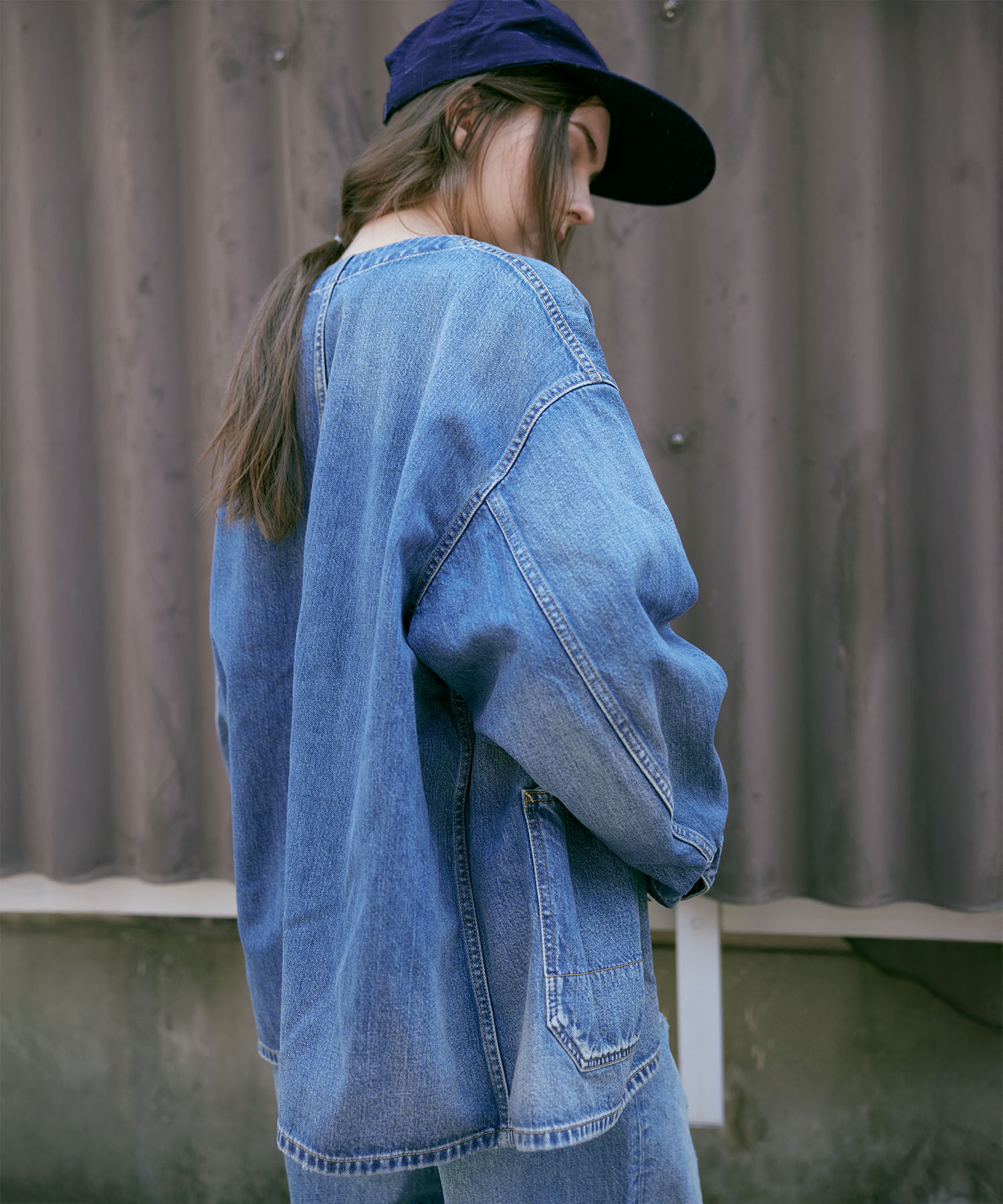 ノーカラーなので襟元の印象も軽く、衿付きのカバーオールが堅い印象で苦手な方にも来てもらいやすいデザイン。