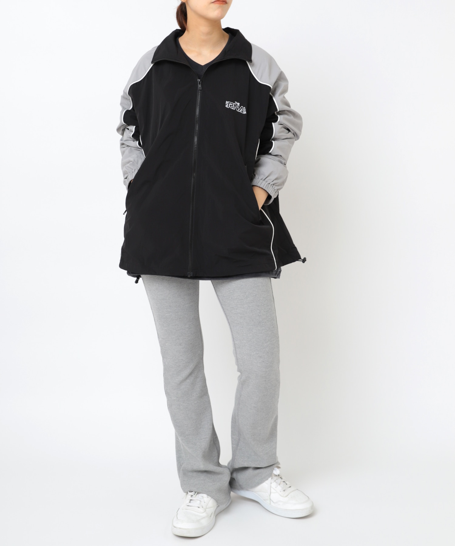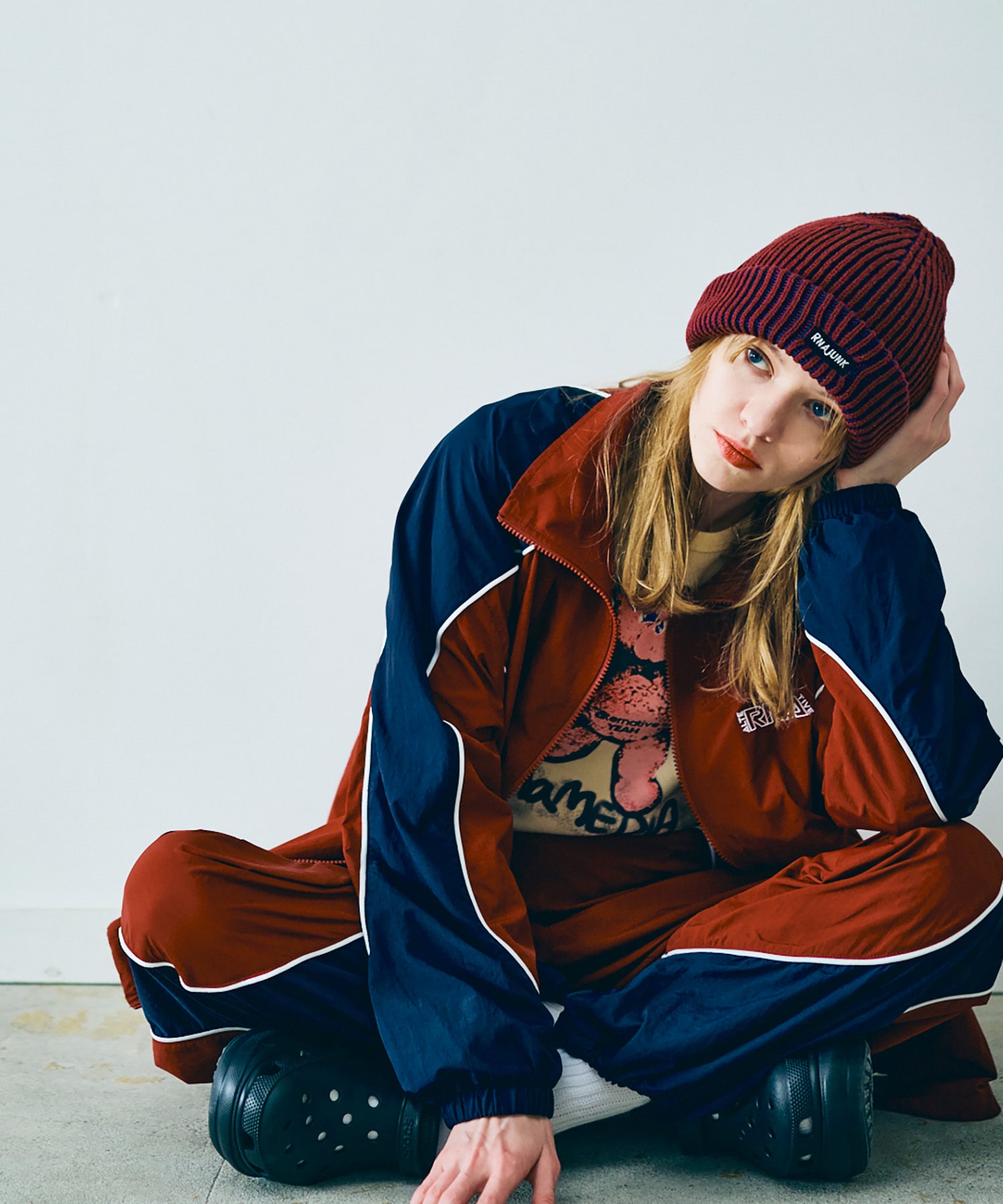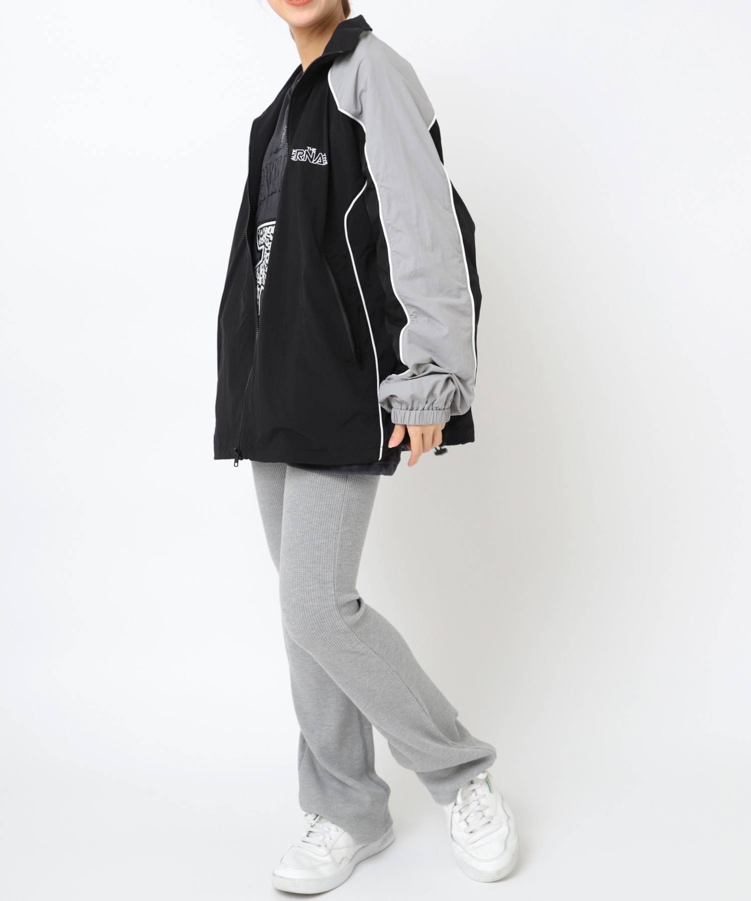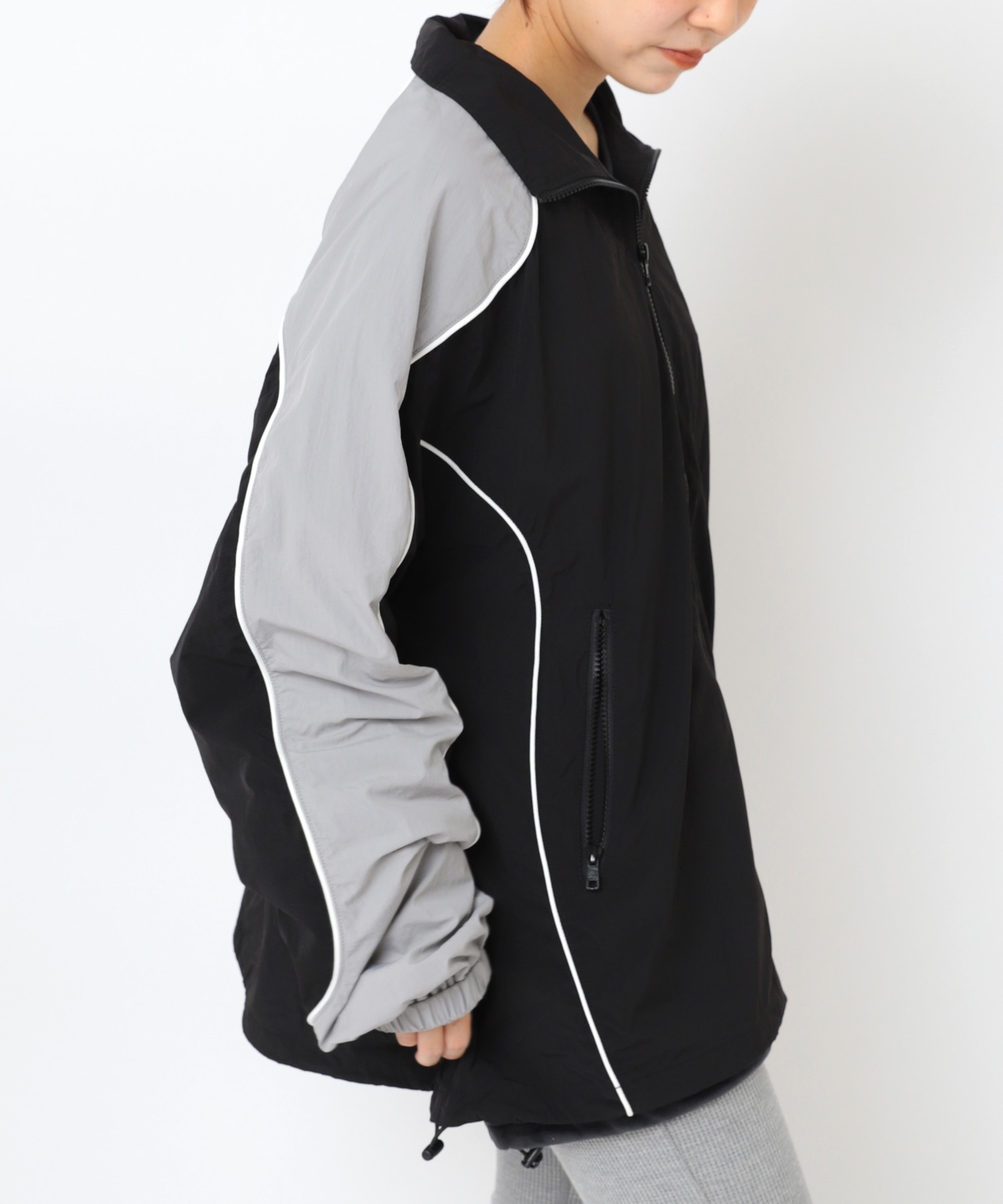 肩から袖口を配色にし、フロントの身頃の脇にはパイピングコードだけでアクセントを入れました。