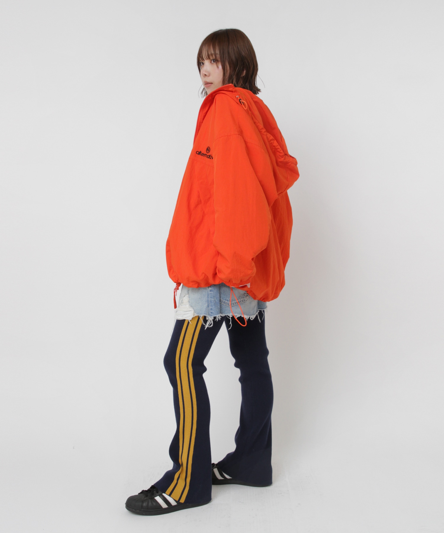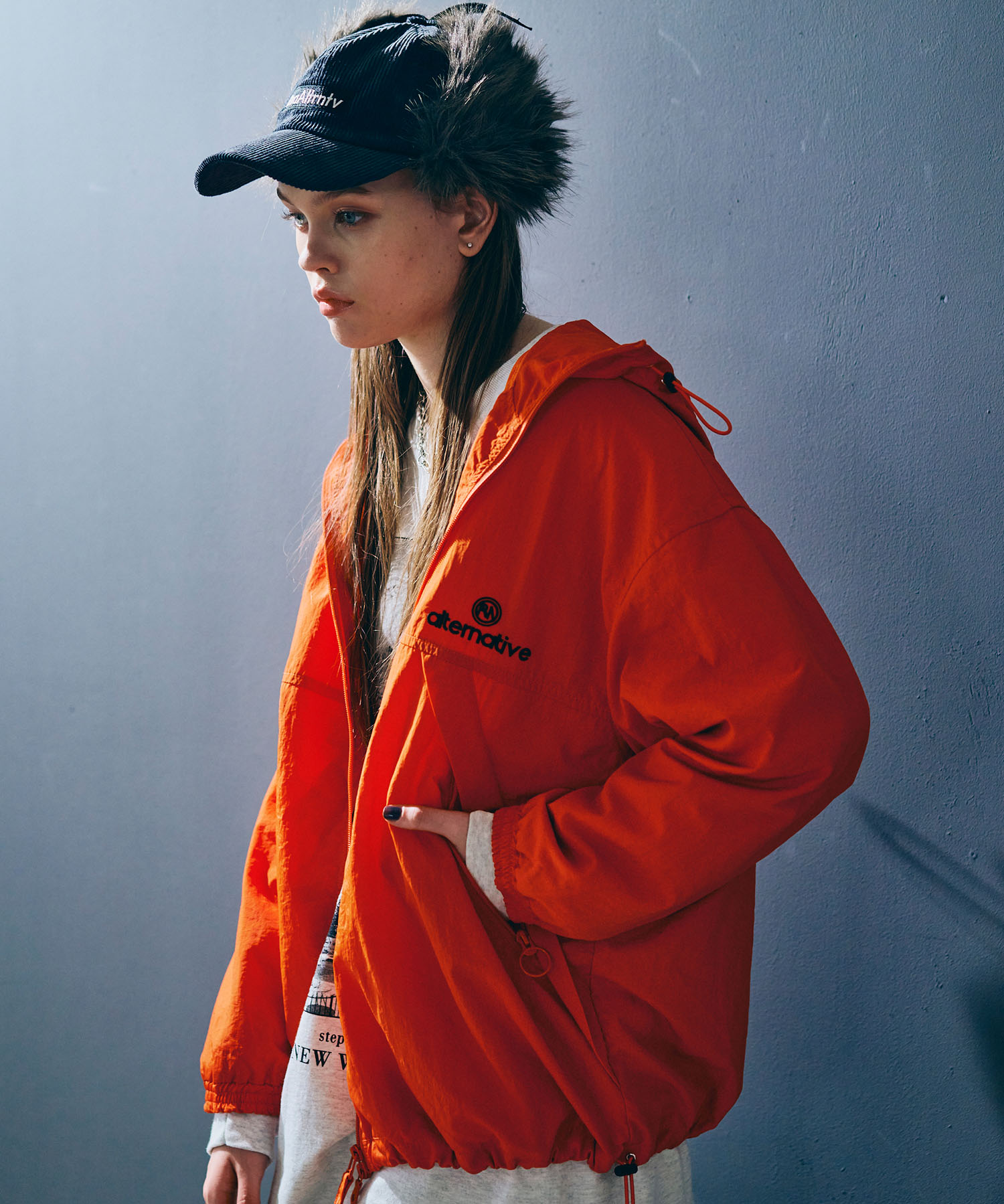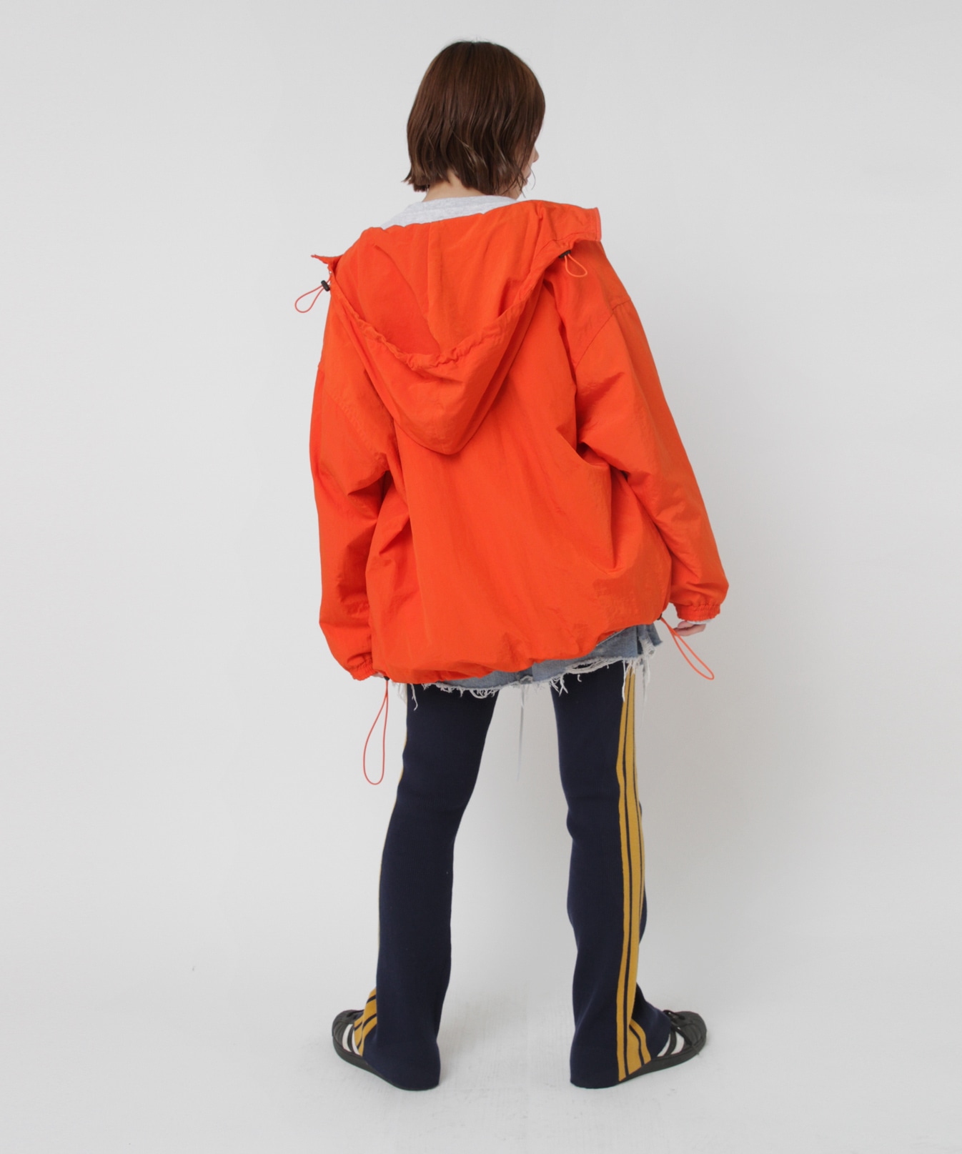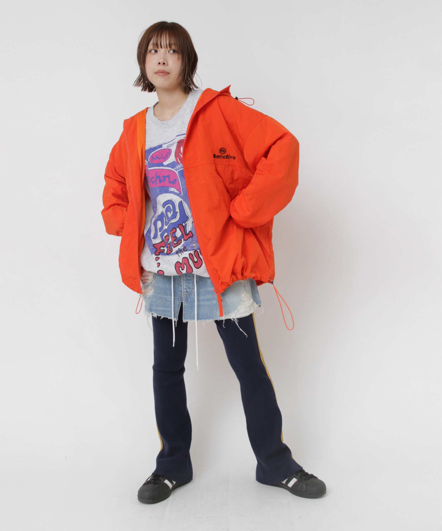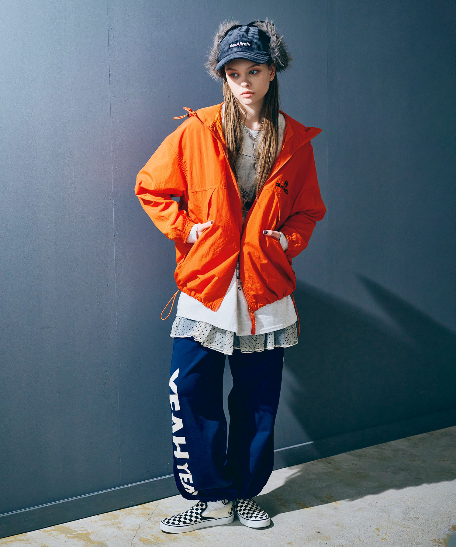 おすすめはビビットなオレンジカラーで、ライン入りボトムやスウェットパンツなどを合わせて、旬なムードを取り入れたストリートスタイルを楽しんでみてください。