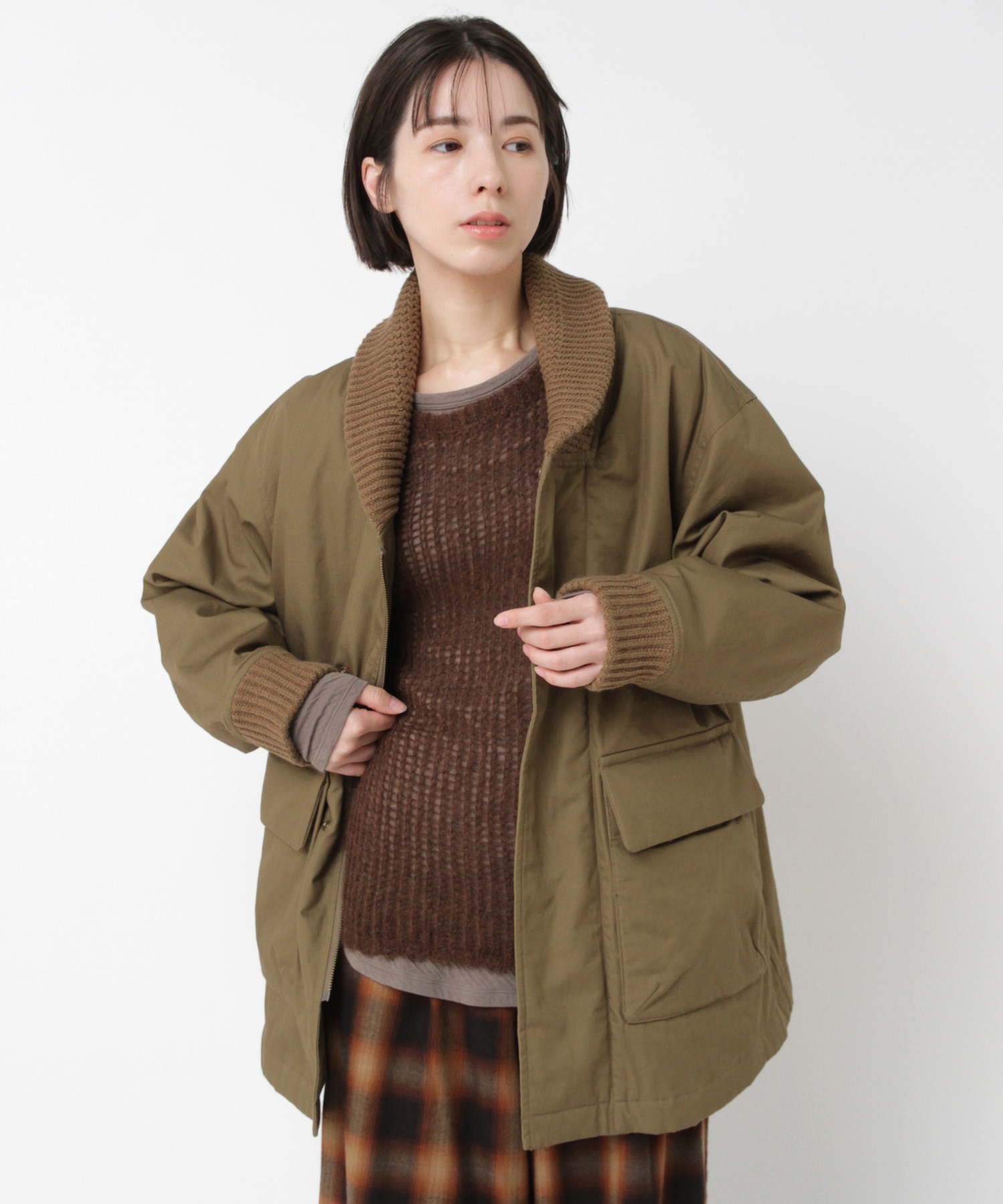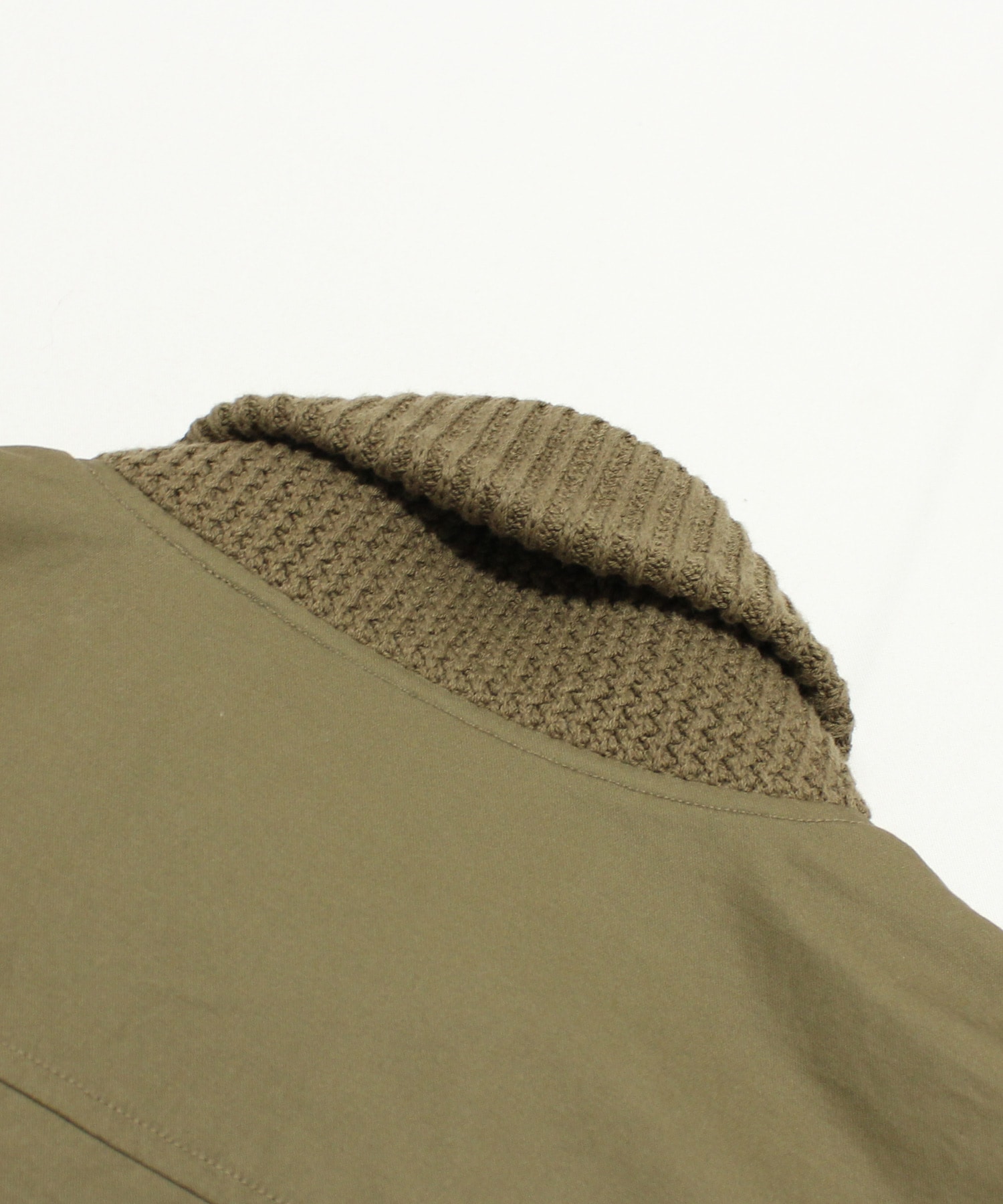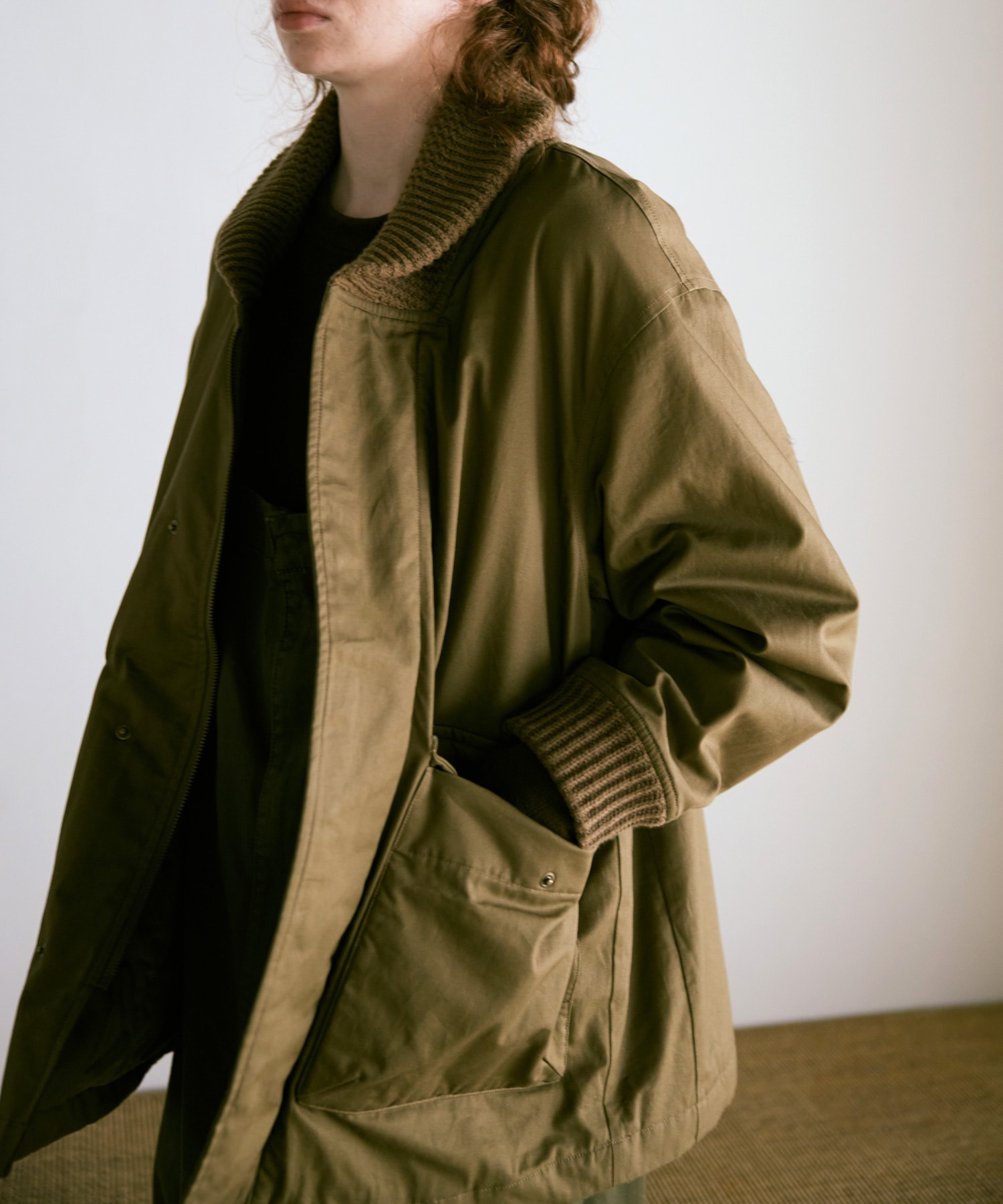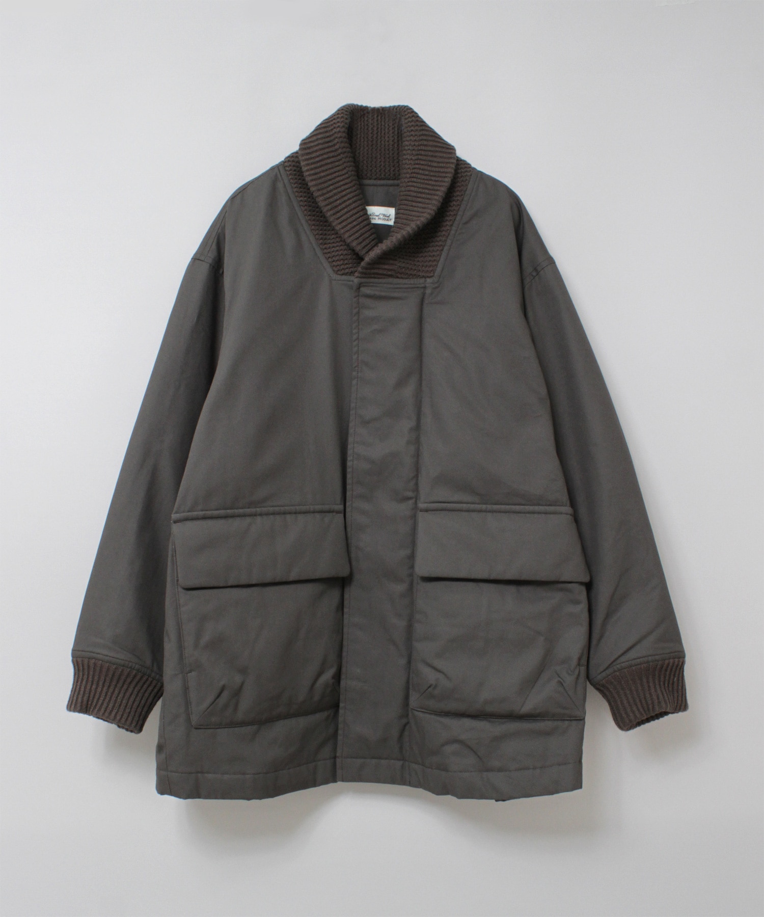 衿がリブニット仕様のドンキーコートをベースに、中綿を加えてアレンジしたジャケットです。