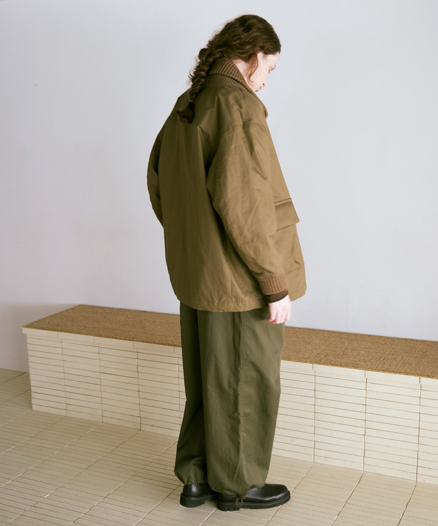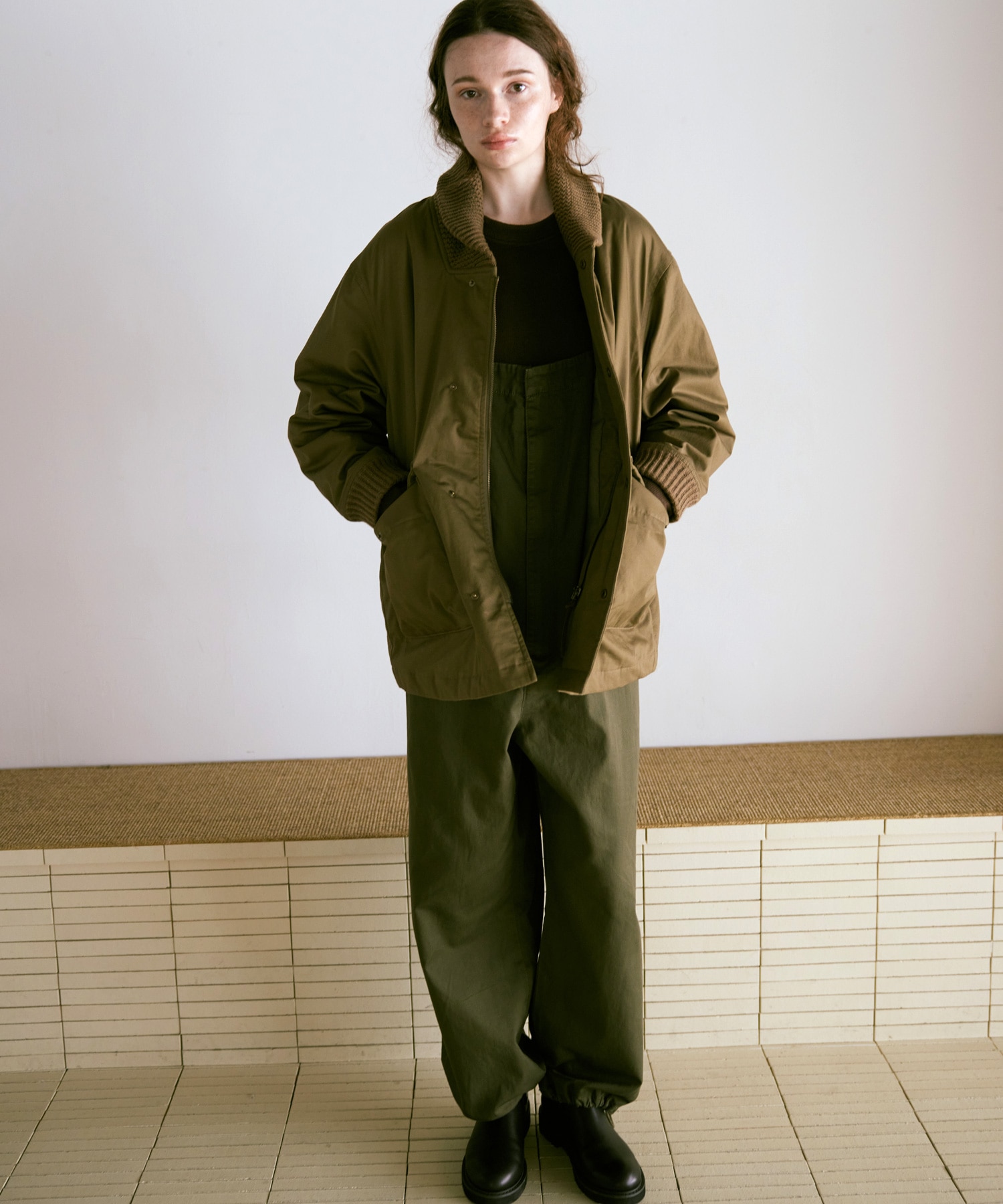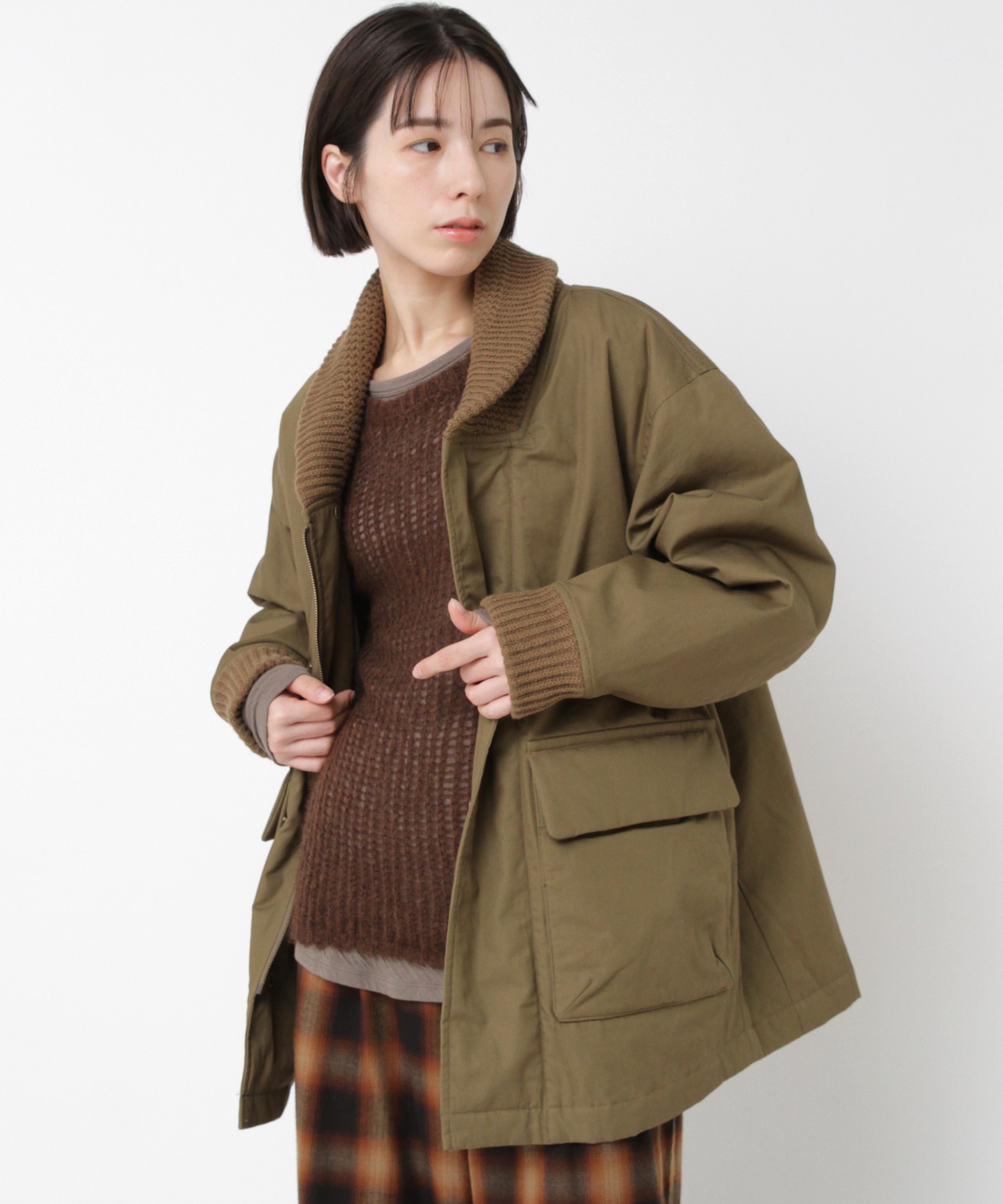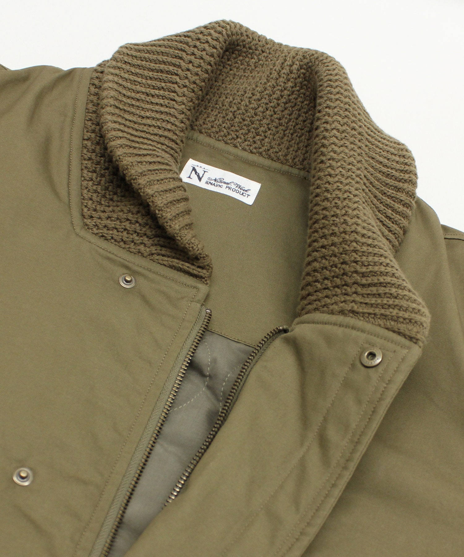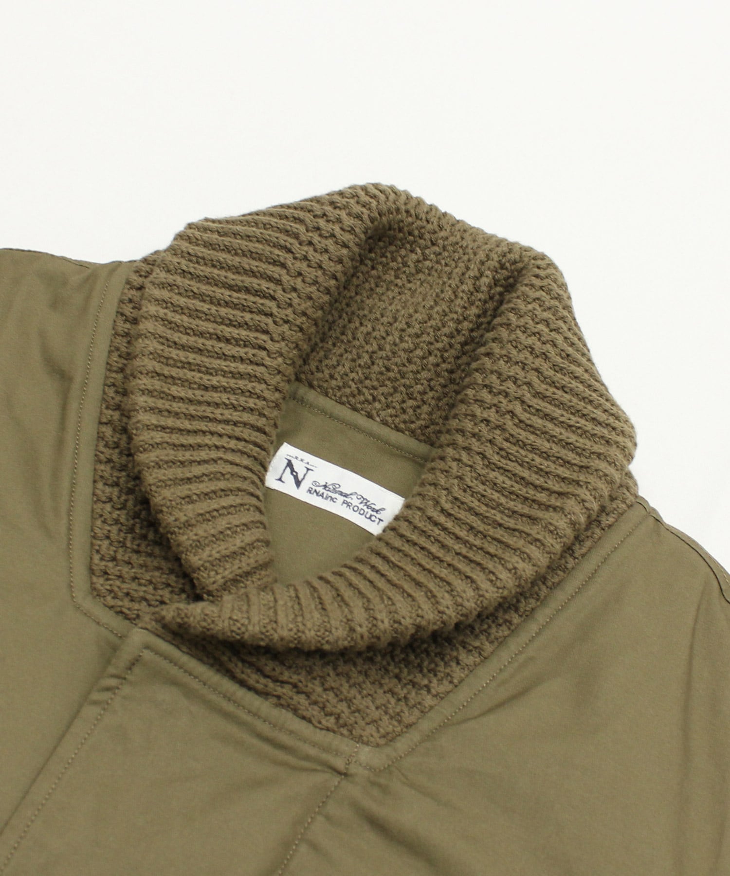 衿がリブニット仕様のドンキーコートをベースに、中綿を加えてアレンジしたジャケットです。