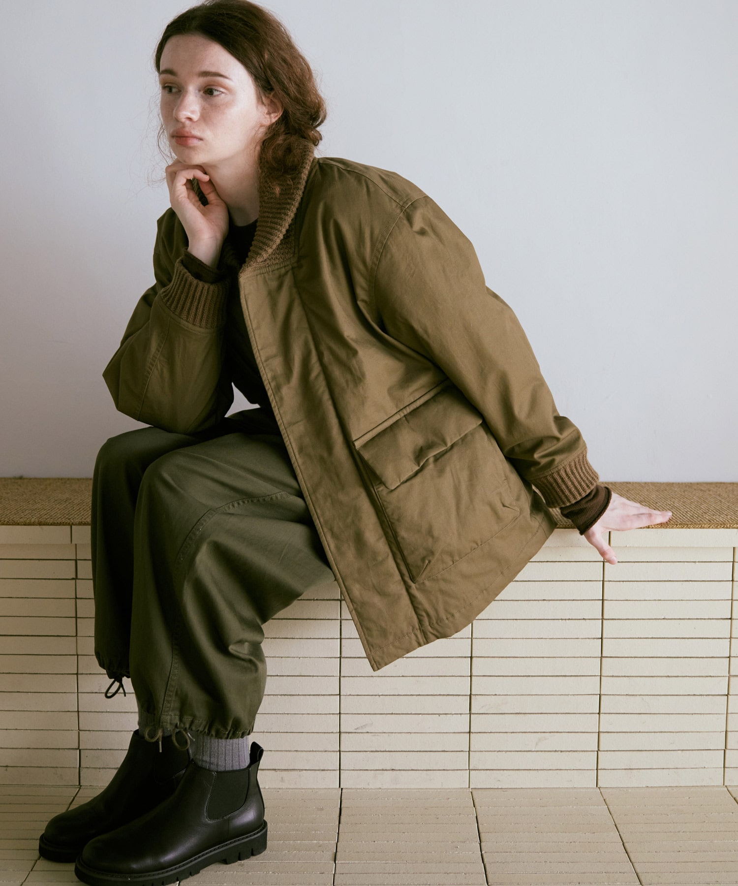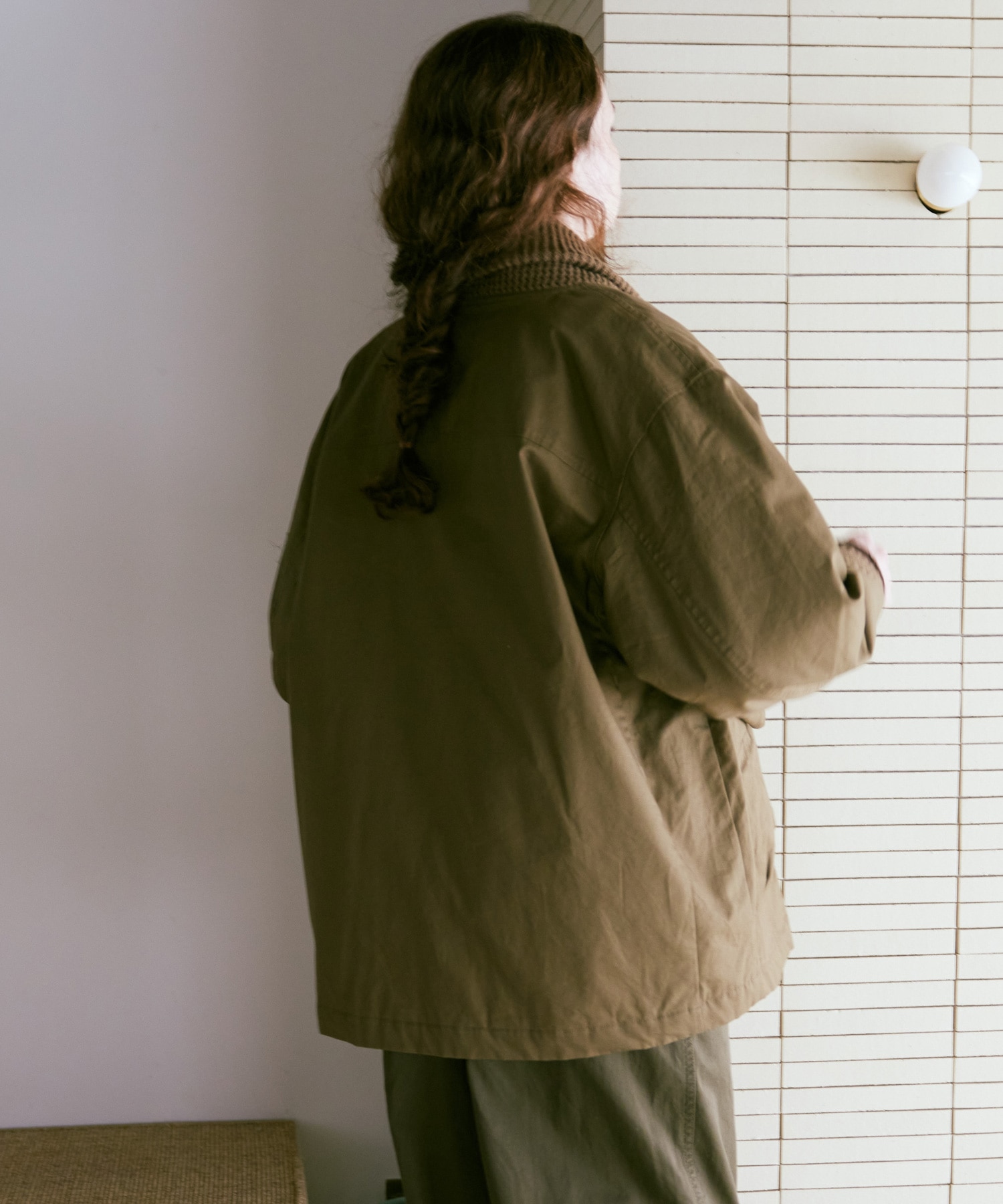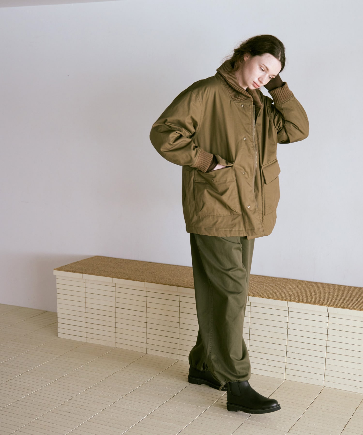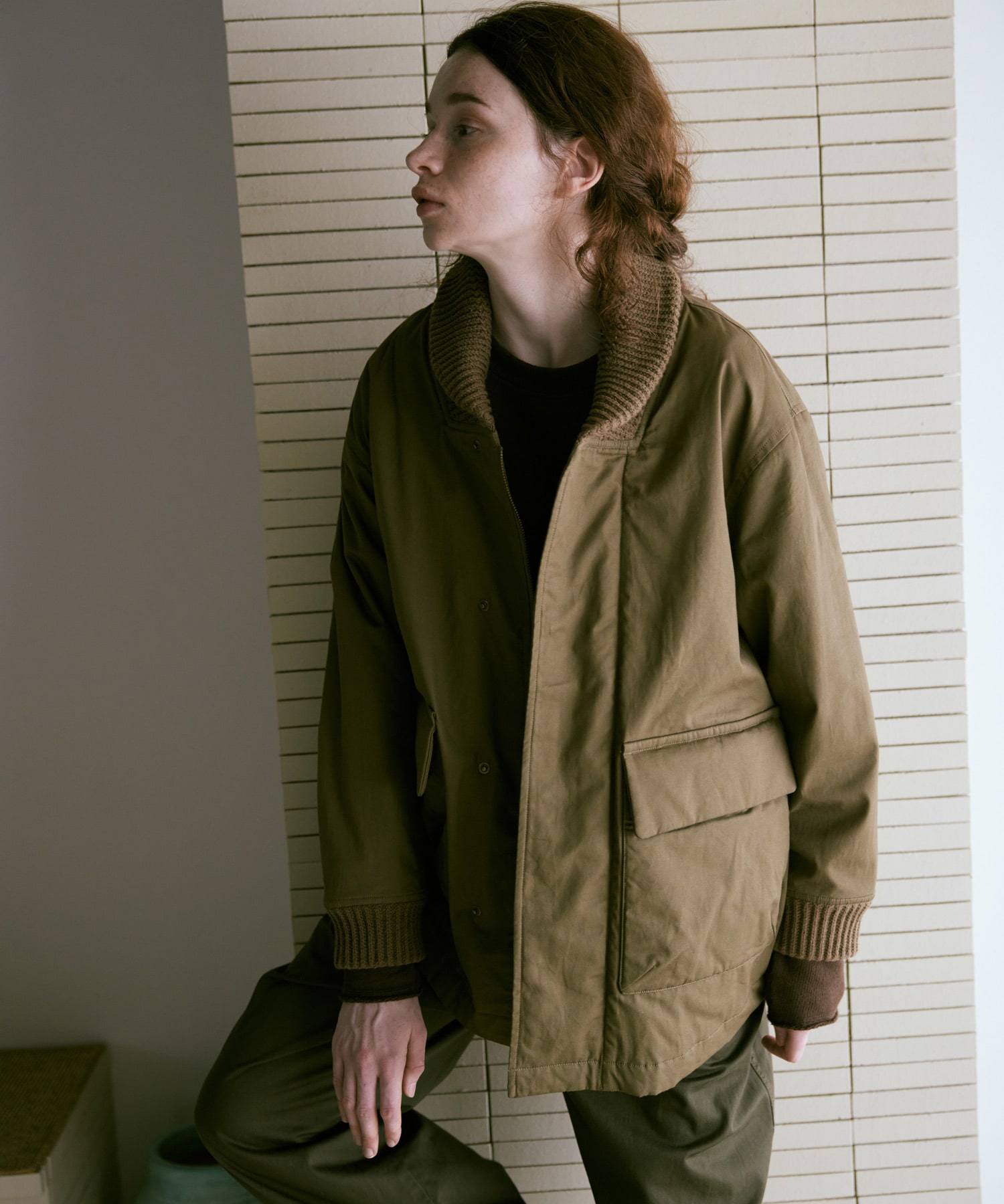 衿がリブニット仕様のドンキーコートをベースに、中綿を加えてアレンジしたジャケットです。