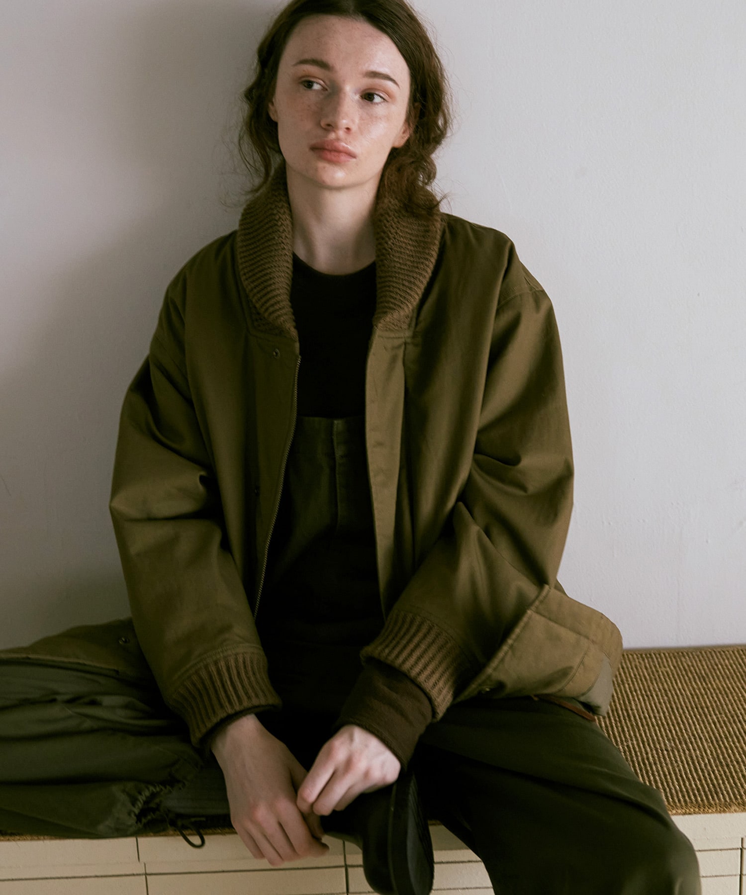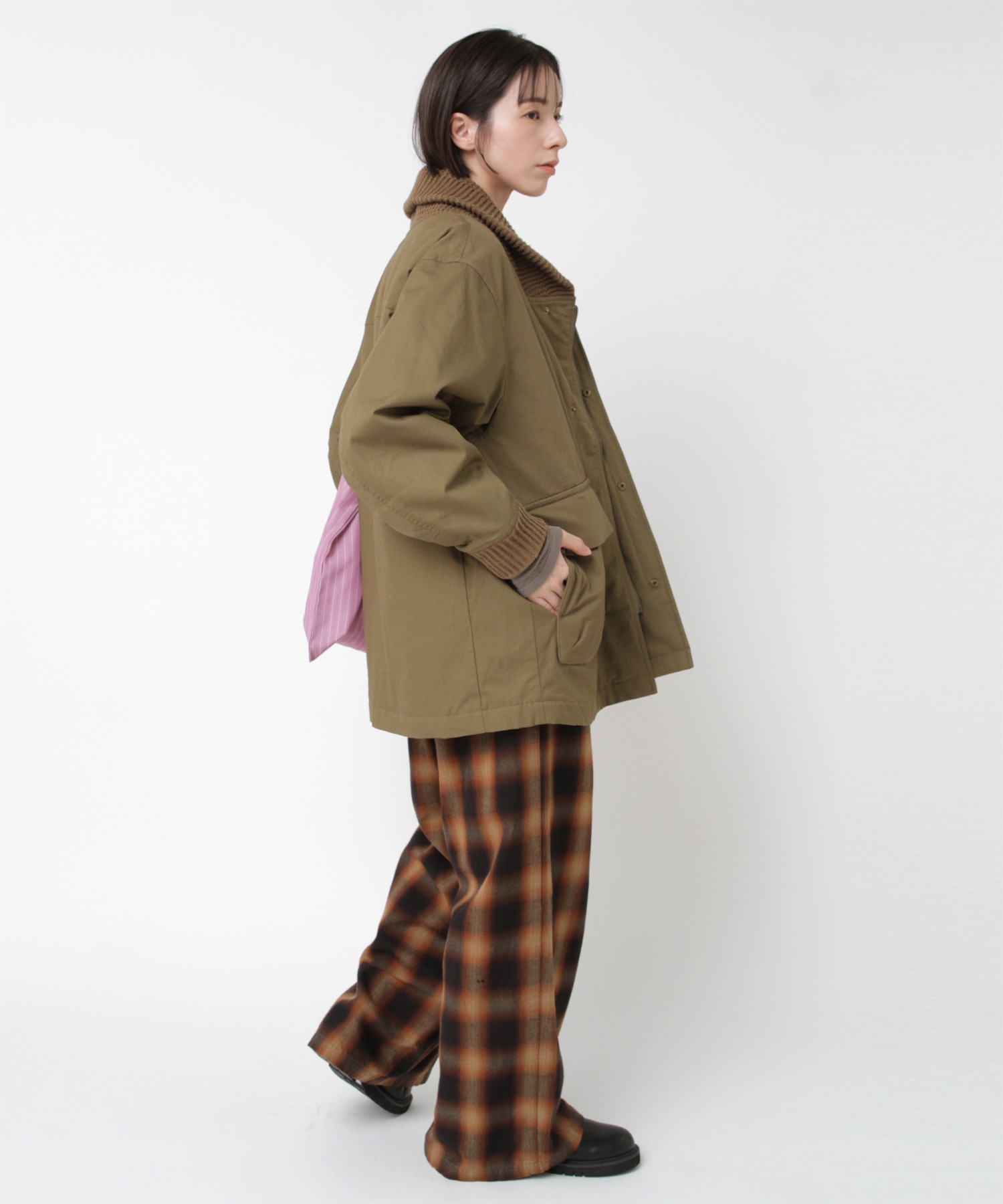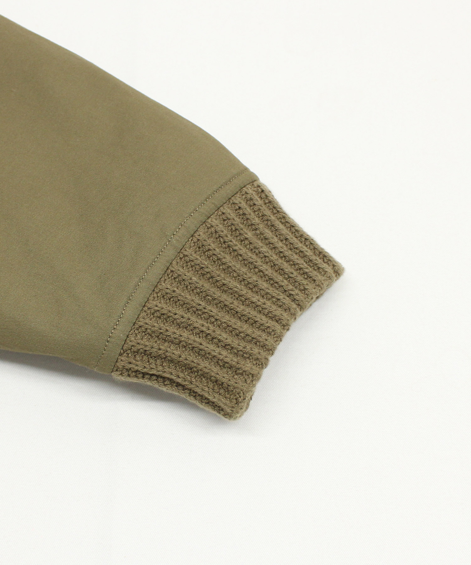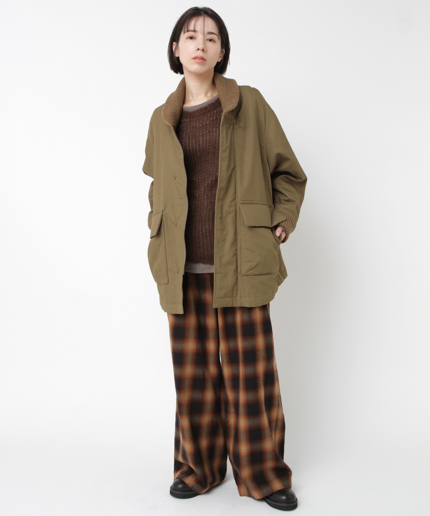 衿がリブニット仕様のドンキーコートをベースに、中綿を加えてアレンジしたジャケットです。