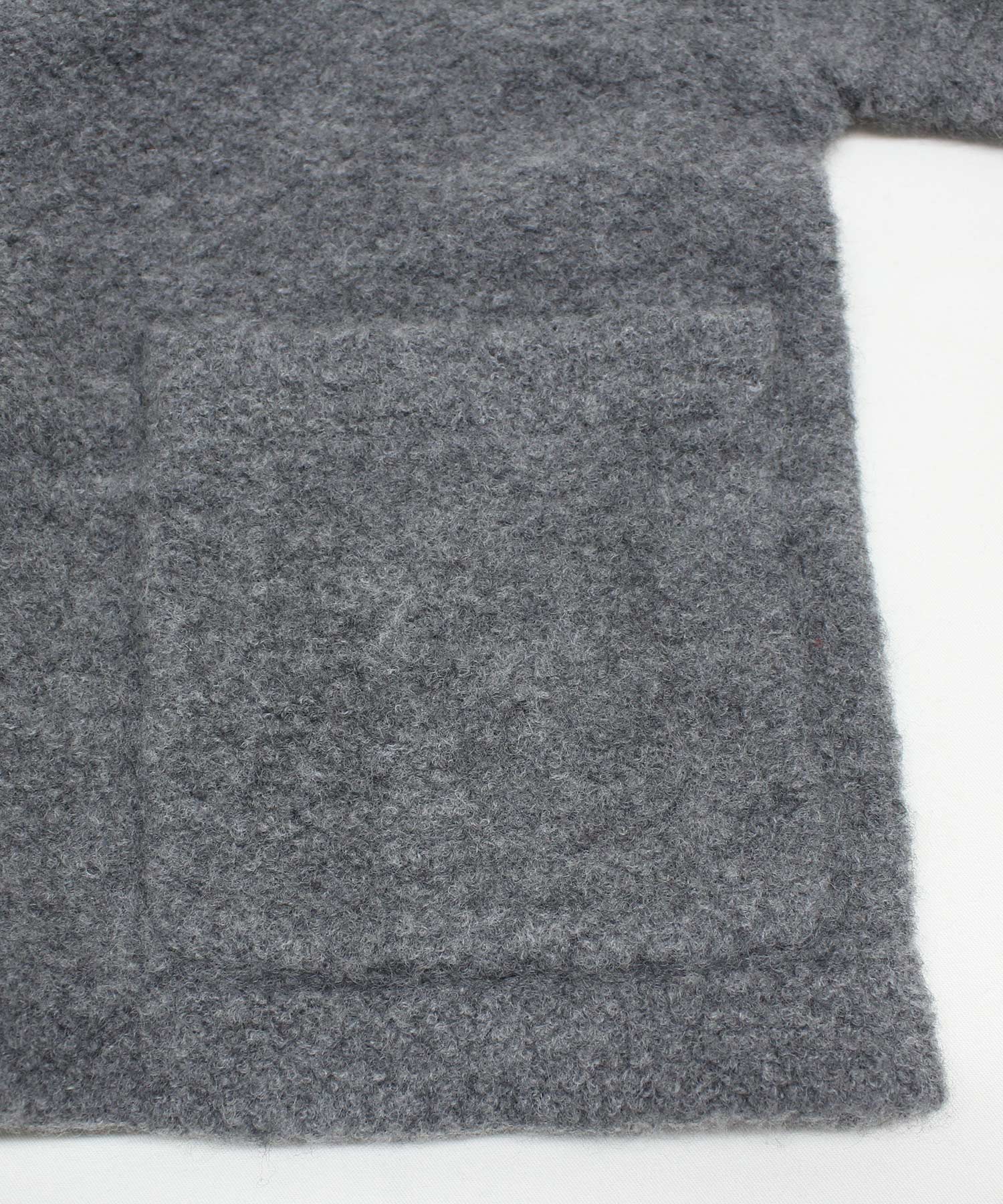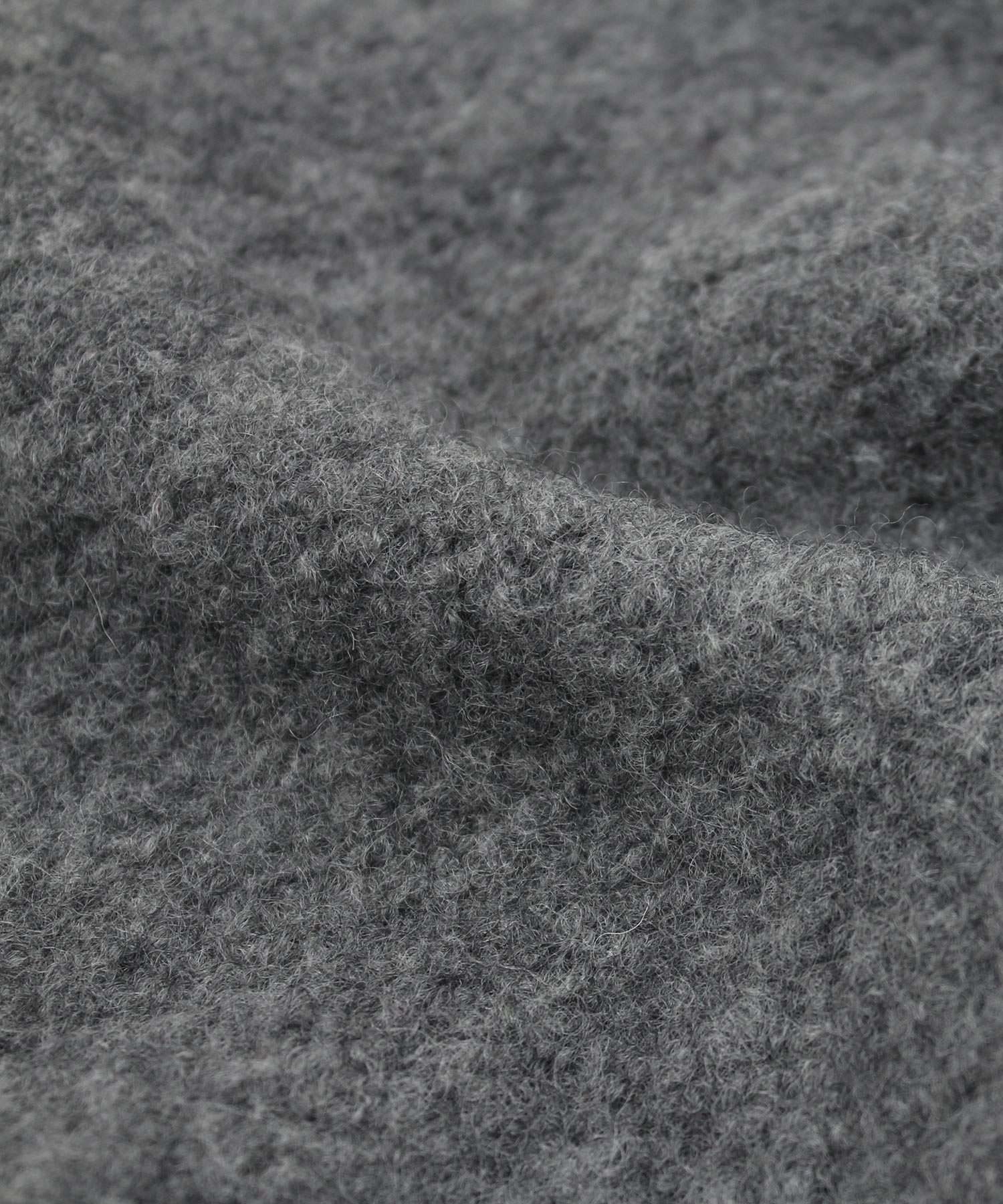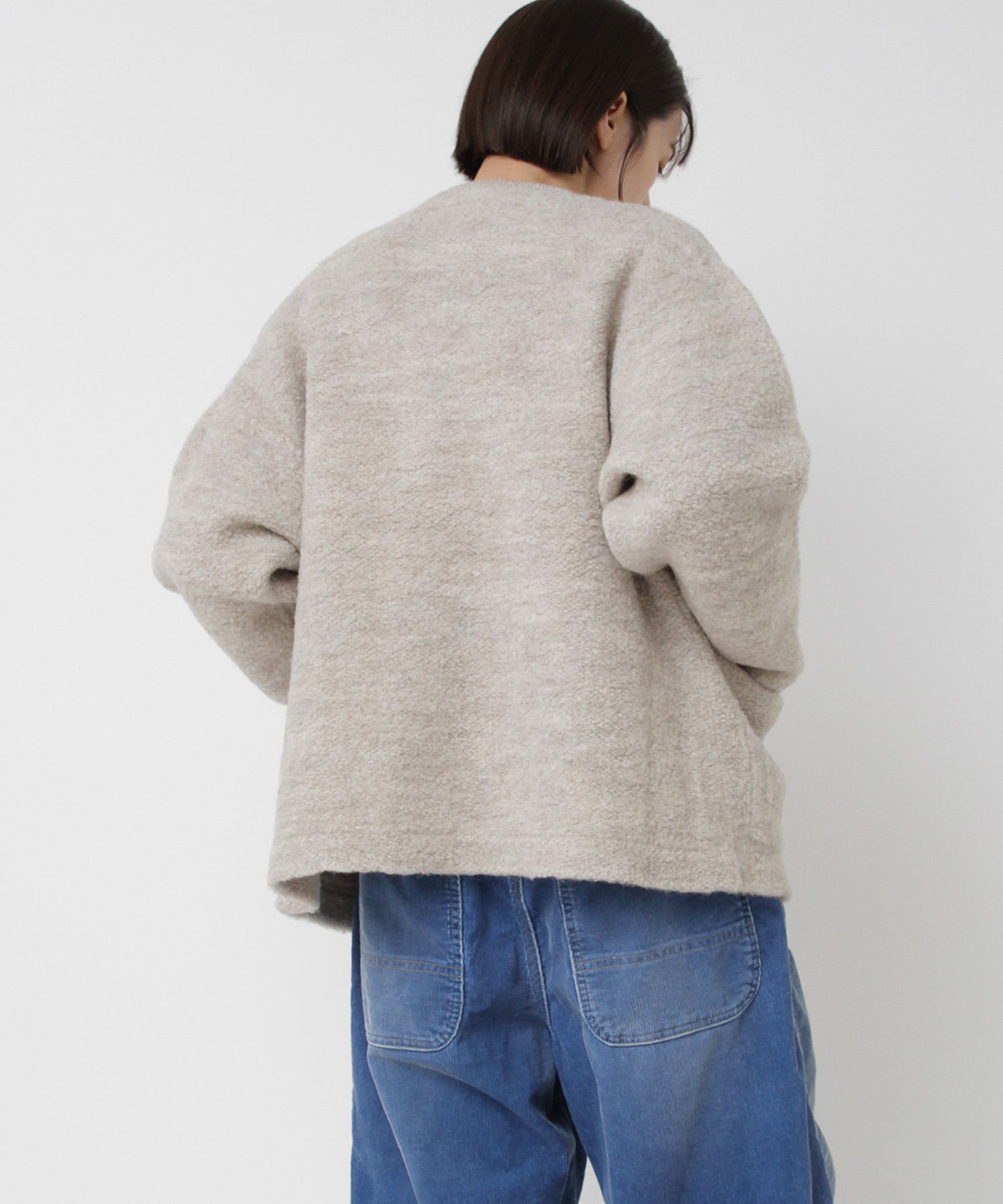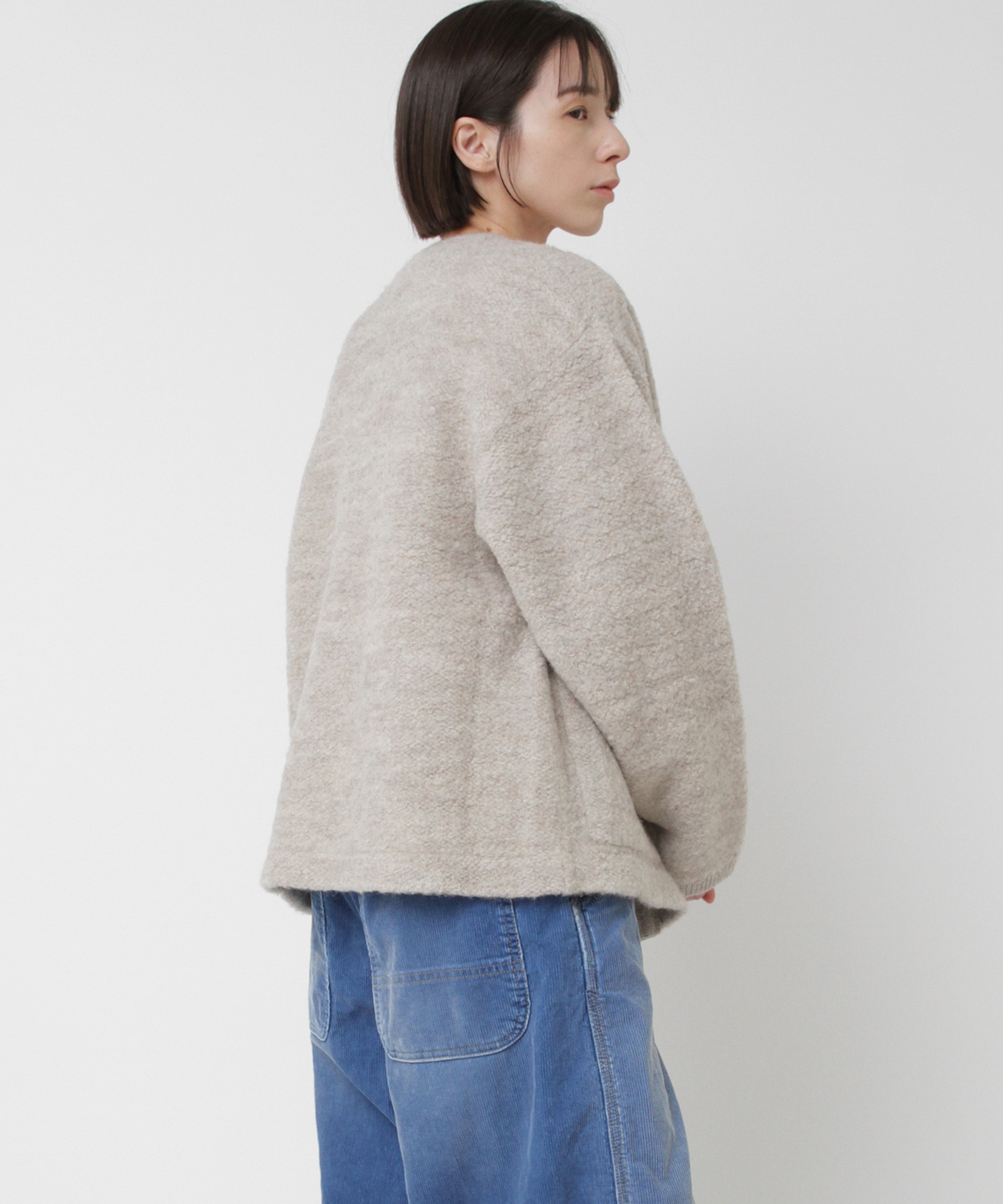 ループ編みを縮絨していて、表はくるくるとした毛並みが特徴、裏はフラットで着やすくなっています。
