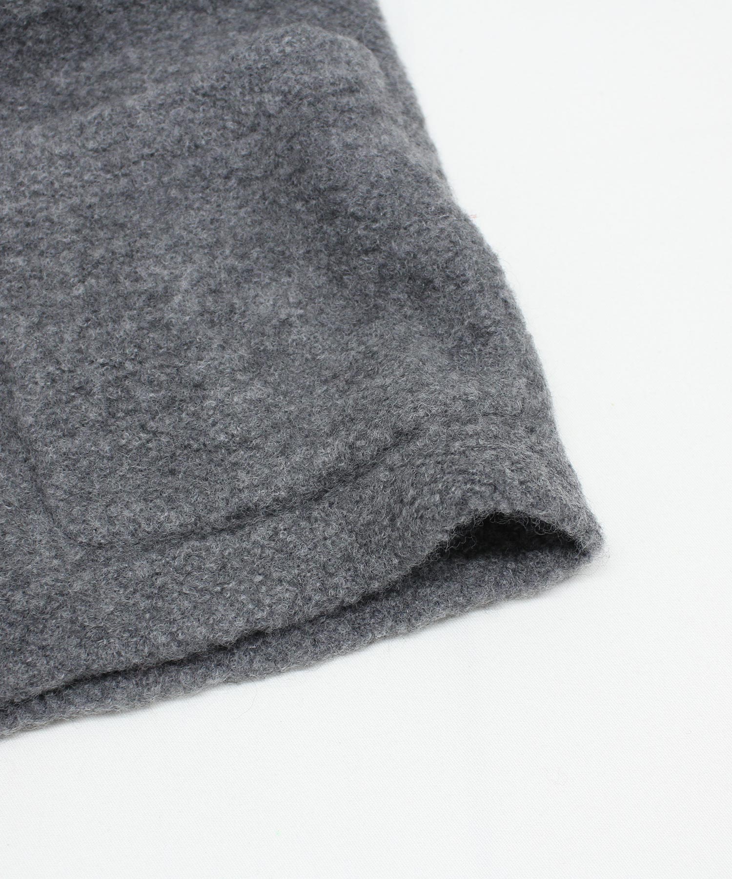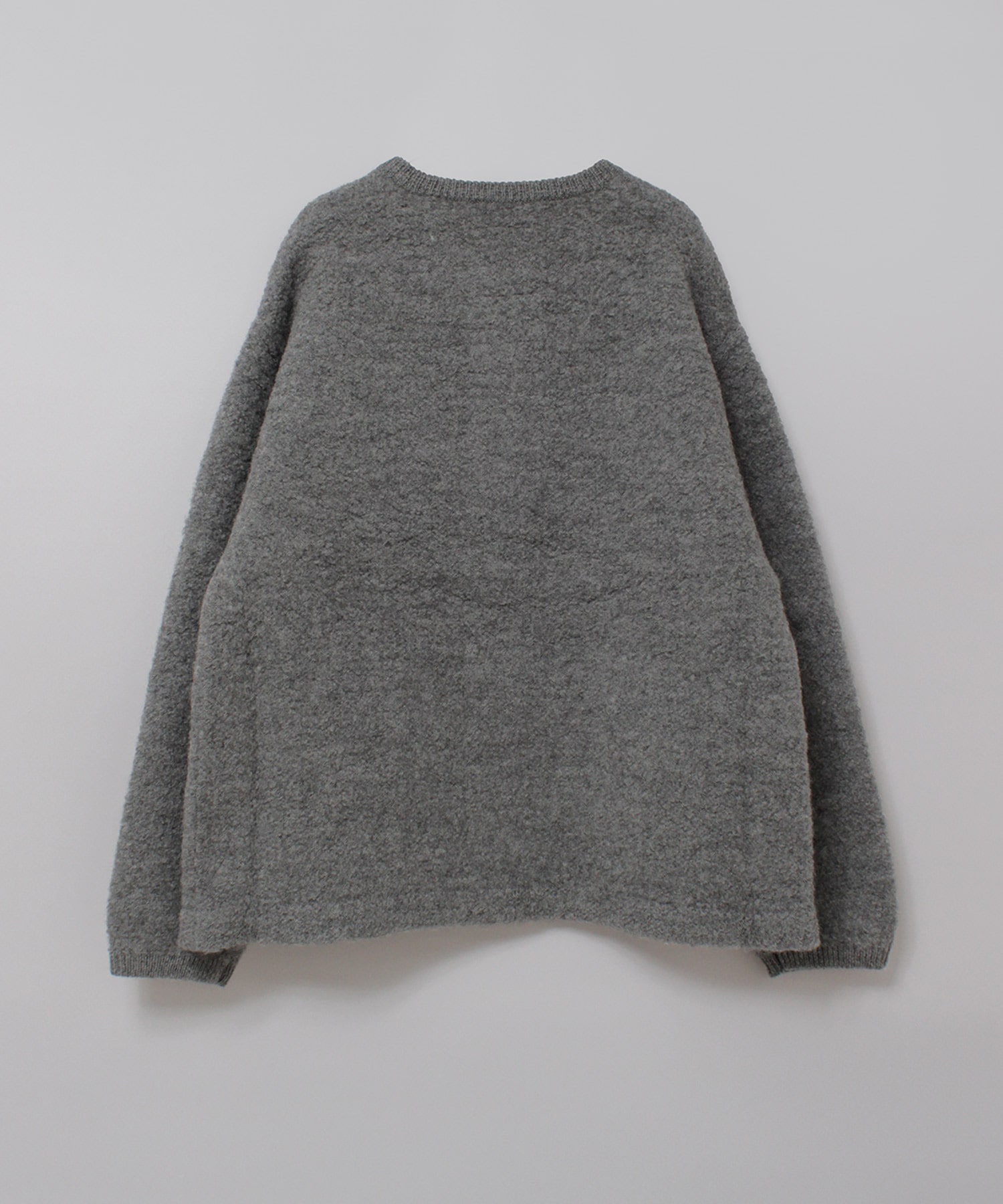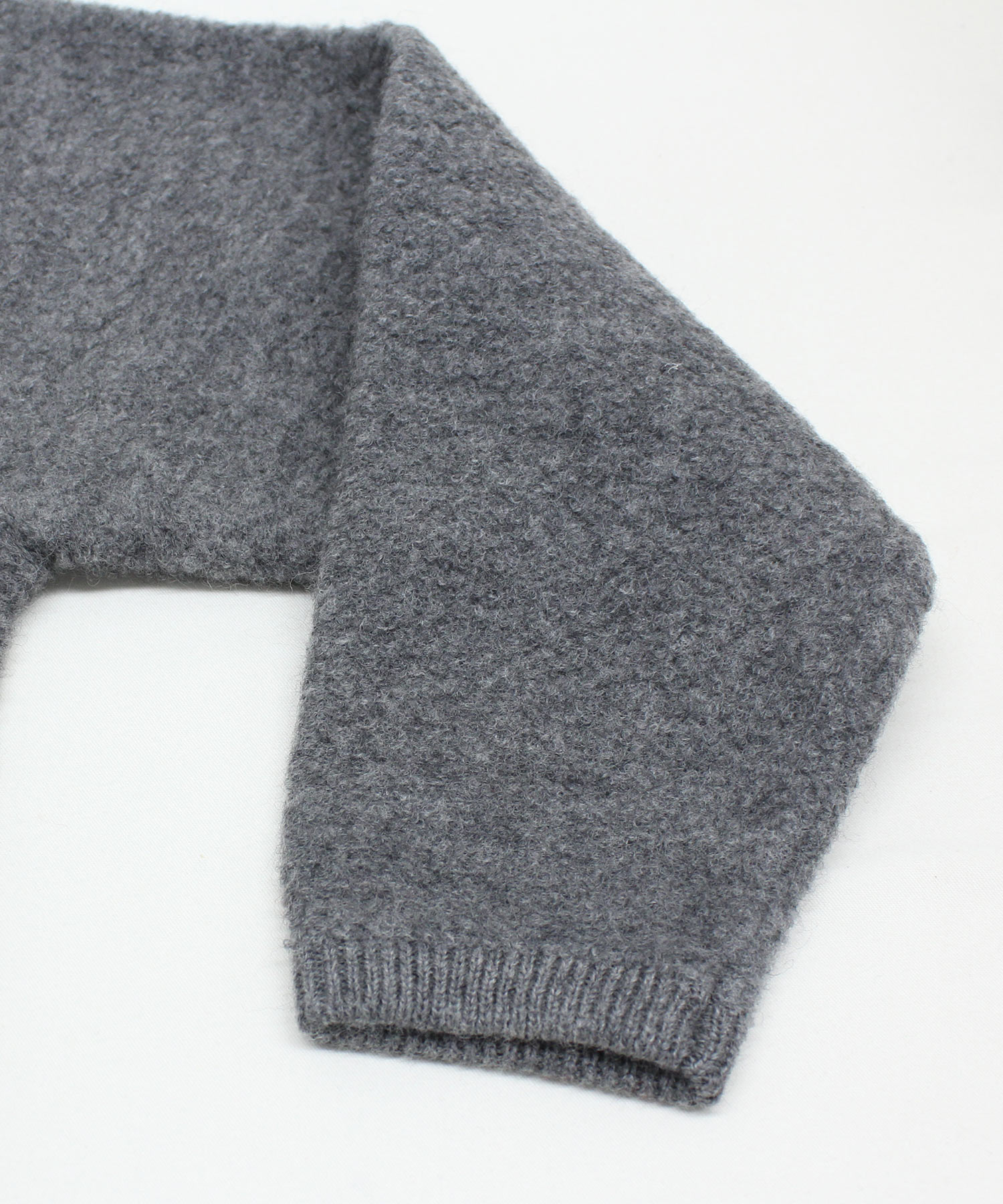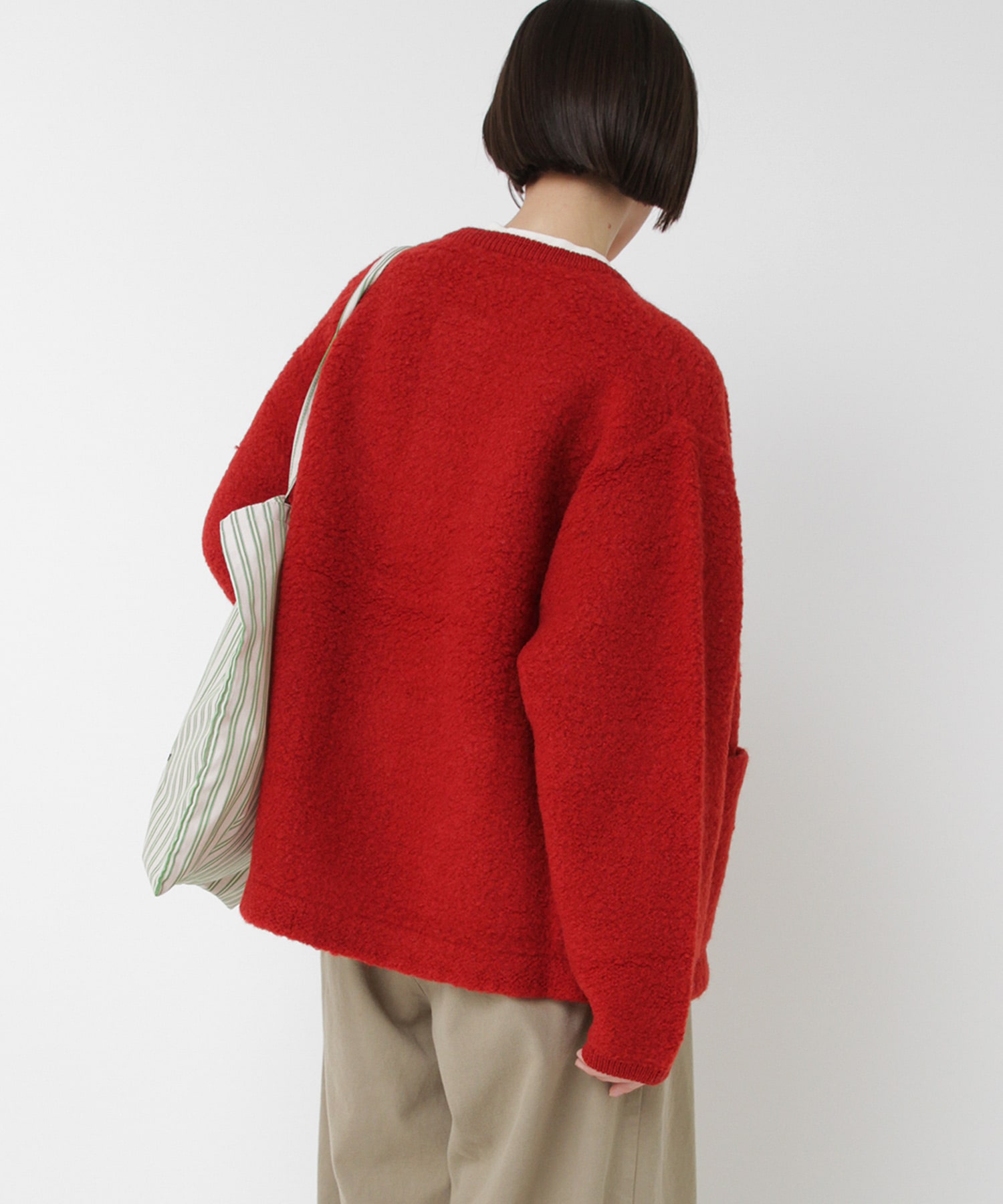 ループ編みを縮絨していて、表はくるくるとした毛並みが特徴、裏はフラットで着やすくなっています。