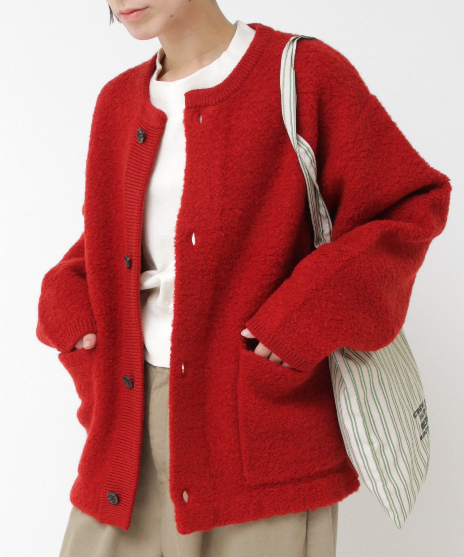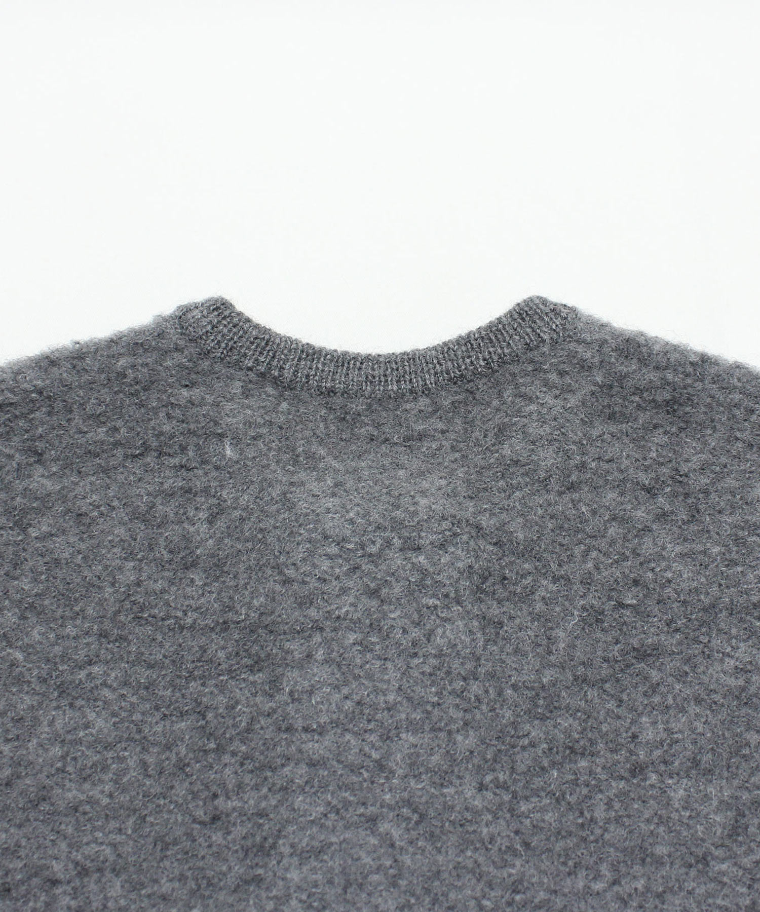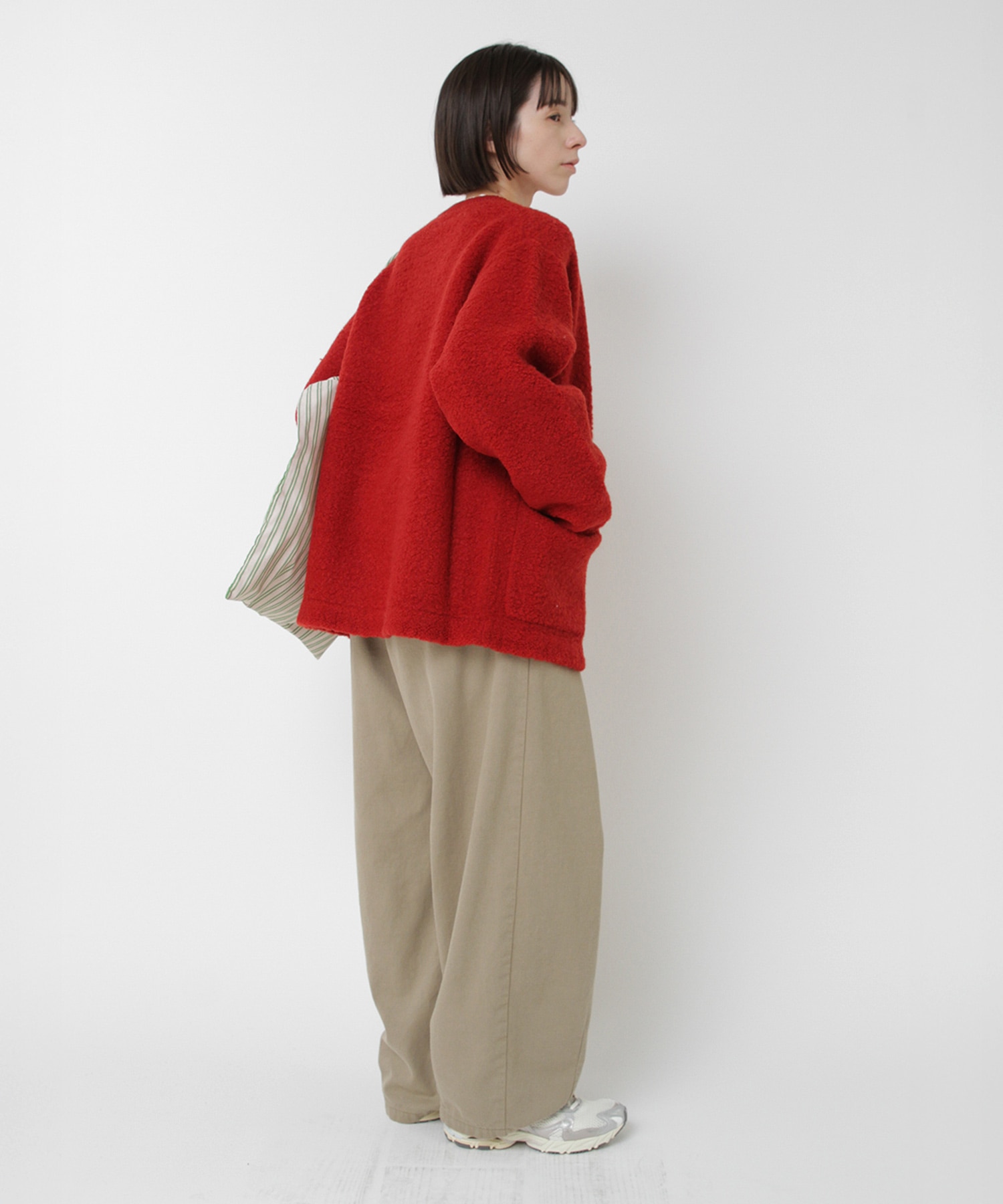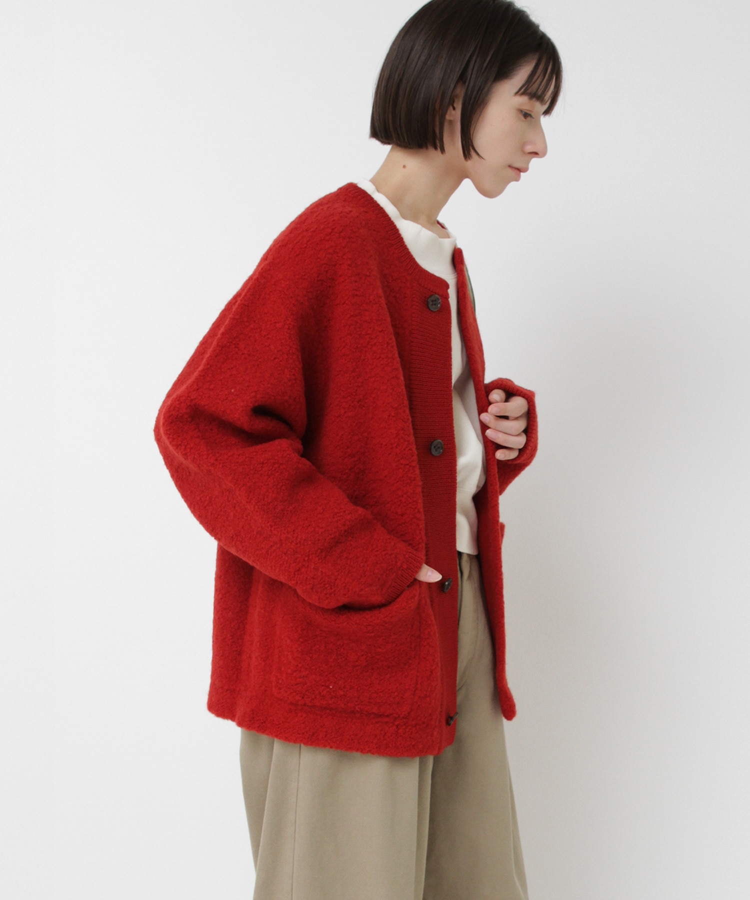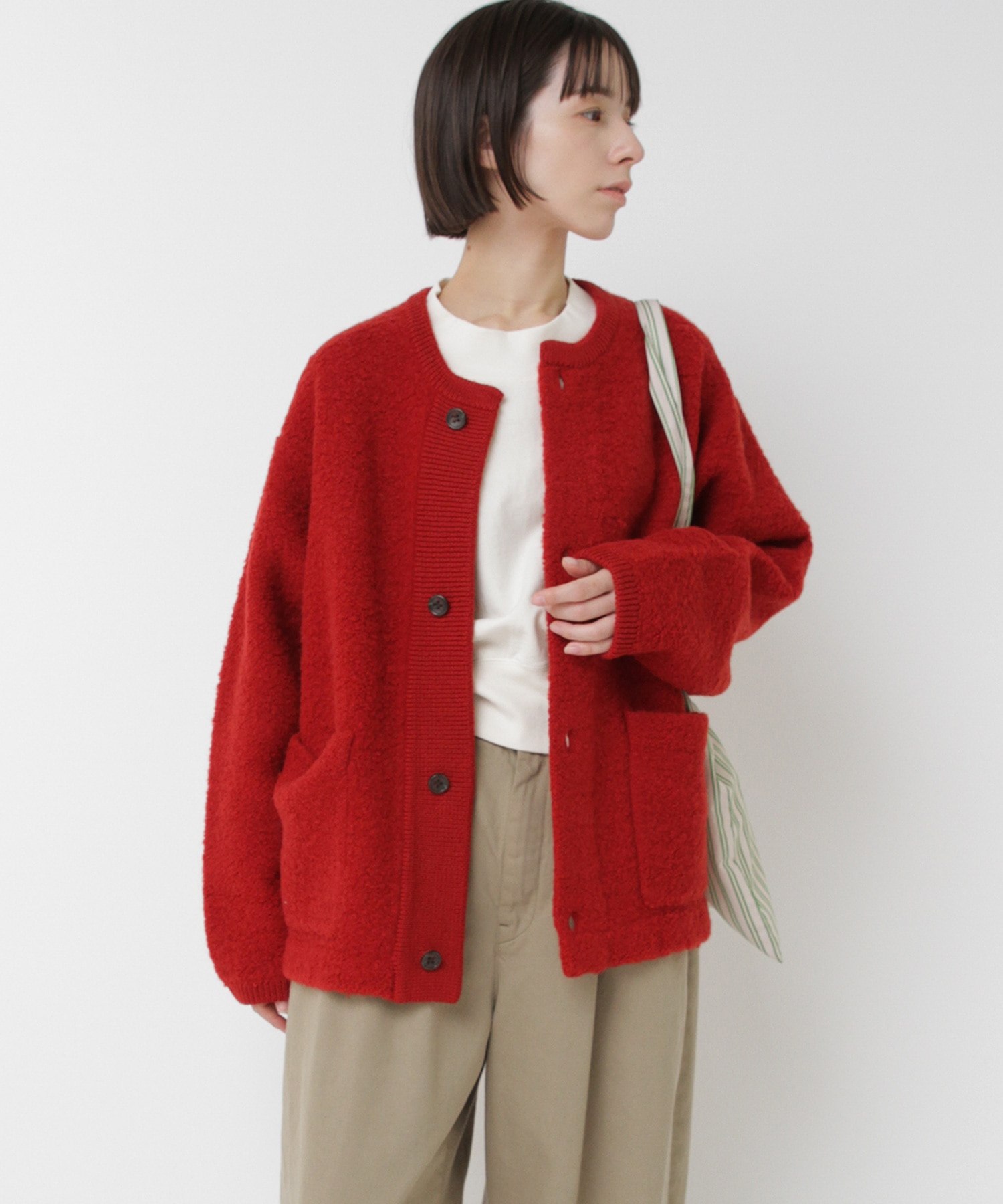 ループ編みを縮絨していて、表はくるくるとした毛並みが特徴、裏はフラットで着やすくなっています。