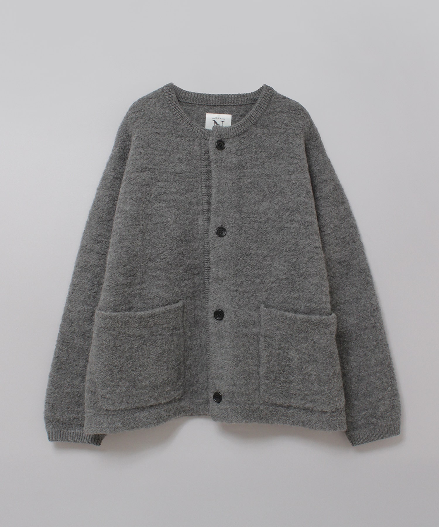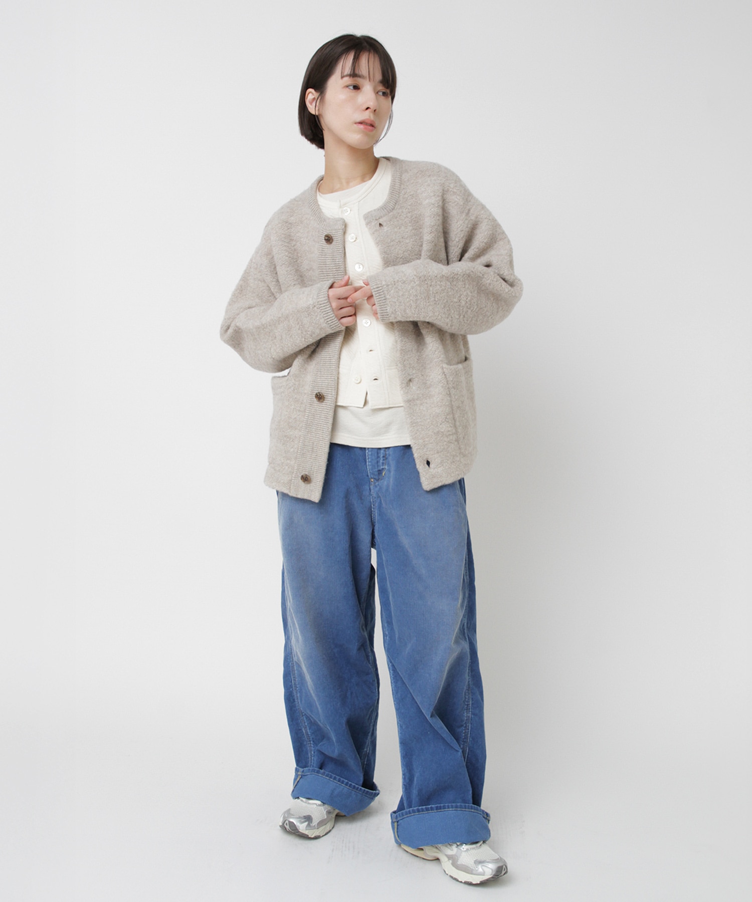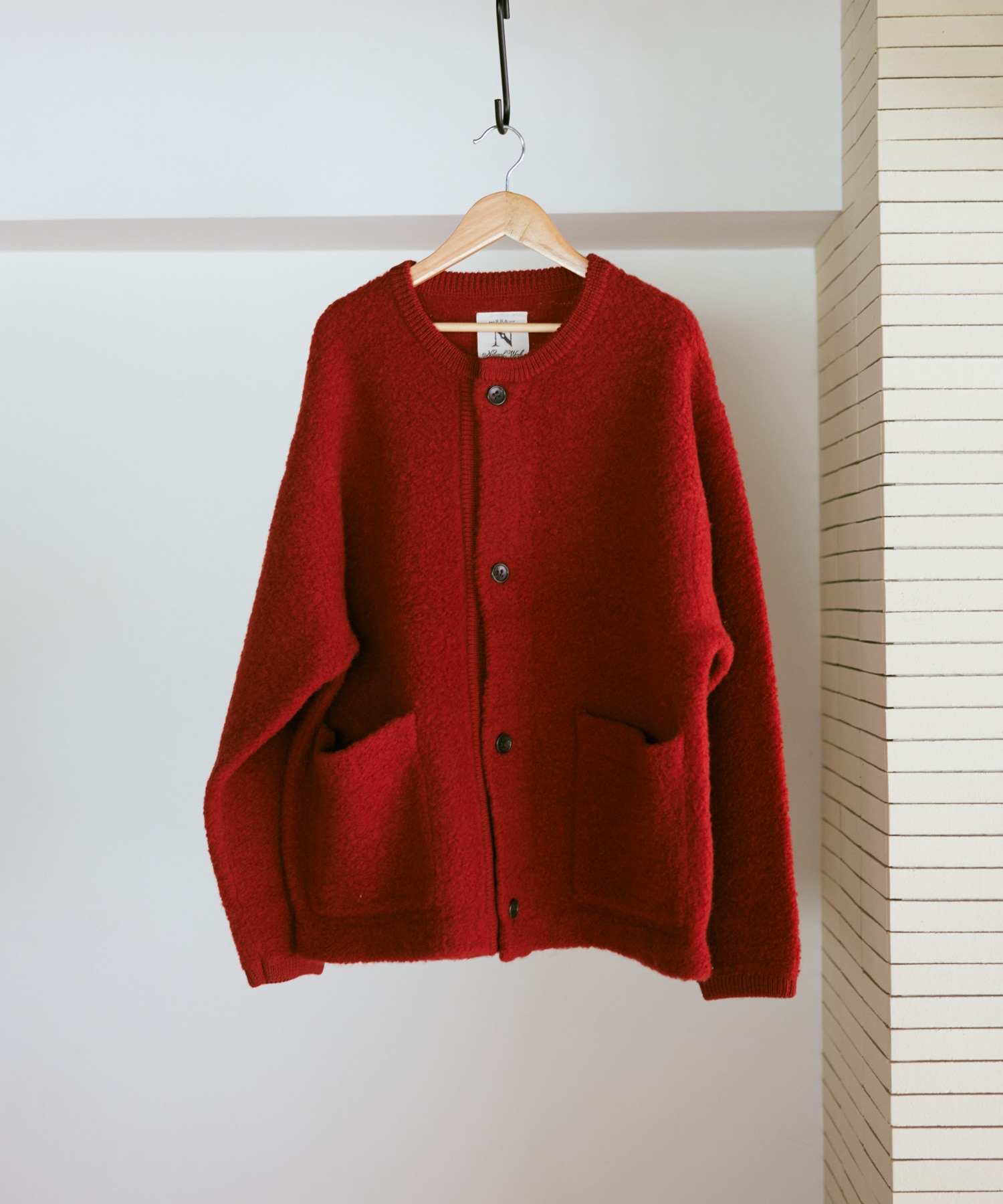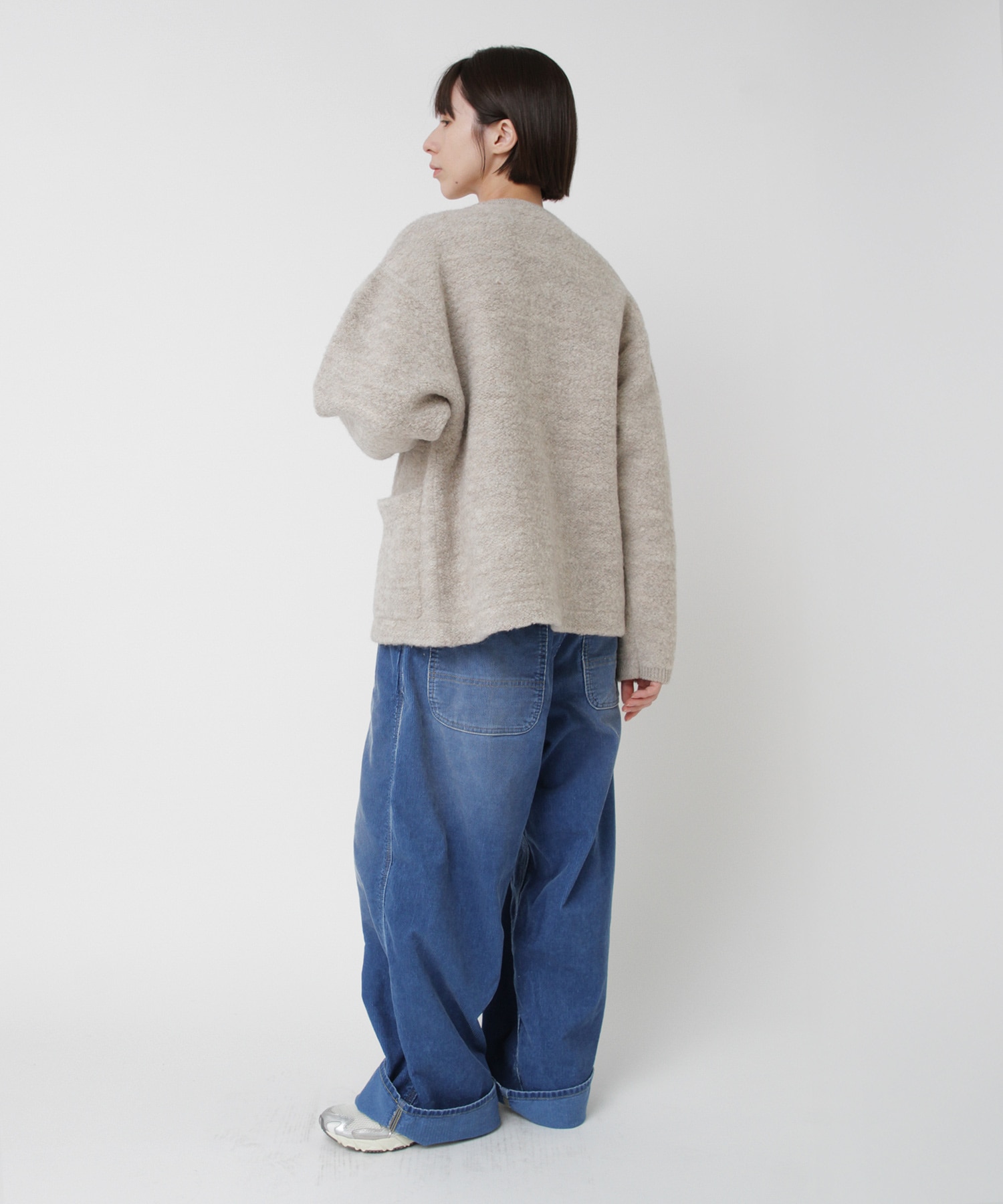 ループ編みを縮絨していて、表はくるくるとした毛並みが特徴、裏はフラットで着やすくなっています。