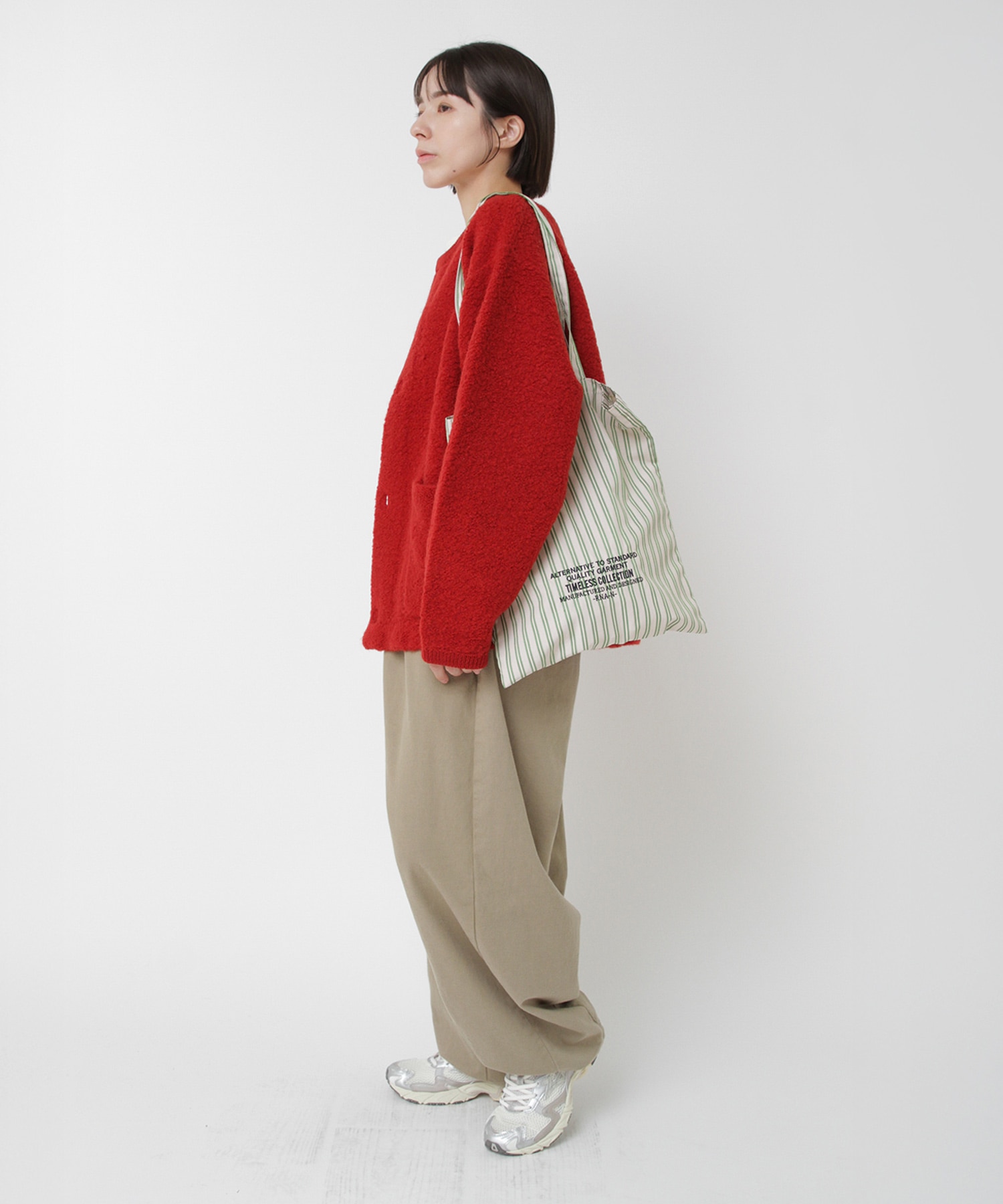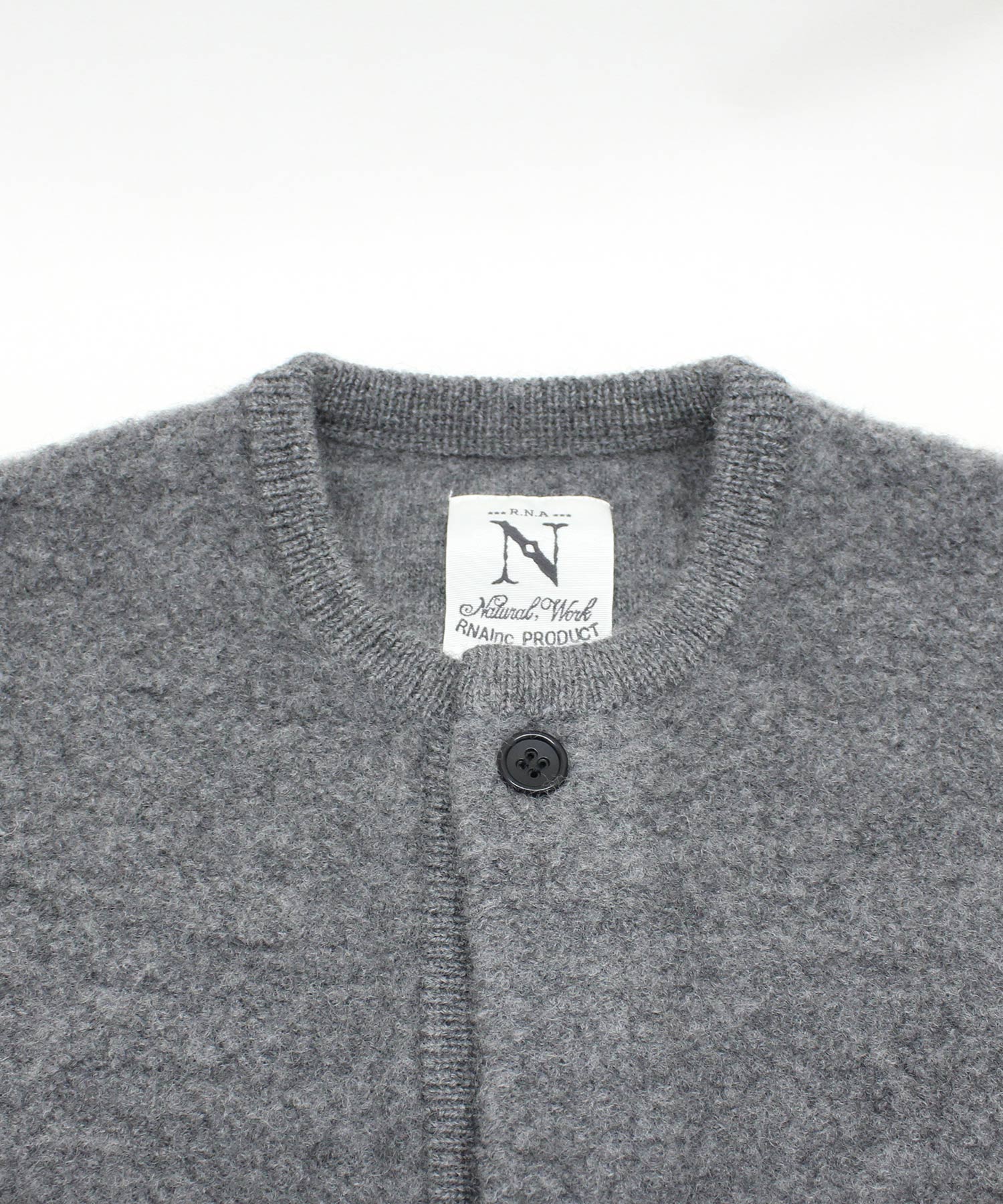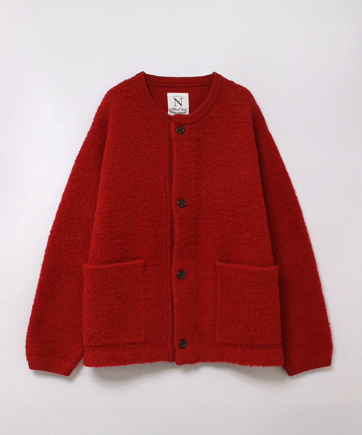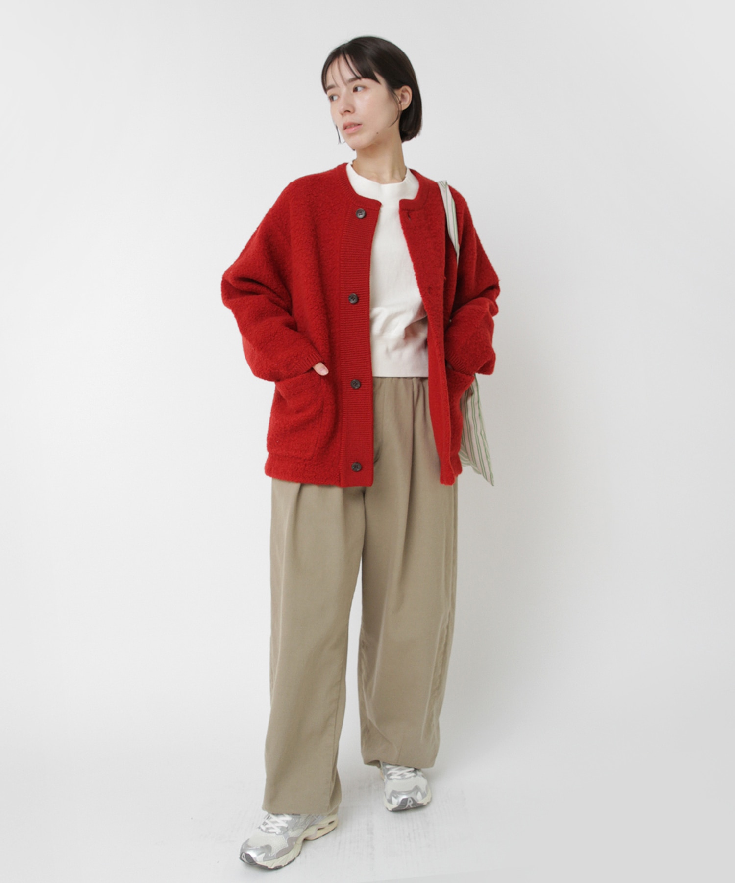 ループ編みを縮絨していて、表はくるくるとした毛並みが特徴、裏はフラットで着やすくなっています。