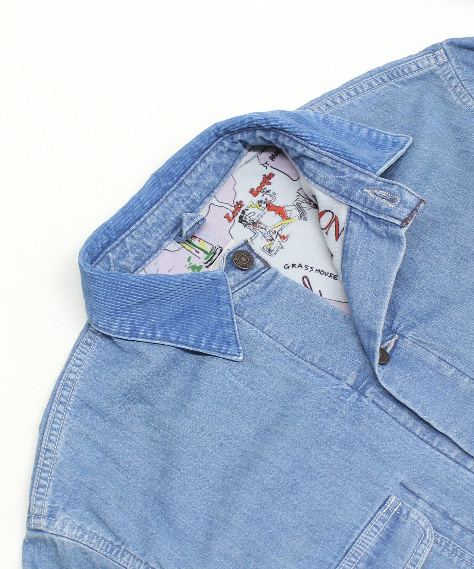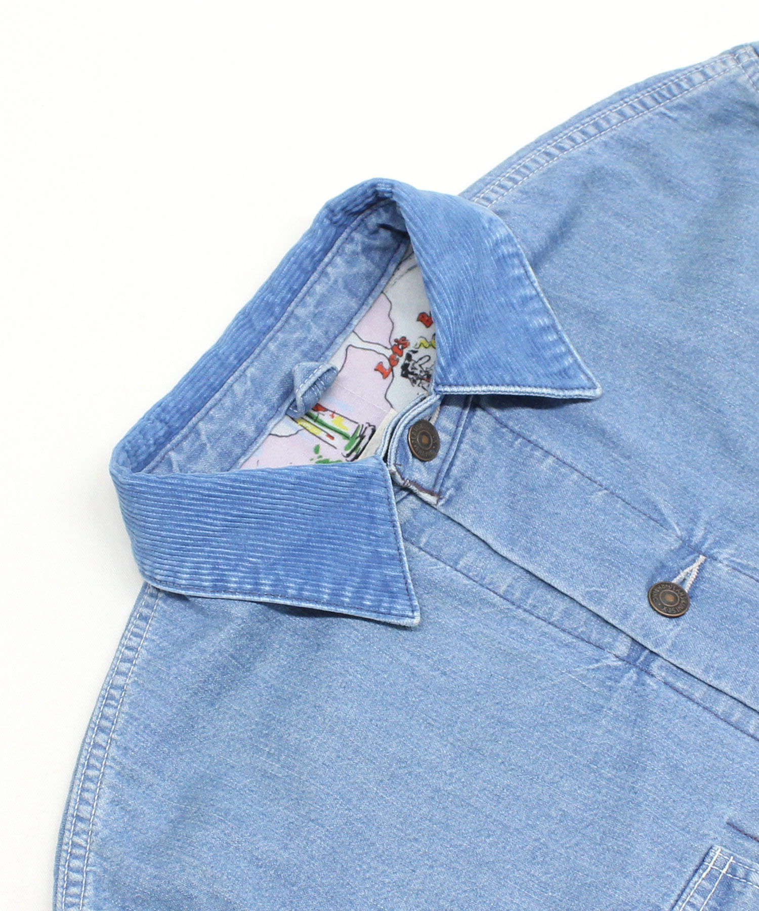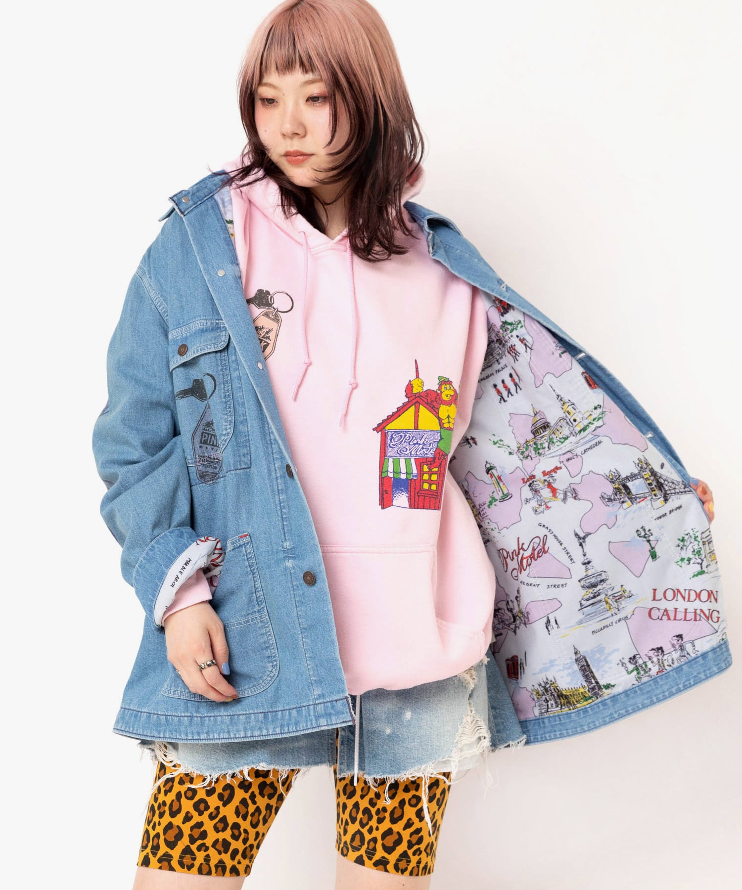 アメリカ製のヴィンテージカバーオールをデザインベースに、パターンをアップデートしました。ややワイドな身頃と裾まわりを広げたルーズなサイズバランスで、軽快に着こなせる一着に仕上げました。素材には、軽いムラ糸がビンテージ感を際立たせる日本製デニムを使用し、縫製やステッチワークも忠実にヴィンテージ仕様を再現しています。襟元にはインディゴ染めのコーデュロイを採用してアクセントを加えました。最大のこだわりは、内側のライニング。保温性を確保した軽い起毛素材に、オリジナルのMAP柄テキスタイルをプリントを施し見えない部分にもPINK MOTELの世界観を詰め込んでいます。袖を折り返して、裏地のMAP柄を見せるクールな着こなしもおすすめです。個性が光る2色展開です。