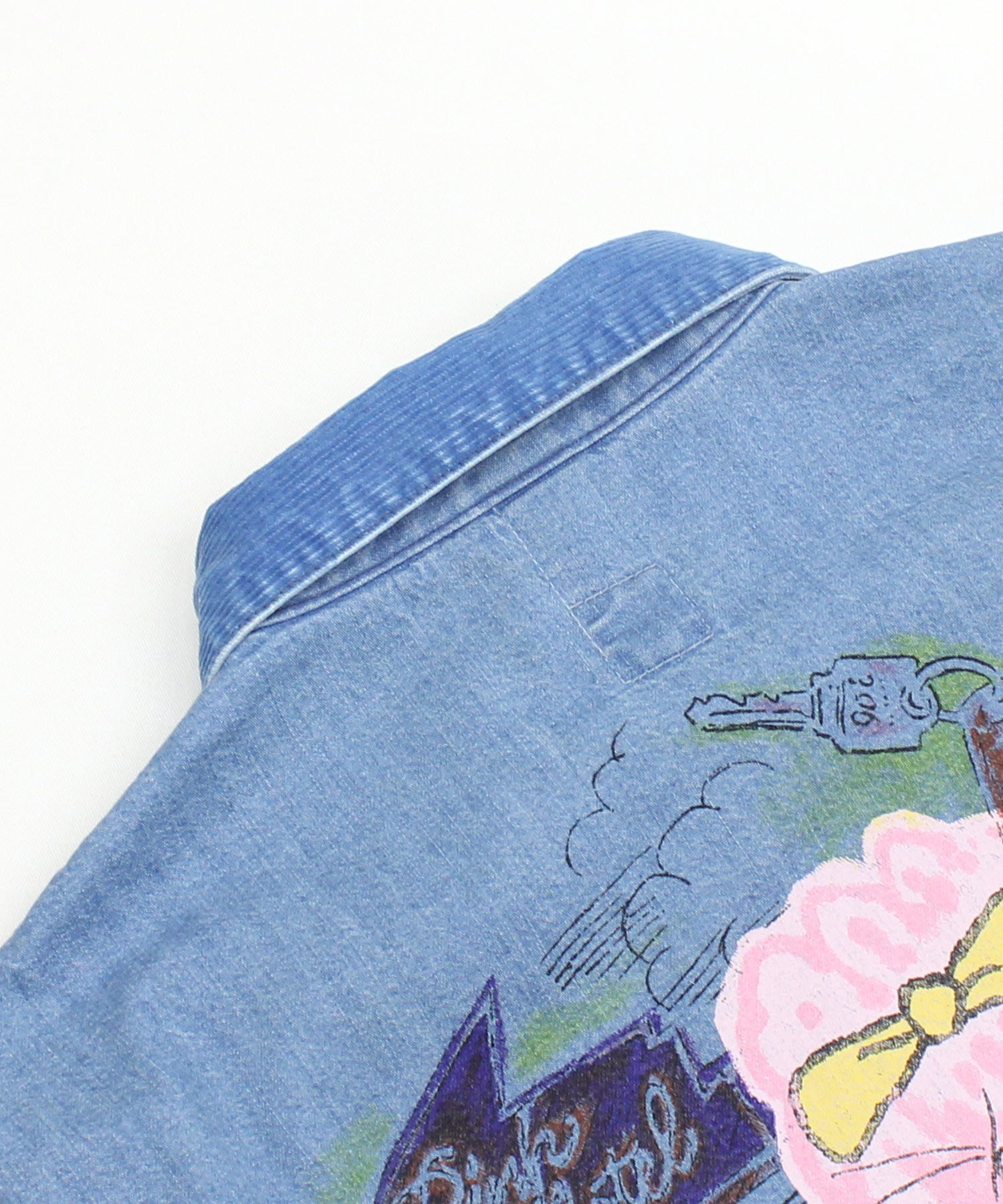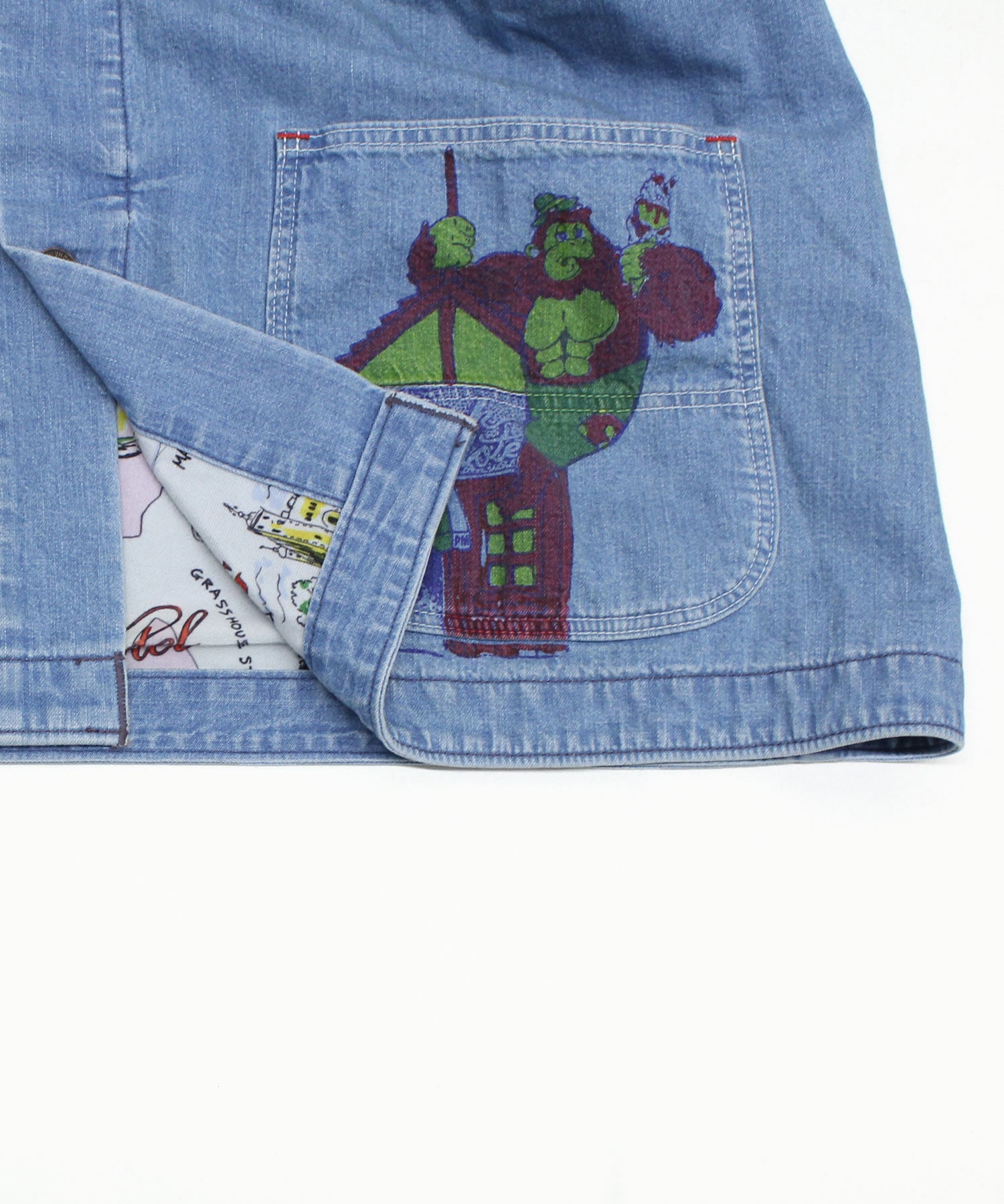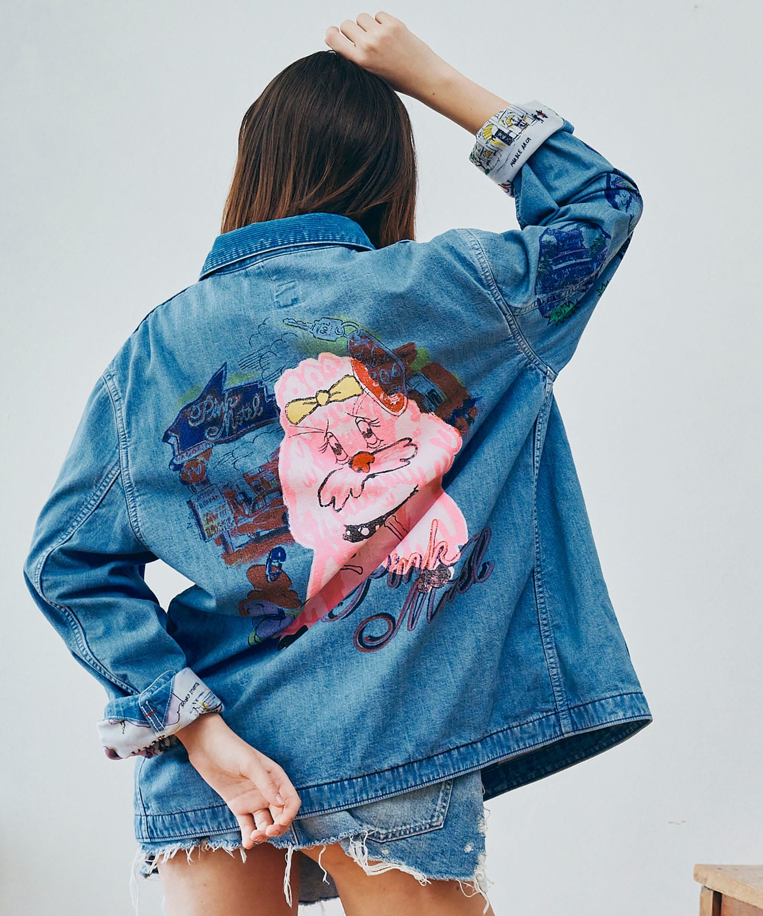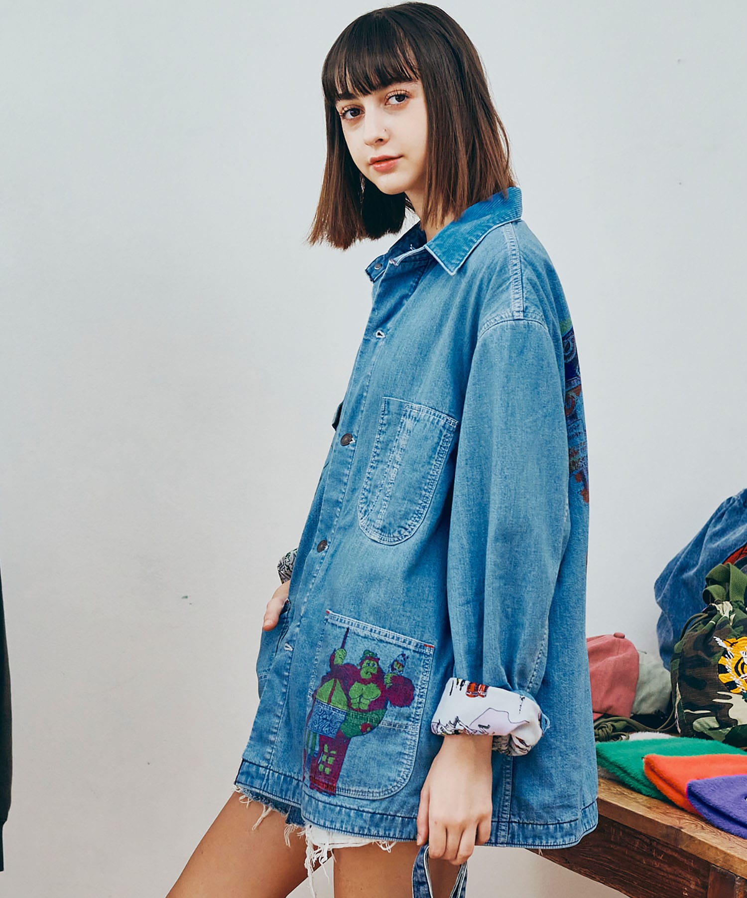 アメリカ製のヴィンテージカバーオールをデザインベースに、パターンをアップデートしました。ややワイドな身頃と裾まわりを広げたルーズなサイズバランスで、軽快に着こなせる一着に仕上げました。素材には、軽いムラ糸がビンテージ感を際立たせる日本製デニムを使用し、縫製やステッチワークも忠実にヴィンテージ仕様を再現しています。襟元にはインディゴ染めのコーデュロイを採用してアクセントを加えました。最大のこだわりは、内側のライニング。保温性を確保した軽い起毛素材に、オリジナルのMAP柄テキスタイルをプリントを施し見えない部分にもPINK MOTELの世界観を詰め込んでいます。袖を折り返して、裏地のMAP柄を見せるクールな着こなしもおすすめです。個性が光る2色展開です。