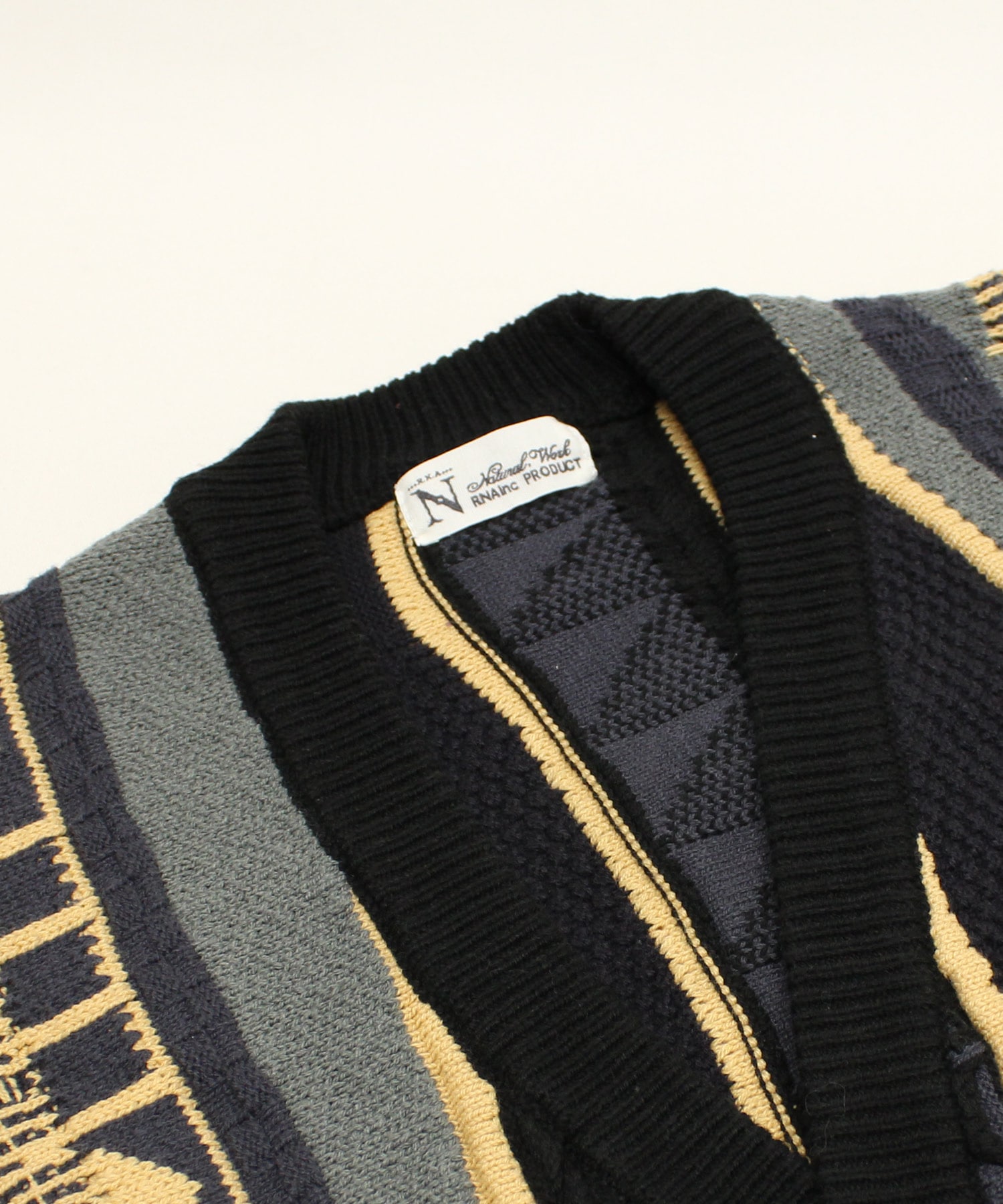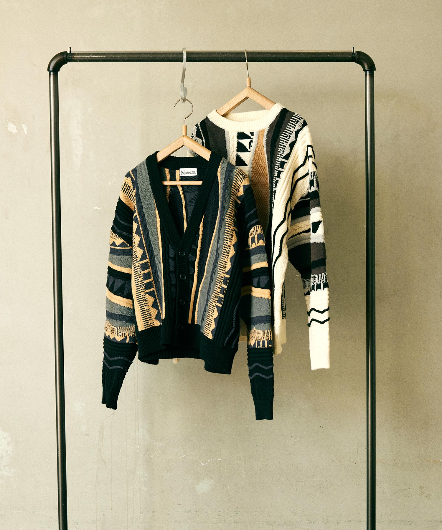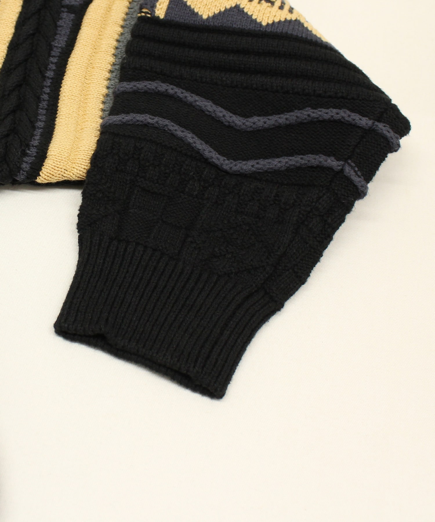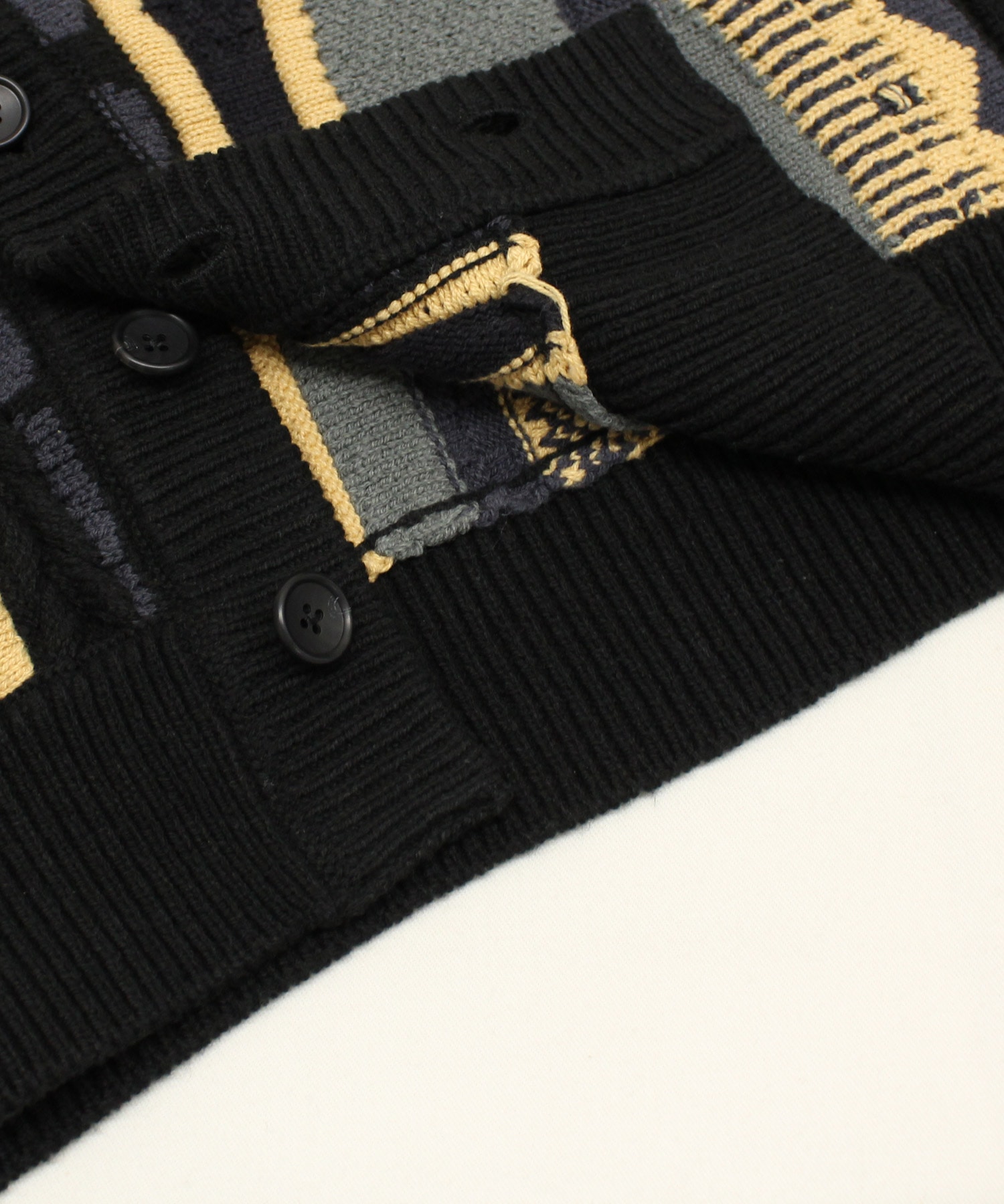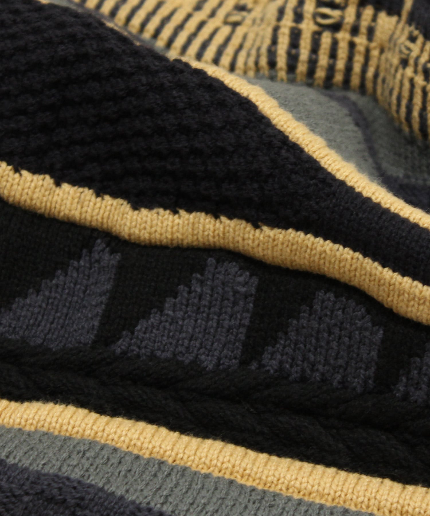 立体感が魅力の、たくさんの柄とカラーを組み合わせた、インパクトのある編地が特徴です。