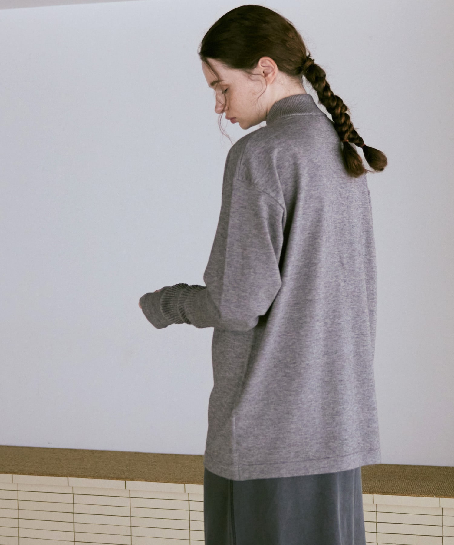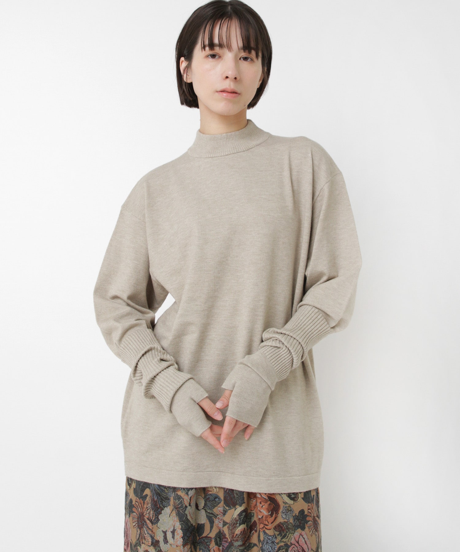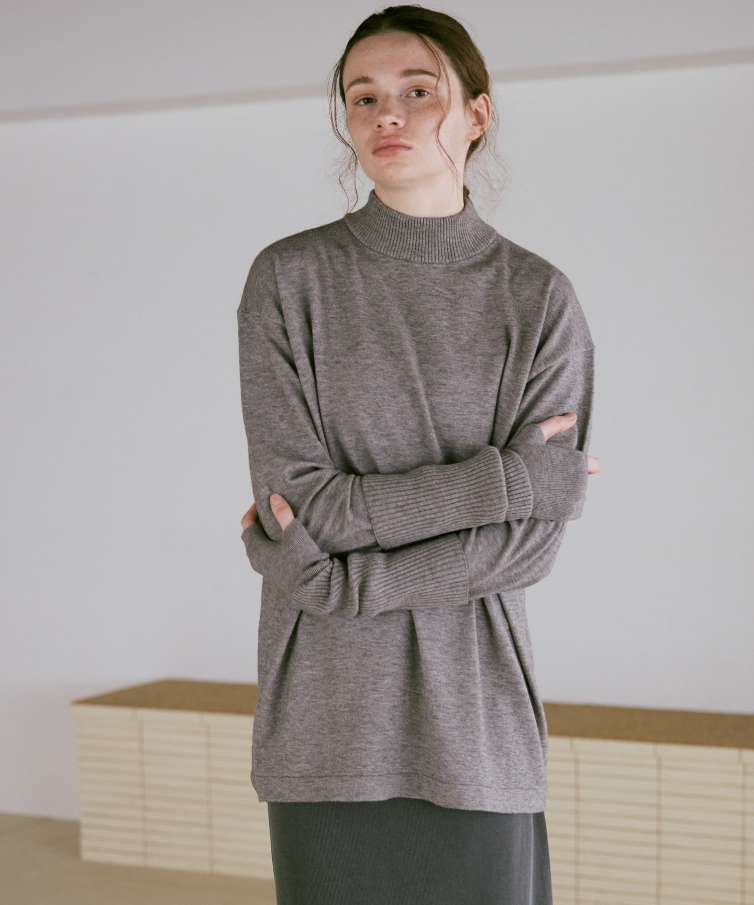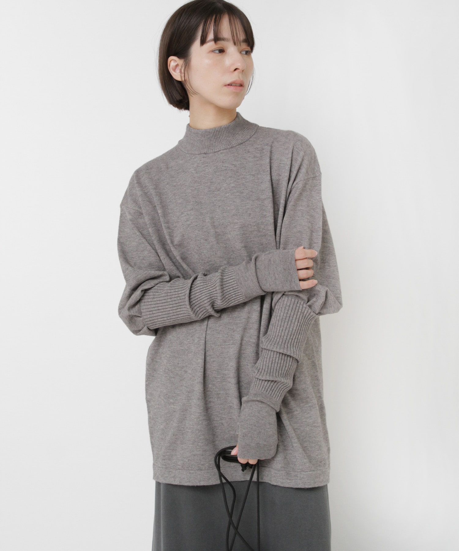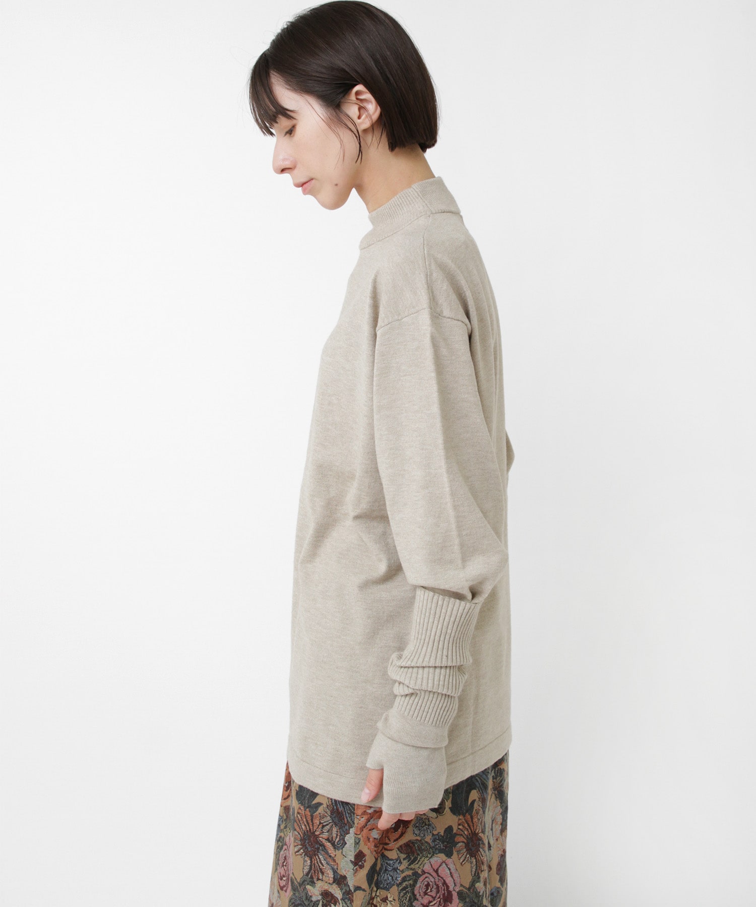 襟元はやや高さを出したモックネックで、カジュアルな中にも品のある印象に。