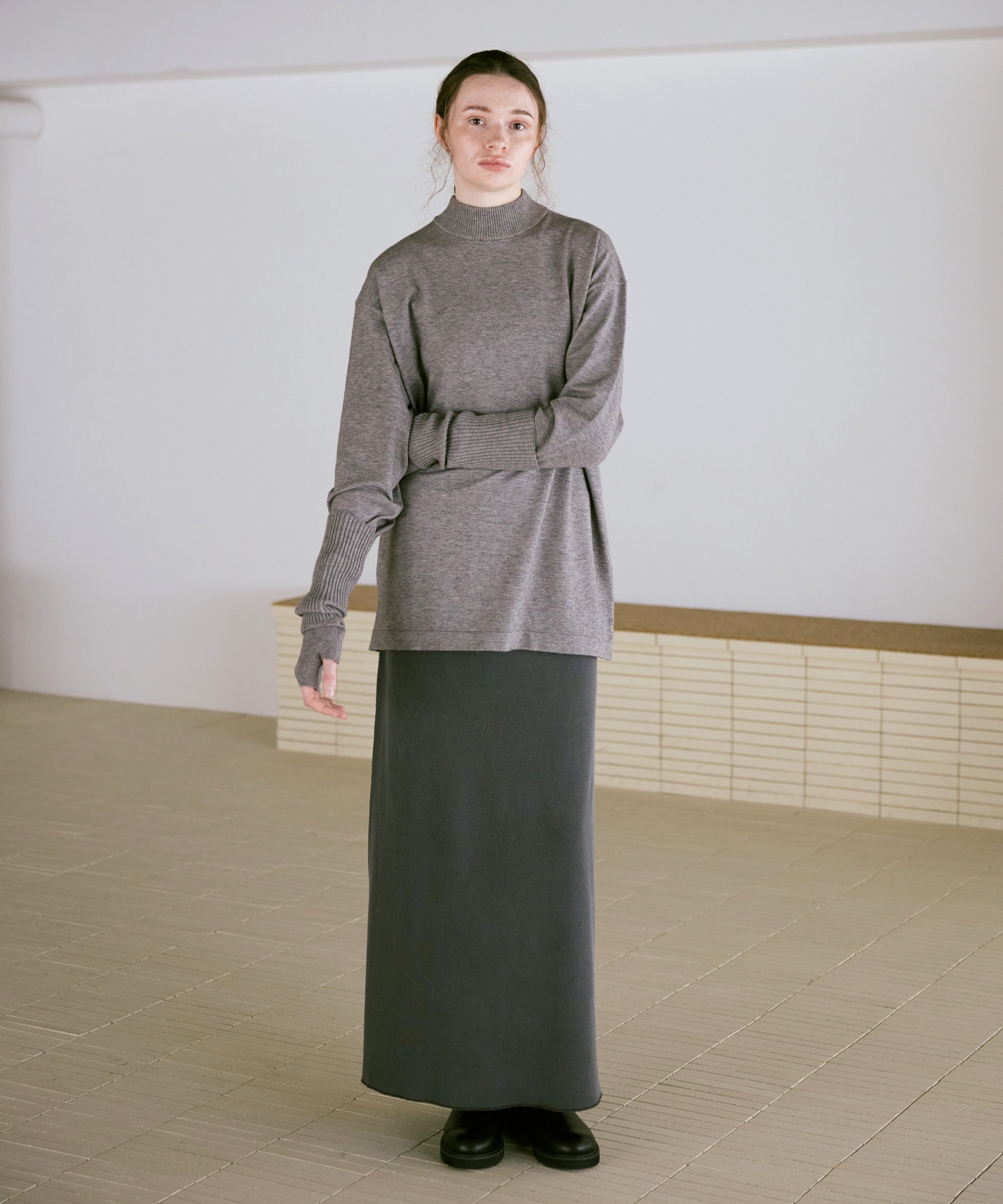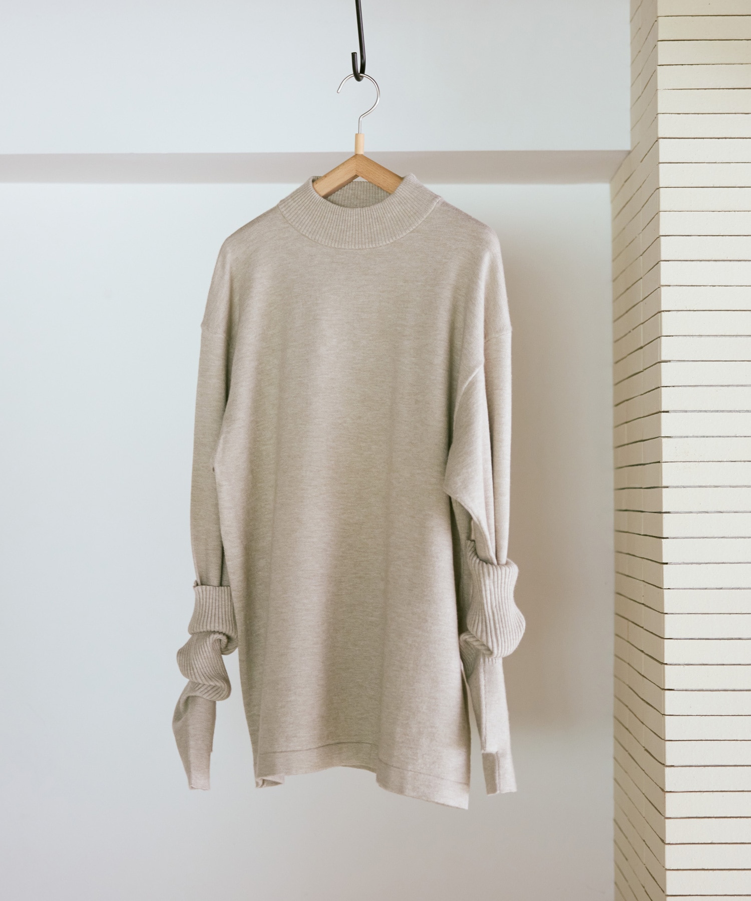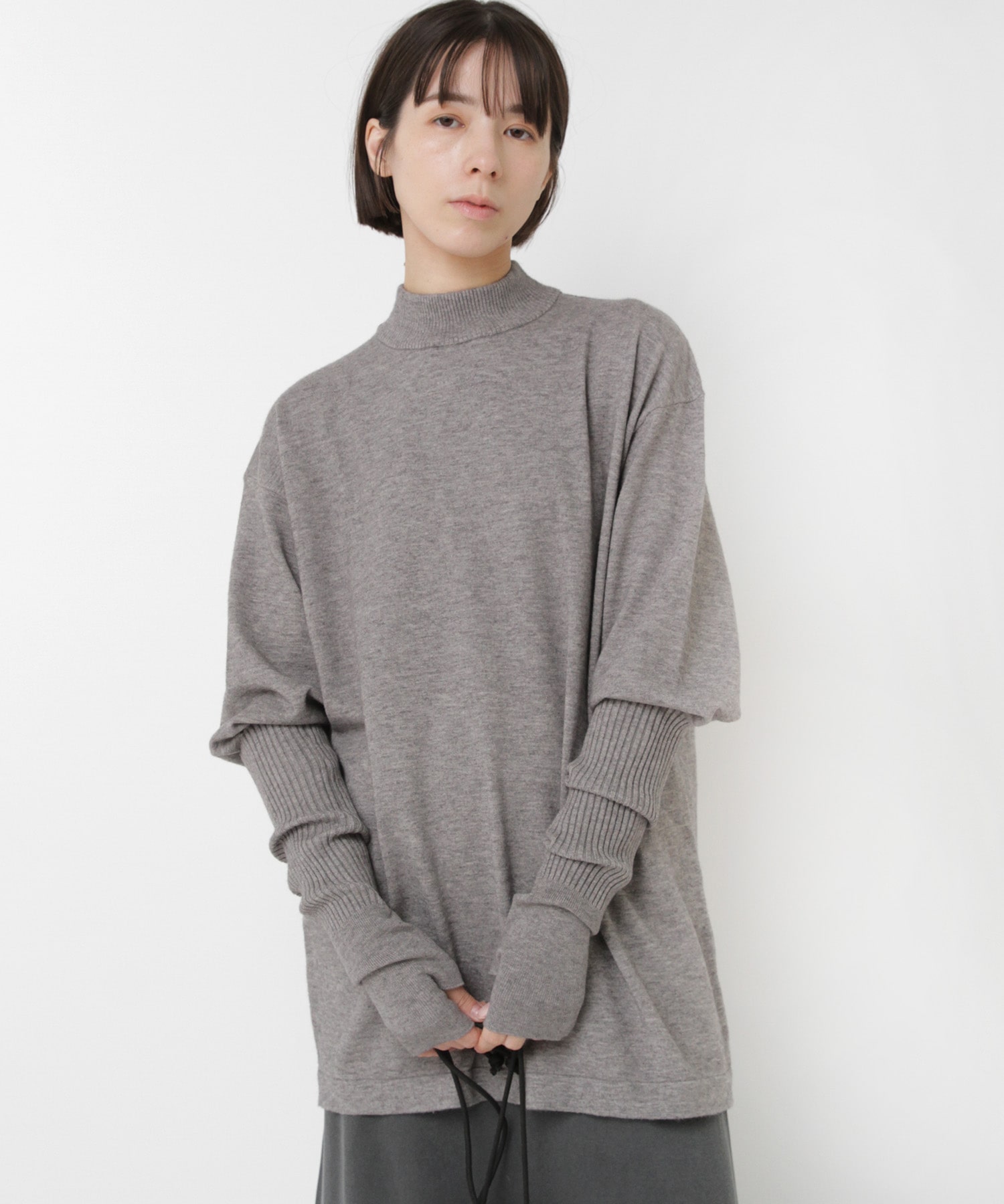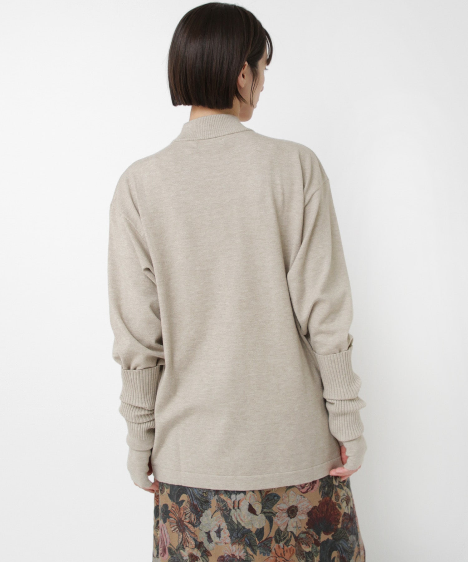 襟元はやや高さを出したモックネックで、カジュアルな中にも品のある印象に。